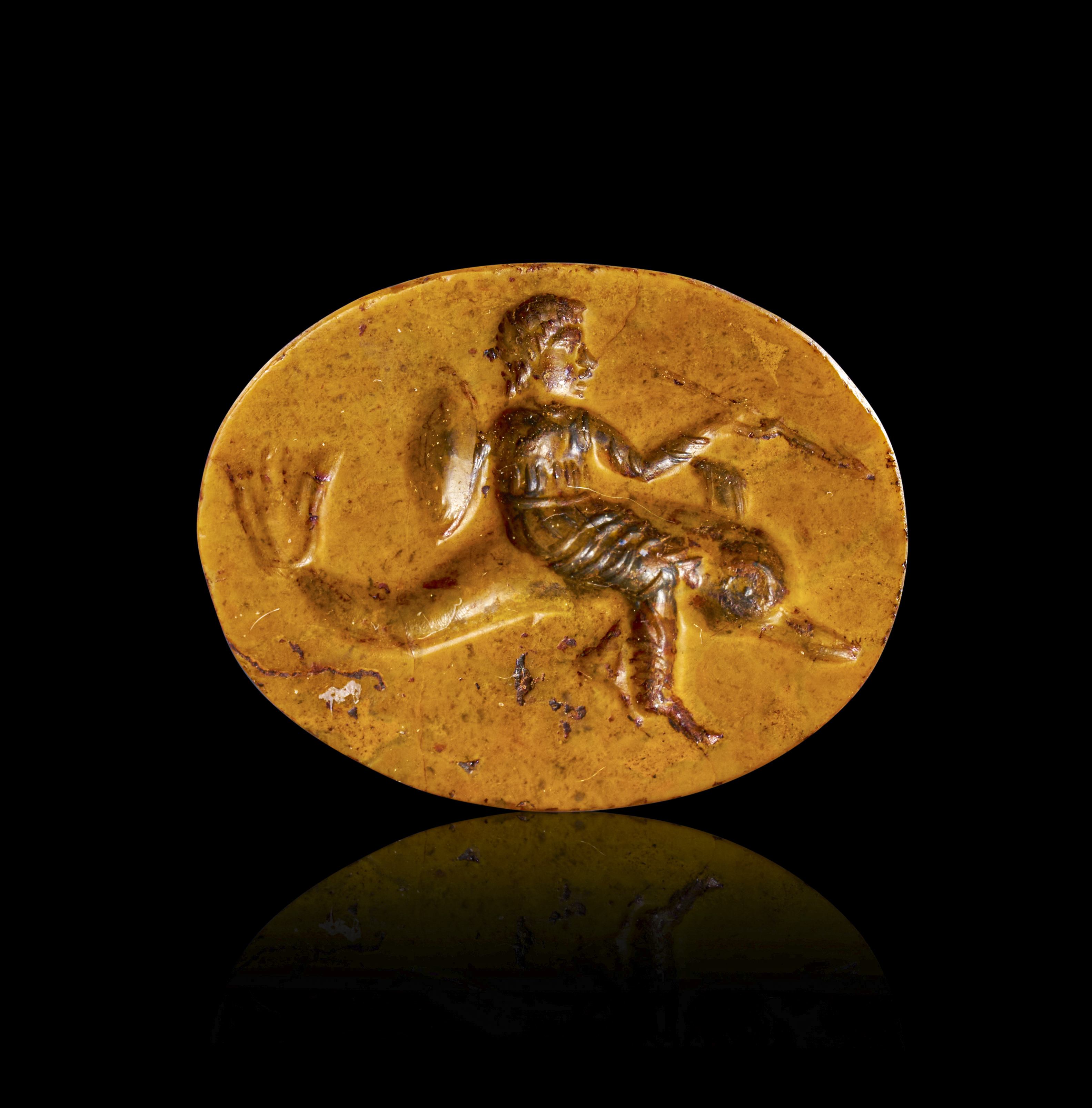 This exquisite Roman intaglio, carved from yellow jasper, dates back to the 2nd to 3rd century A.D. The intaglio features a finely detailed depiction of a Nereid, a sea nymph from Greek mythology, often associated with the Aegean Sea and known for their beauty and grace. The figure is shown reclining on the back of a sea creature, with flowing drapery and delicate features meticulously carved to capture the ethereal nature of the subject.