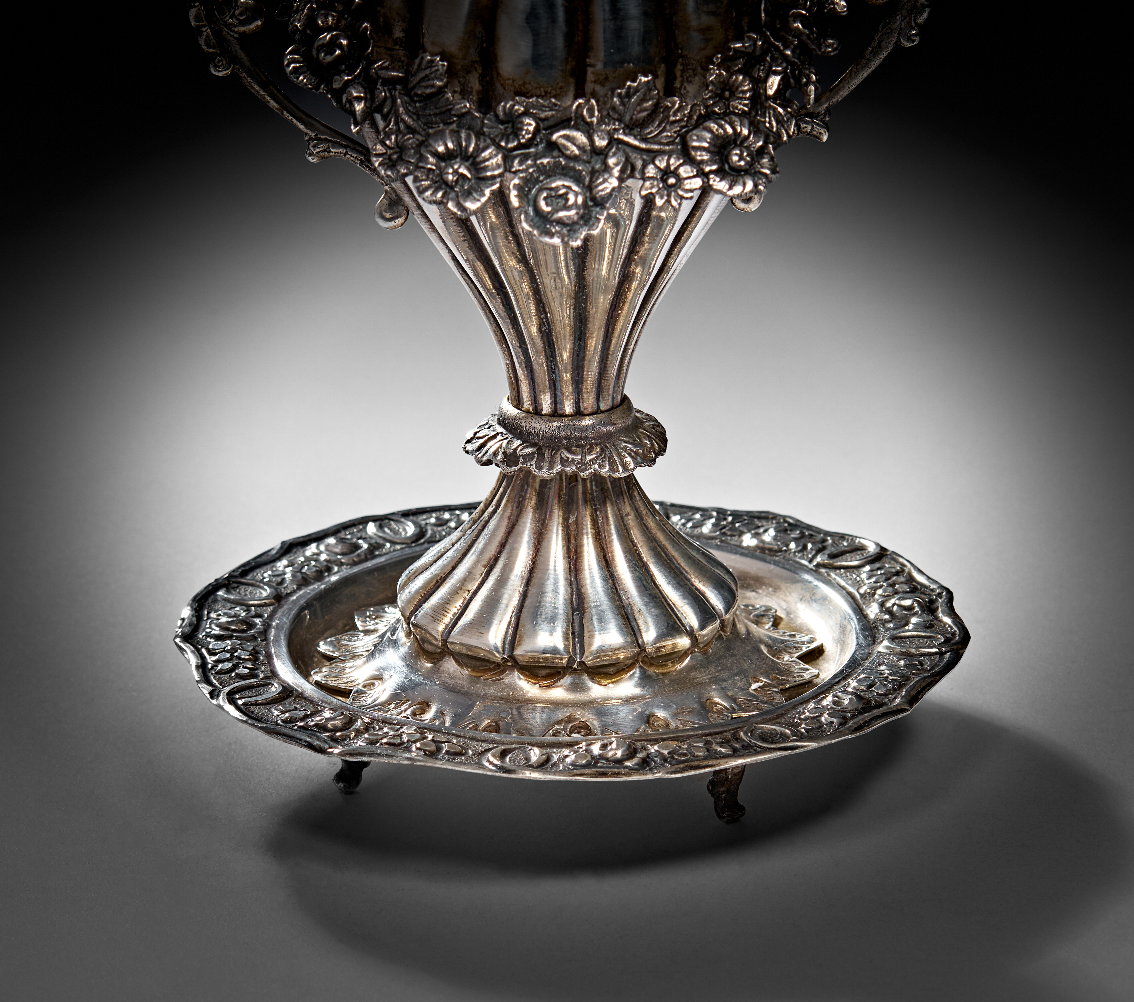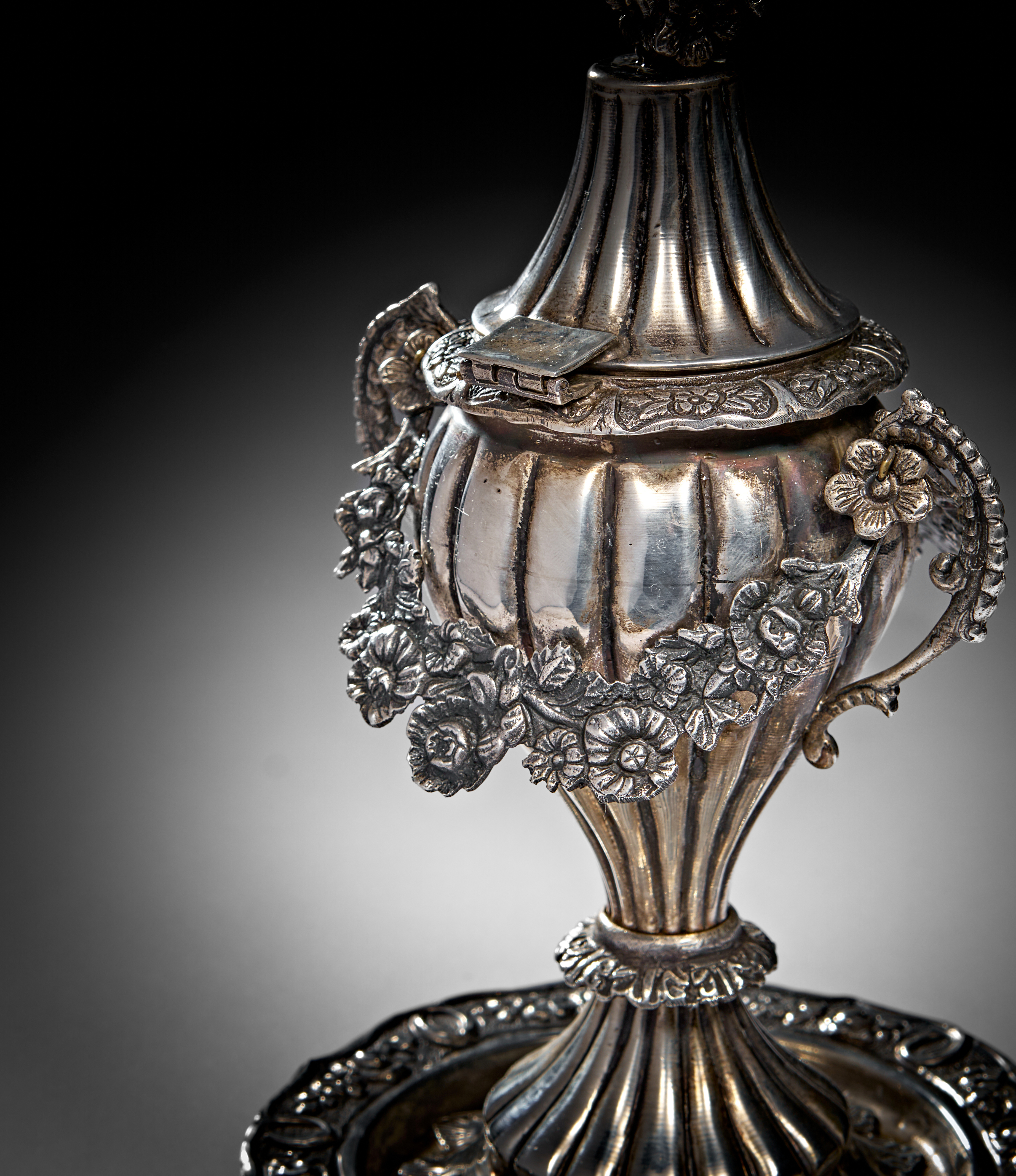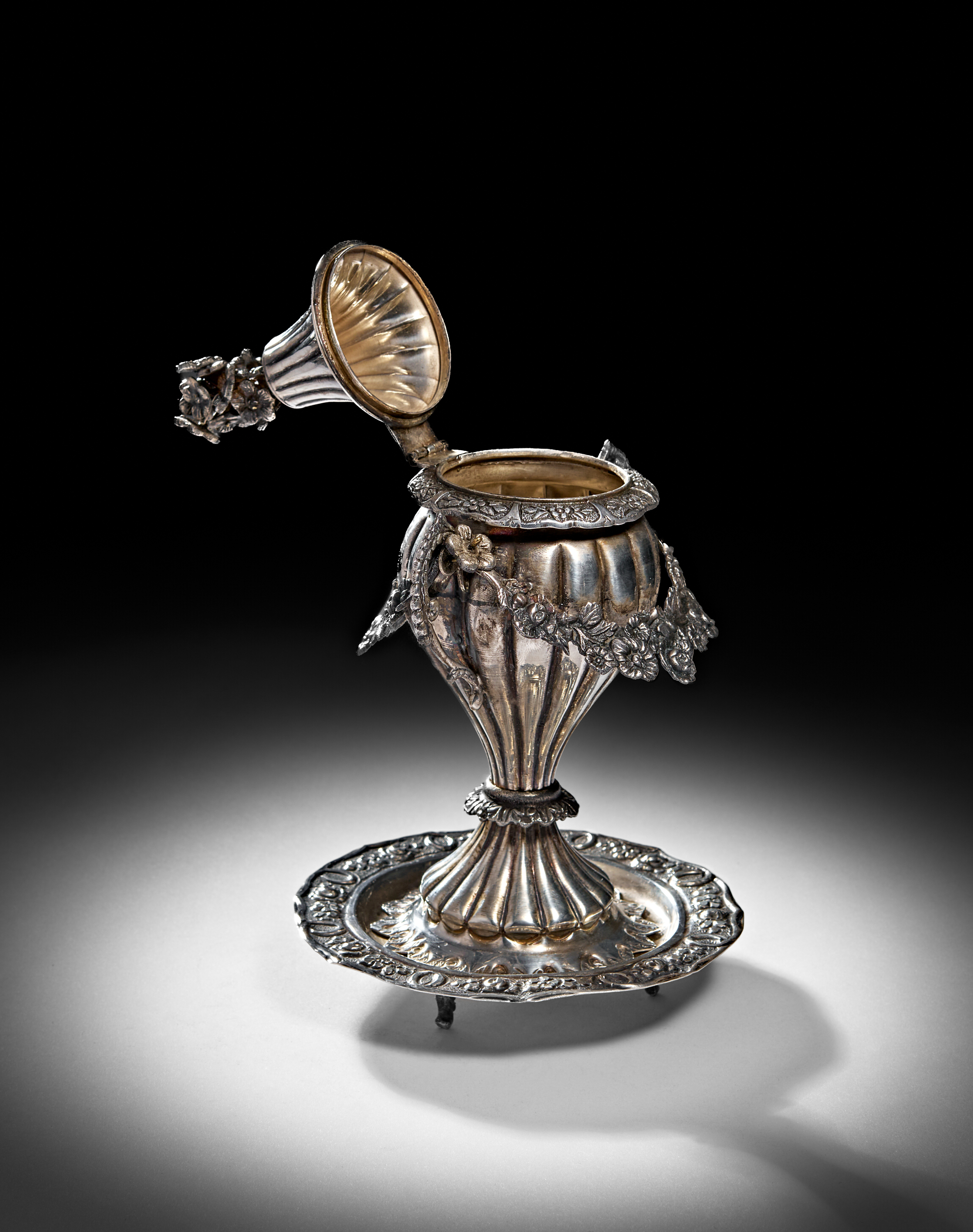 This exquisite silver incense burner, likely crafted for the Ottoman market, features an elegant urn-shaped design adorned with intricate floral and foliate motifs. The piece showcases finely detailed repousse and chased decorations, including garland-adorned handles and a fluted pedestal base. The domed lid, topped with an ornate floral finial, opens to reveal a ribbed interior, designed to hold burning incense while allowing fragrant smoke to escape. The hallmark on the base, including 900 silver purity.
