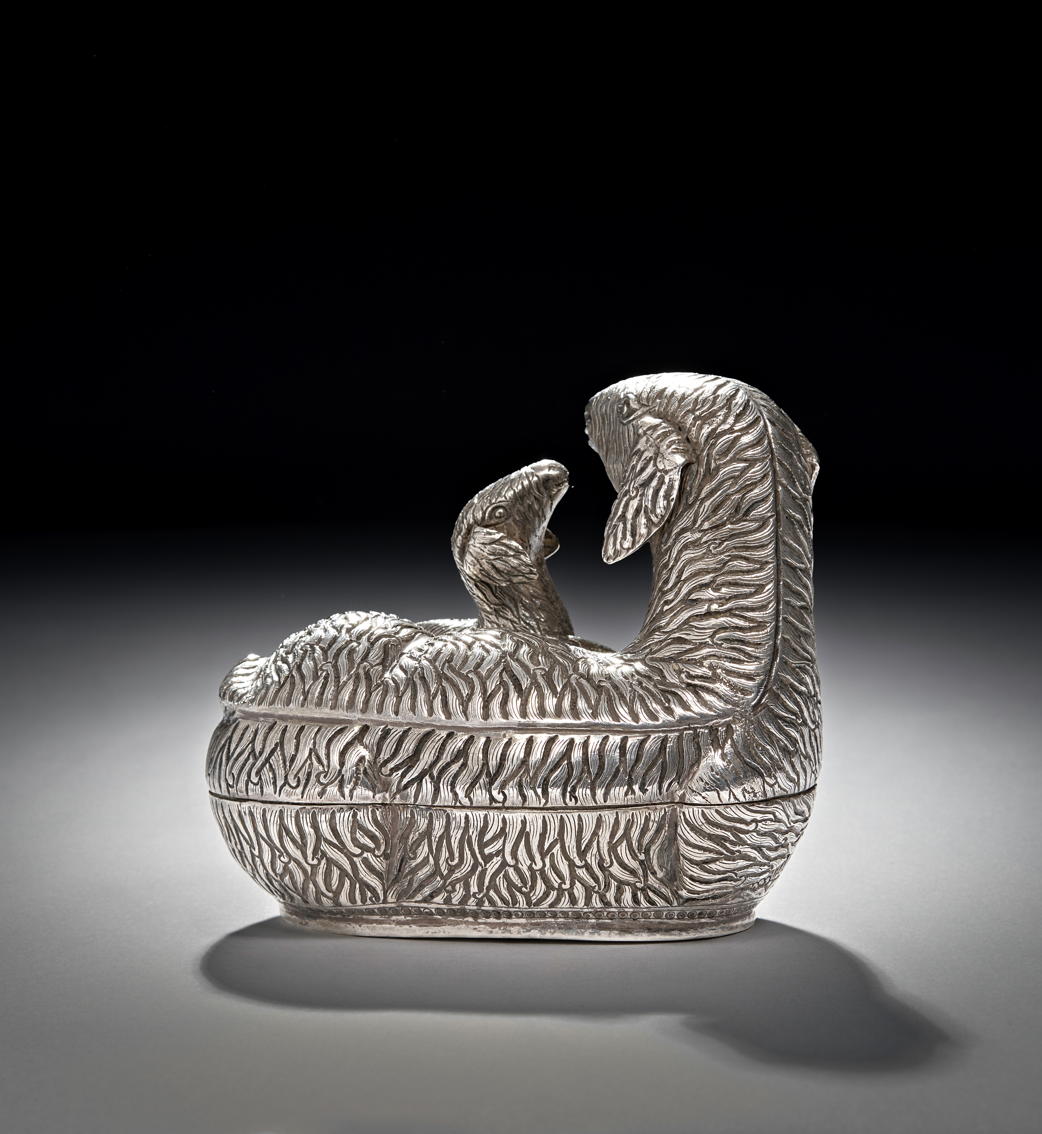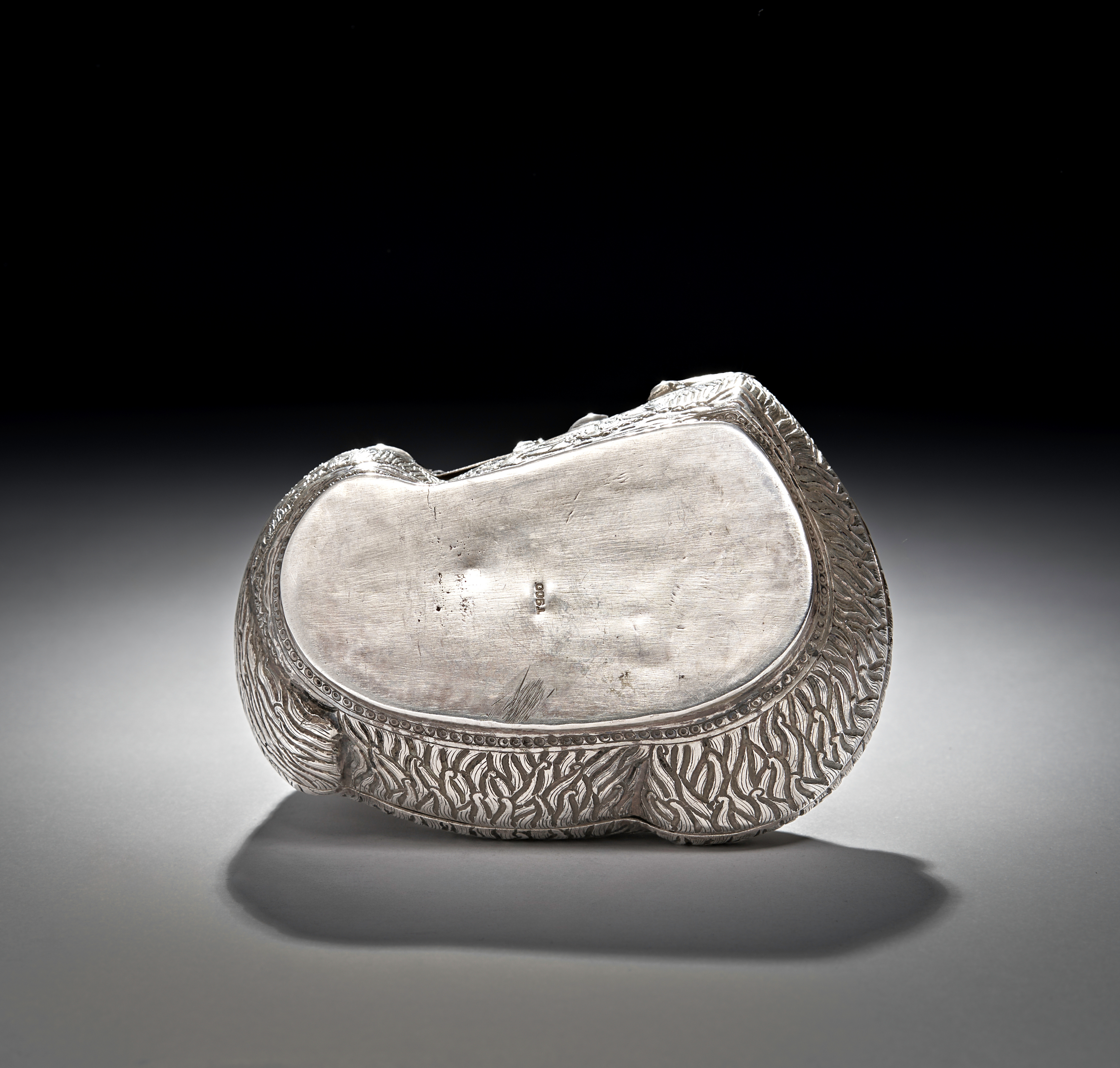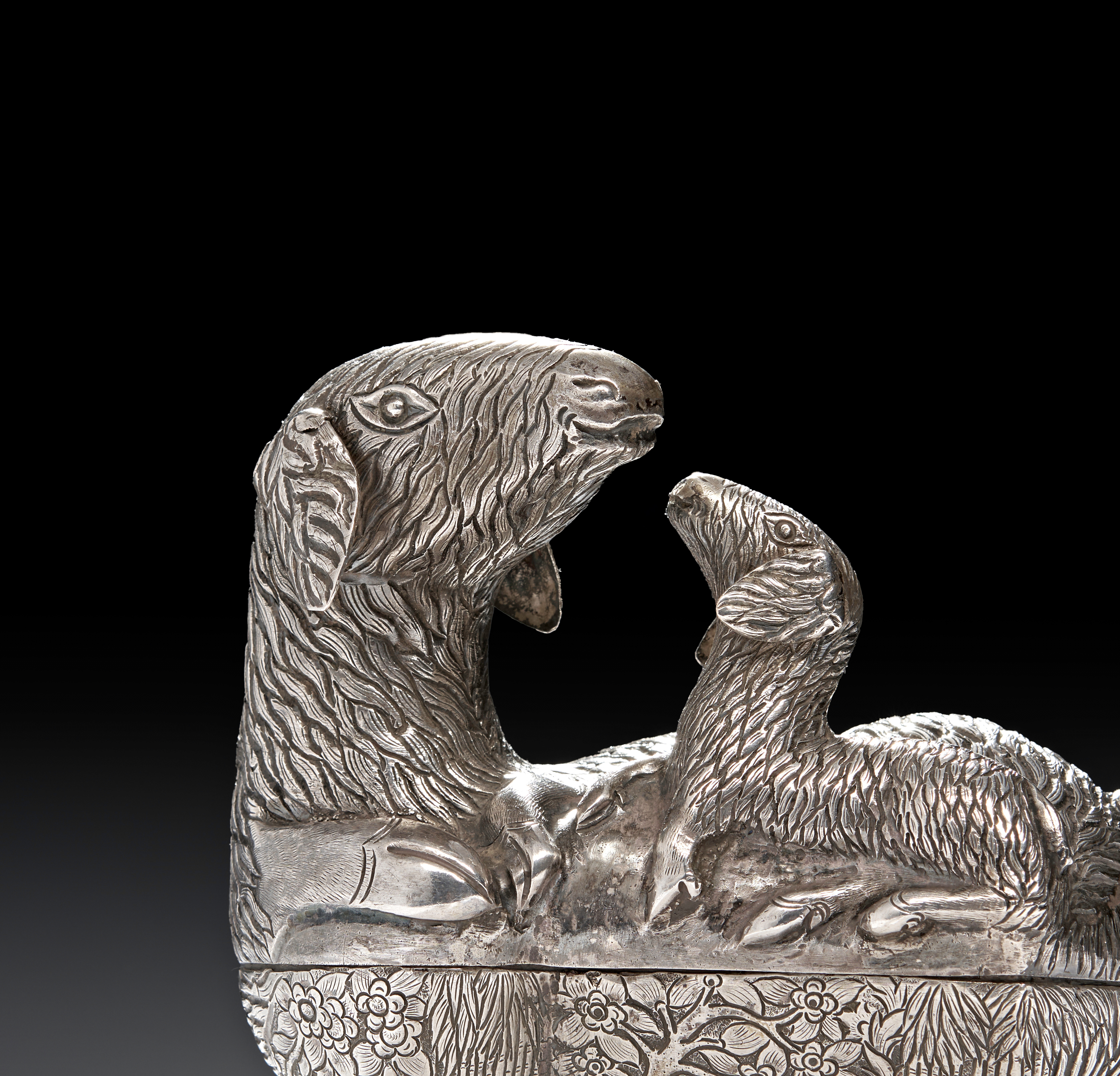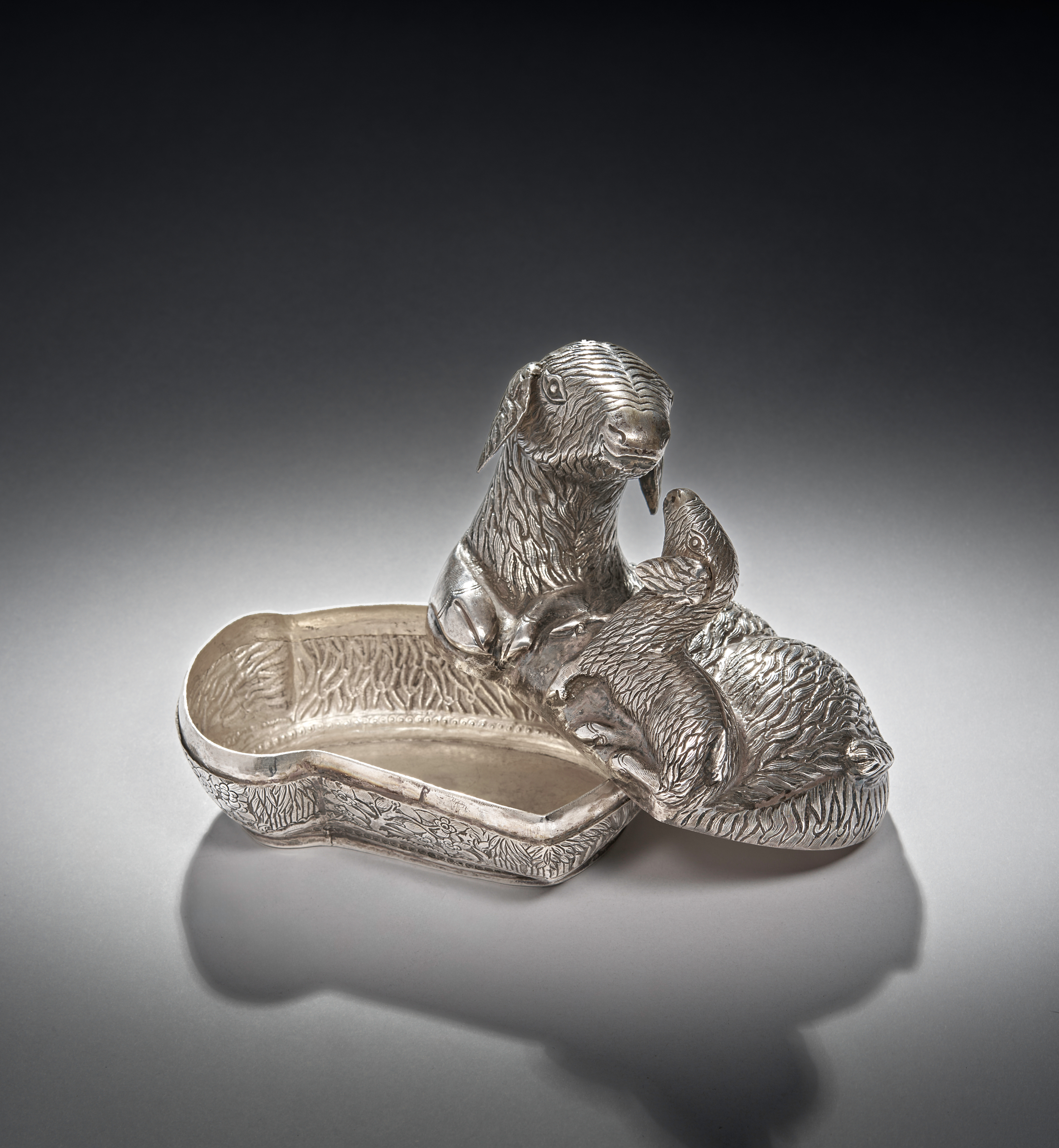 This solid silver Cambodian betel box is designed in the form of a mother sheep with her lamb, the piece is adorned with intricate repousse and engraved details, giving texture and lifelike depth to the figures. The box cleverly opens into two pieces, revealing a hidden compartment traditionally used for storing betel nuts, a culturally significant practice in Cambodia.