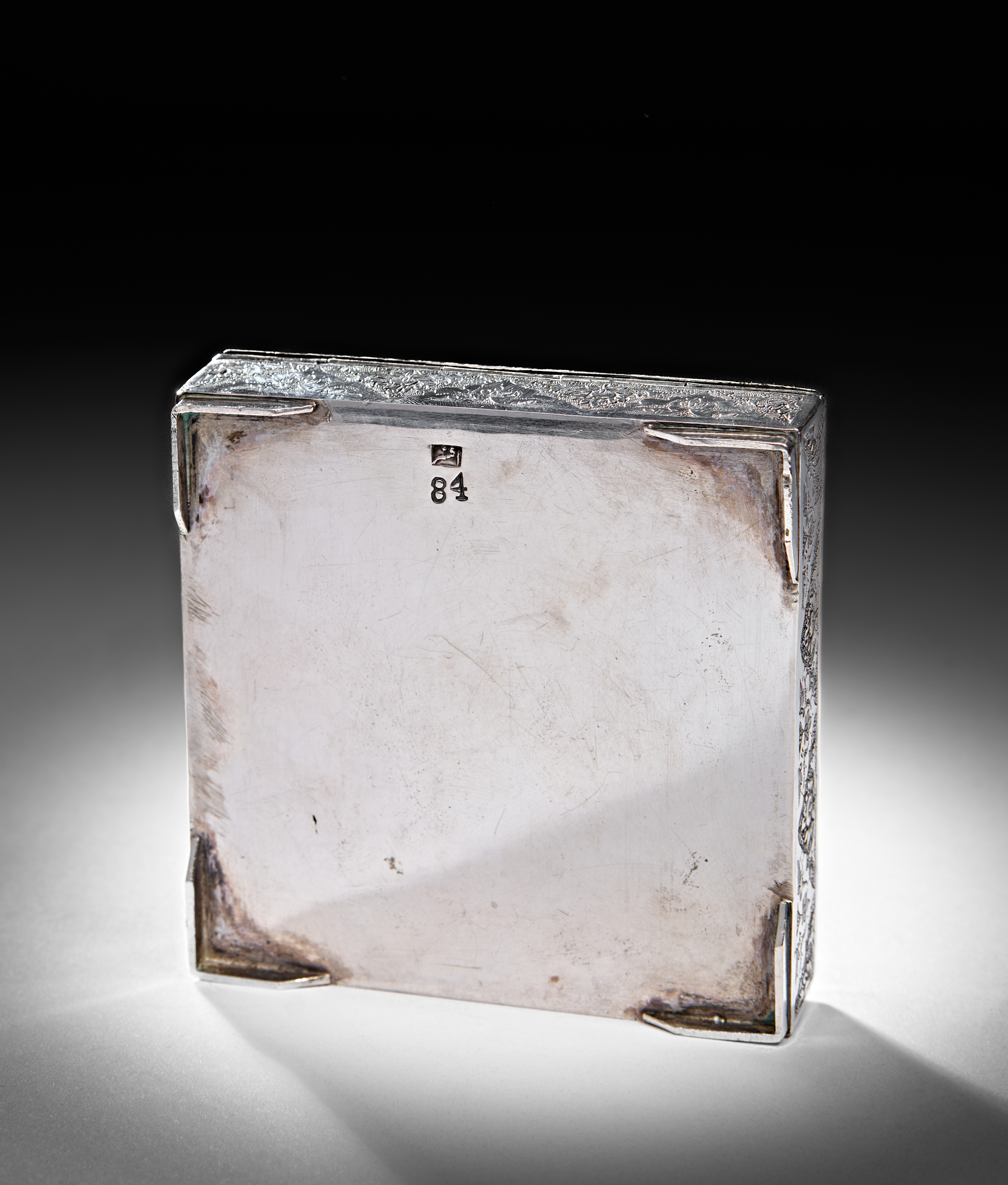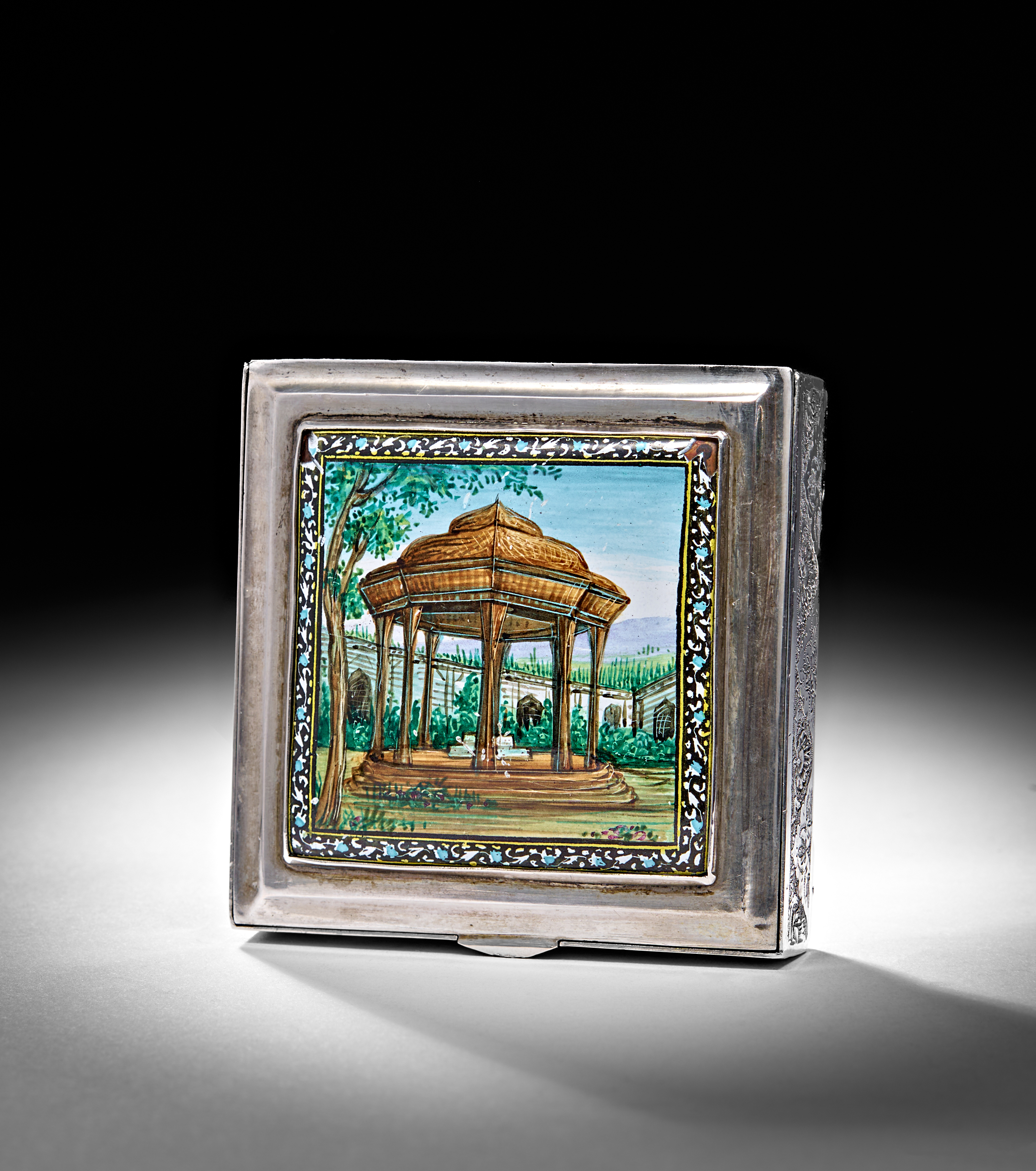 The lid is adorned with a beautifully hand-painted enamel scene depicting an elegant pavilion, framed by an elaborate border of geometric and floral motifs, characteristic of Persian decorative arts. The sides of the box feature delicate engraved patterns, adding to its ornate appeal. Stamped on the base with a hallmark indicating its silver purity (84), it is also signed by the maker.