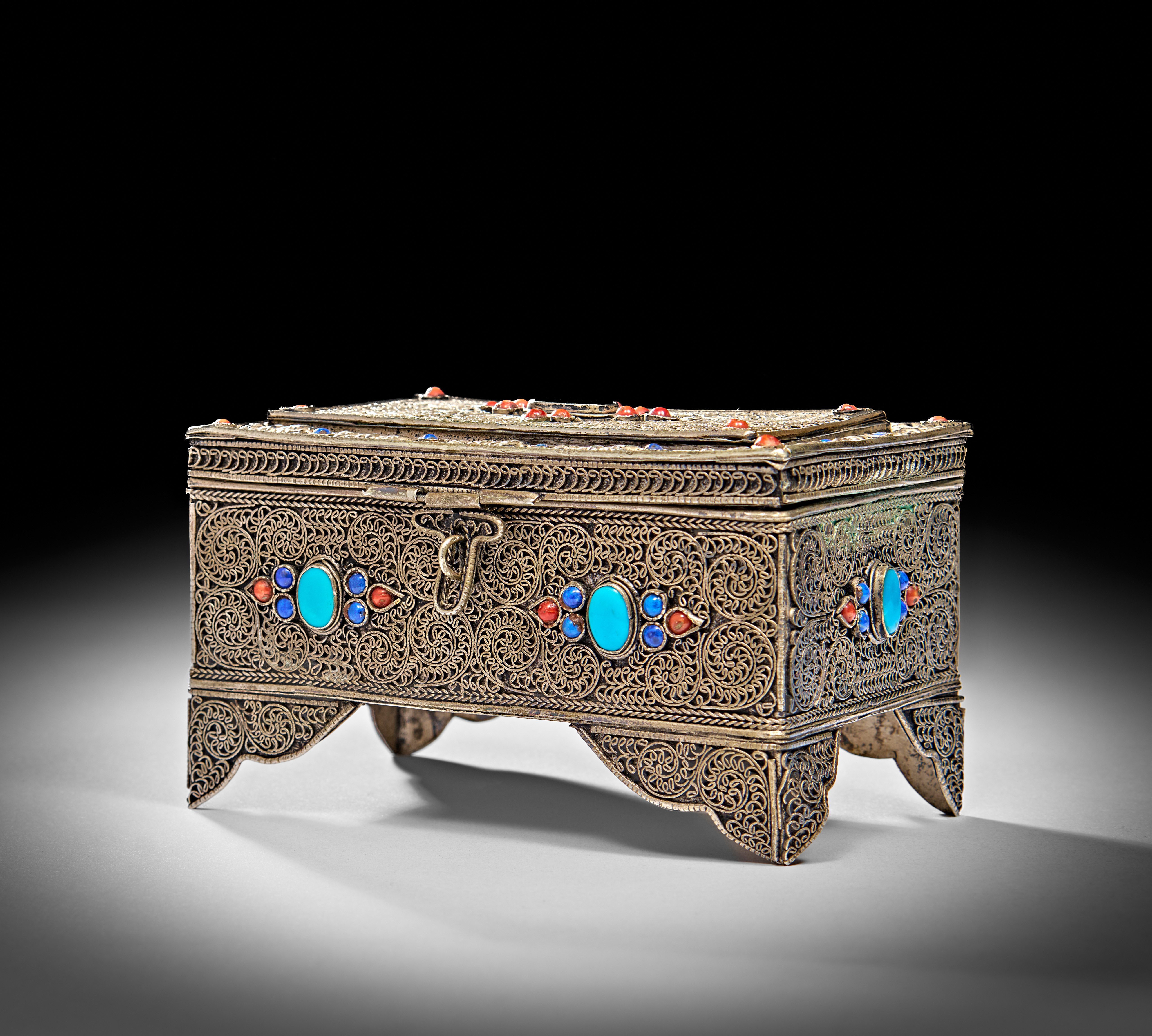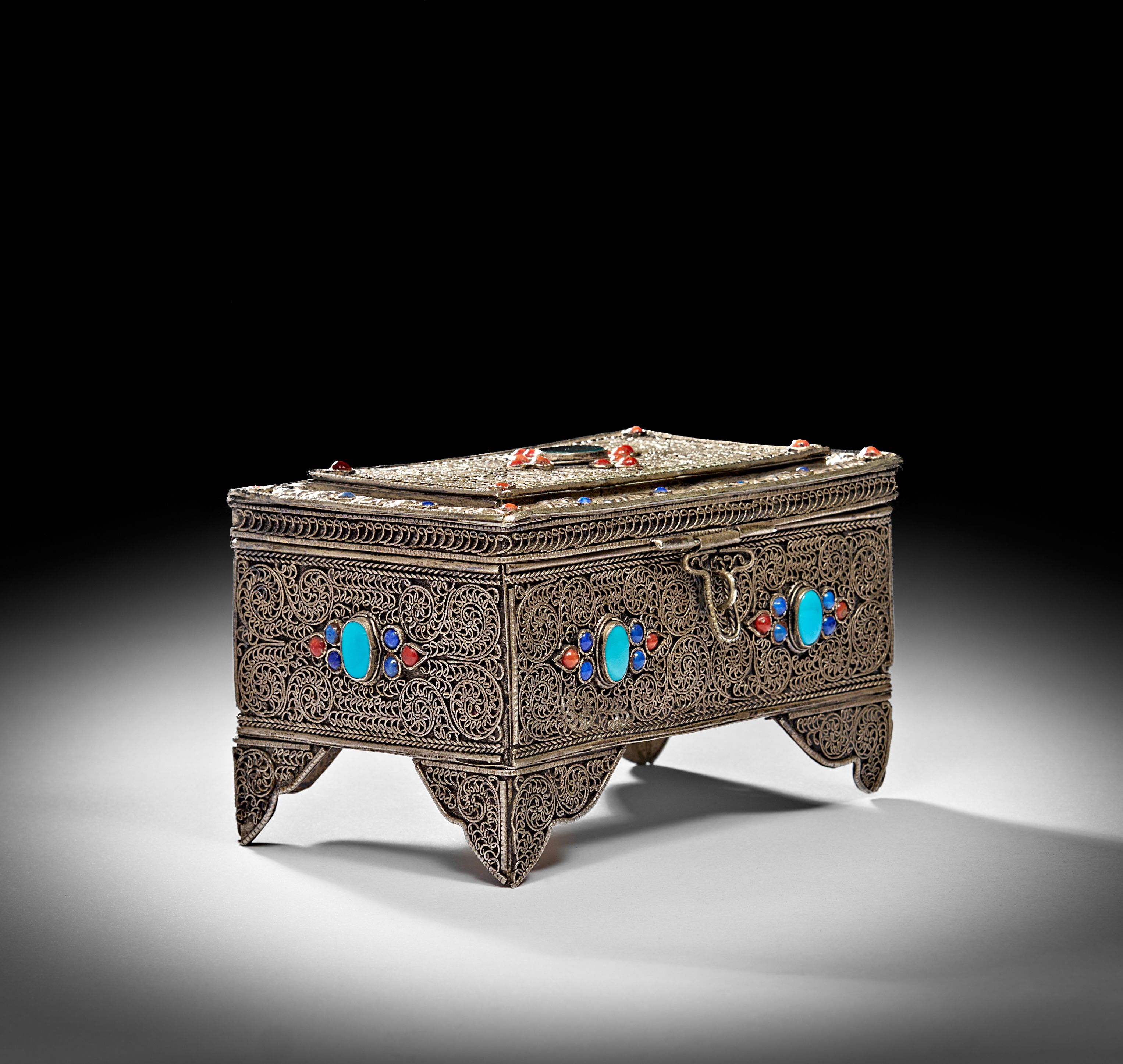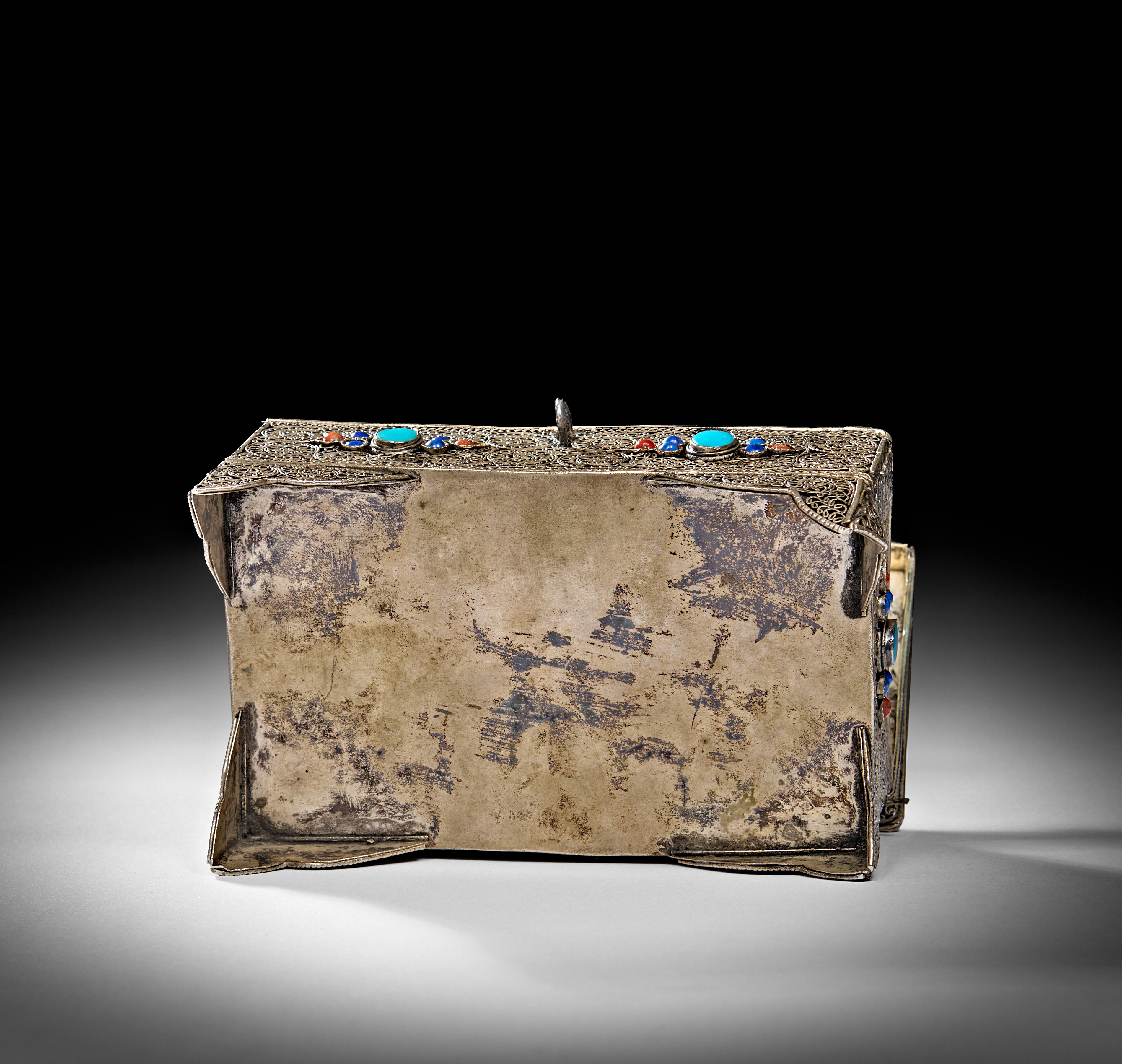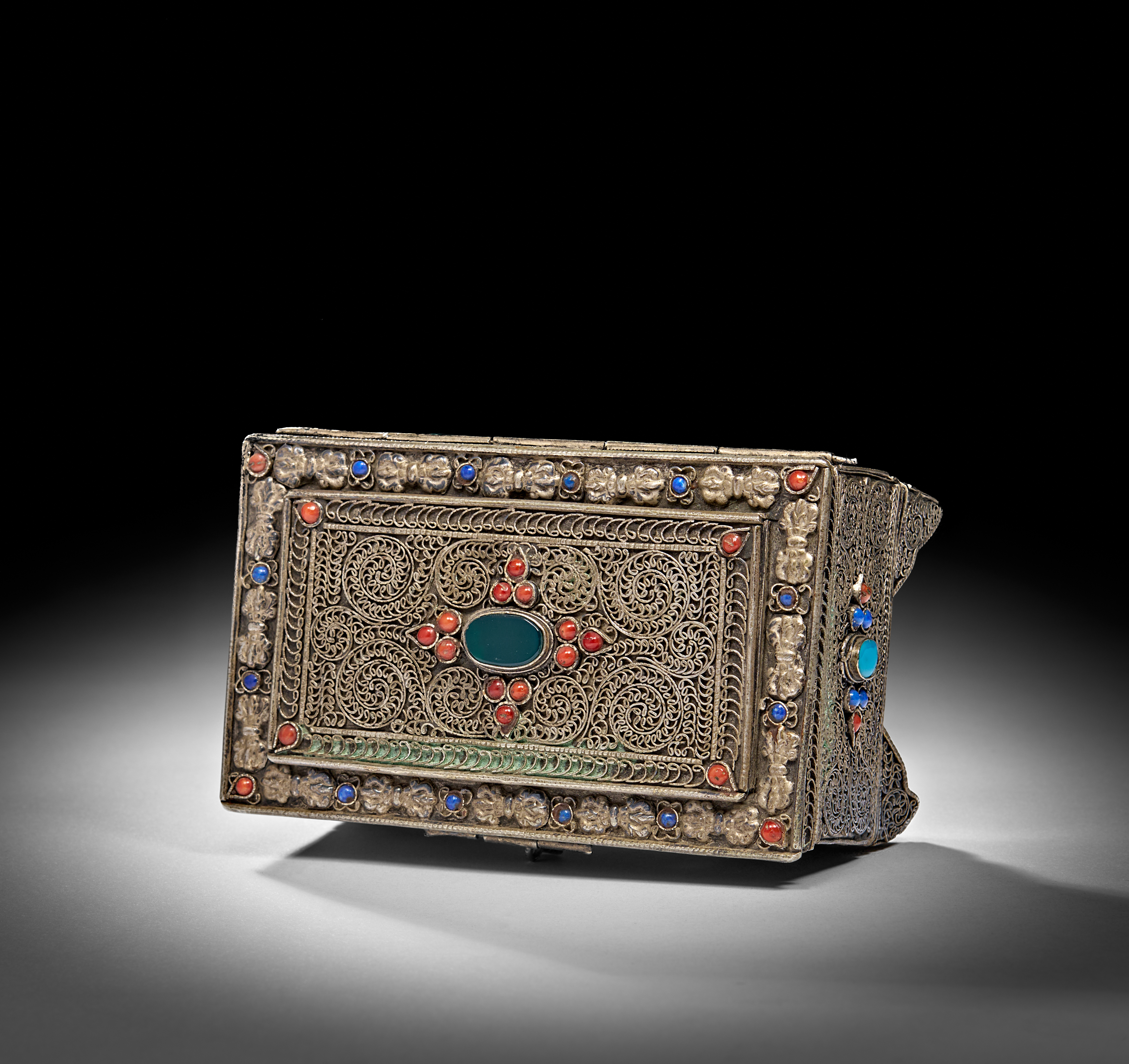 ANTIQUE TIBETAN SOLID SILVER FILIGREE BOX WITH SEMI PRECIOUS STONES, 20TH CENTURY