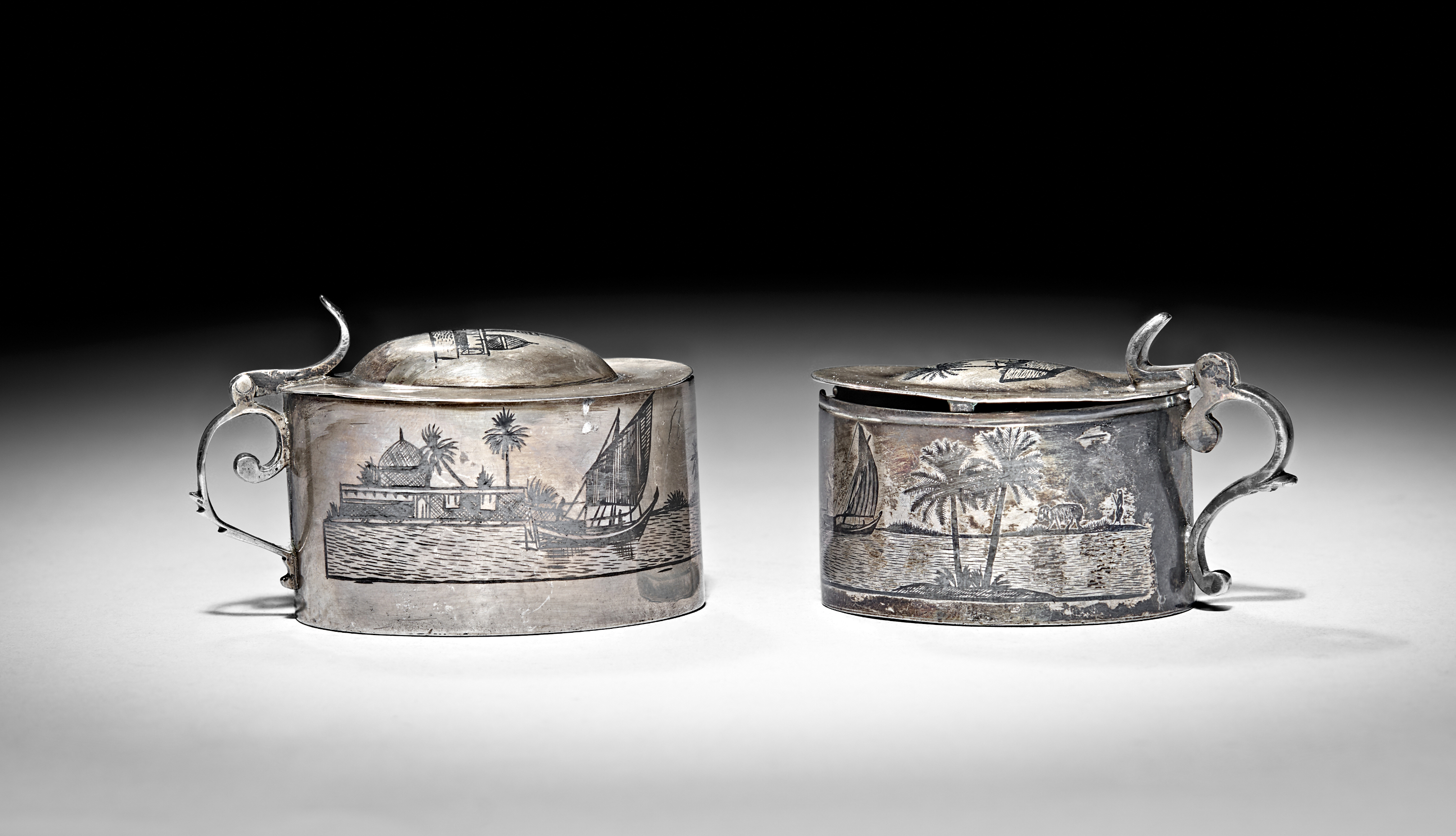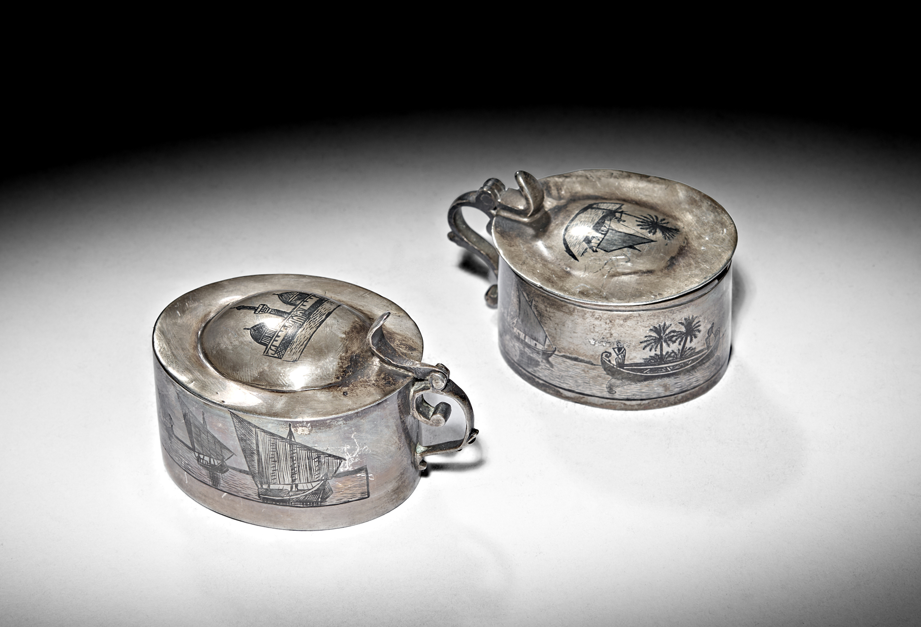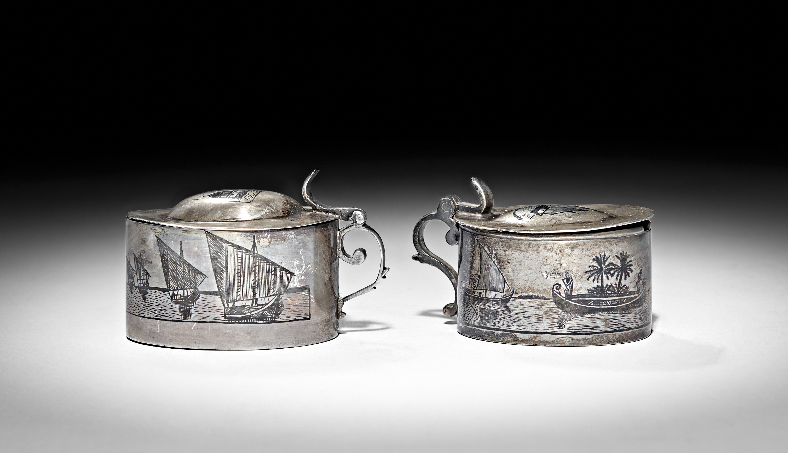 TWO IRAQI SILVER AND NIELLO MUSTARD POTS, 20TH CENTURY
