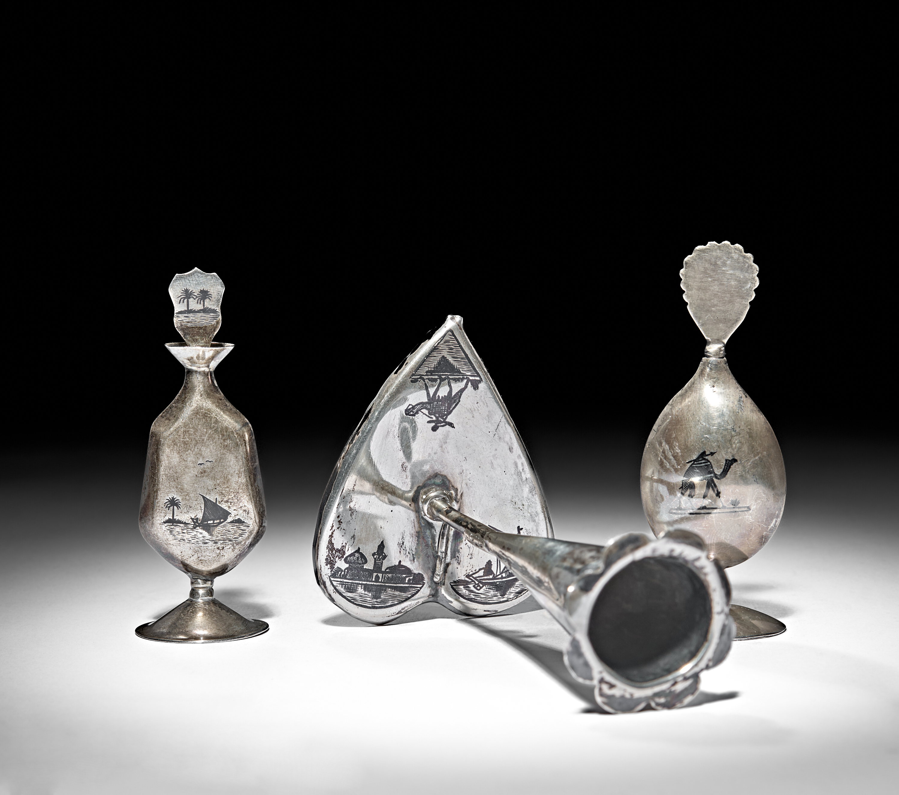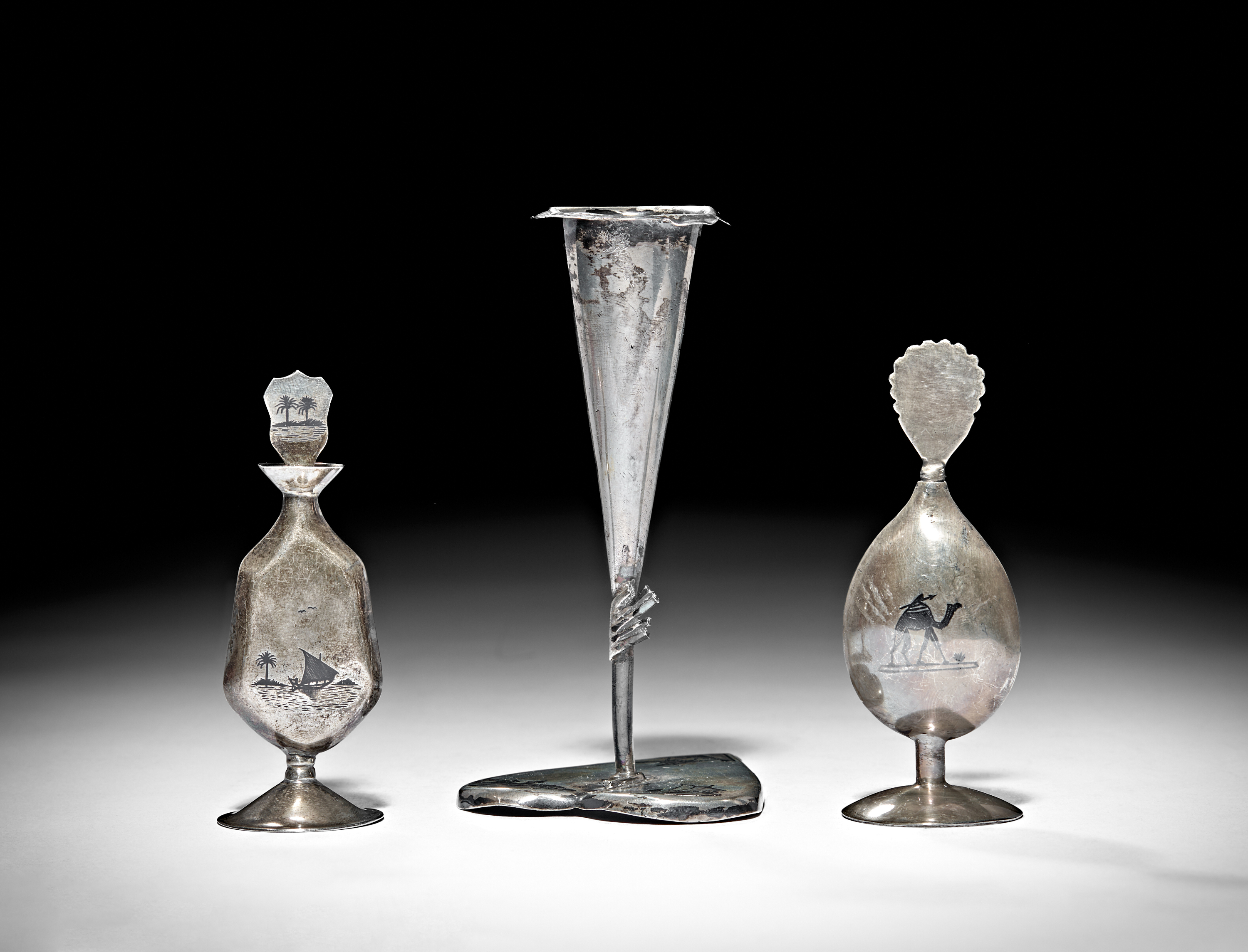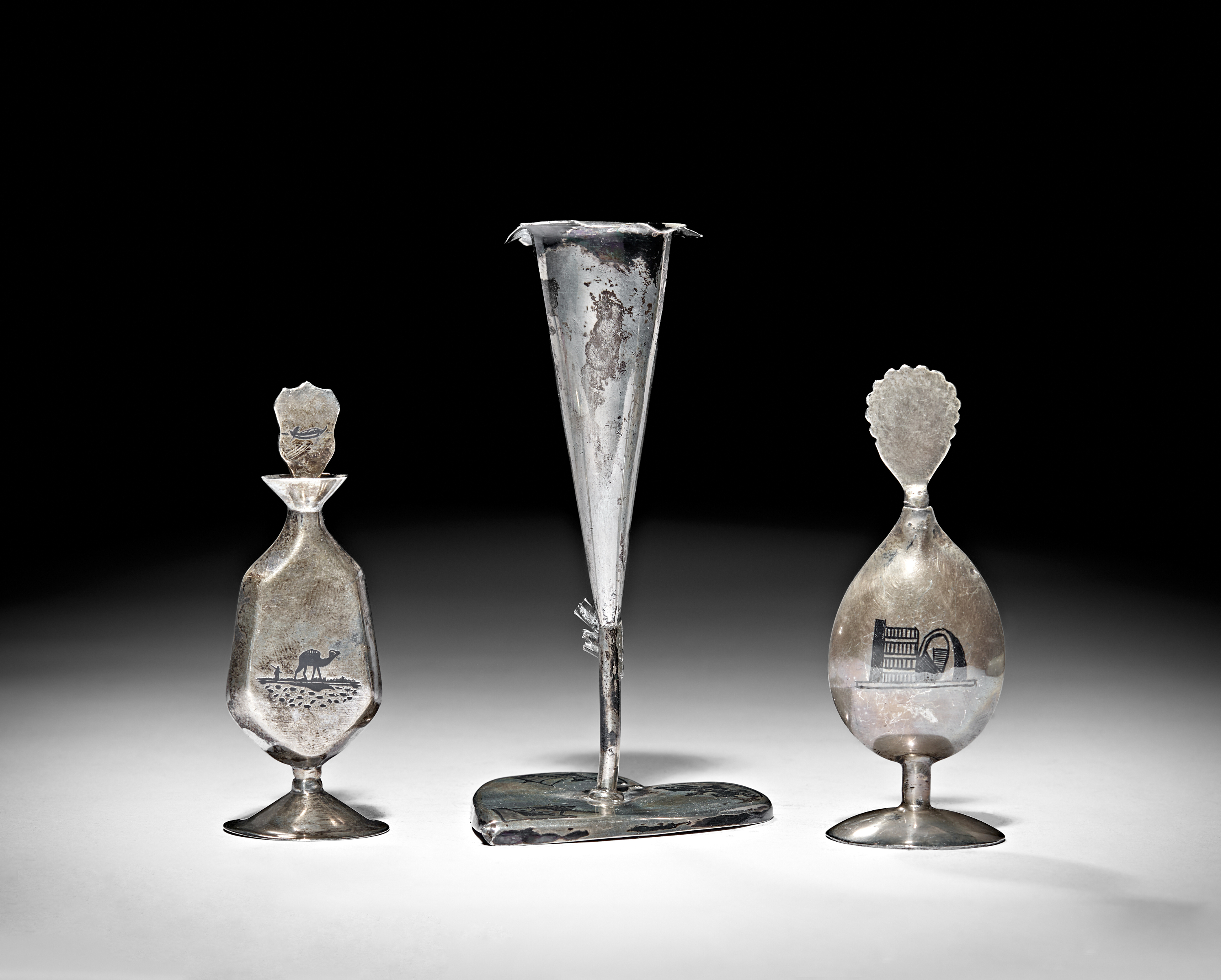 A GROUP OF IRAQI SILVER AND NIELLO CONSIST OF CANDLESTICK AND TWO DISPENSERS, 20TH CENTURY