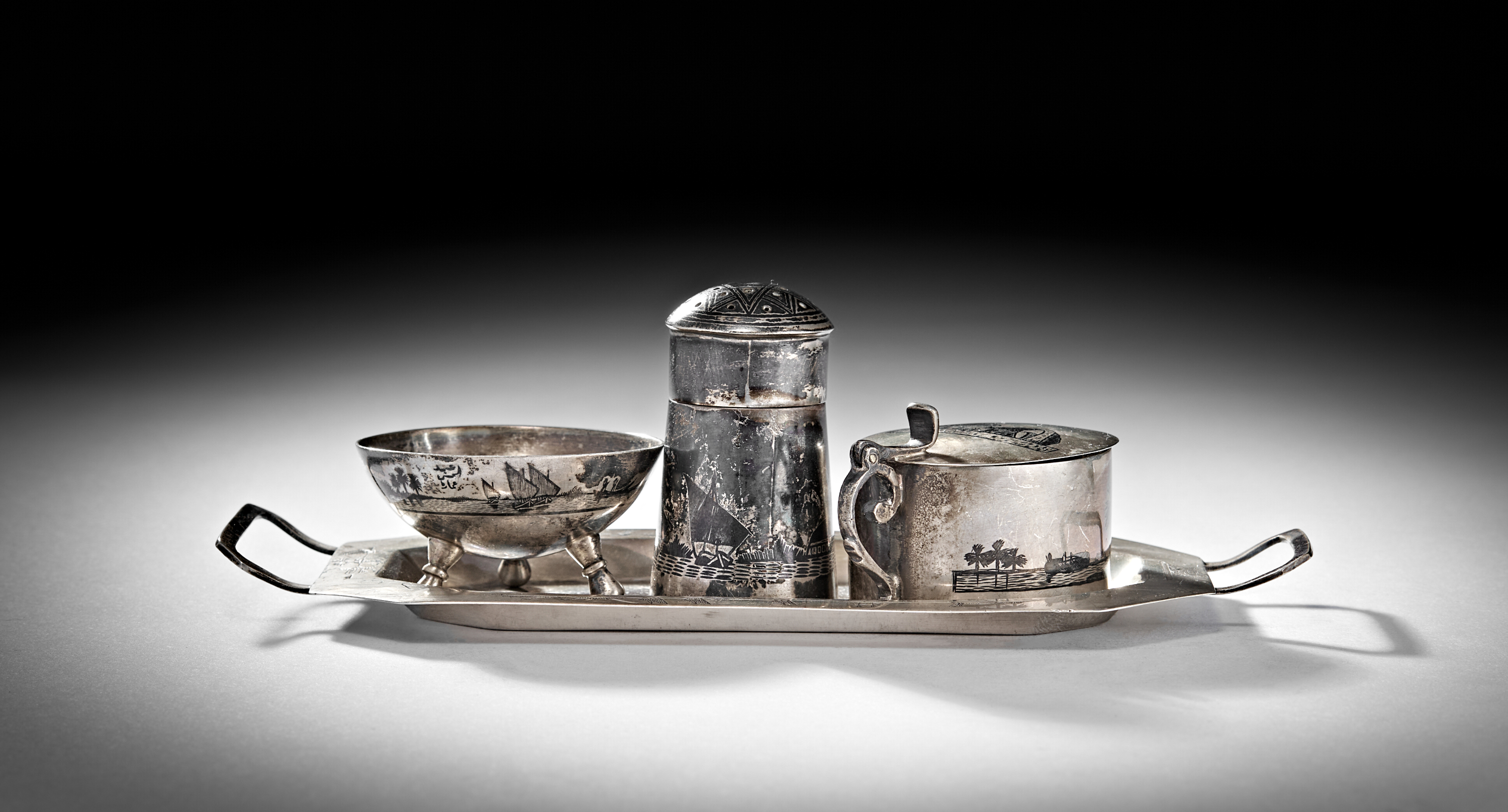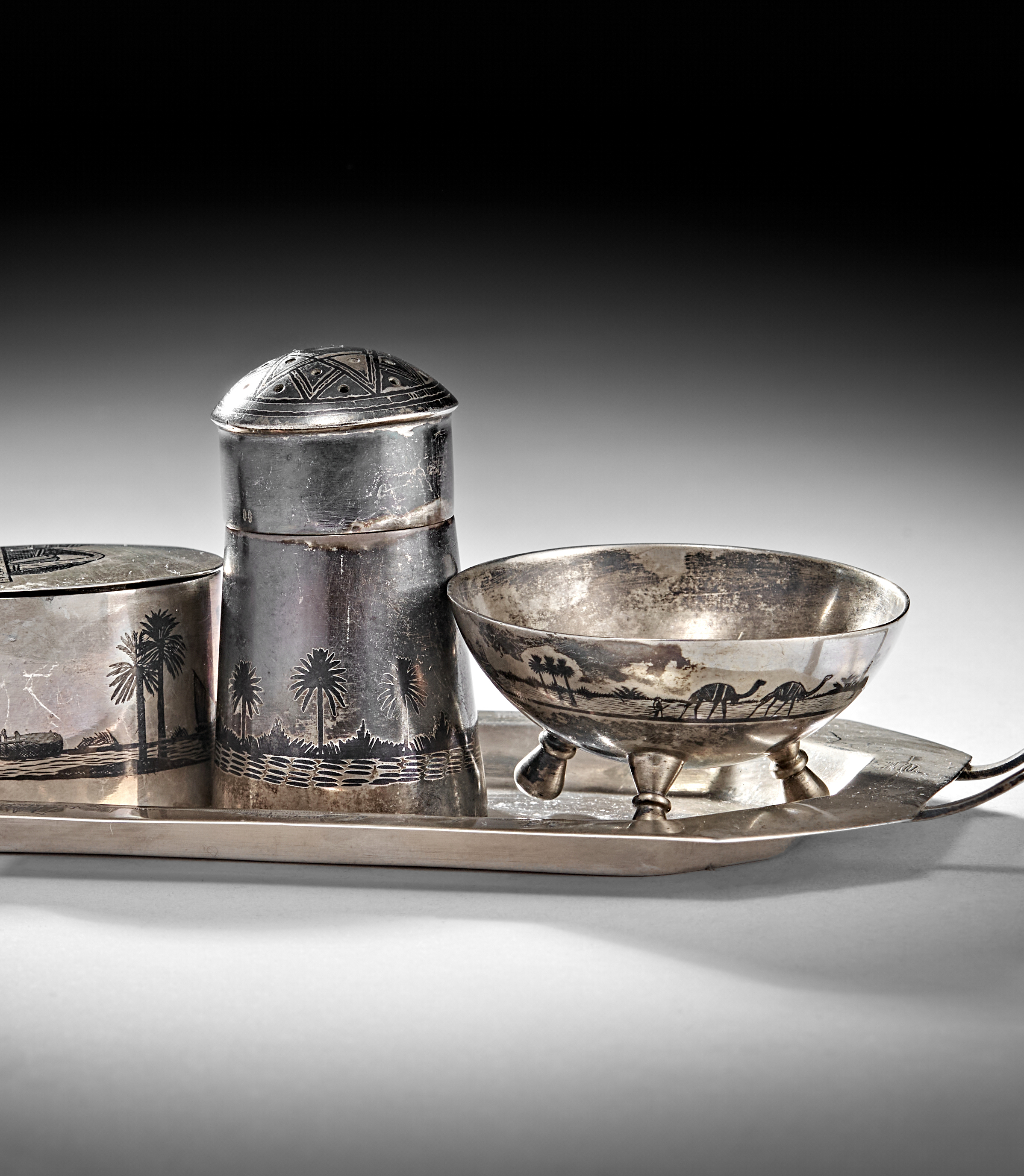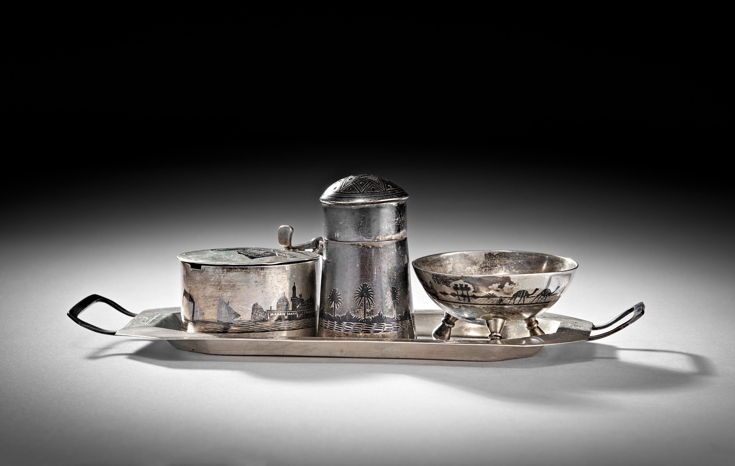 A 20TH CENTURY IRAQI SILVER AND NIELLO CRUET ON TRAY