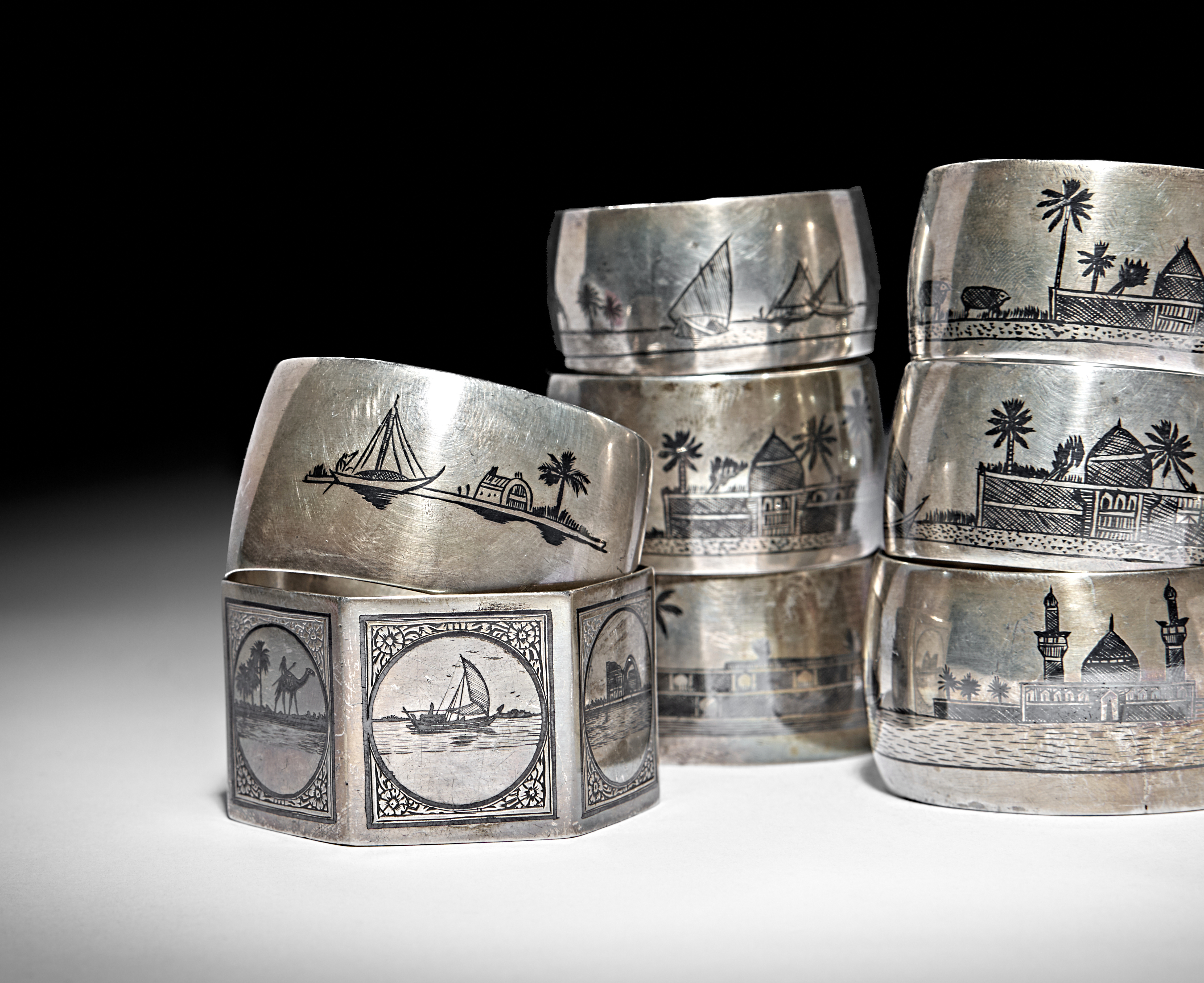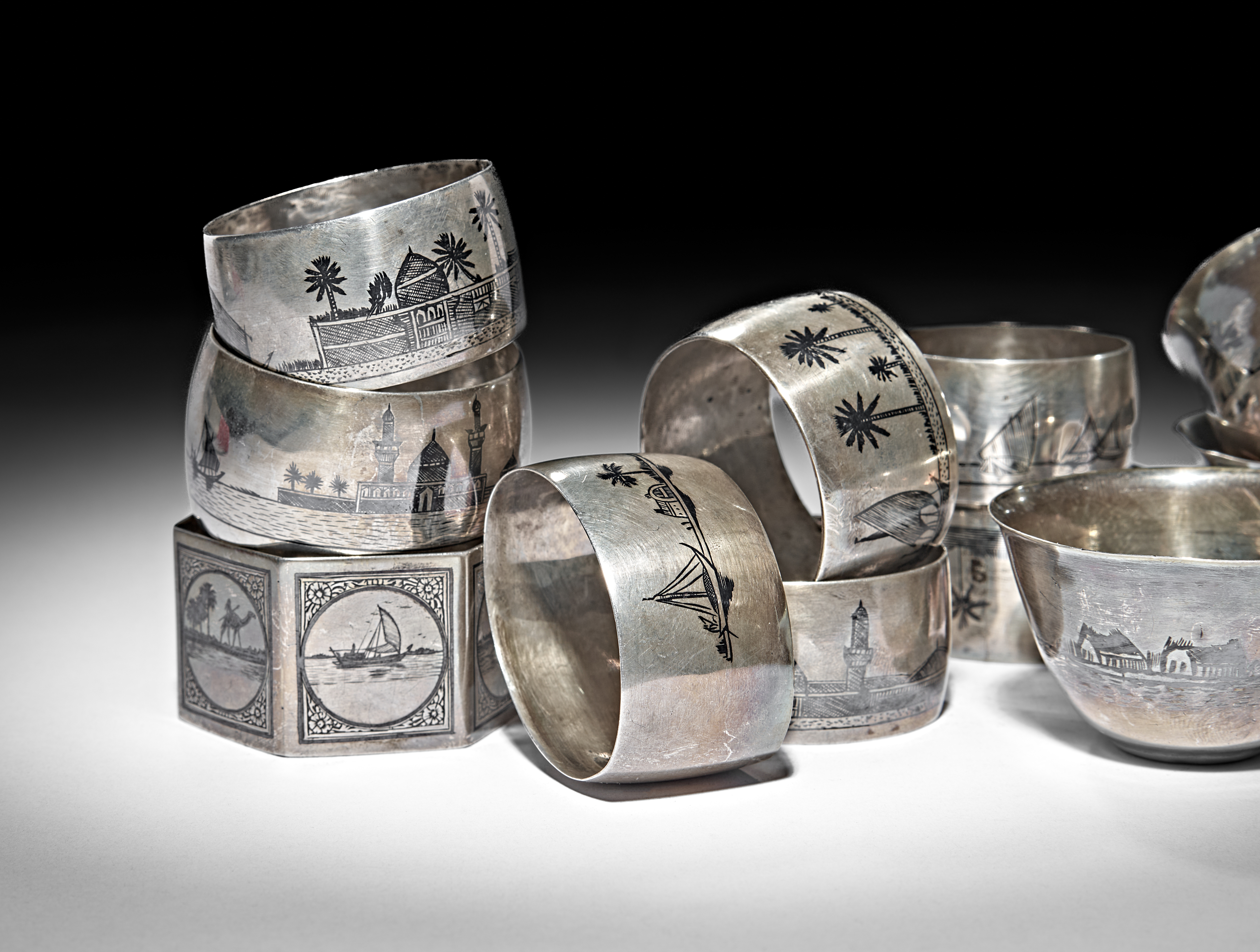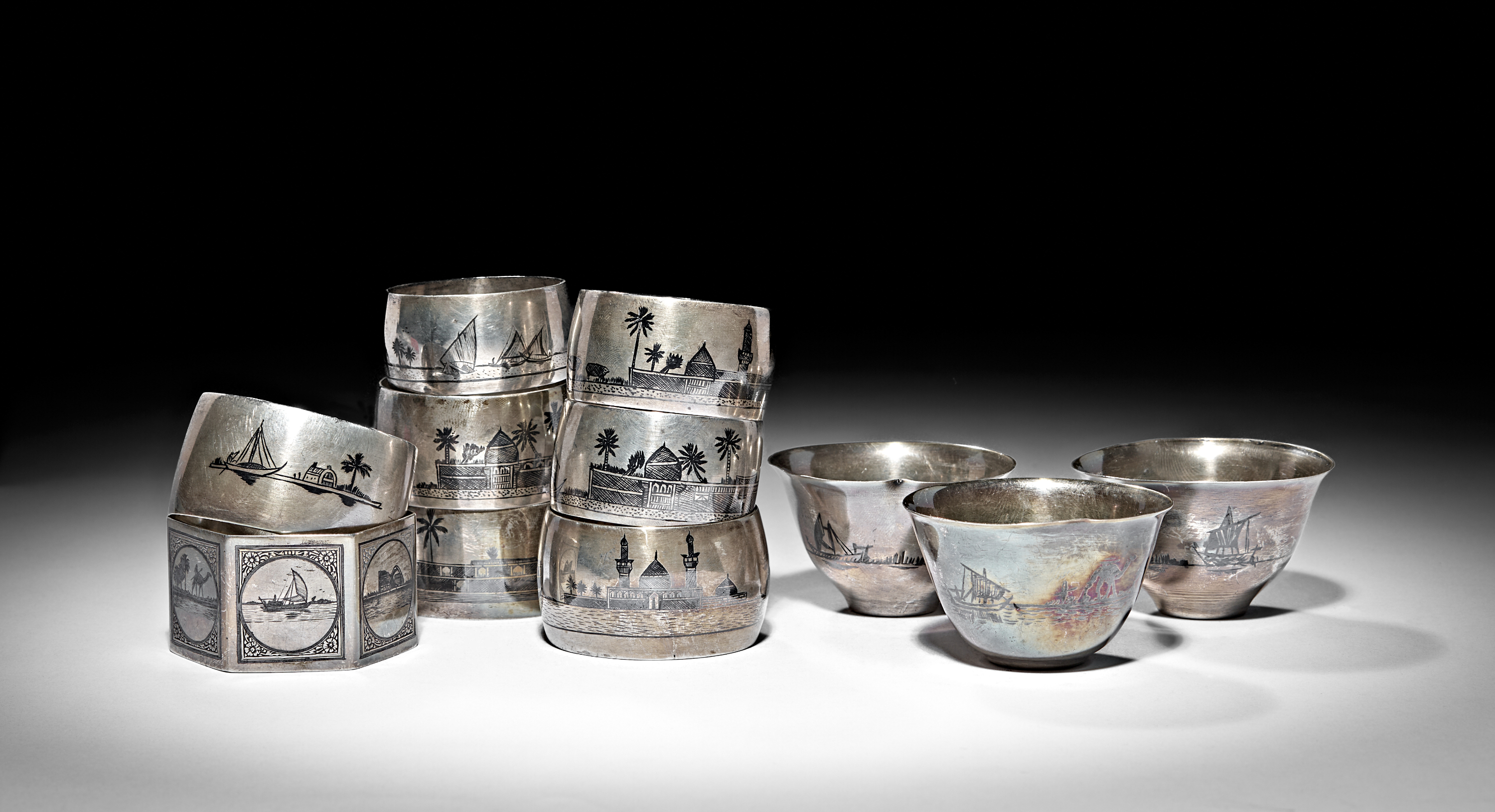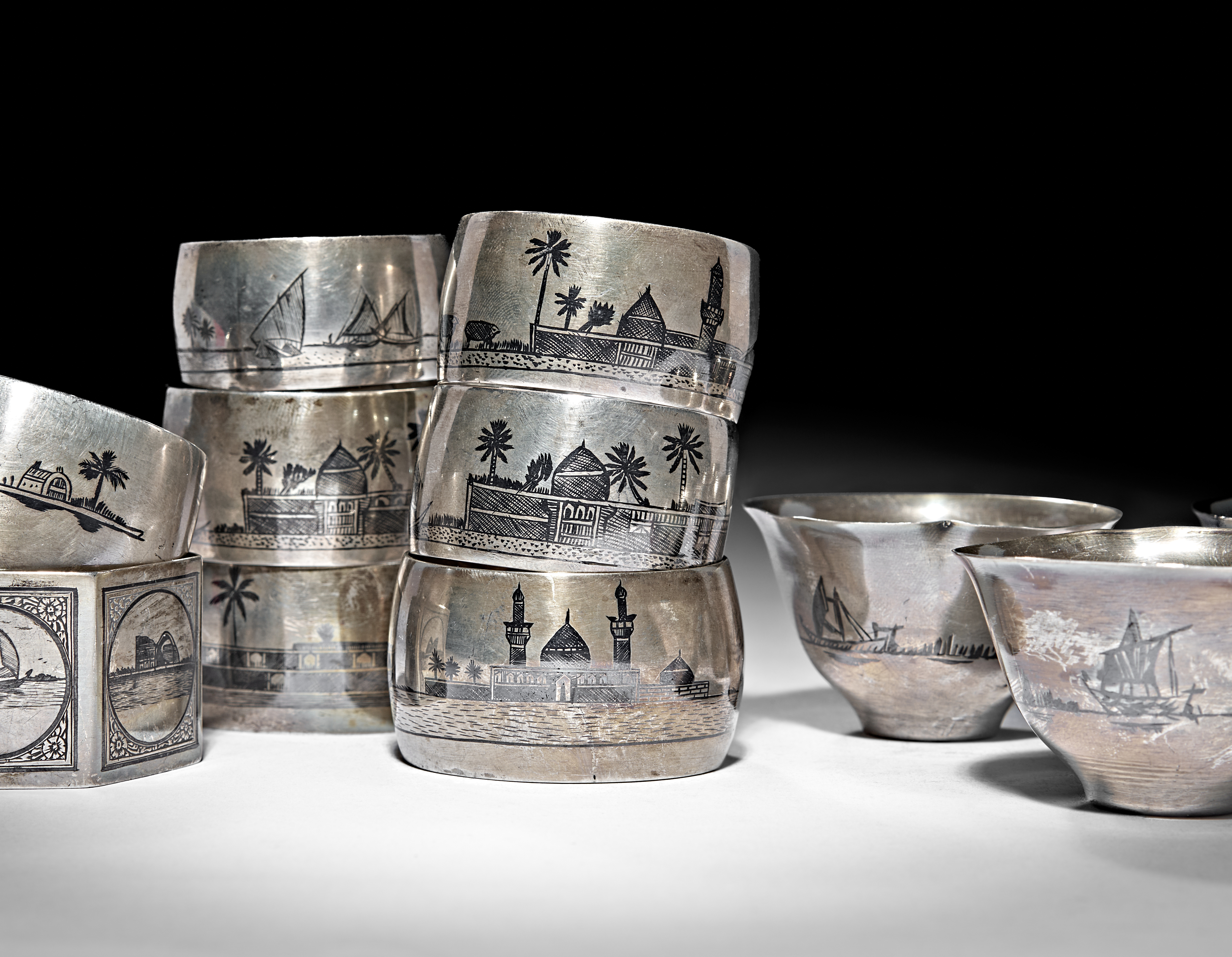A GROUP OF IRAQI SILVER AND NIELLO NAPKIN RINGS AND COFFEE CUPS, 20TH CENTURY