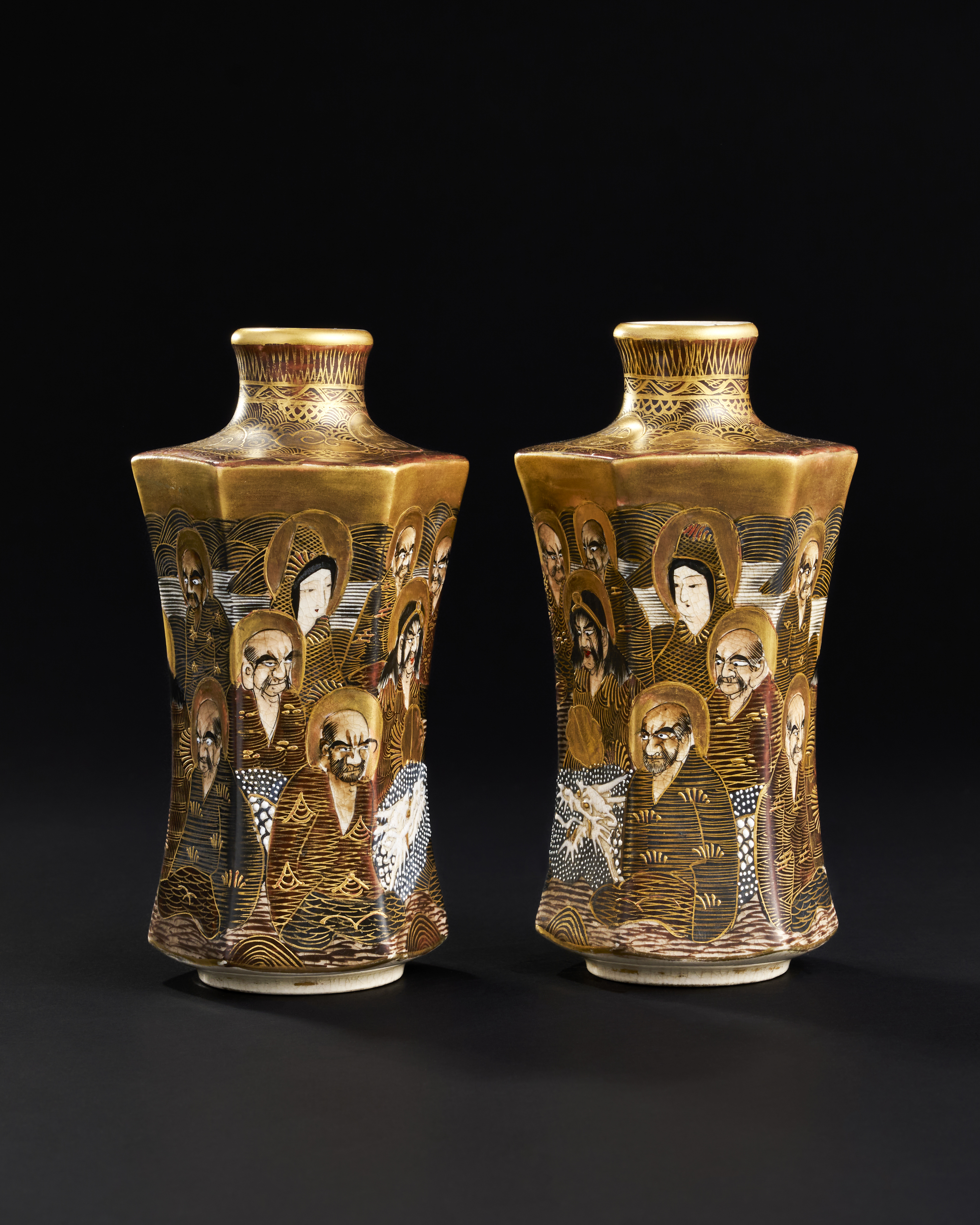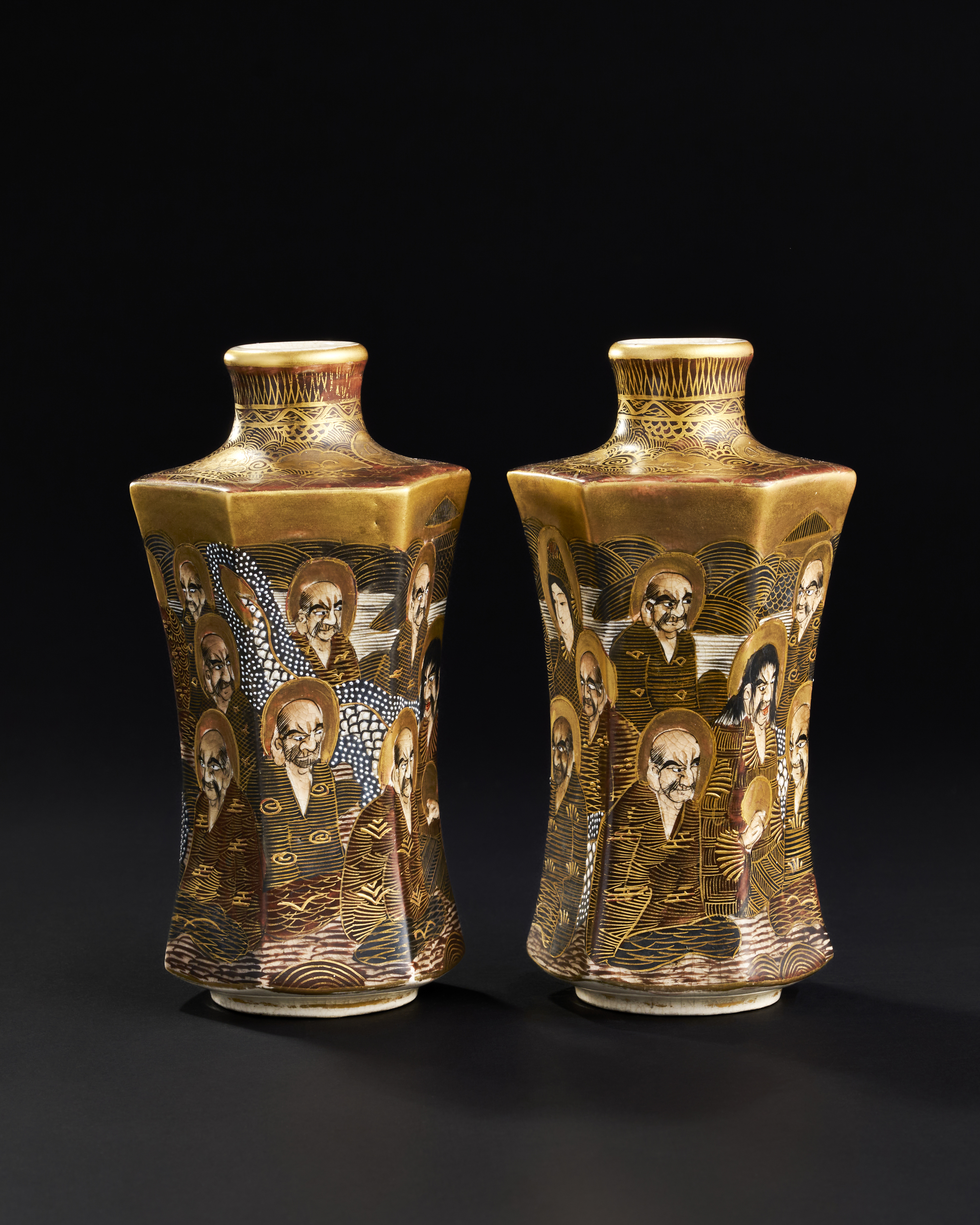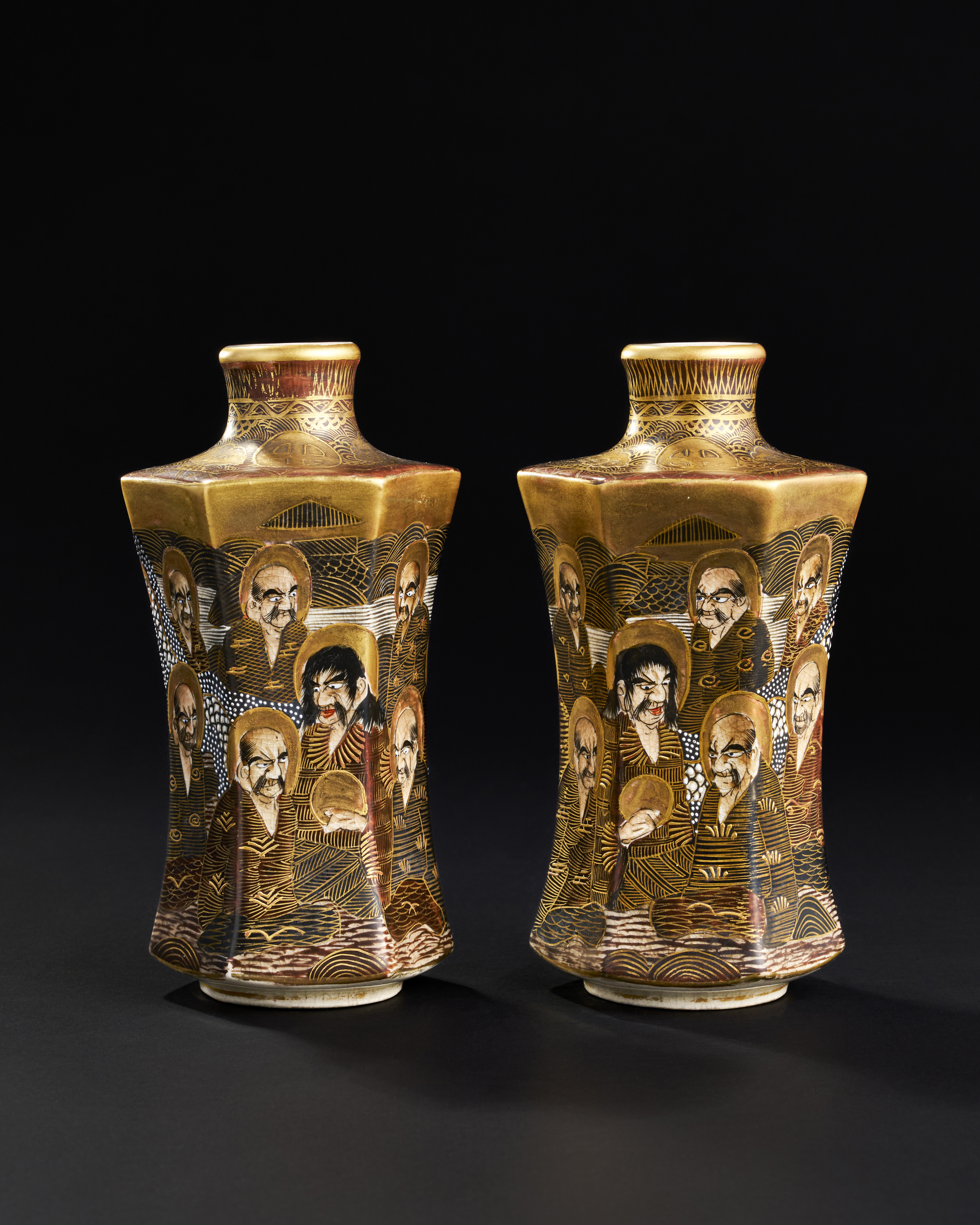 A PAIR OF HEXAGON JAPANESE CERAMIC VASES DEPICTING BUDDIST MONKS, 19TH CENTURY