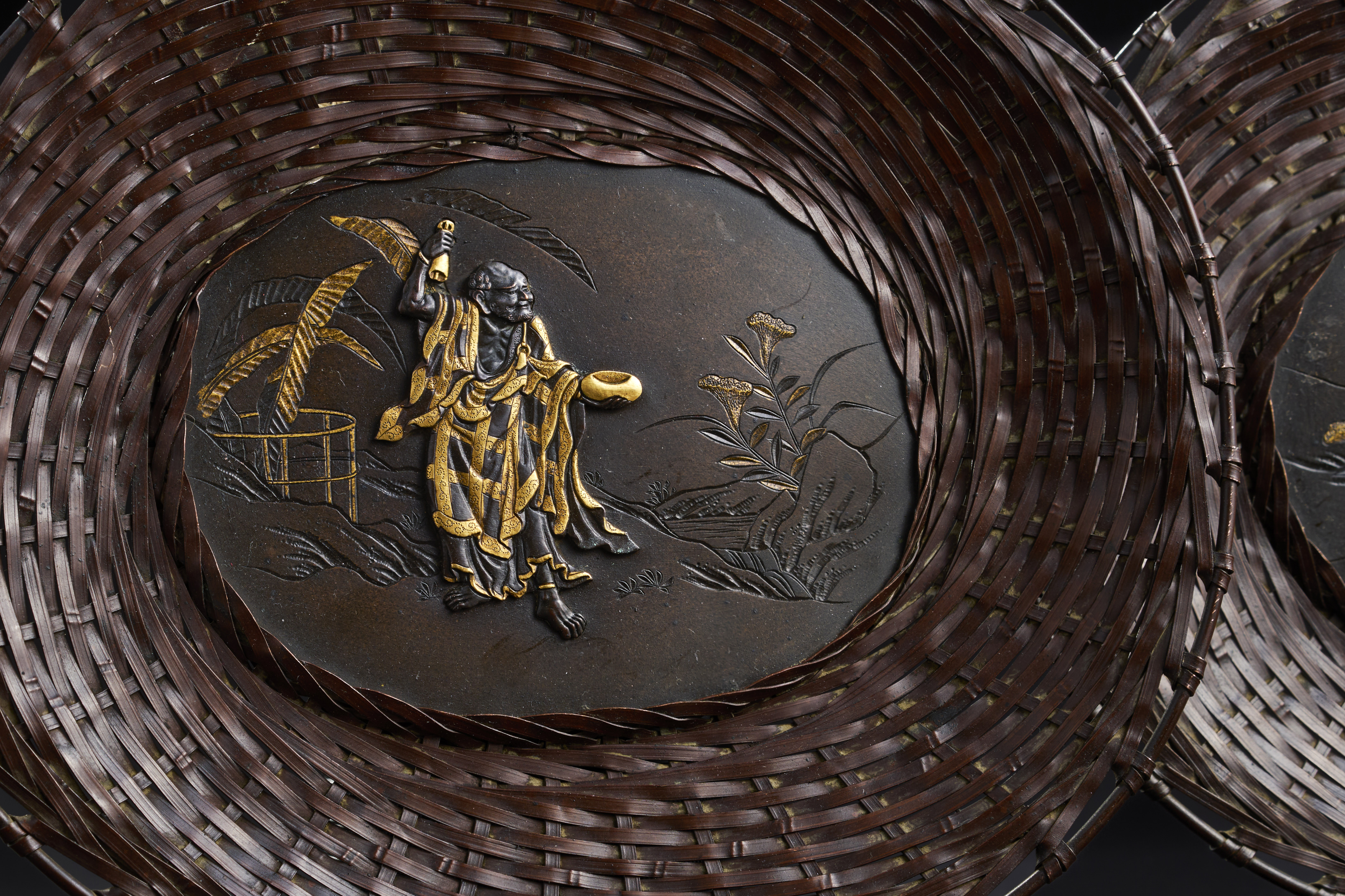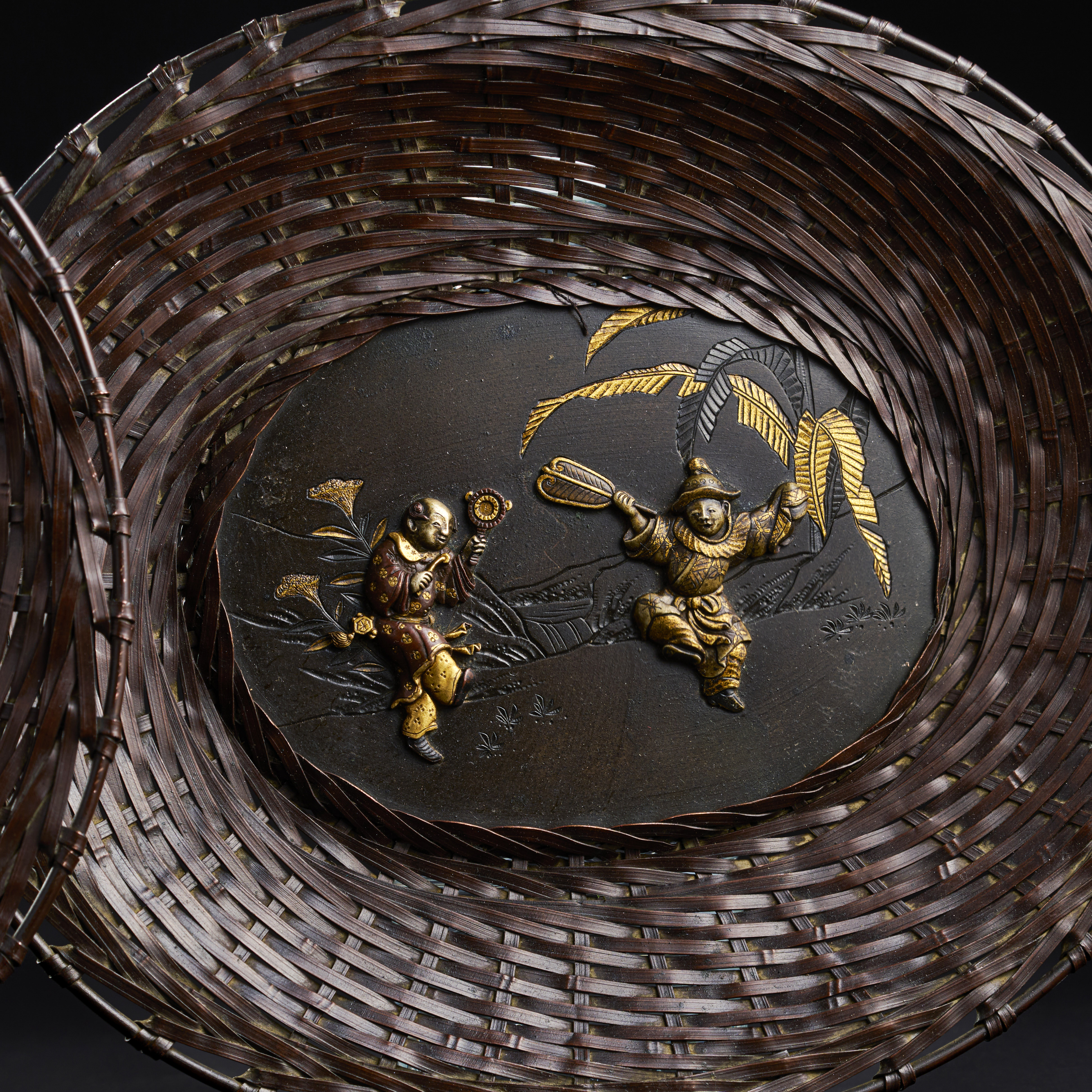 A PAIR OF JAPANESE INLAID MIXED METAL BRONZE TRAYS IN WEAVING TECHNIQUE, MEIJI PERIOD