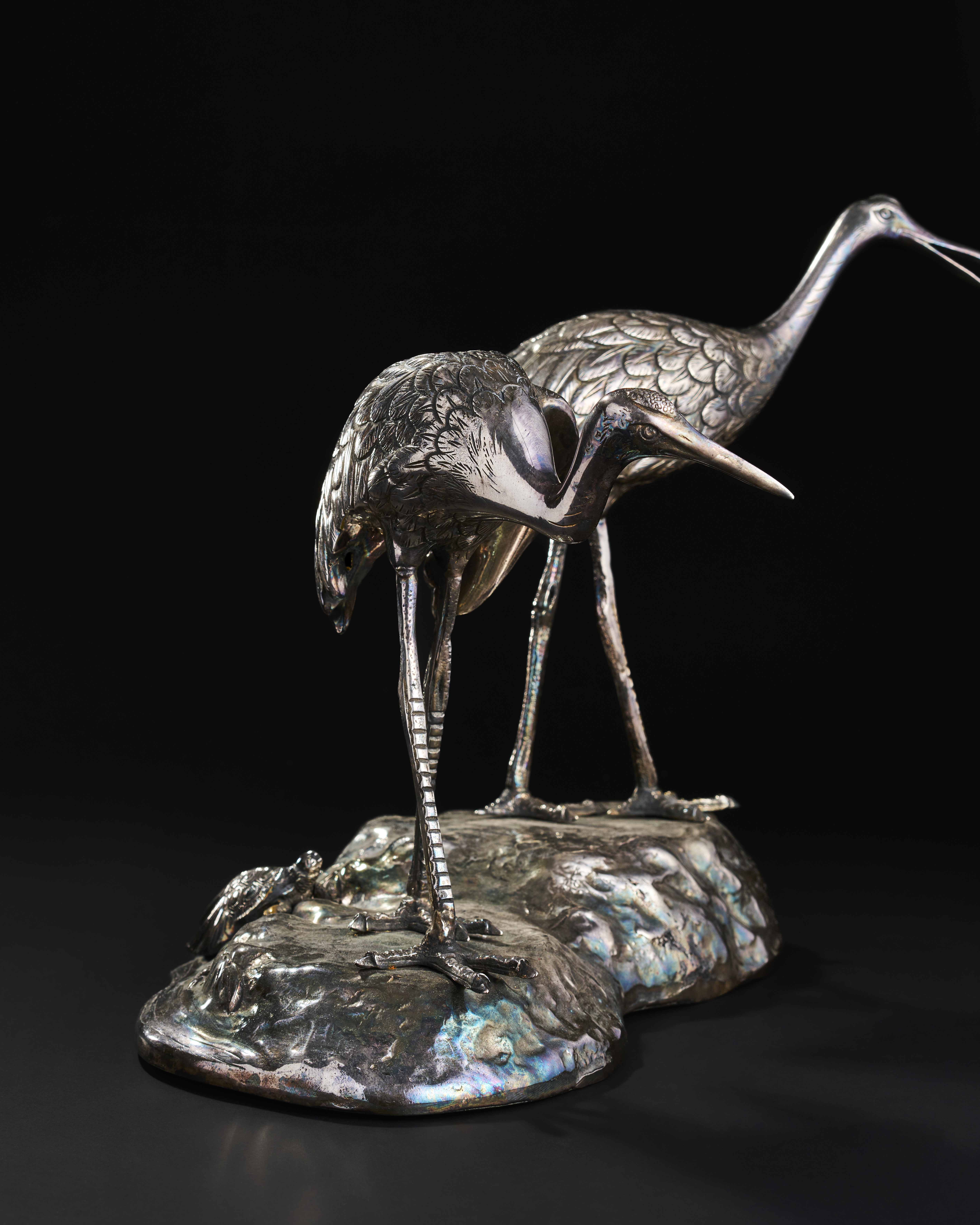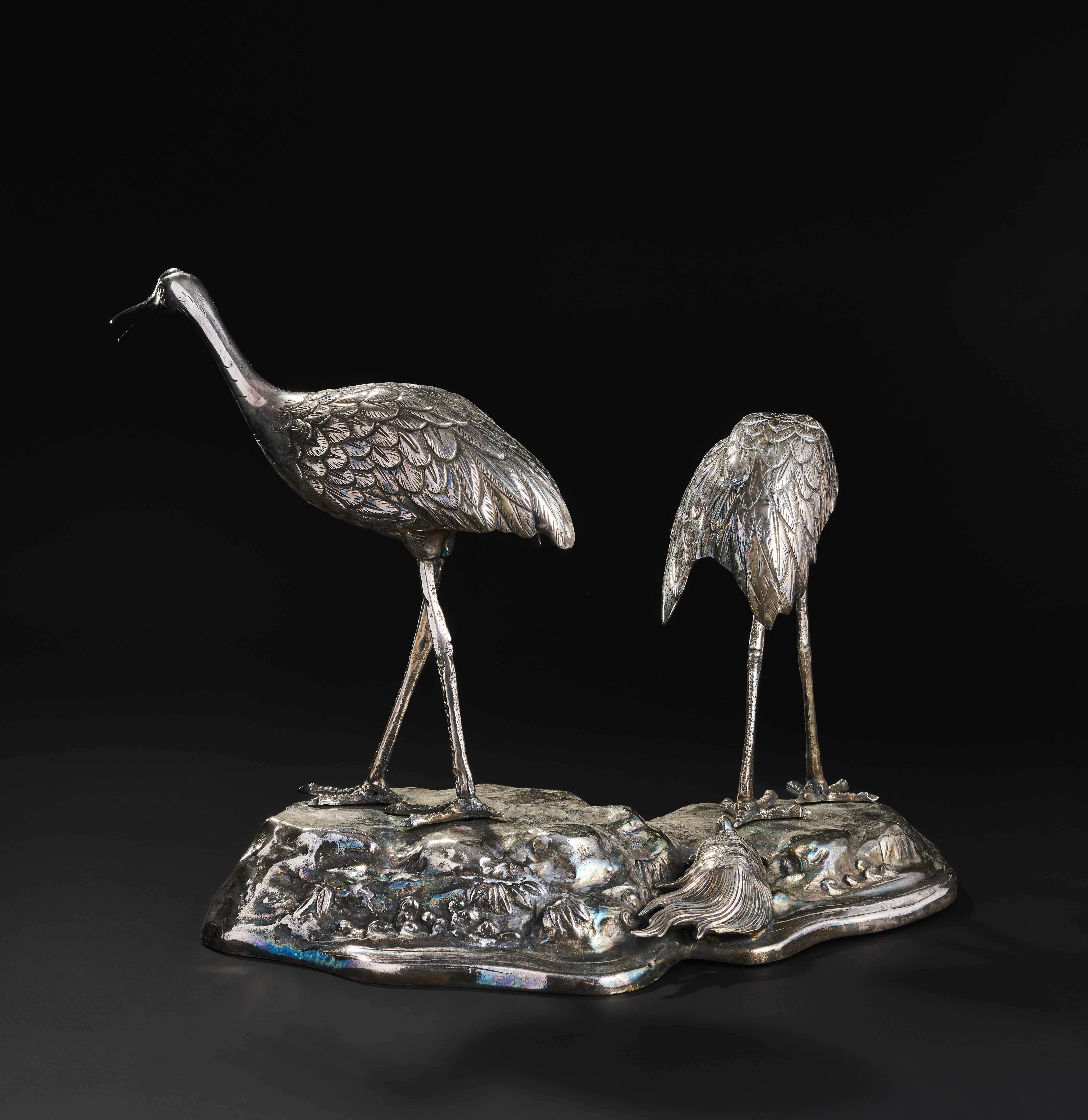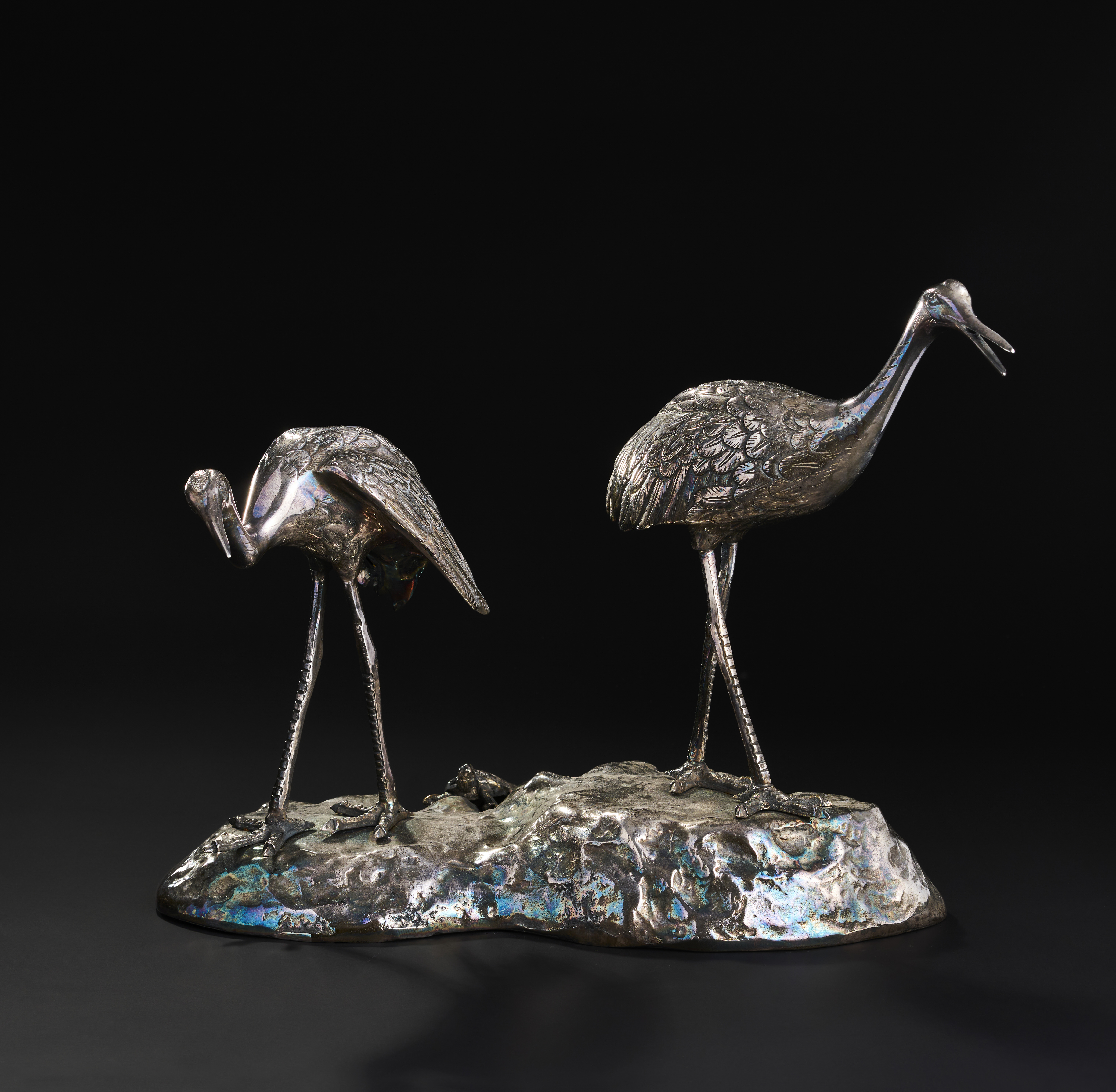 A LARGE JAPANESE METAL SCULPTURE OF CRANES, MEIJI PERIOD