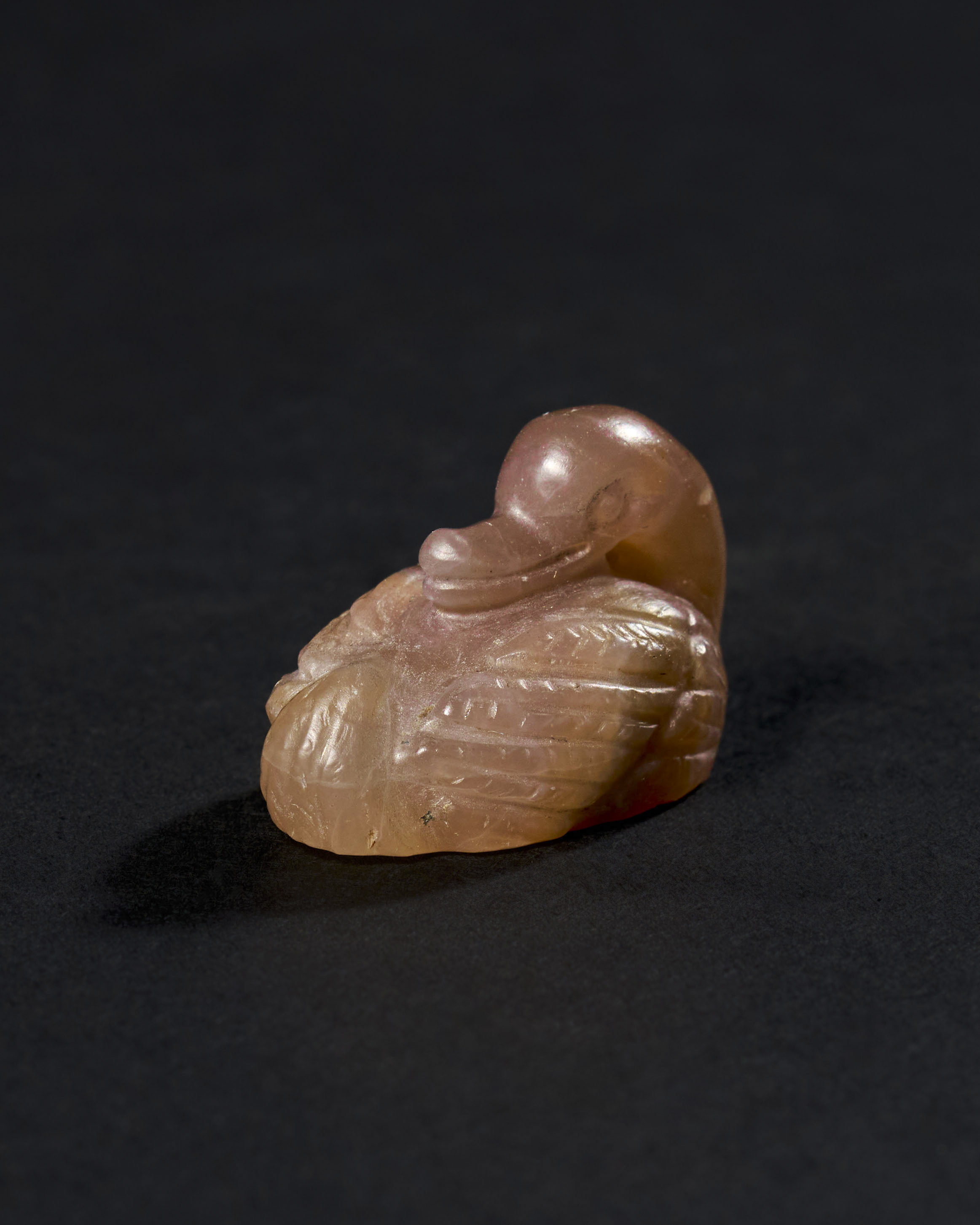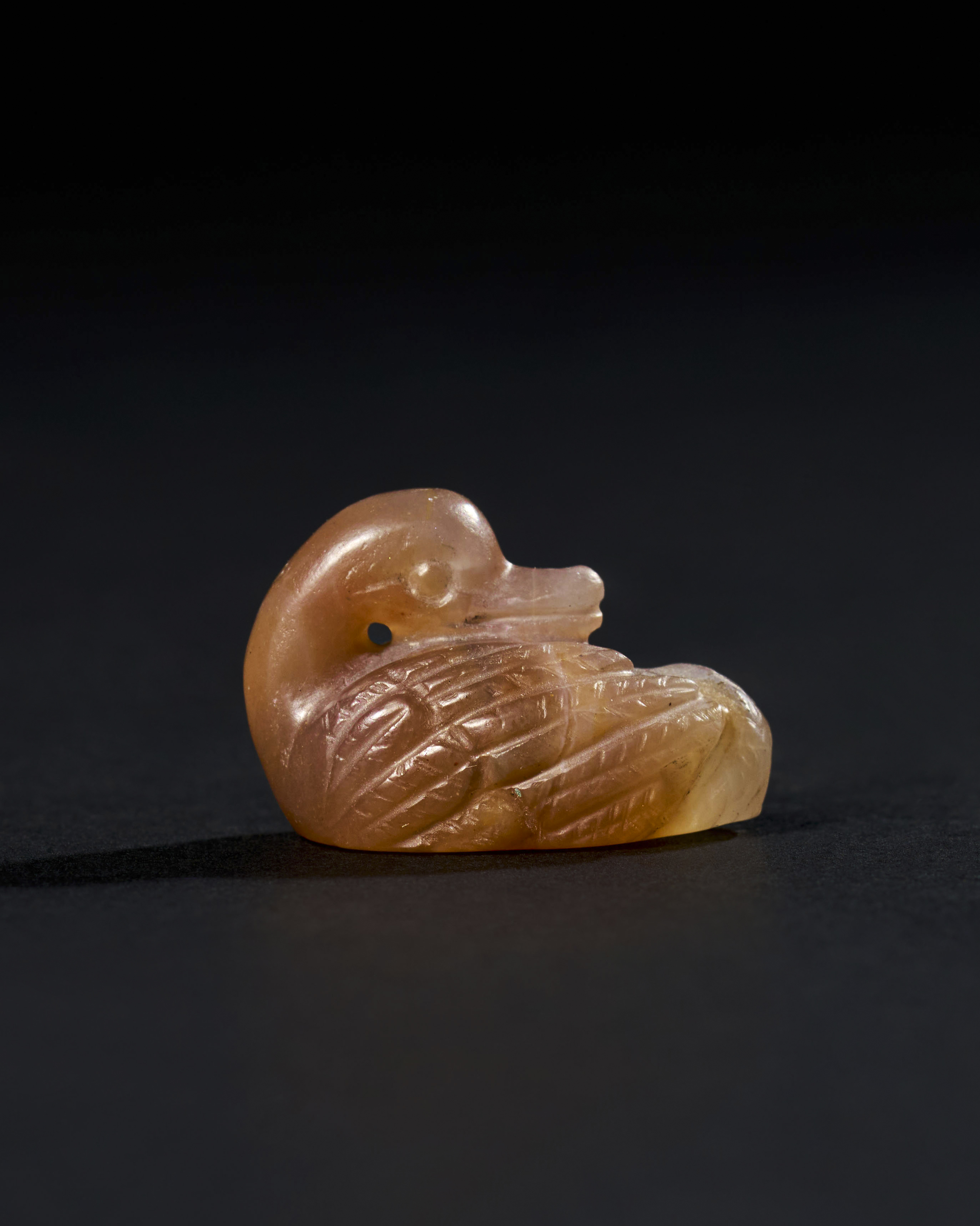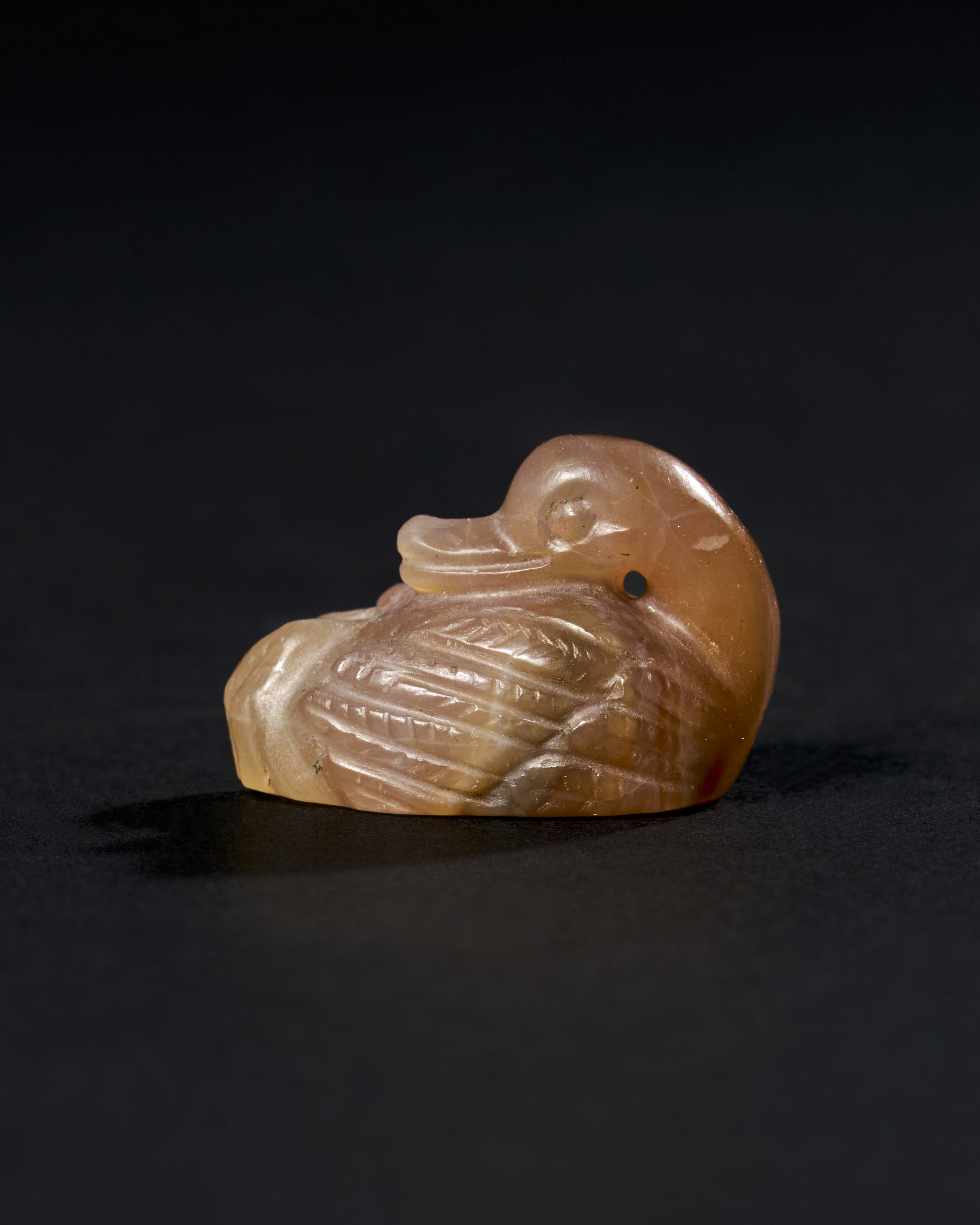 A chalcedony agate amulet depicting a seated duck, dating probably to the Achaemenid Period, circa 500-600 B.C. Showcases detailing in the duck’s feathers and form. Amulets like this were prized in the ancient world for their protective qualities and symbolic significance.