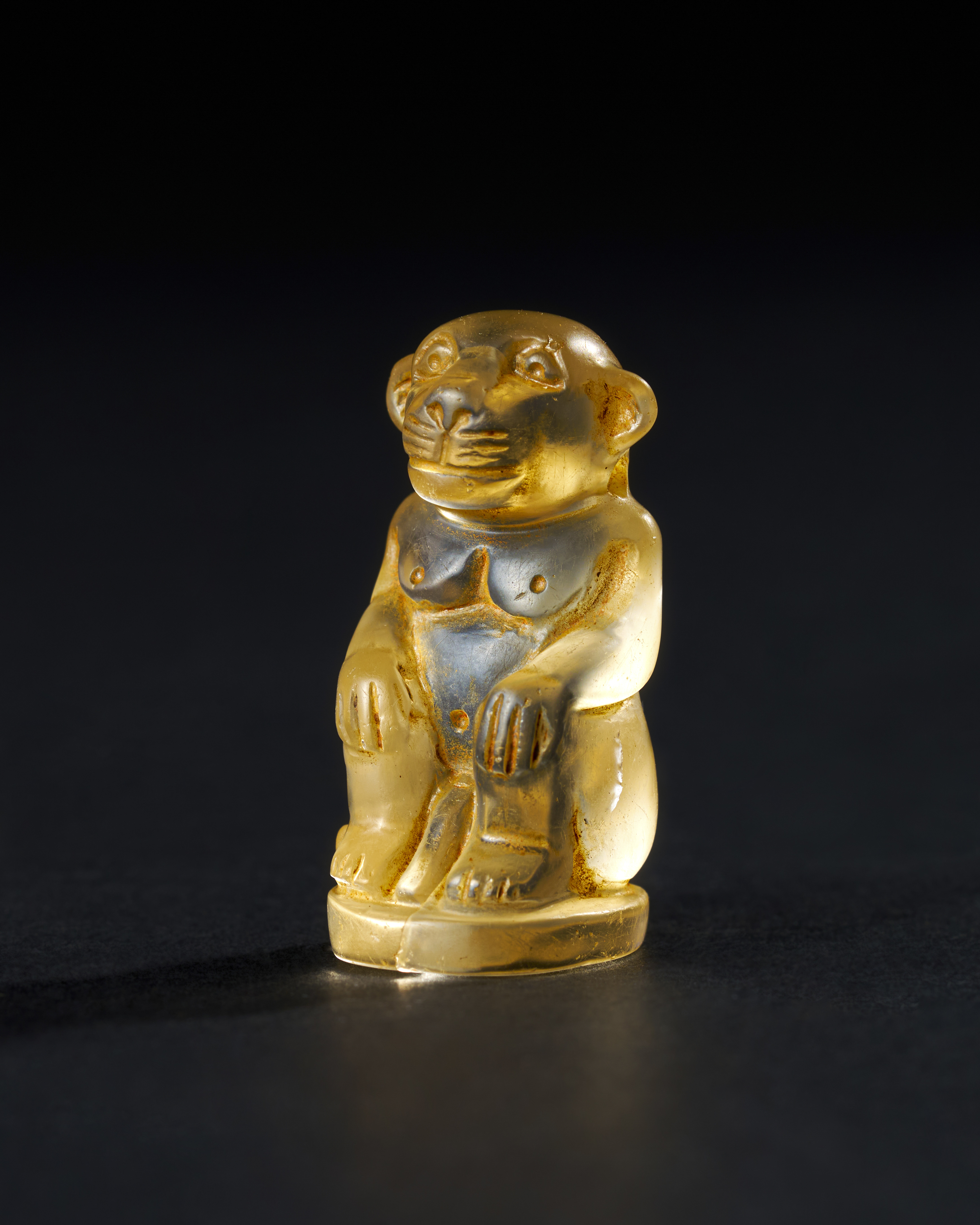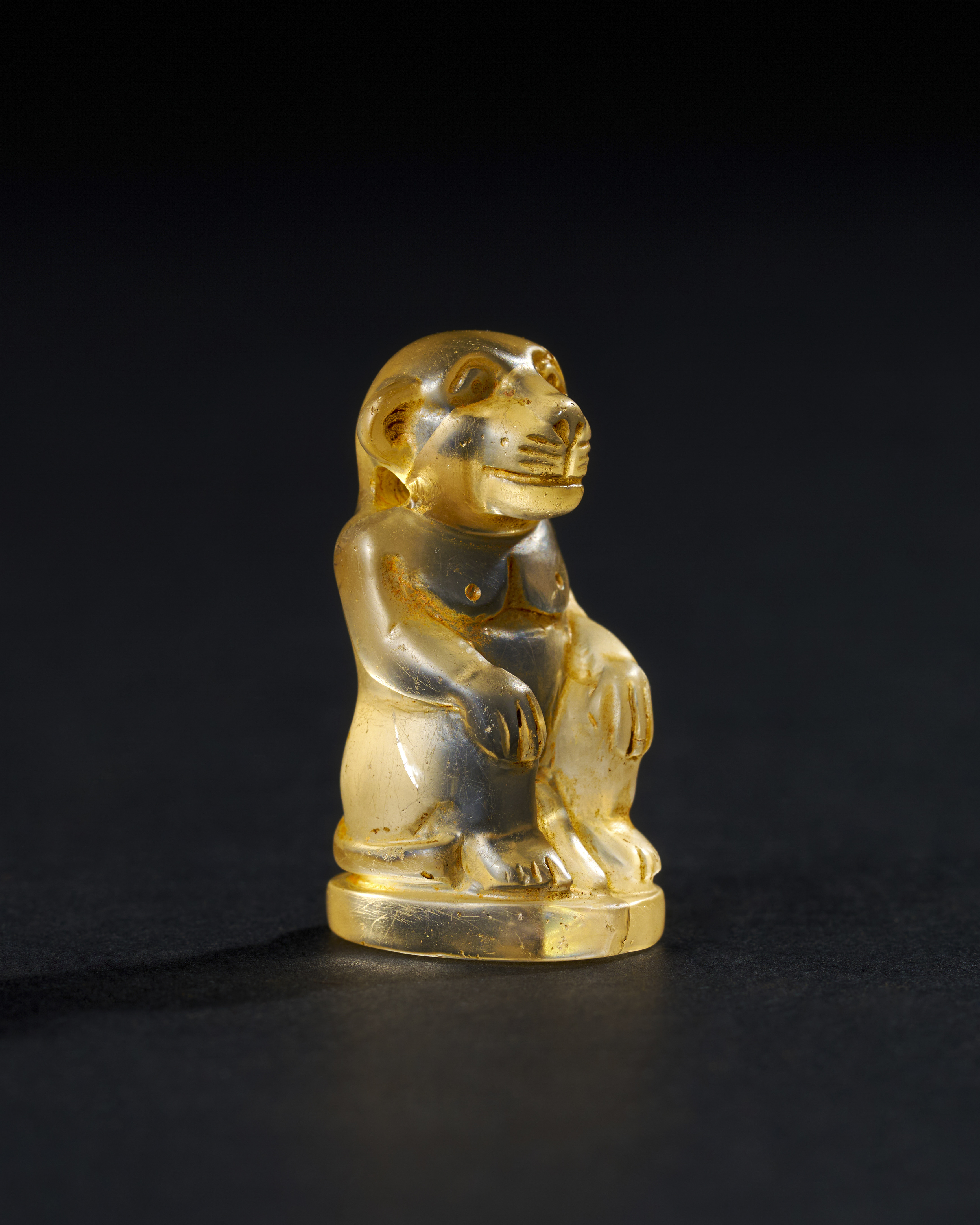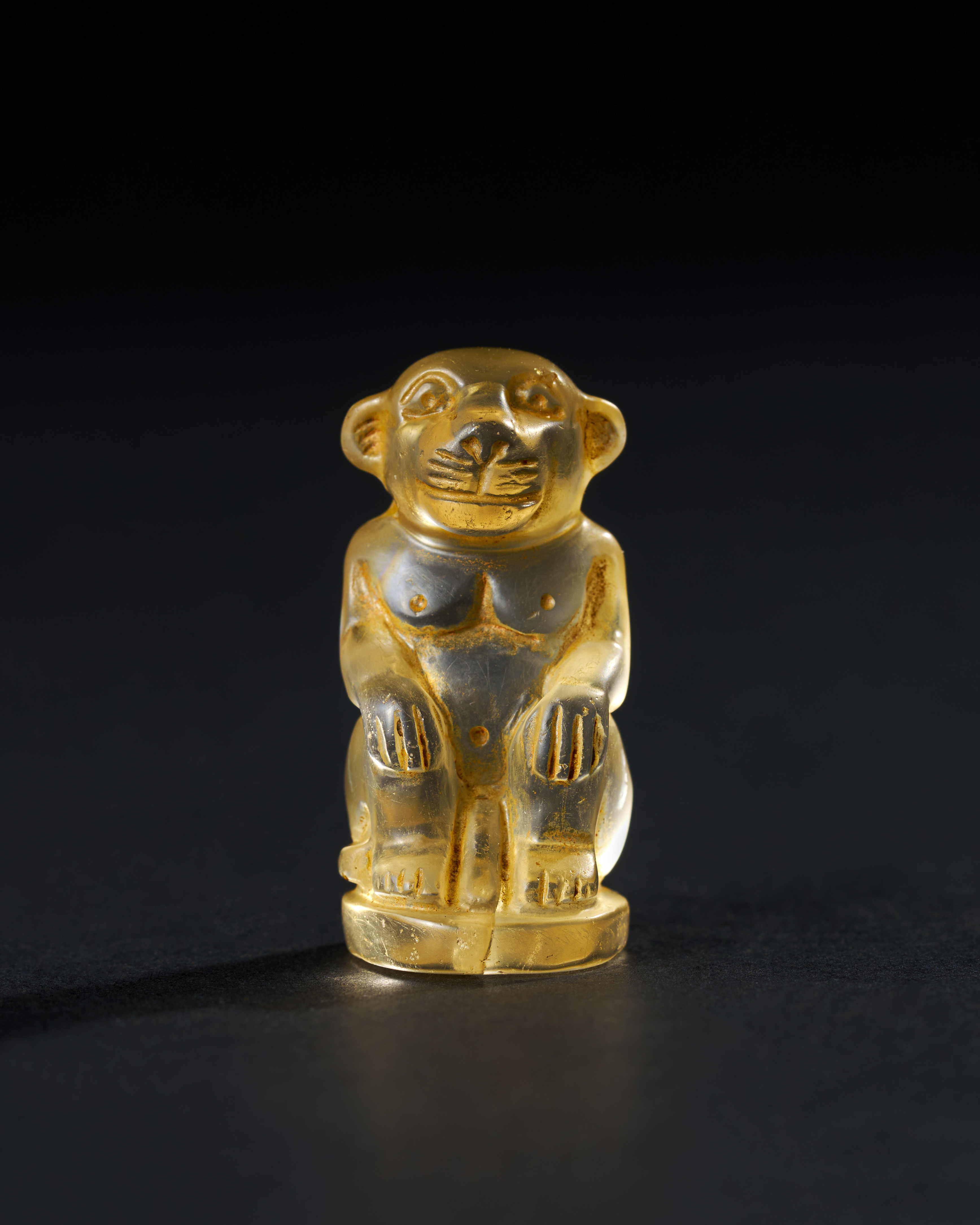 Carved from clear rock crystal, depicts a seated monkey, a form that carries both cultural and symbolic significance in ancient Egypt, particularly during the Talmudic period. The figure showcases the exceptional skill of the artisan, with detailed facial features and a posture that captures the naturalistic essence of the animal. The monkey is portrayed sitting on its haunches, with hands resting on its knees, a pose that suggests both alertness and contemplation.