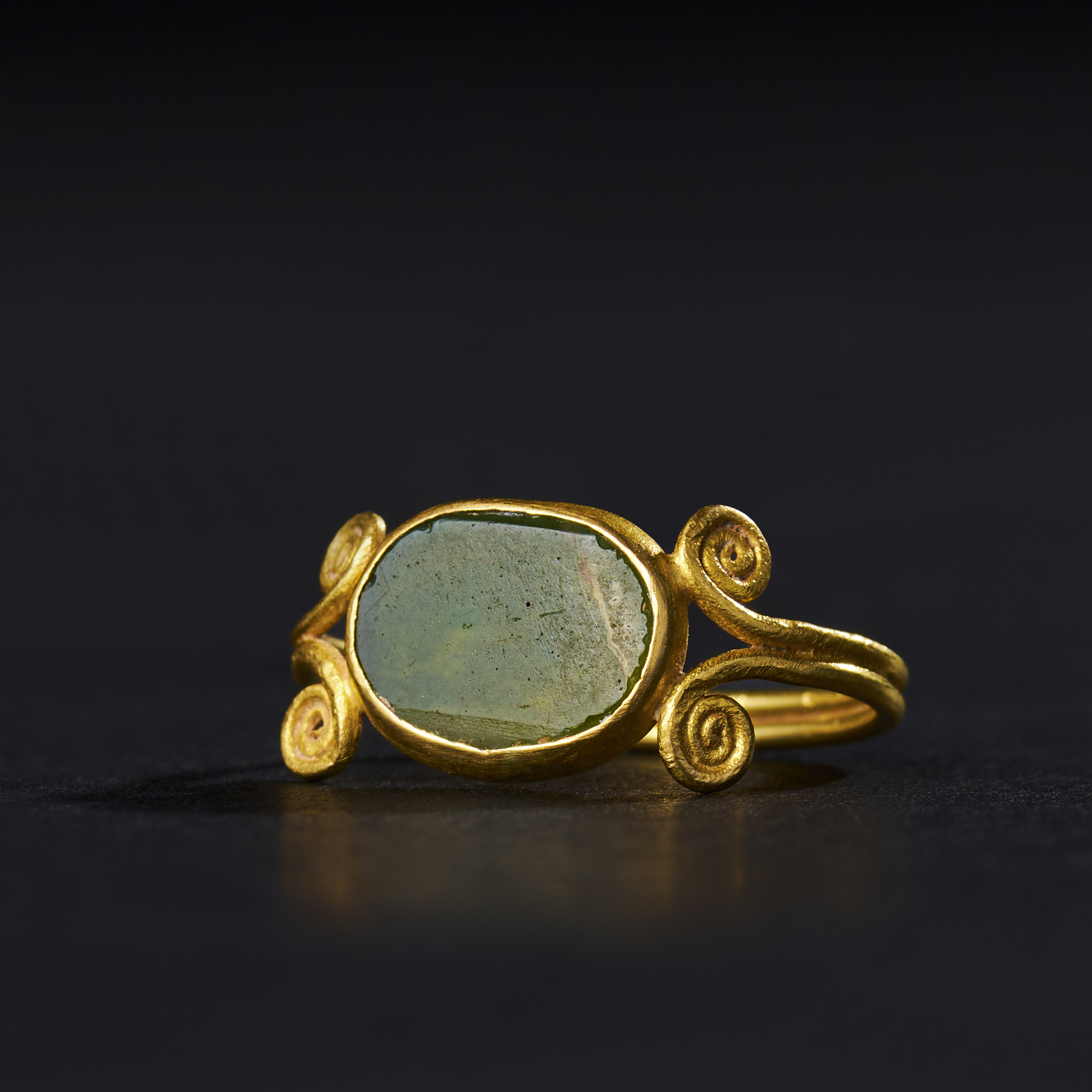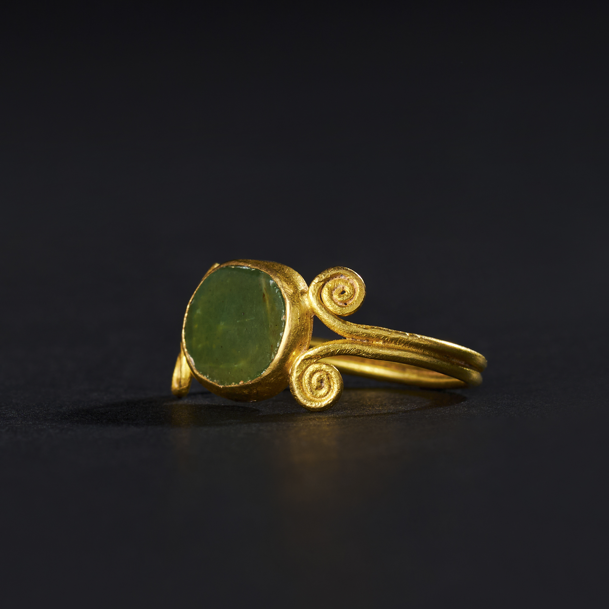 ARCHAIC PERIOD GOLD AND GREEN GLASS/STONE RING