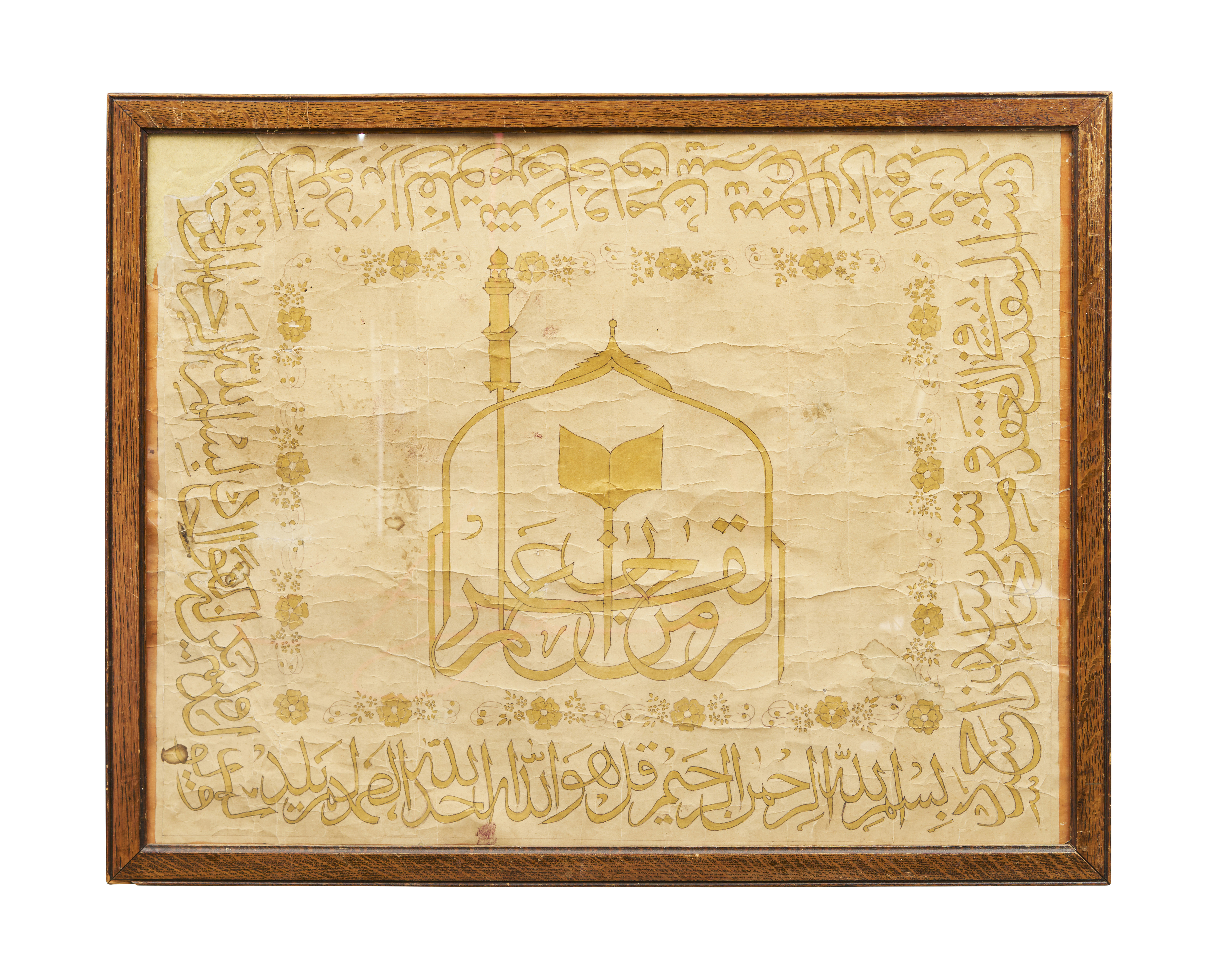 ISLAMIC CALLIGRAPHY PANEL FEATURING A MOSQUE DESIGN IN GOLD LEAF, POSSIBY OTTOMAN