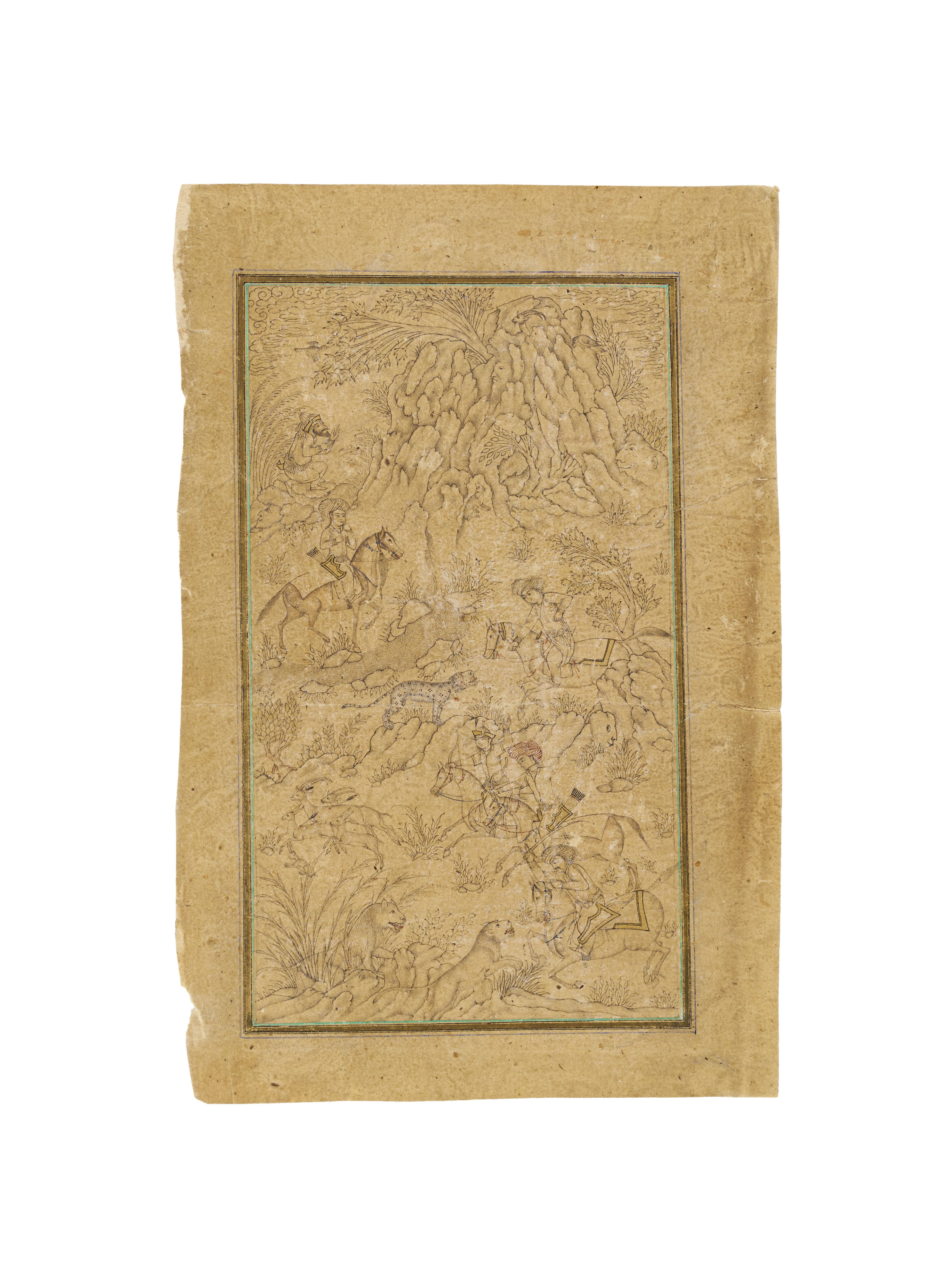 Persian Safavid drawing depicts a dramatic scene of horsemen in a rugged landscape, possibly portraying a battle or a hunt. The composition is rendered with exceptional finesse, showcasing dynamic figures on horseback amidst intricate natural elements such as jagged rocks and vegetation.