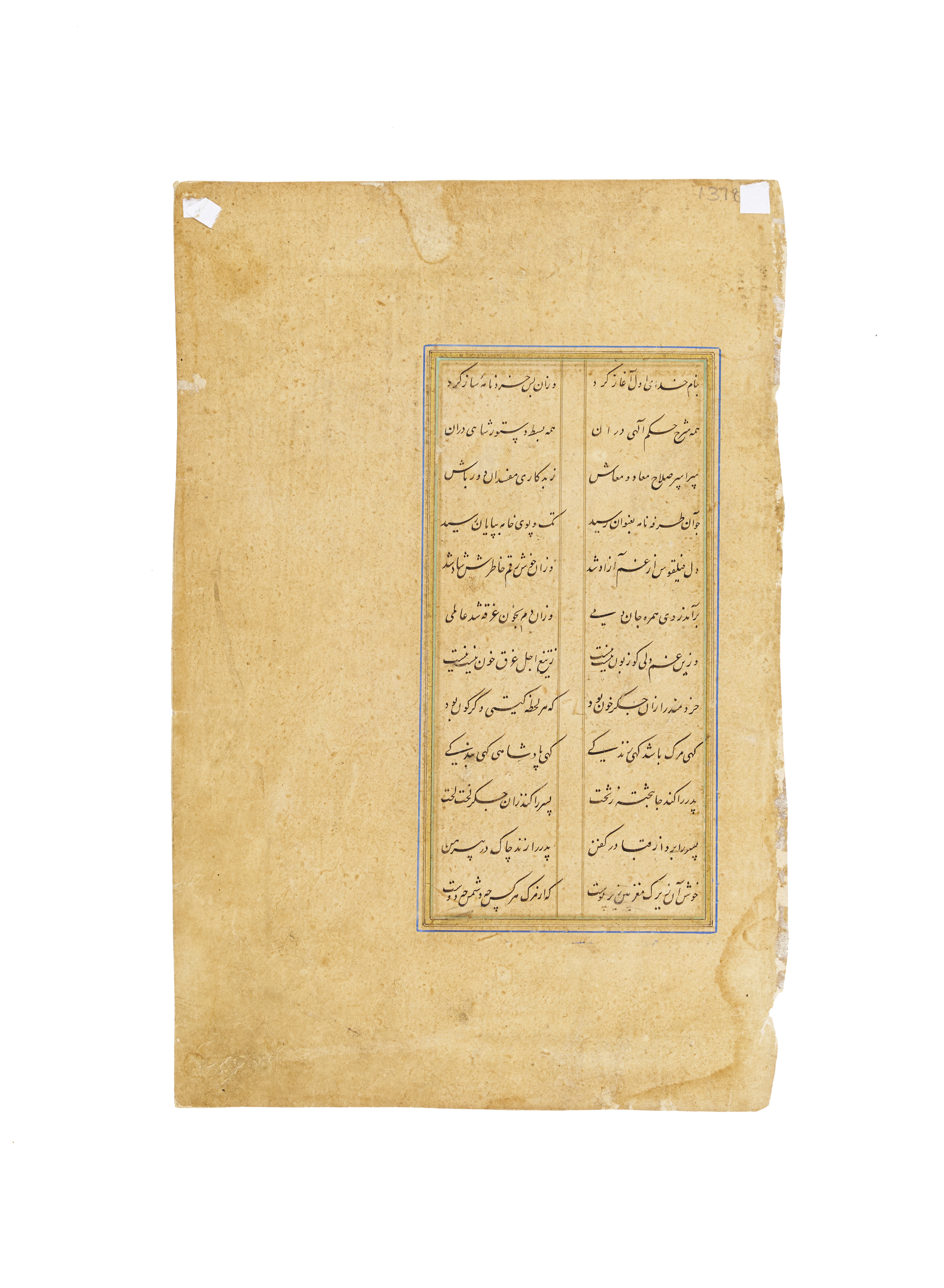 The reverse side features beautifully executed Persian calligraphy in black ink, The script is neatly arranged in vertical columns, likely verses of poetry.