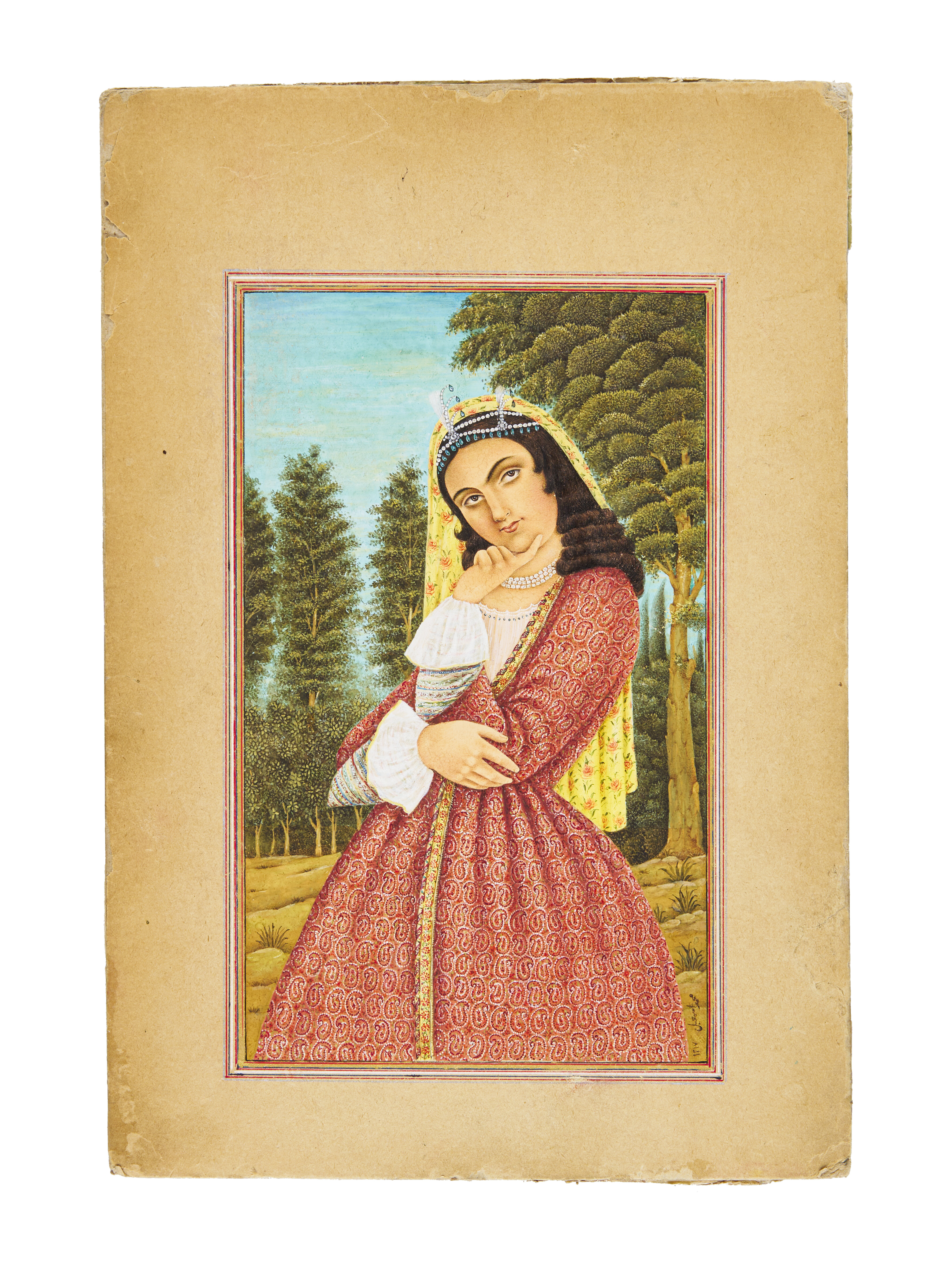 A Persian miniature painting portrays a regal princess in an elegant red and gold-patterned gown, standing gracefully against a lush landscape of trees and a bright blue sky. Her finely detailed facial features, delicate jewelry, and elaborate headdress reflect the refinement of Persian artistic traditions. She wears a pearl-adorned crown with a translucent yellow veil cascading down her back. Her serene expression and poised posture, with one hand gently placed on her chest, convey a sense of elegance and grace.