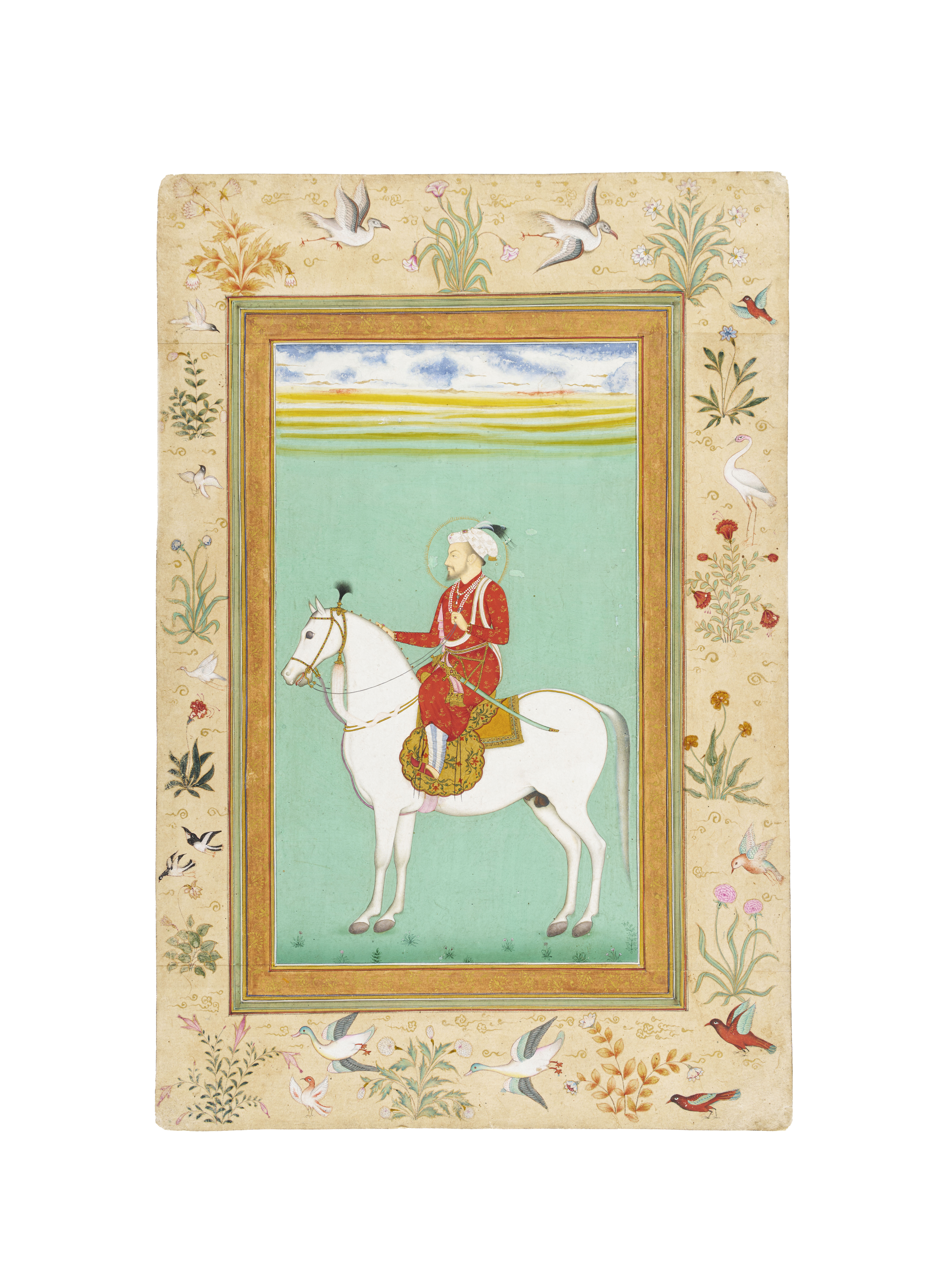 A finely detailed 19th century Indian miniature painting, depicting the young Shah Jahan elegantly seated on a white horse. The figure is adorned in regal red attire, with intricate gold accents, set against a vivid turquoise background. The scene is framed by an exquisitely rendered floral and bird motif border.