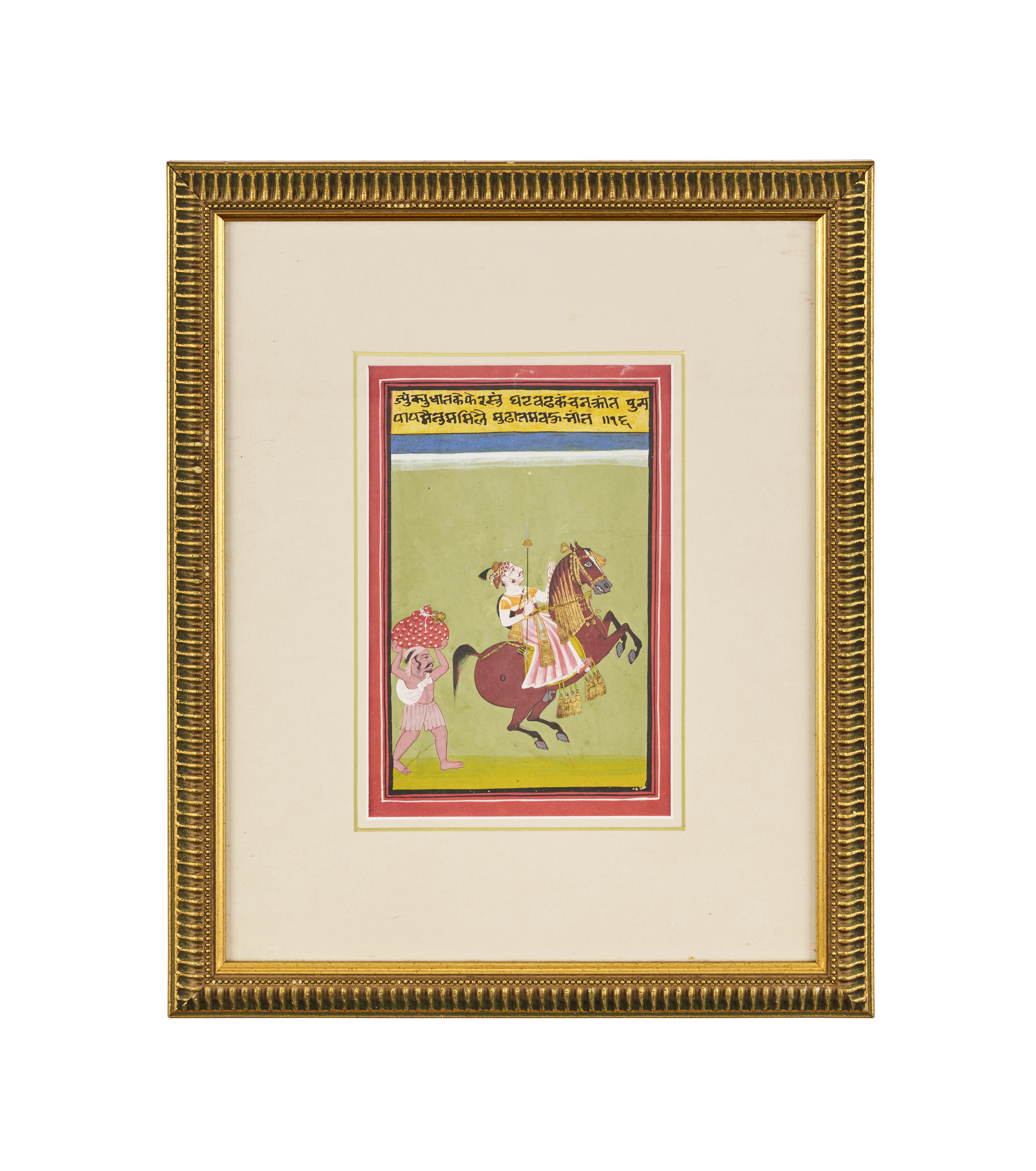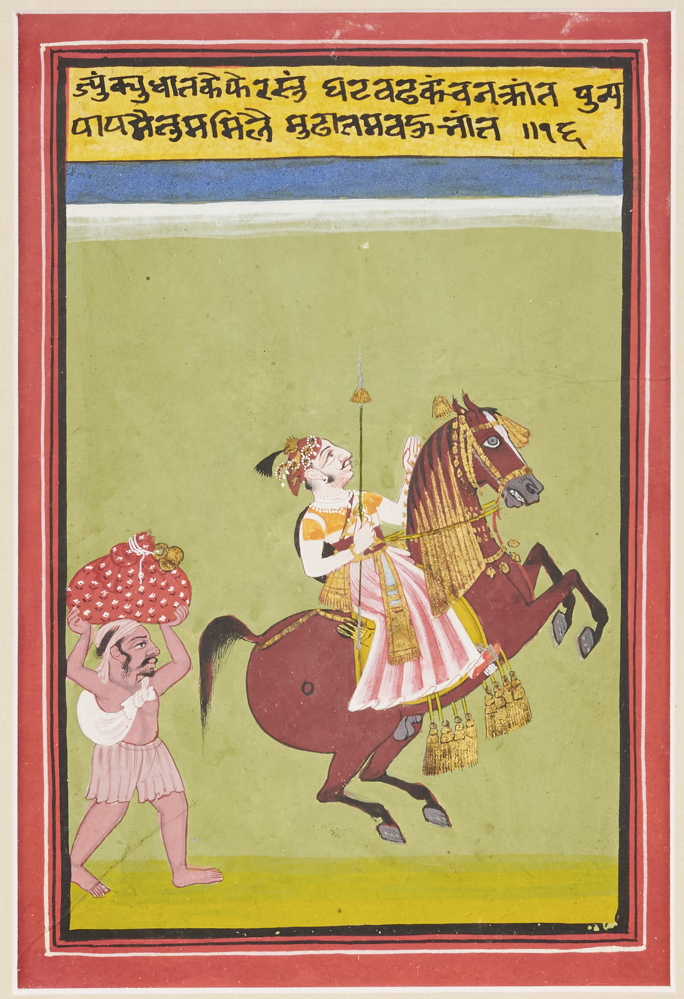 Opaque pigments heightened with gold on paper, the vertical-format composition depicting a Rajput ruler on a chestnut steed bedecked in gold ceremonial tassels and trappings, holding a tall spear, followed by a bare-footed and half-clad, humble foot attendant carrying a heavy bag on his head, the scene a strong visual reminder of the social difference between castes, with 2ll. of black ink Devanagari script at the top against an ochre yellow background, set within concentric black and white rules, and bright red borders, mounted, glazed, and framed.