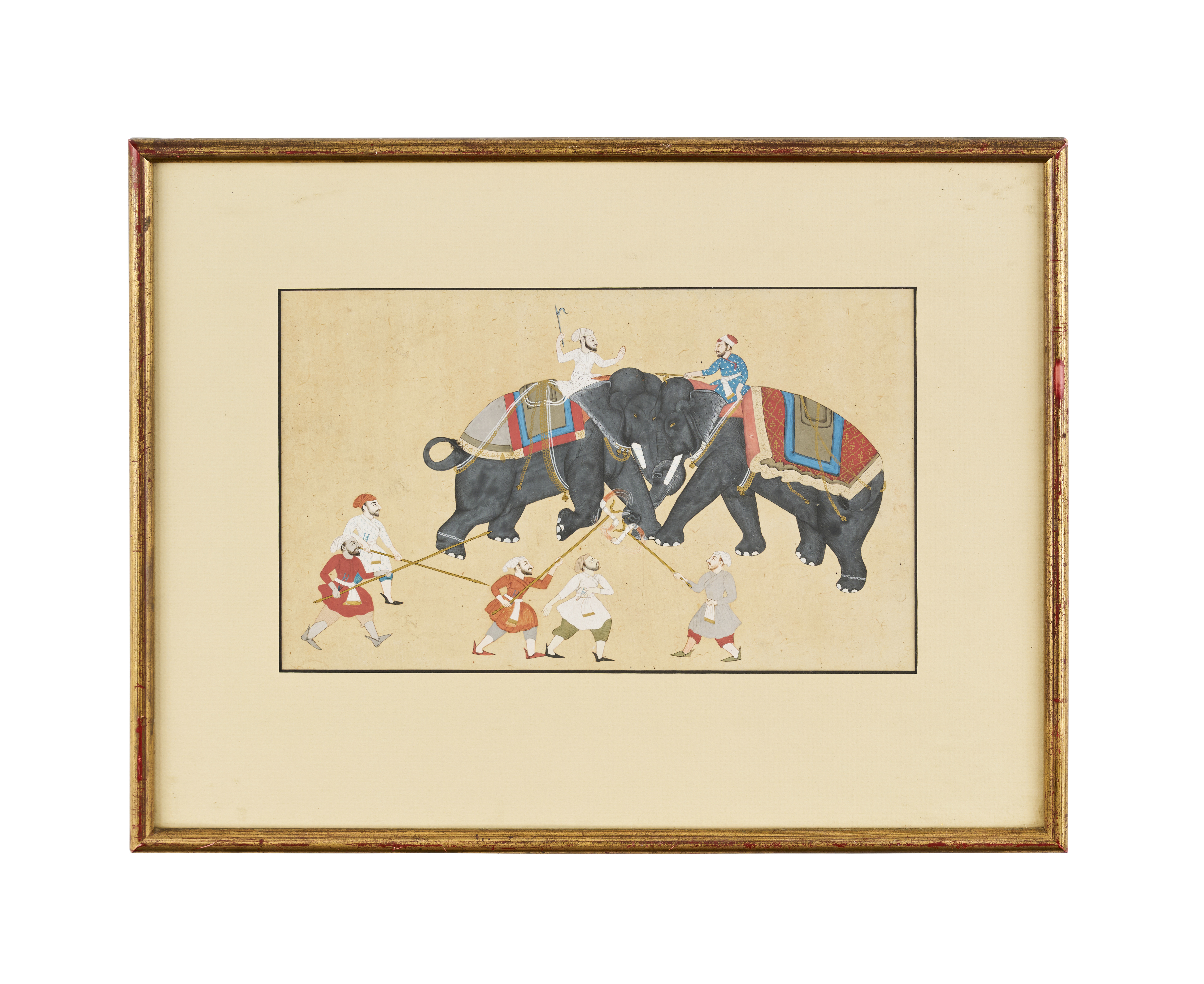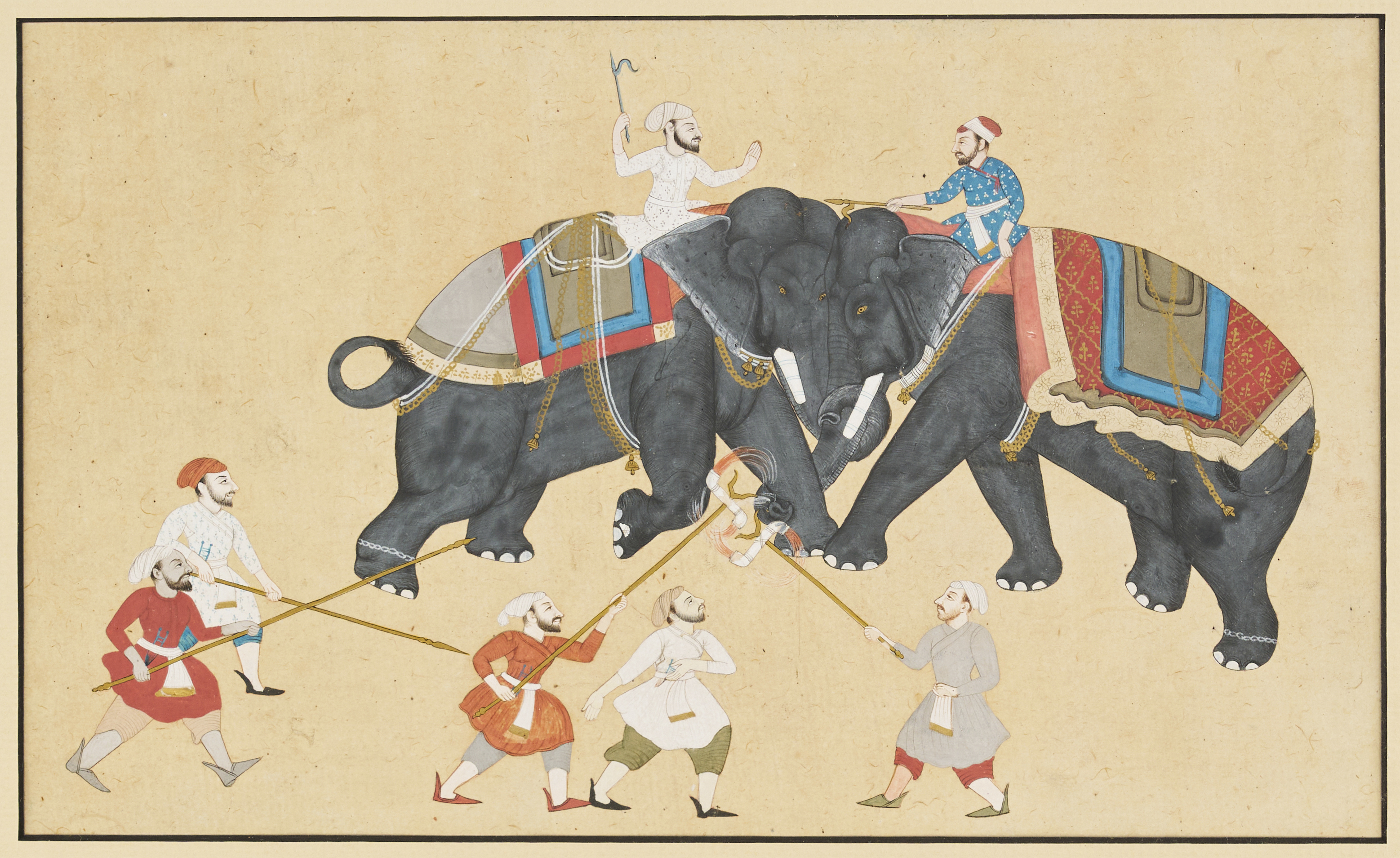 A 19th-20th century Indian painting captures the dramatic intensity of an elephant fight, a subject historically associated with royal entertainment and display of power. The painting showcases two elaborately adorned elephants in combat, each guided by mahouts in traditional attire. The vivid colours and attention to detail bring the scene to life, highlighting the strength and grandeur of the elephants against a dynamic backdrop.
