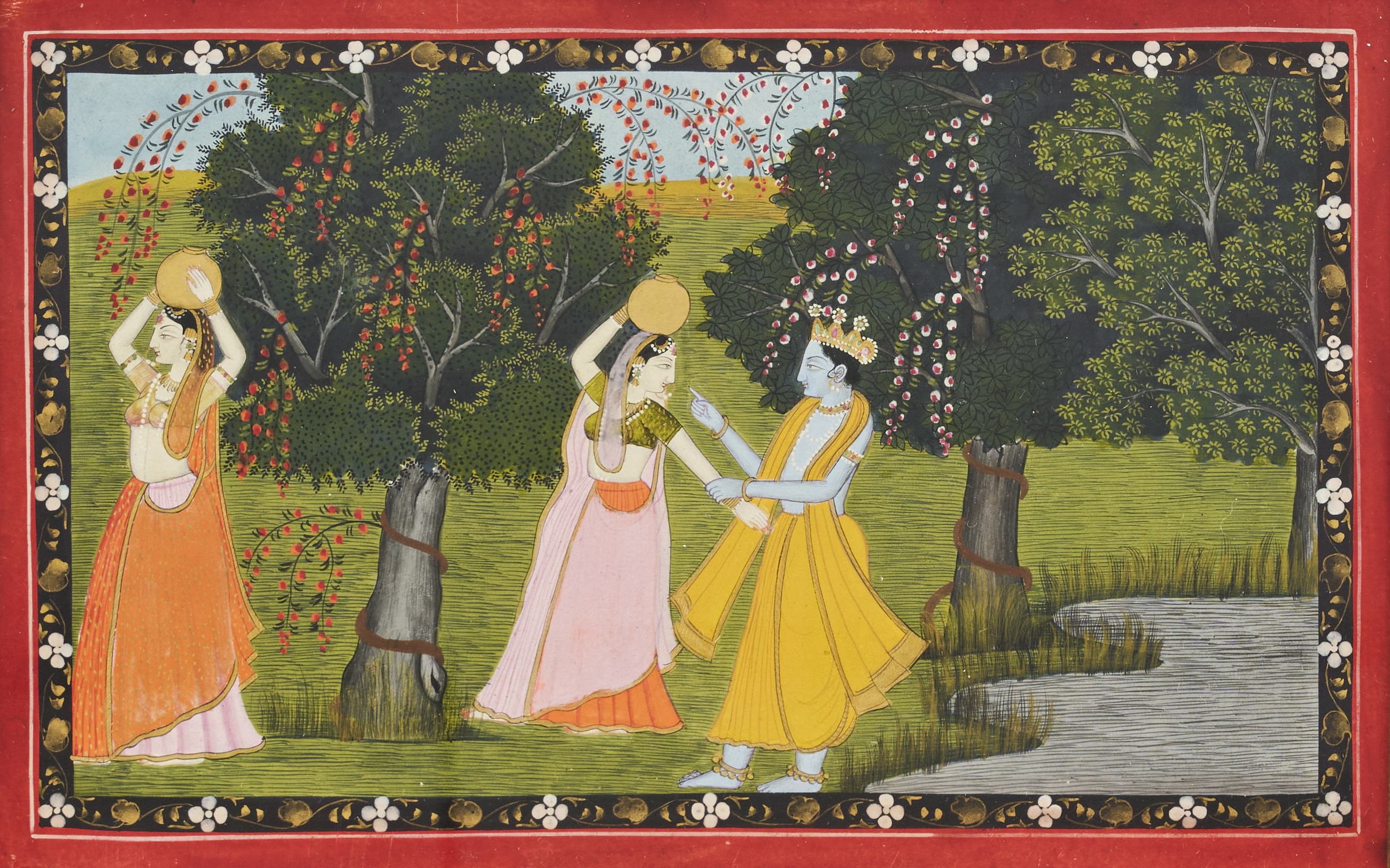 A fine 19th century Indian Pahari School miniature painting beautifully depicts Lord Krishna with Radha and her companion in a lush garden setting. Krishna, adorned in golden robes, is shown playfully interacting with Radha as they walk beneath flowering trees, rich with detail. The vivid colours, particularly the contrast of Krishna’s yellow attire against the greenery, bring life to this divine scene.