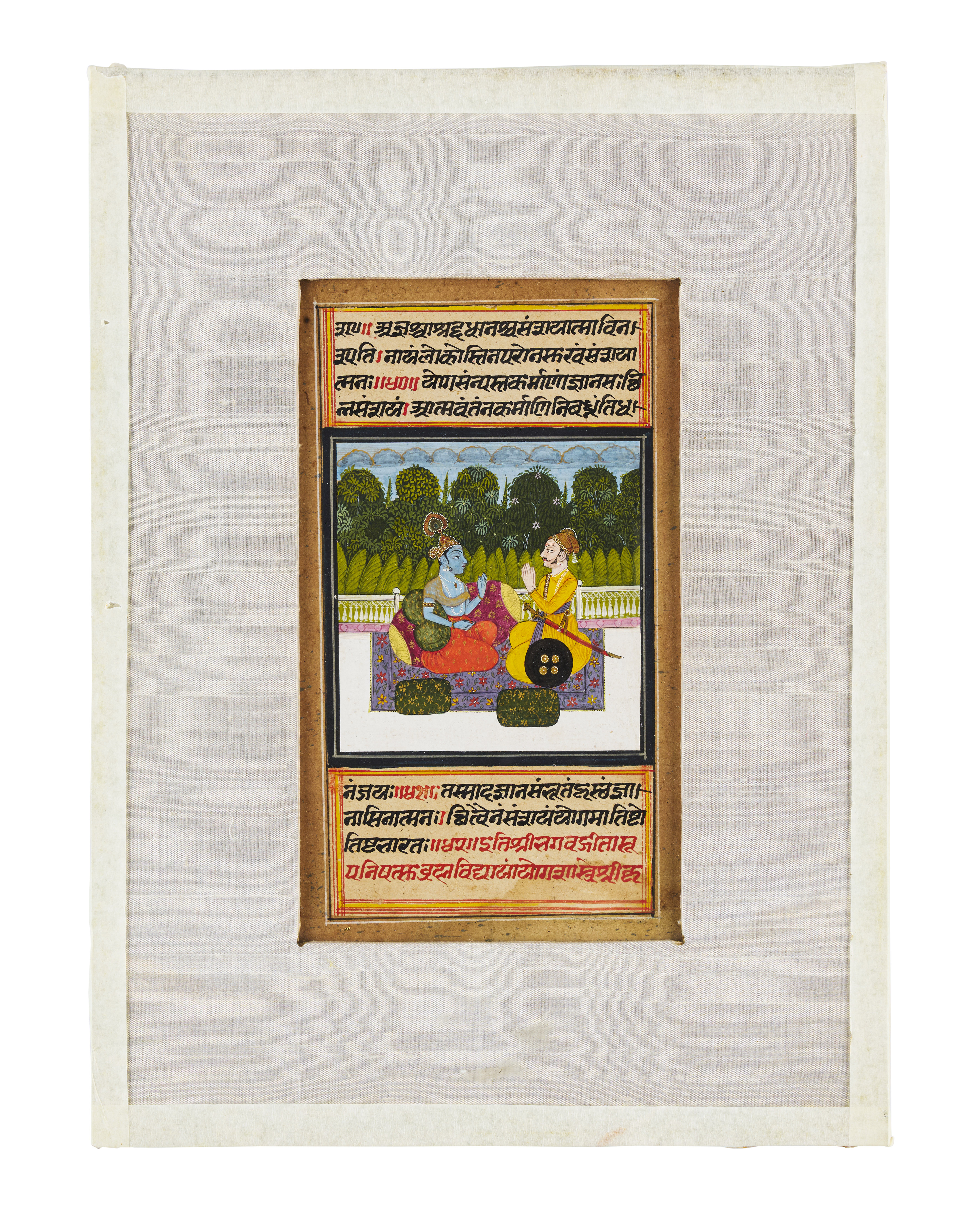 An Indian miniature painting captures a serene and vibrant depiction of a nobleman engaged in conversation with Lord Krishna, a central figure in Indian mythology and devotion. Dating back to the 18th-19th century, this artwork featuring vibrant colours, intricate detailing, and elegant composition.