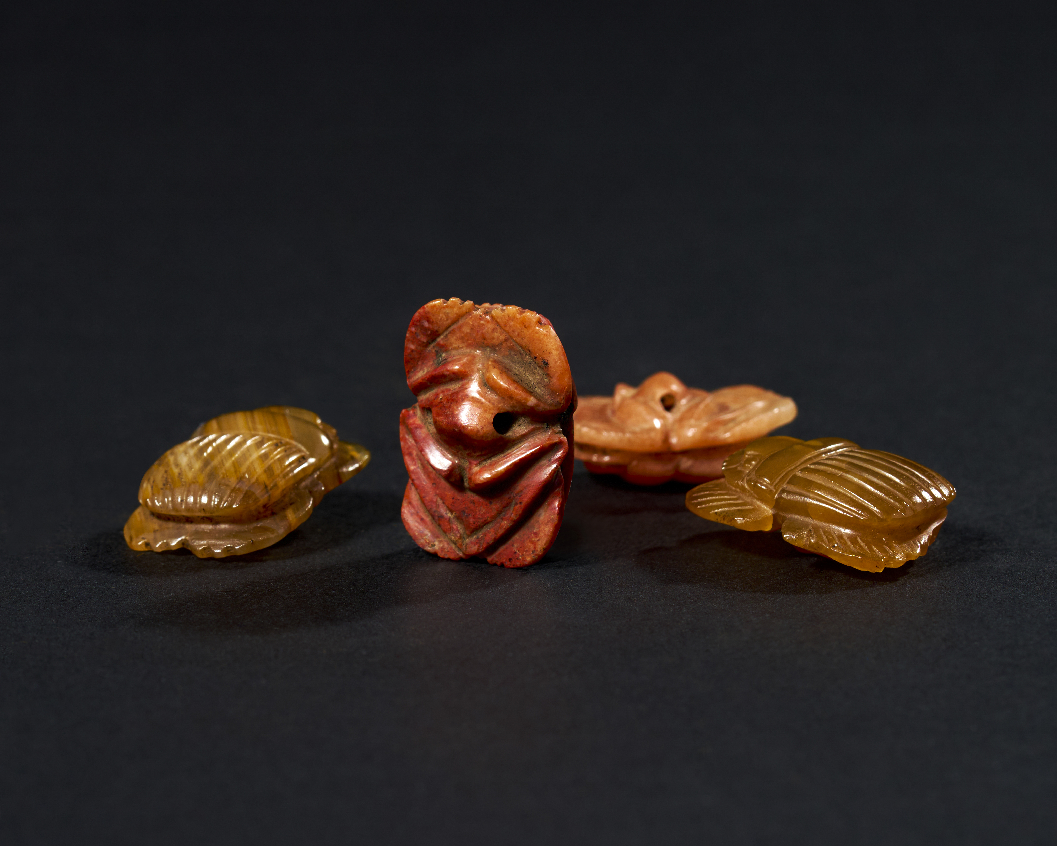 Each scarab in this collection exhibits the characteristic features of these amulets, with carefully detailed bodies and legs, and smooth, polished surfaces that highlight the natural beauty of the agate stone. The differing hues of the agate—from warm reds and oranges to more subdued yellows and browns—enhance the visual appeal of this group, demonstrating the ancient artisans’ skill in selecting and working with this semi-precious material.