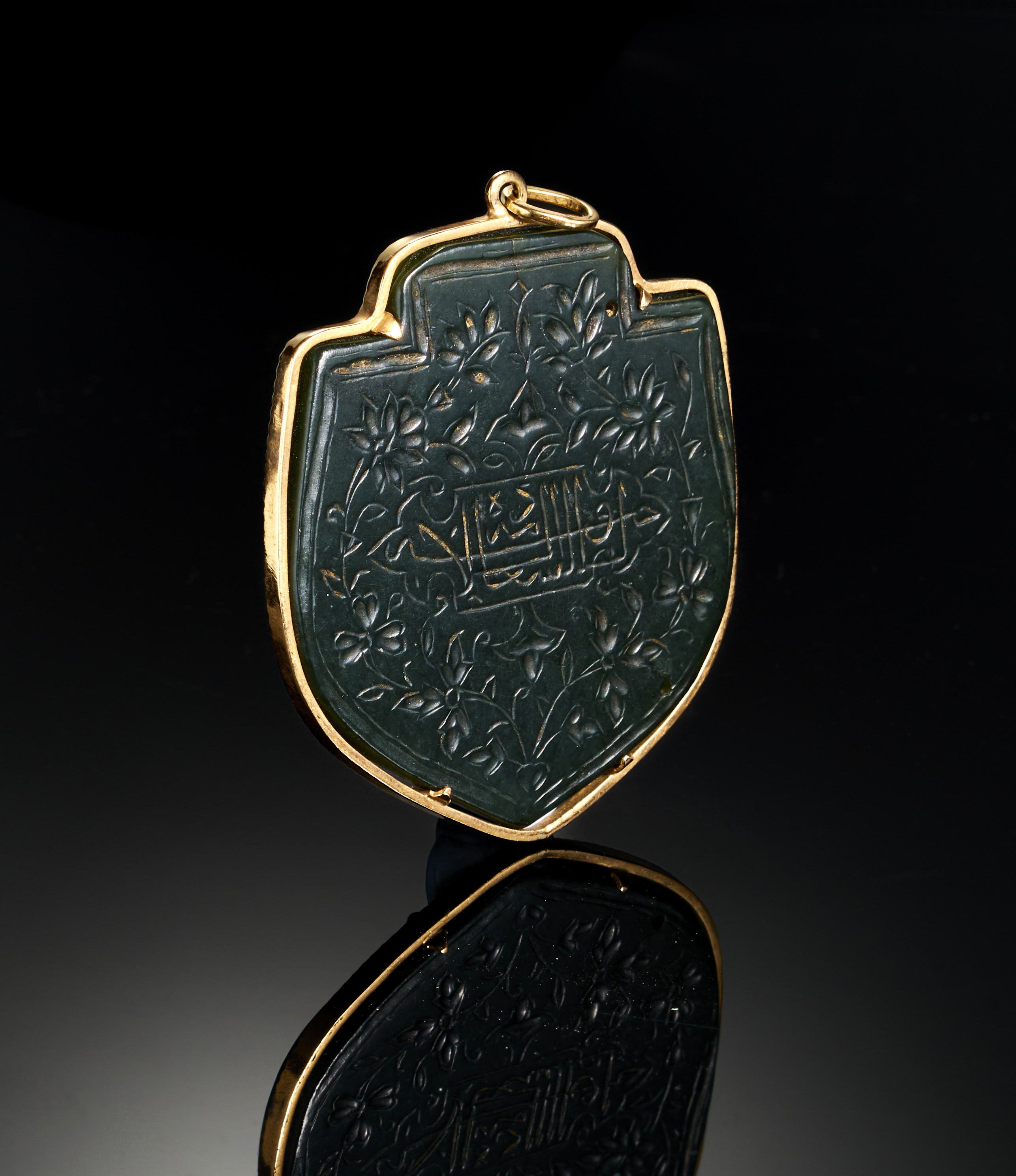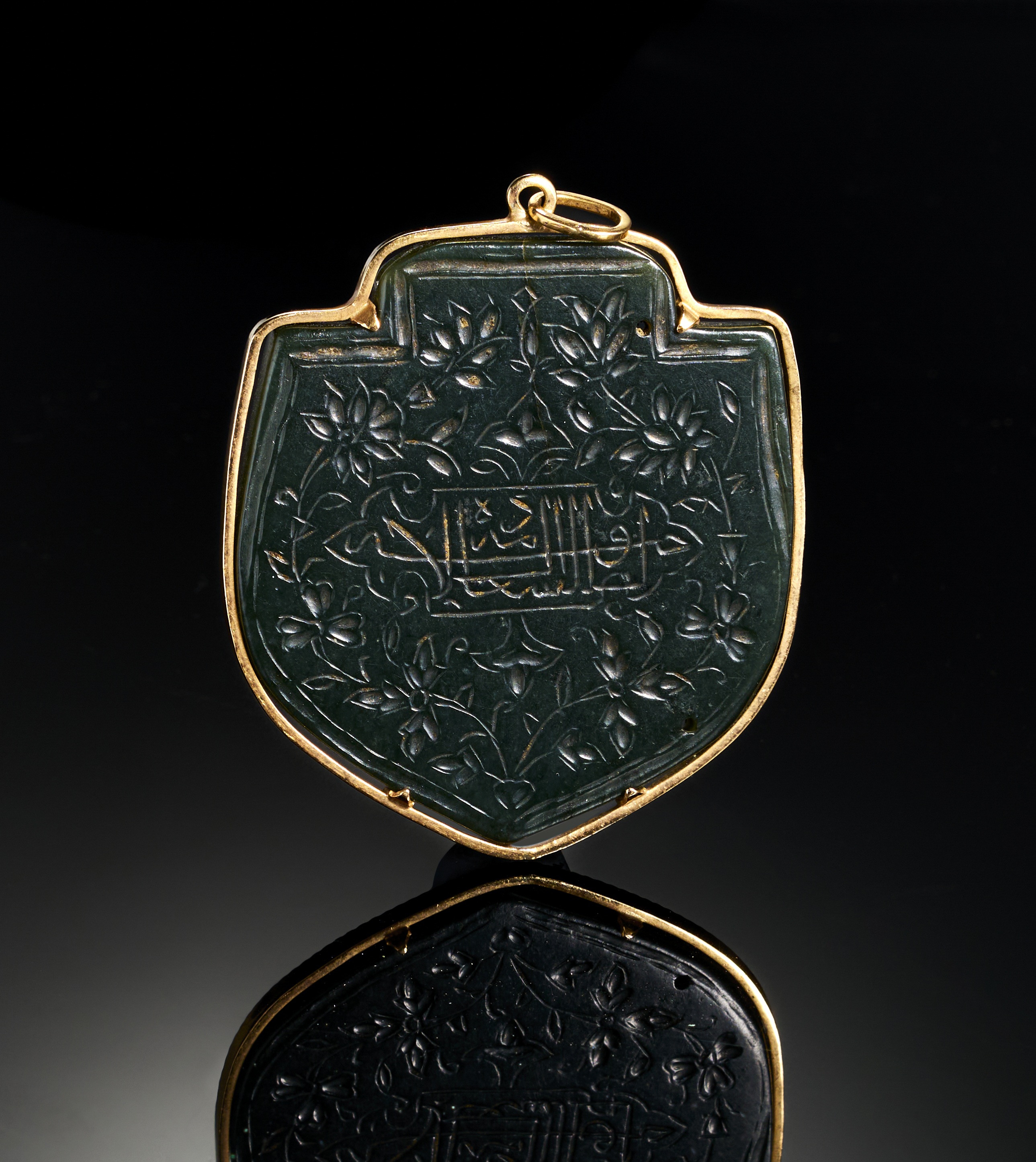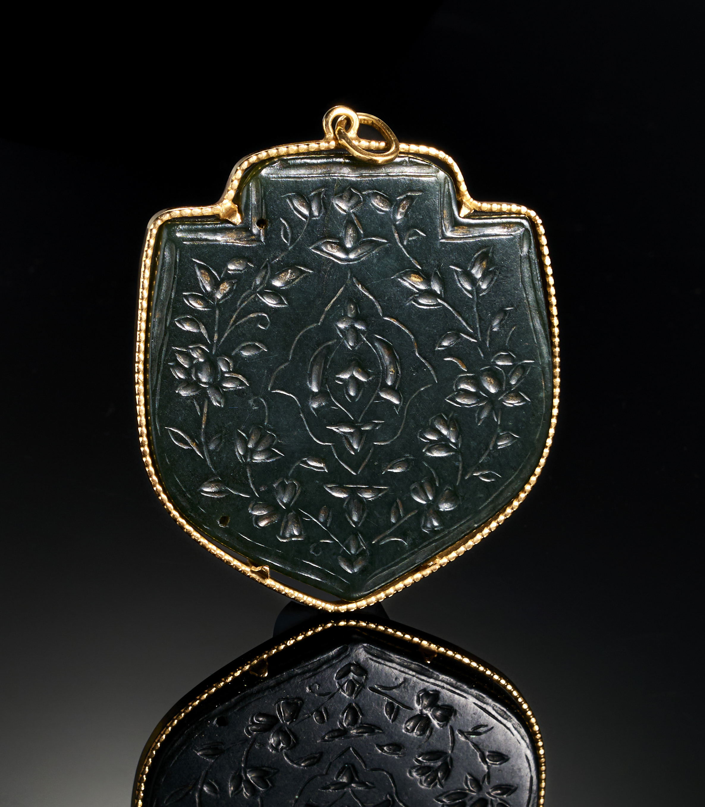 A remarkable Timurid-era pendant, crafted from intricately engraved jade, is mounted in an exquisite gold frame. Dating back to the 14th-15th century, the pendant is adorned with finely detailed floral and geometric motifs on both sides. The lush green jade, a symbol of prestige and durability, features expertly carved inscriptions and patterns, complemented by the gold mounting.
