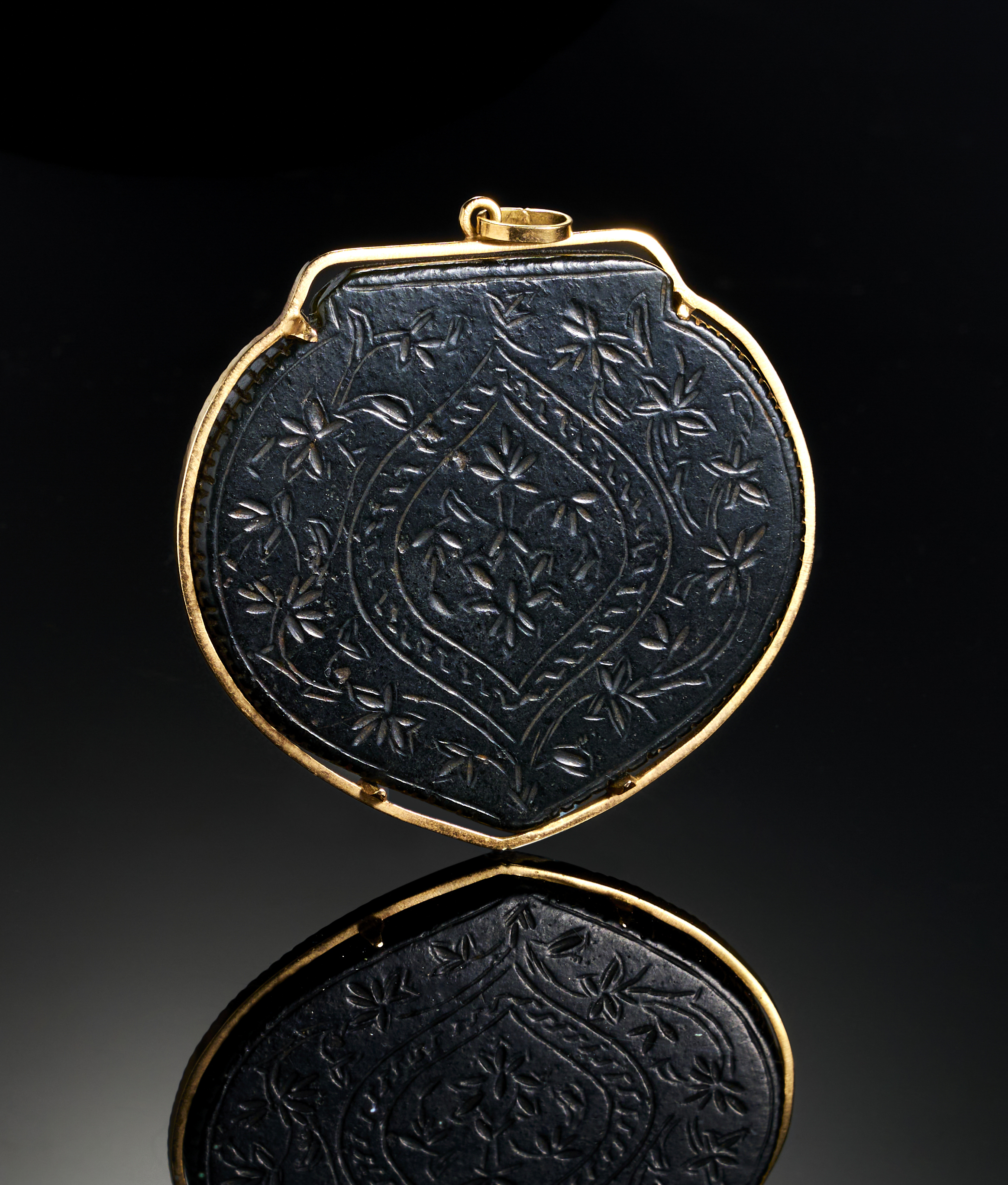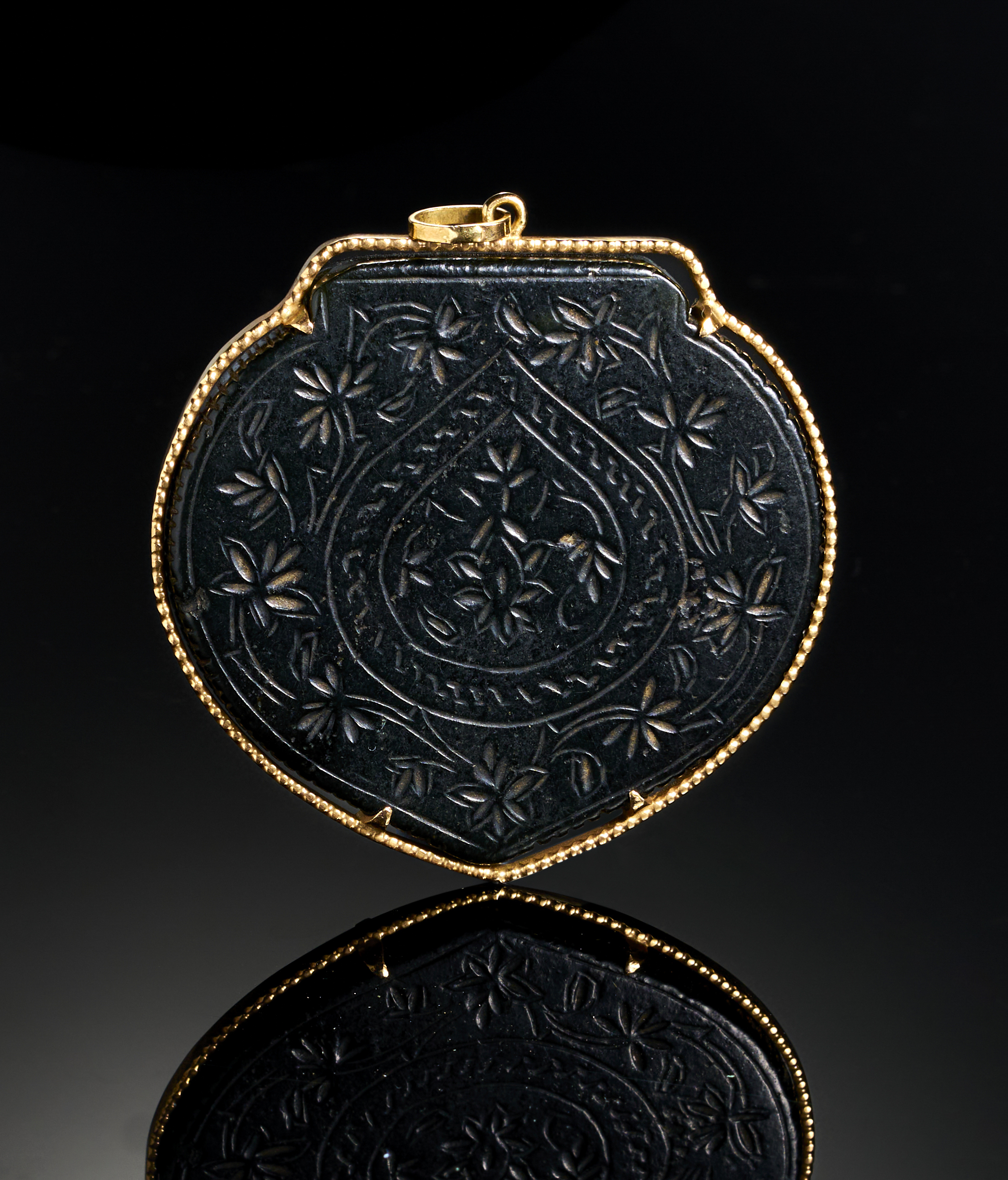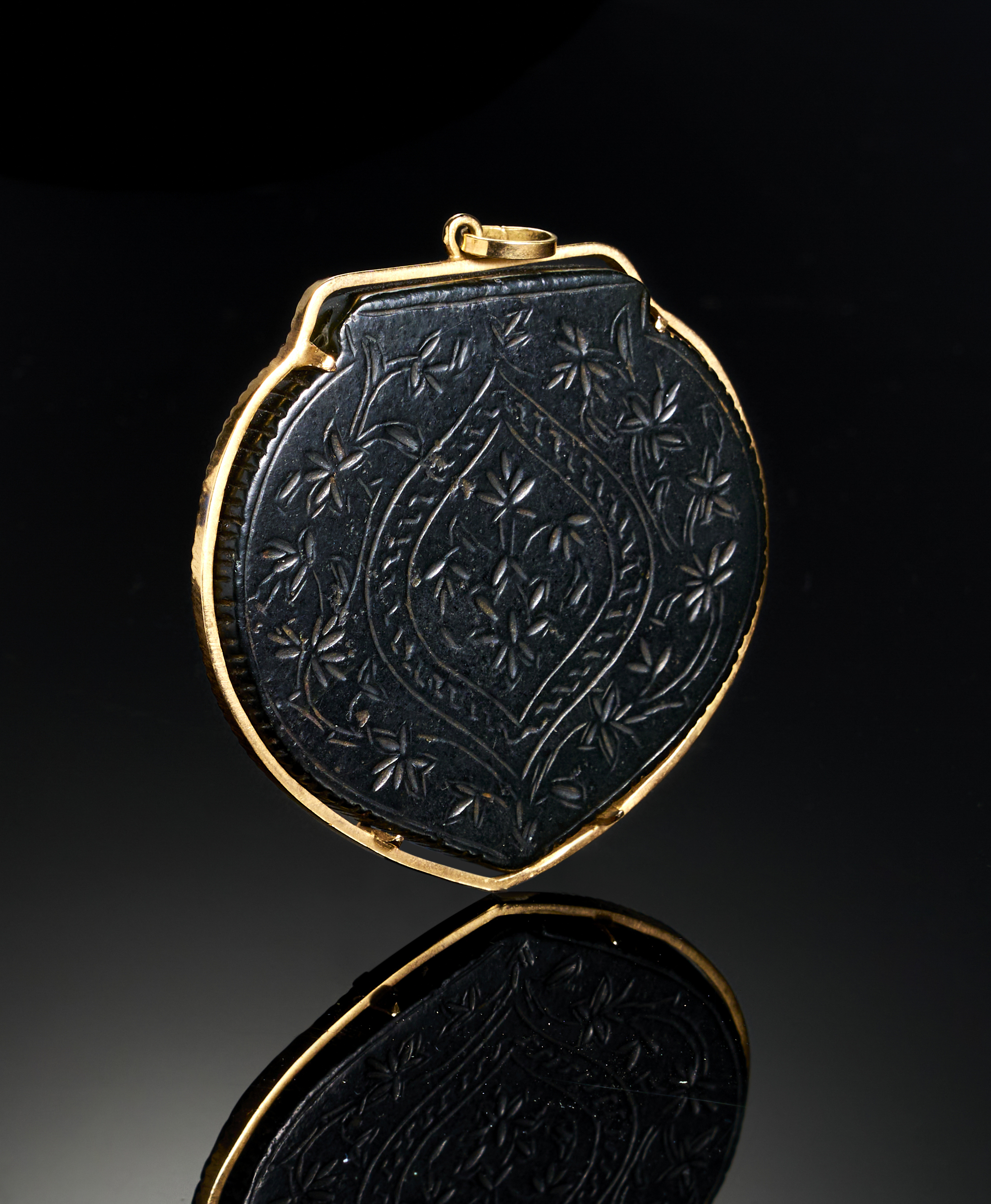 A Timurid pendant Crafted from intricately engraved jade, the pendant features an elegant floral design that is both symmetrical and richly detailed. Set in a finely crafted gold mounting, it highlights the importance and prestige of this piece during the 14th-15th century Persian Timurid dynasty.