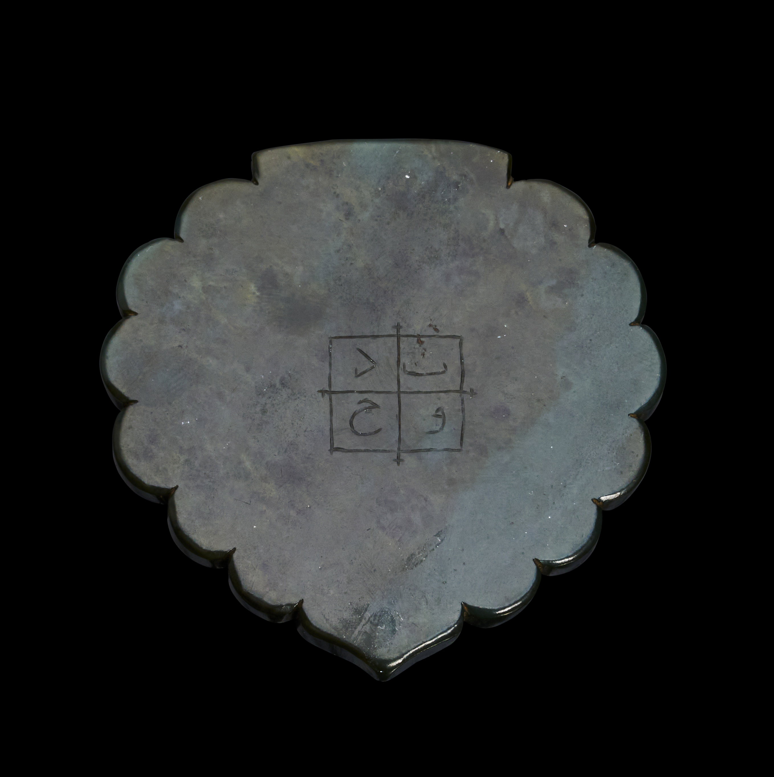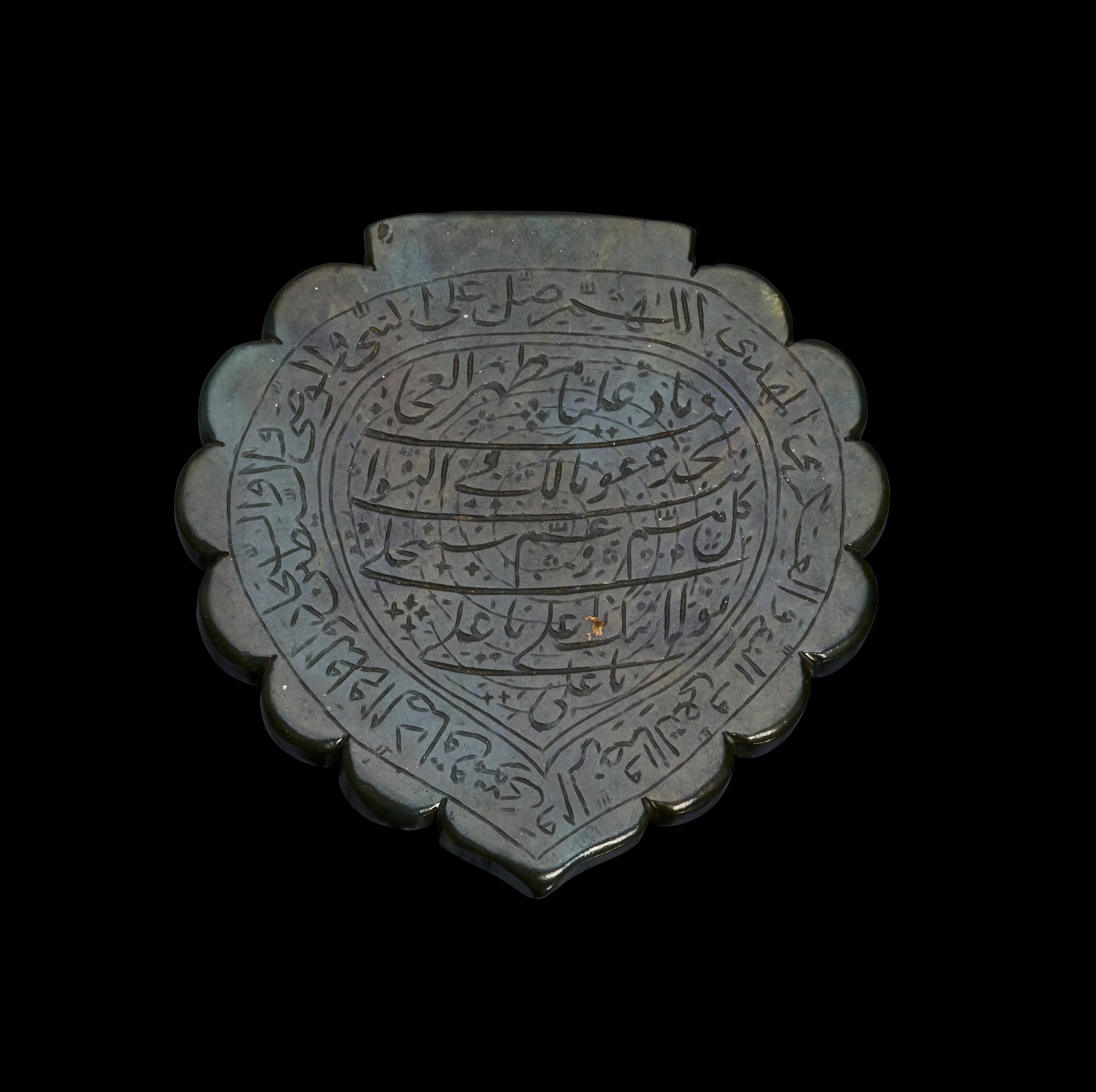 A late Safavid-era jade pendant, dating to the 16th century, Intricately engraved with sacred prayers and the names of the Twelve Imams, the pendant embodies spiritual significance and unparalleled craftsmanship. The scalloped edges frame the central inscriptions beautifully, showcasing the symmetrical and detailed engravings. The reverse side also bears markings.