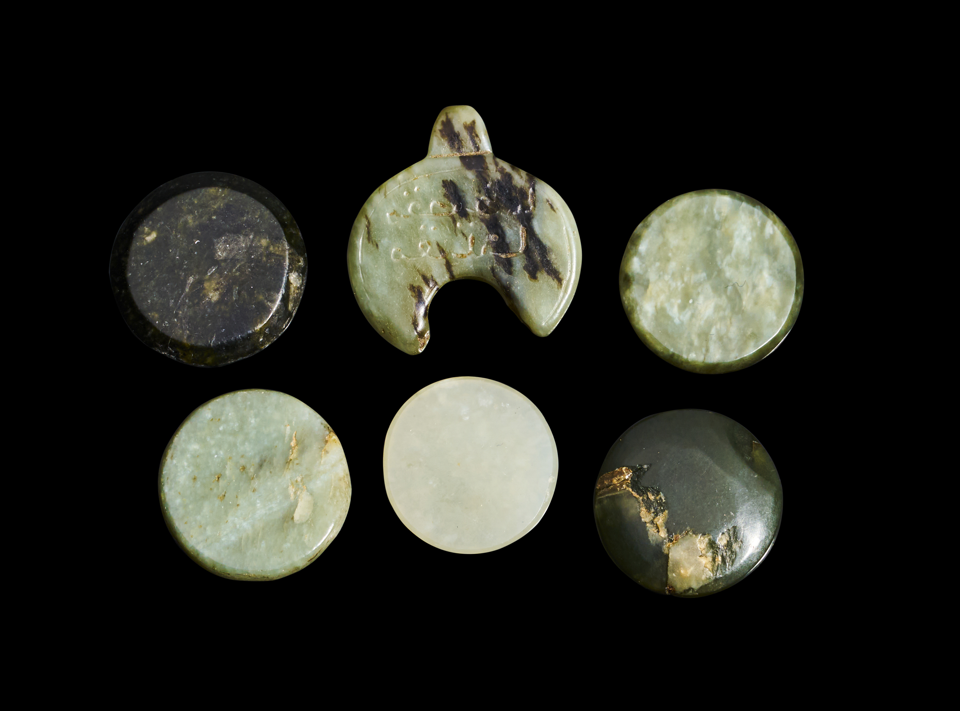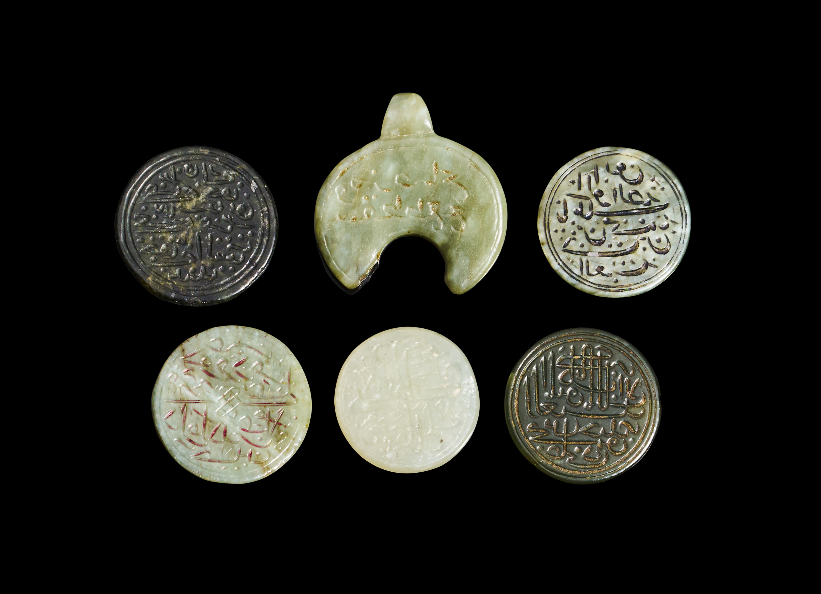 Collection comprises six engraved jade seals from the Timurid period, Persia, dating back to the 14th-15th century. Each seal is finely crafted and engraved with intricate designs. The variety of shapes, including circular and crescent forms, and the rich hues of green jade make this a truly unique and exquisite set.