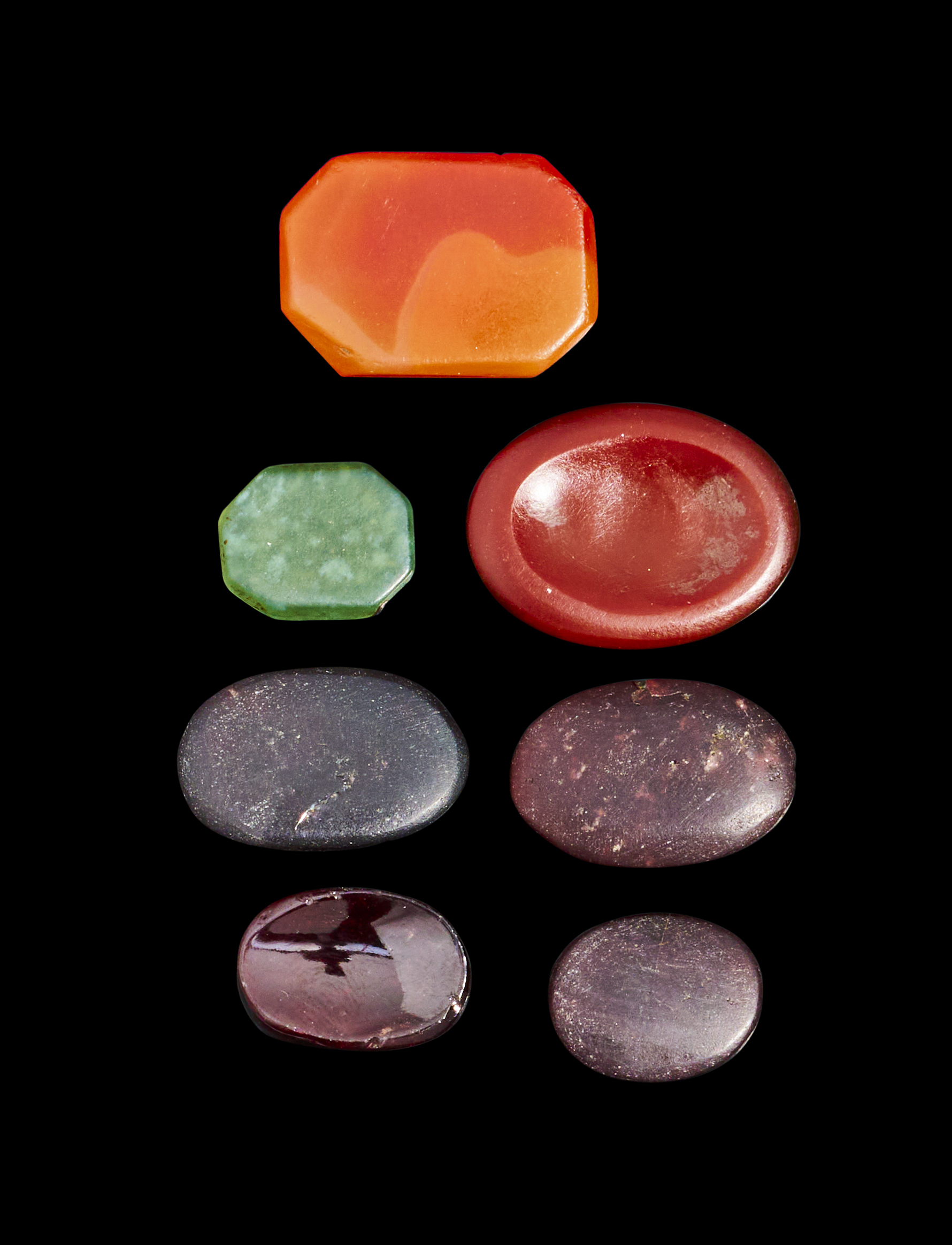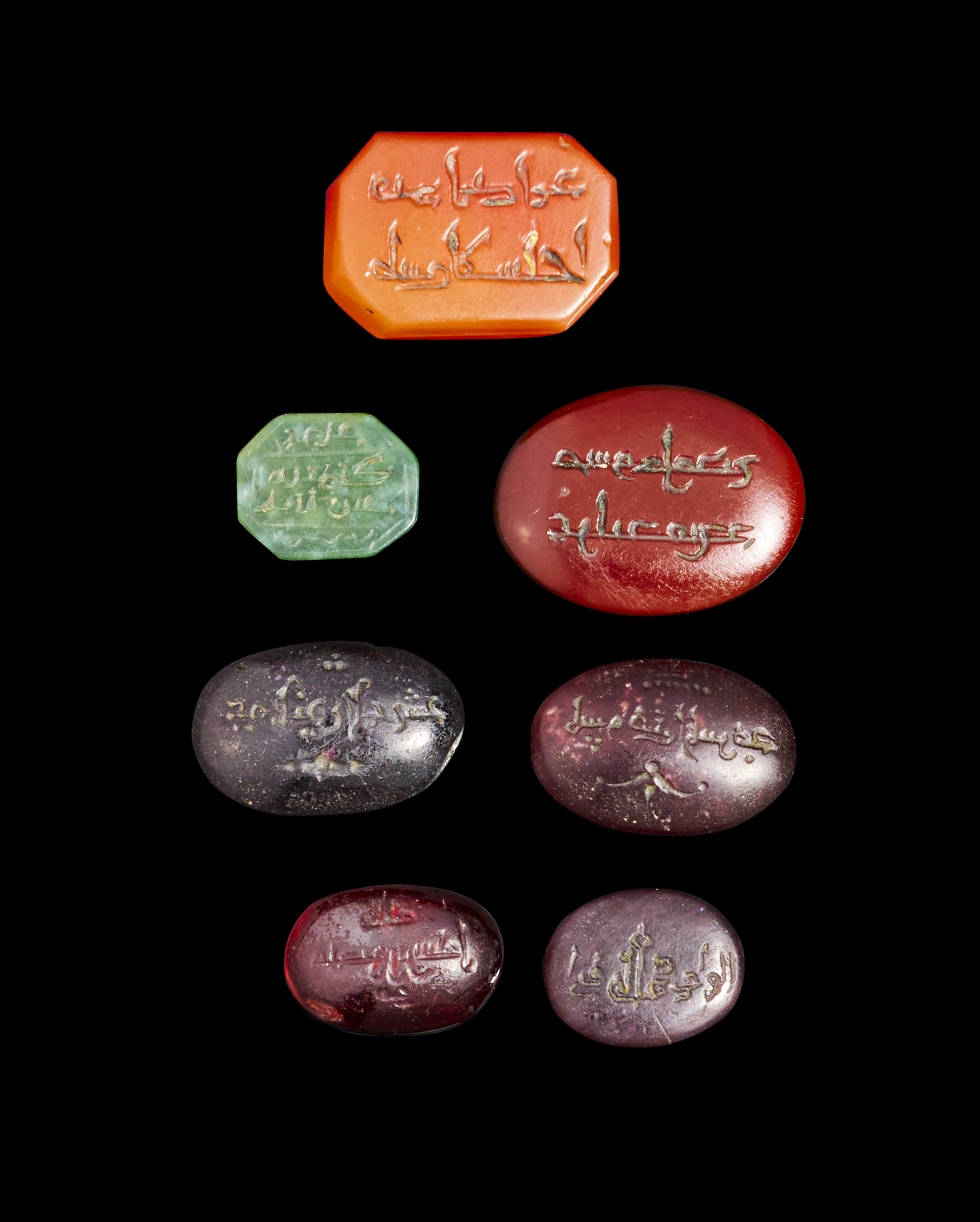 A set of six exquisite seals crafted from agate, garnet, and jade, originating from the 12th to 14th centuries. Each piece features intricately engraved Kufic inscriptions. The stones exhibit vibrant hues, ranging from deep red garnets to green jade and orange-hued agate.