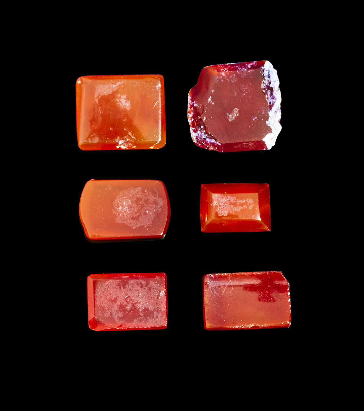 Set of six rectangular agate seals, dated to the 9th to 12th centuries, is intricately engraved with Kufic script. The vibrant red hues of the agate create a striking contrast.