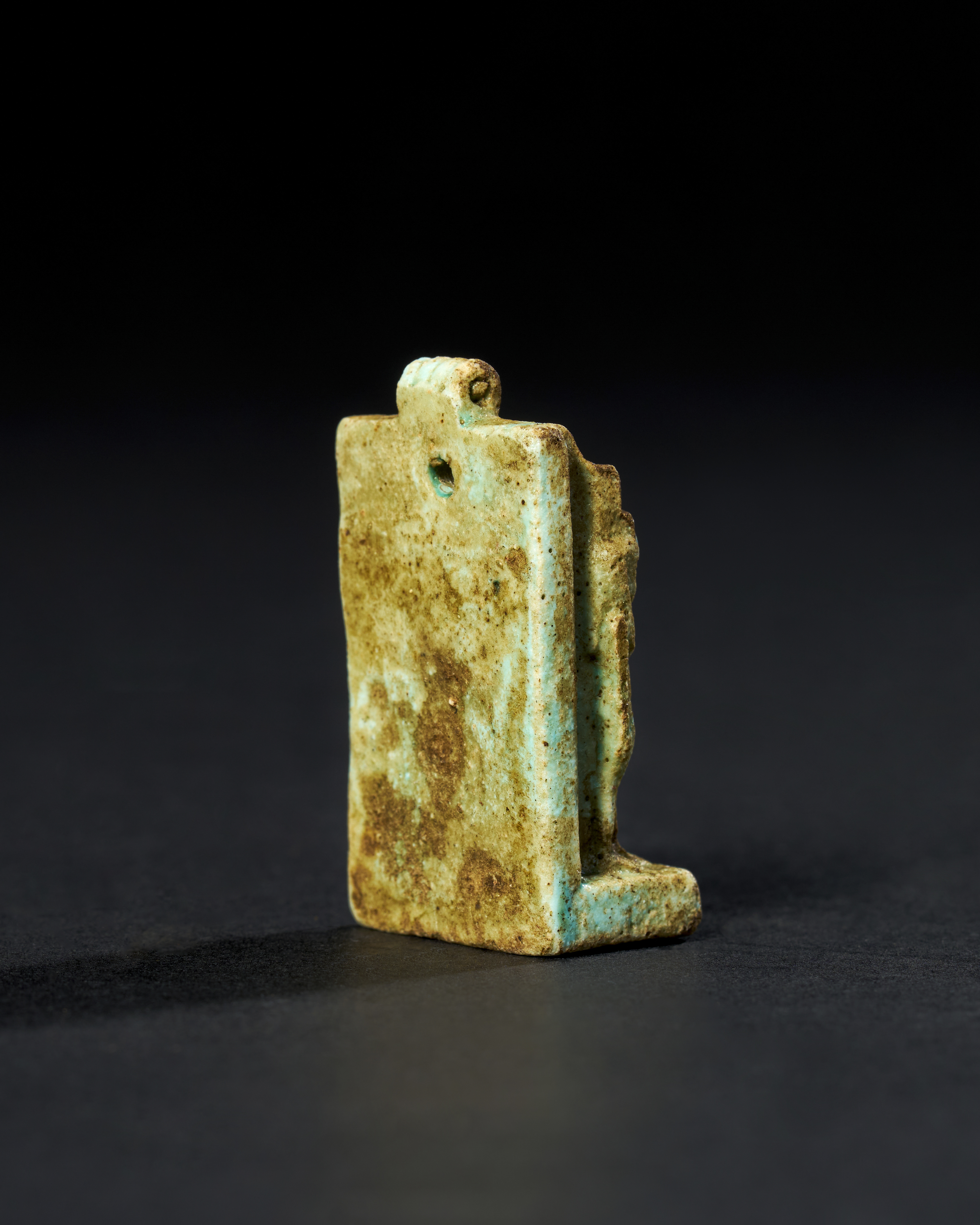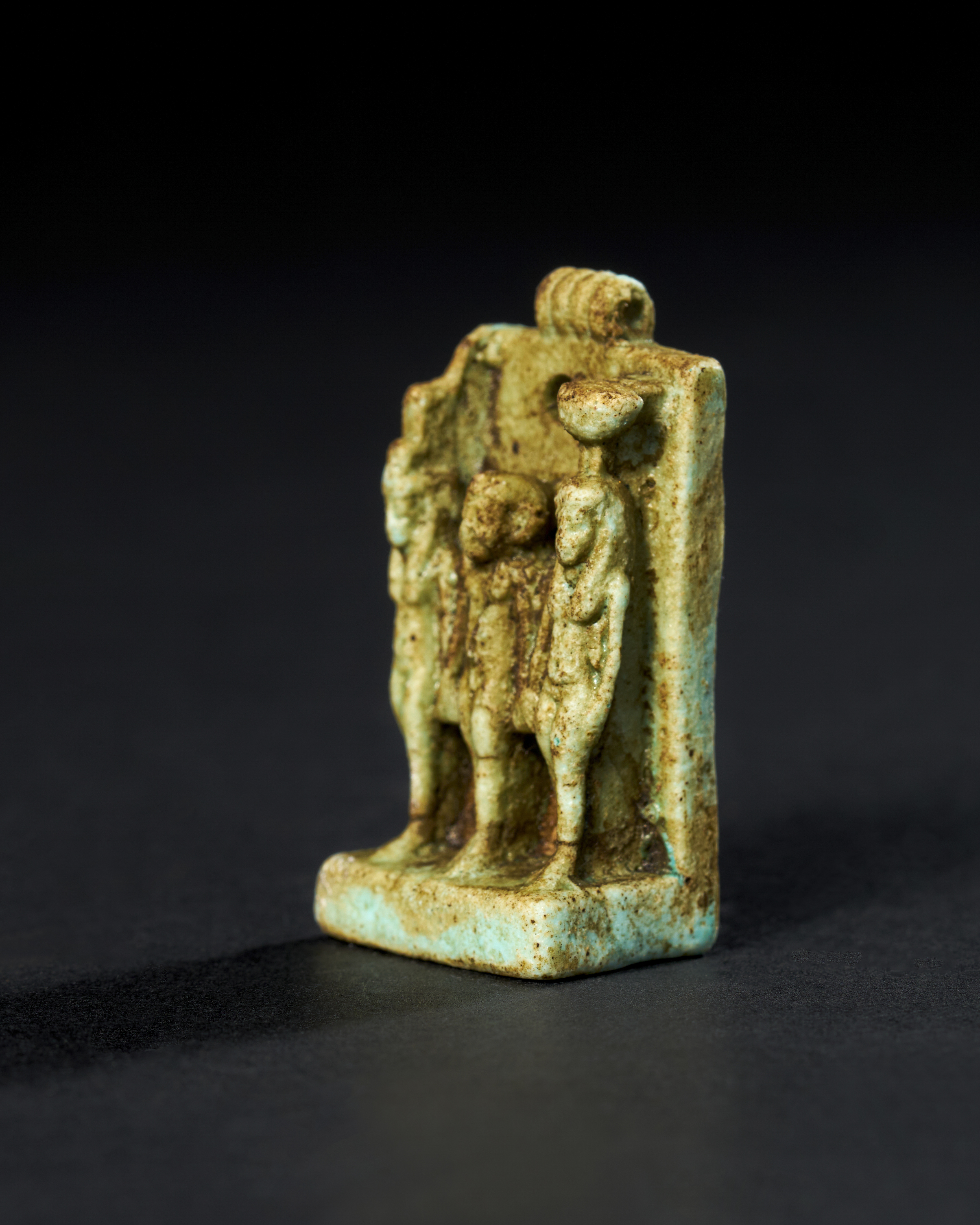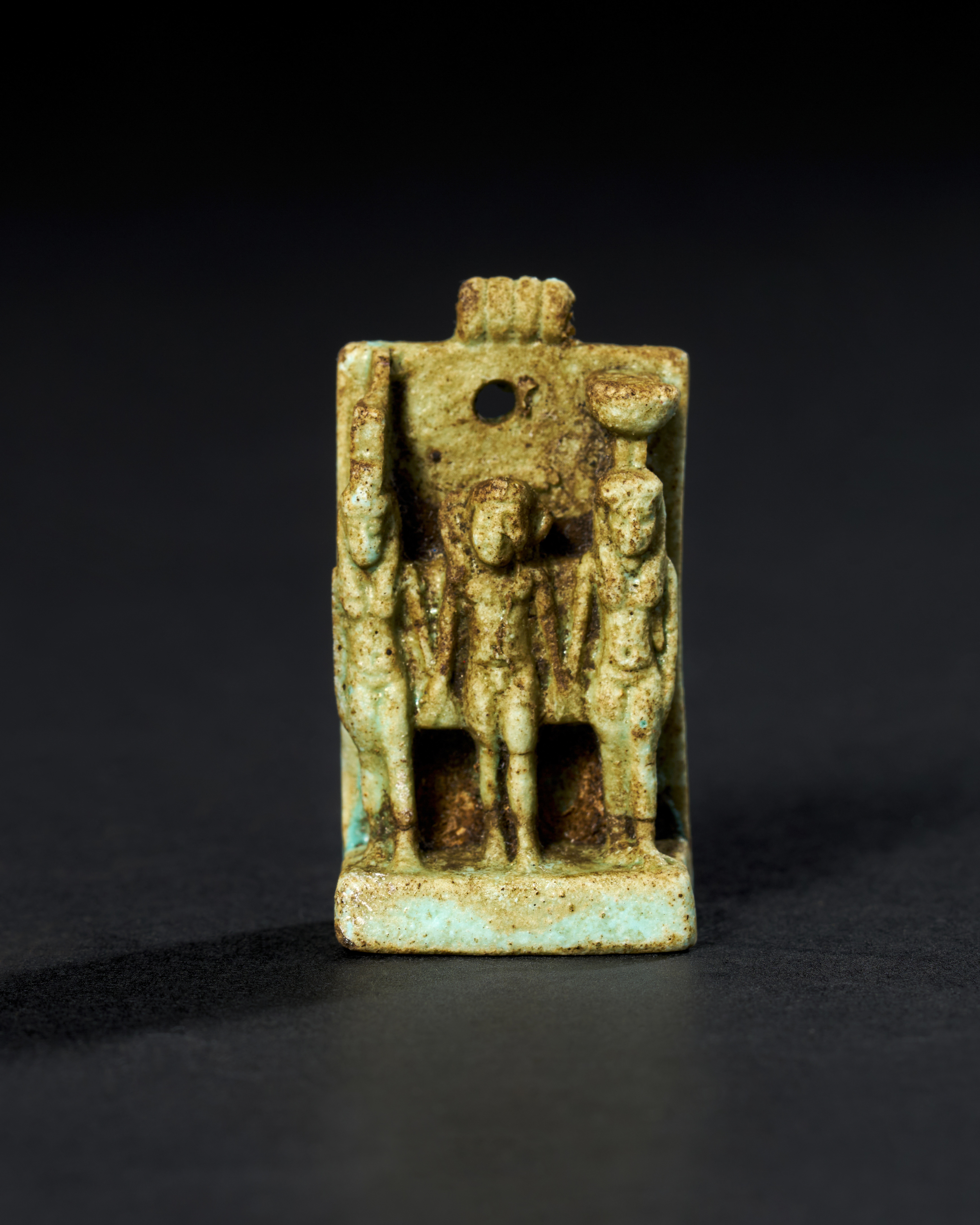 The figures are depicted standing on a rectangular base, with a large loop at the top of the amulet, indicating that it was likely worn as a pendant. The surface of the amulet shows signs of age, with the characteristic glaze of the faience in shades of green and blue, though some areas have faded or worn away over time.