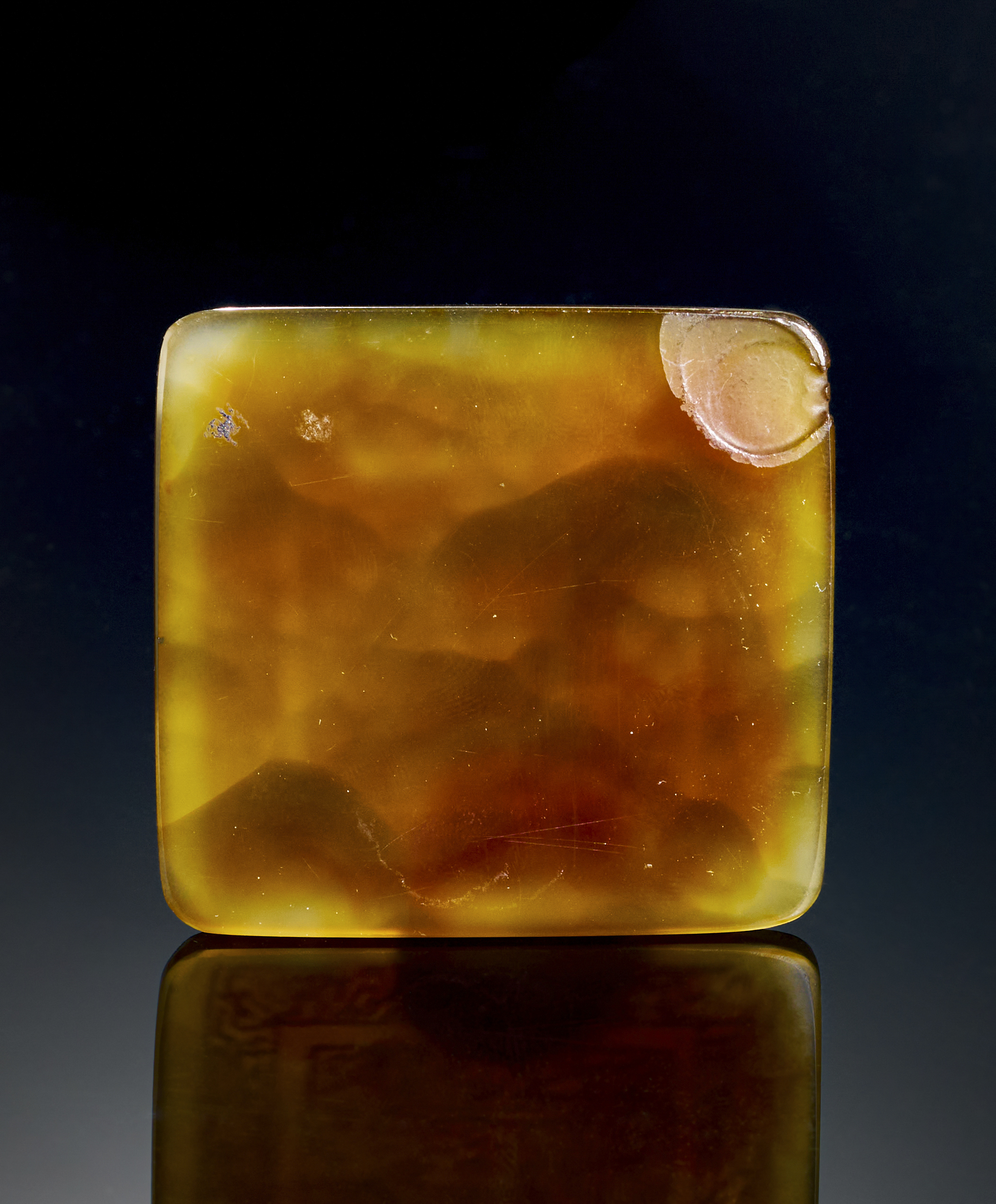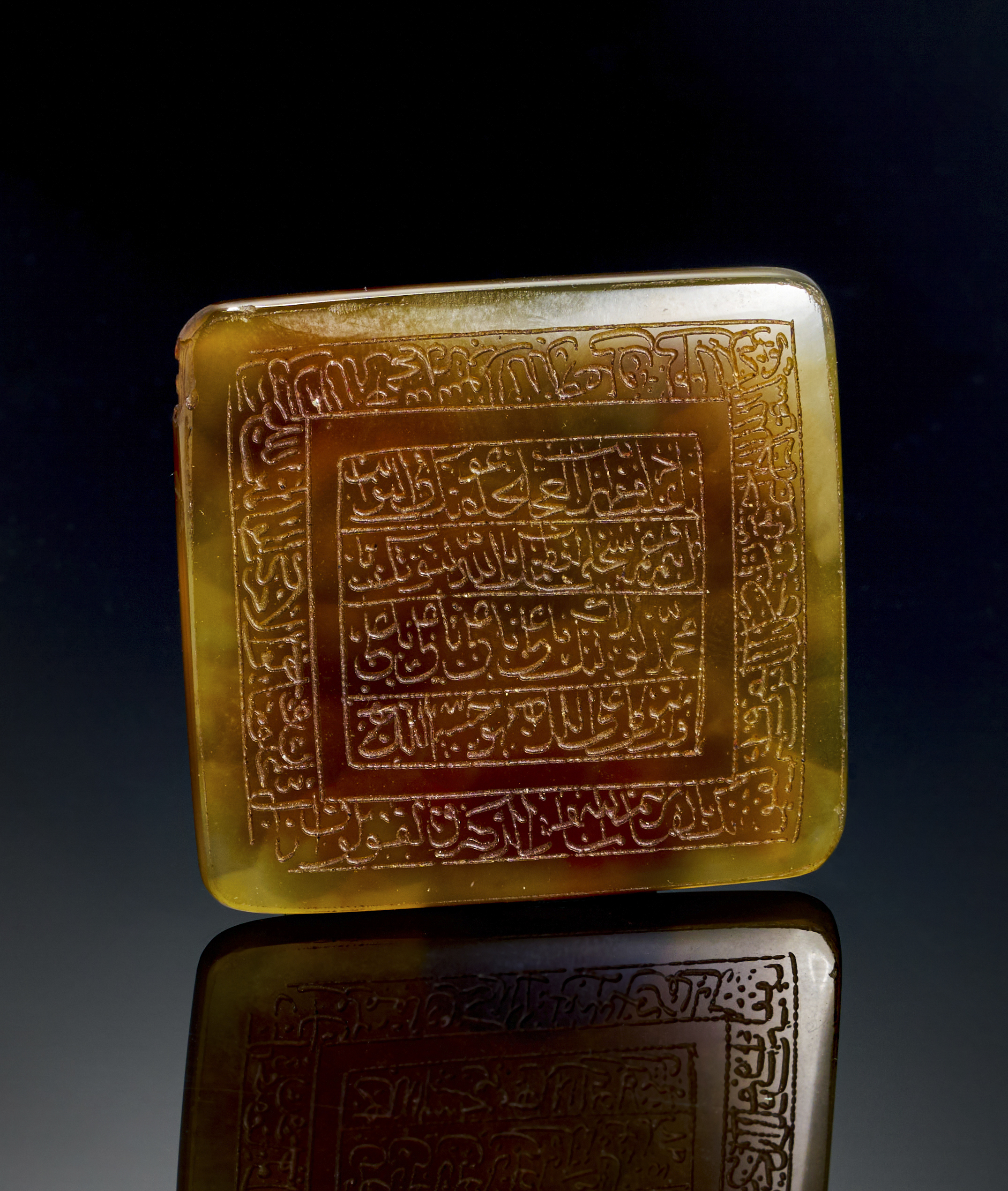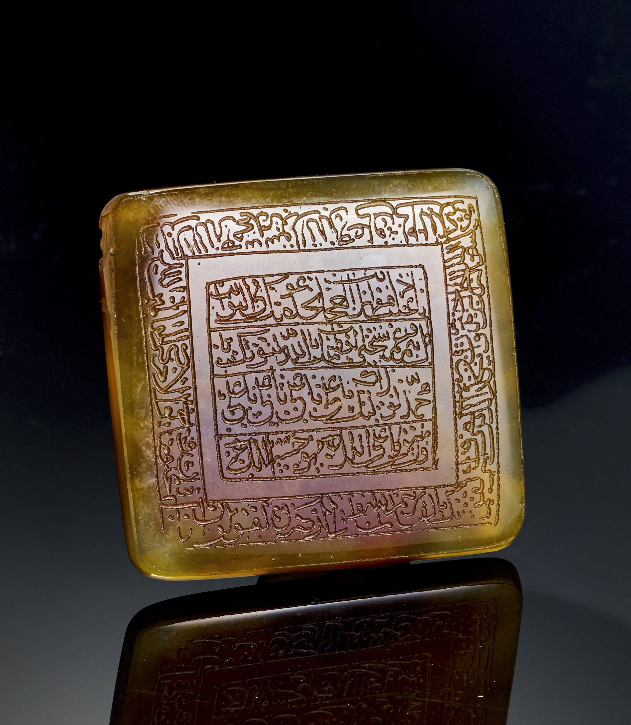 A19th-century Islamic agate plaque features a square design intricately inscribed with Arabic calligraphy. The inscriptions are elegantly arranged in a central square surrounded by additional script along the borders.