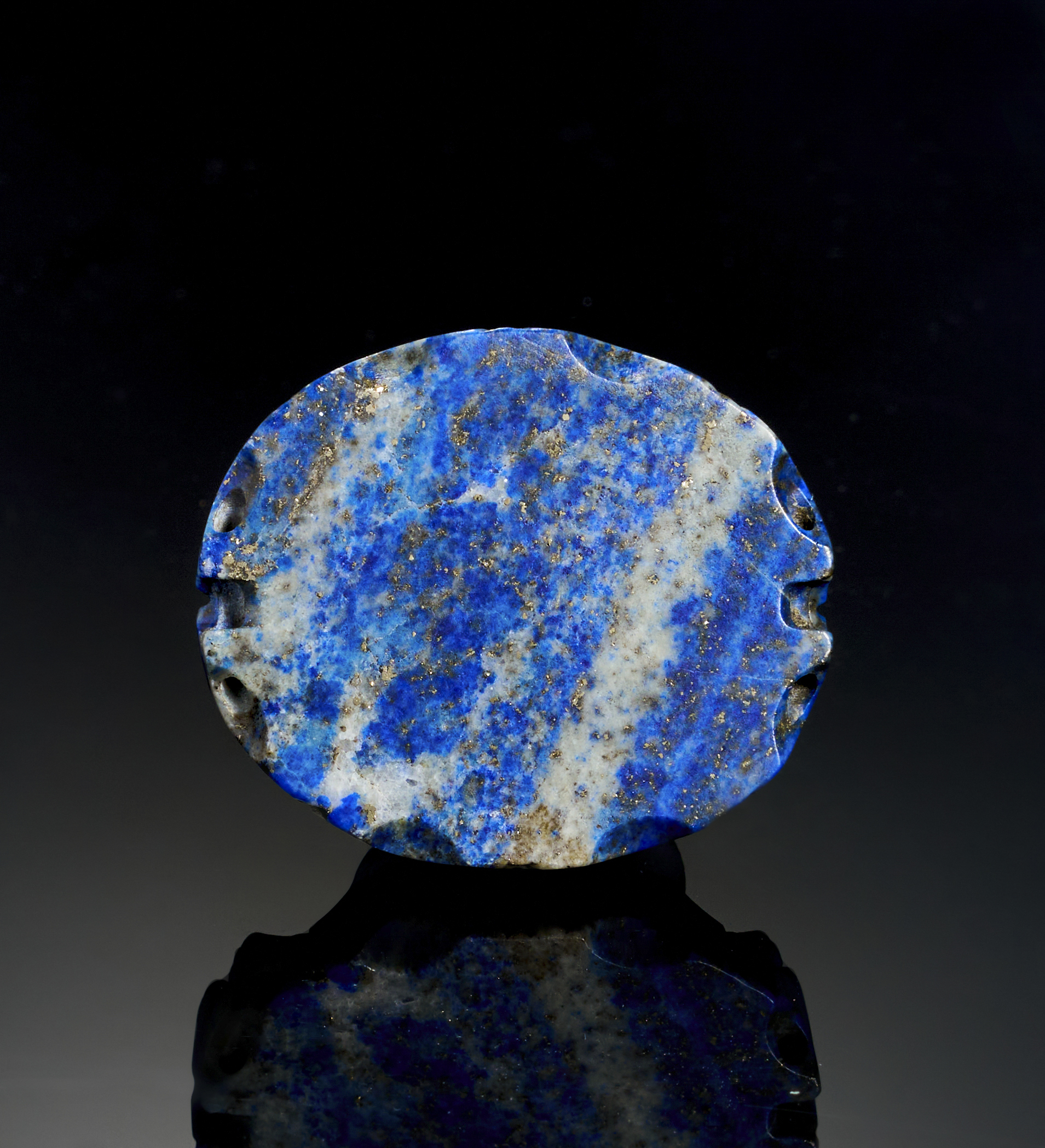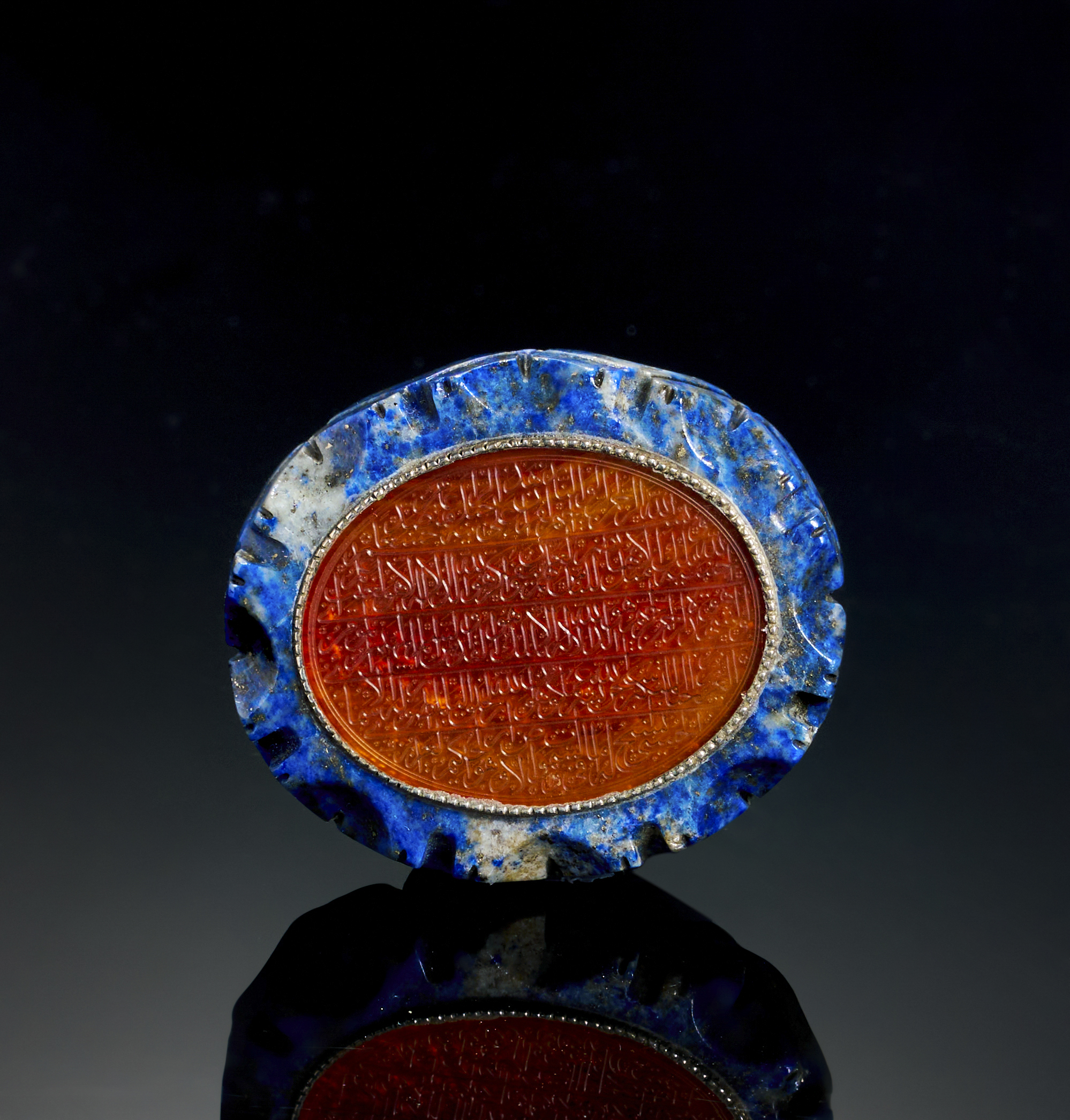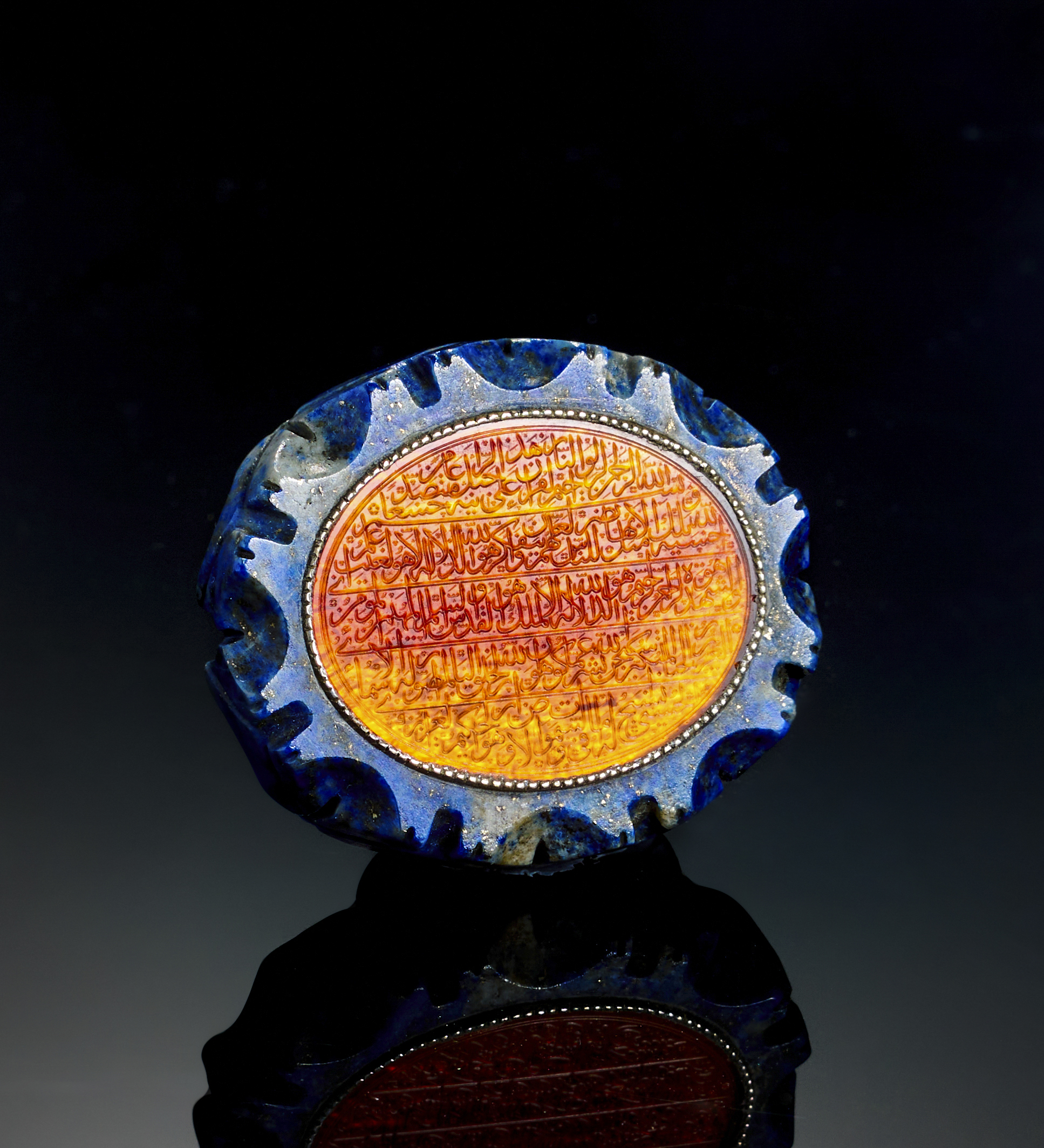 AN ENGRAVED ORANGE ISLAMIC GLASS IN A LAPIS LAZULI FRAME, EARLY 20TH CENTURY