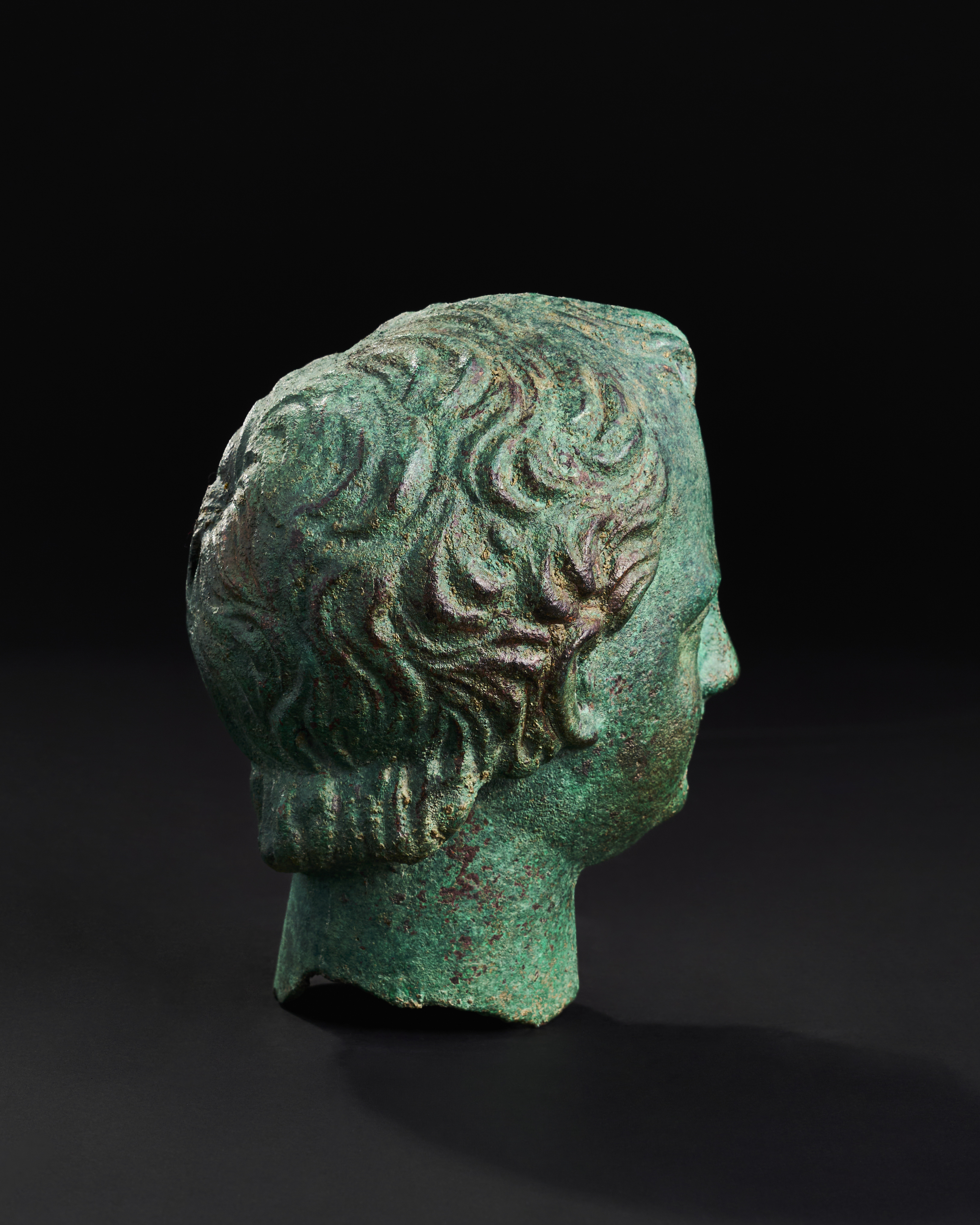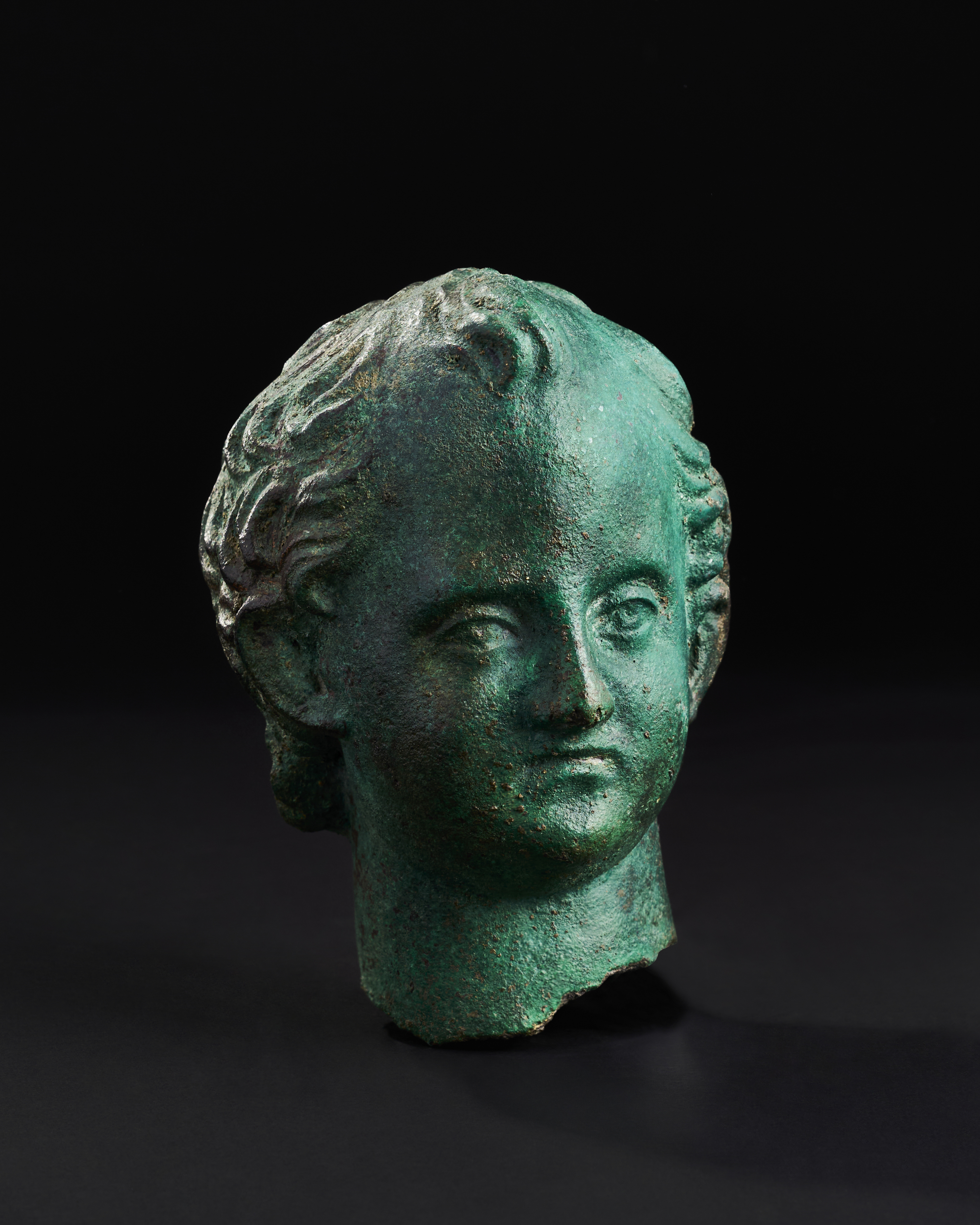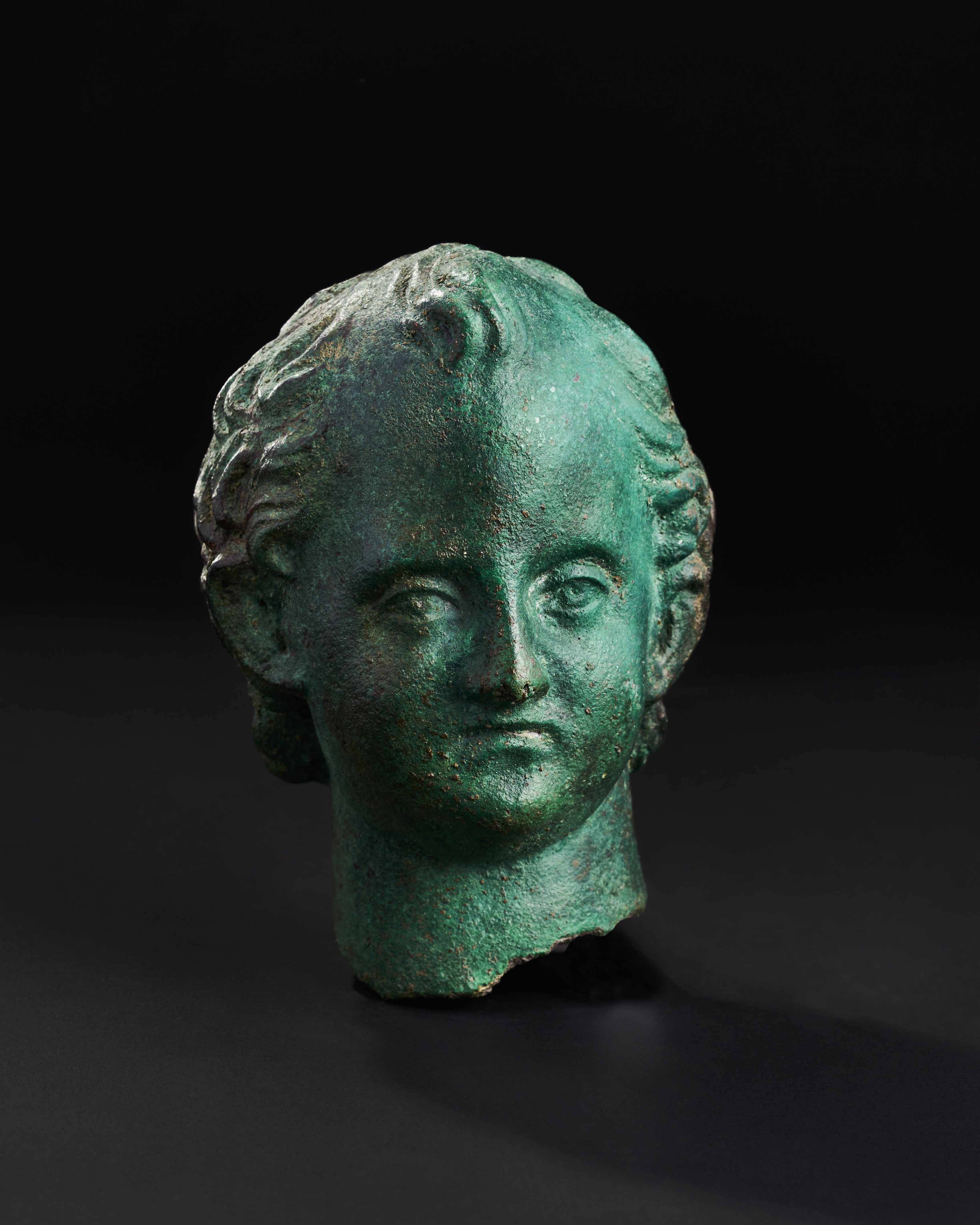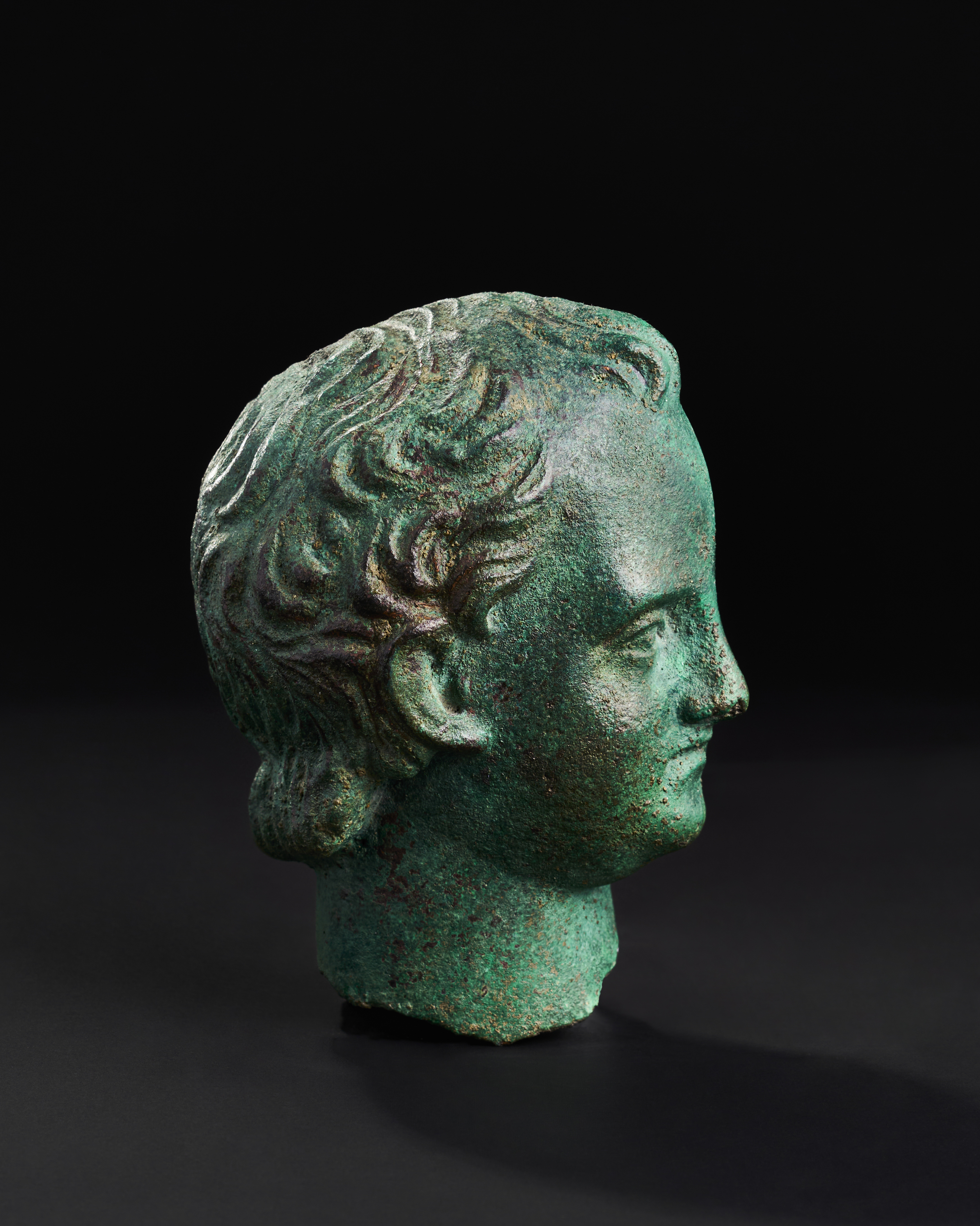 An exceptional bronze head of a youth, 2nd century A.D., characterised by its lifelike features and classical proportions. The youthful visage, framed by softly curling hair, exudes a serene expression.
