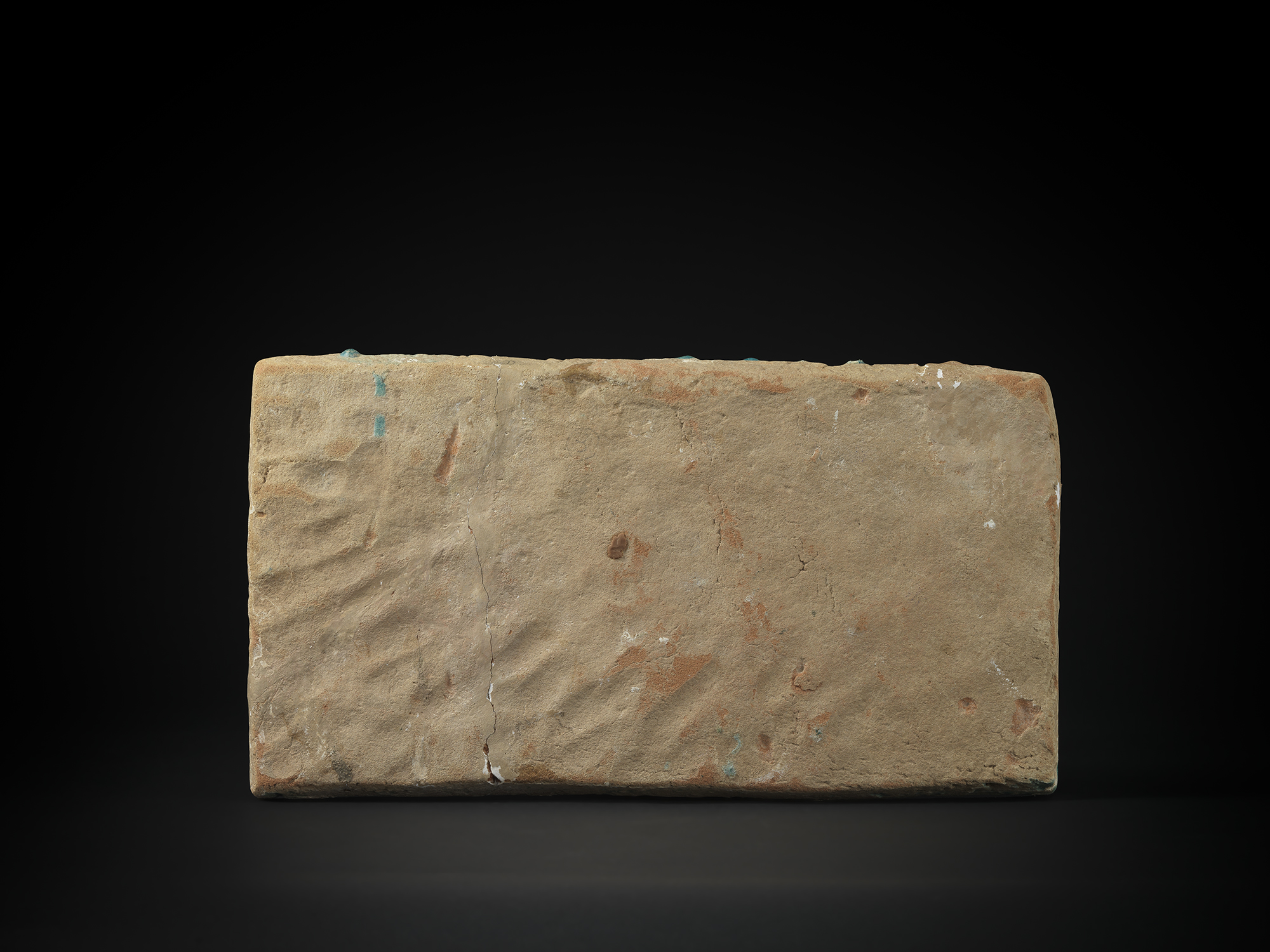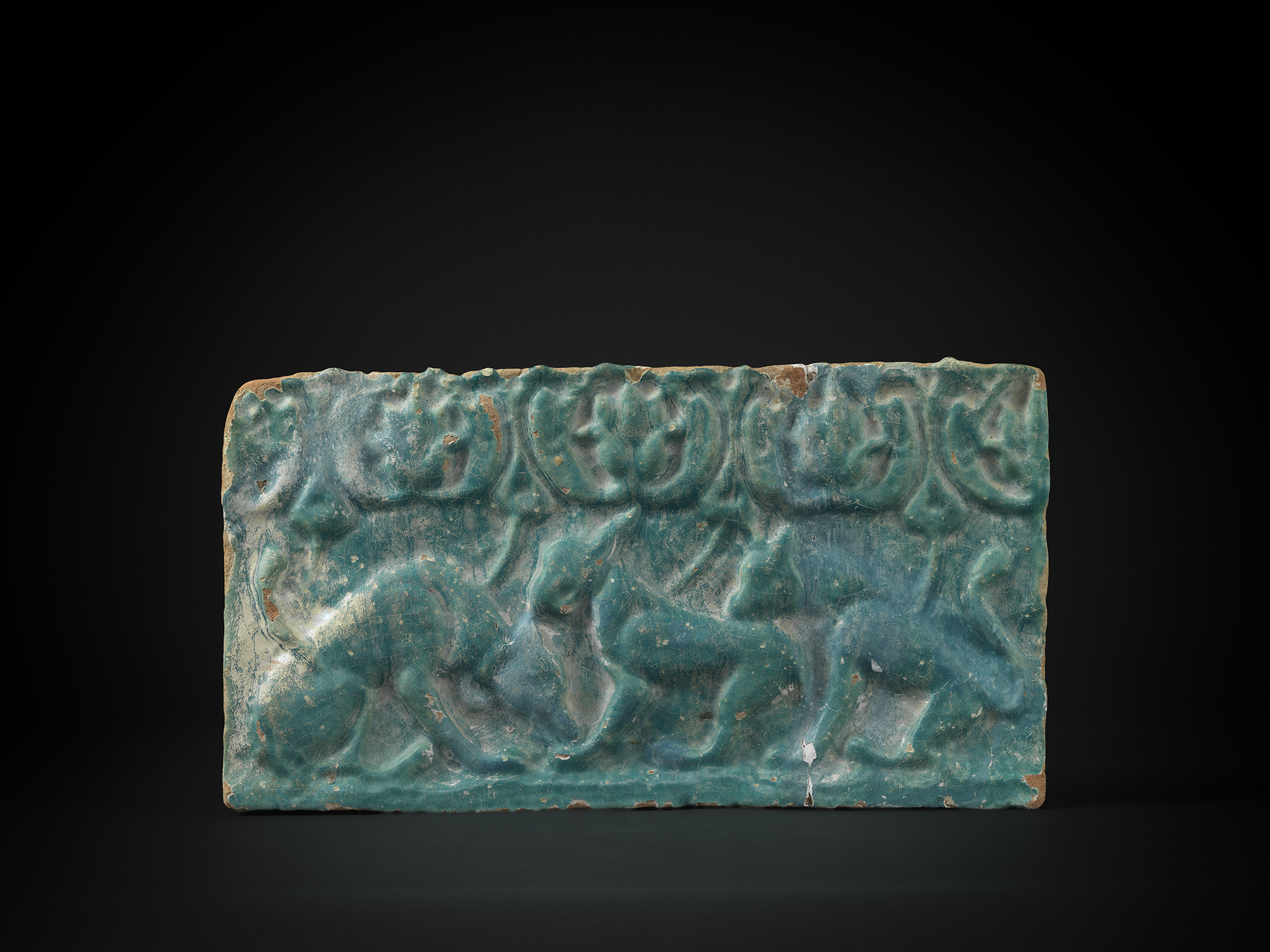 The tile featuring a richly detailed design with a prominent turquoise glaze, characteristic of Kashan ceramics. The front side of the tile displays an intricate relief pattern, depicting an animals while the reverse side is plain.