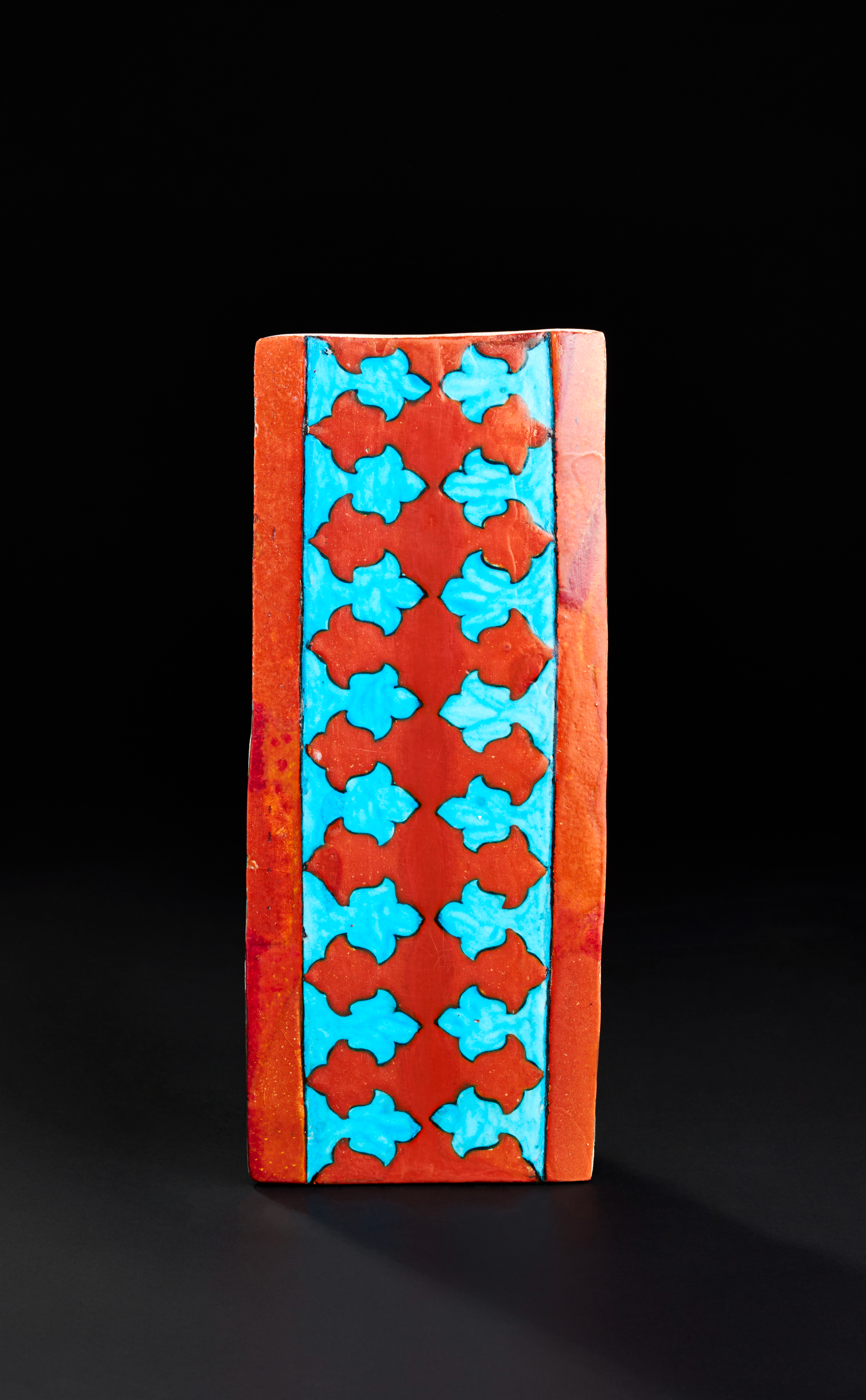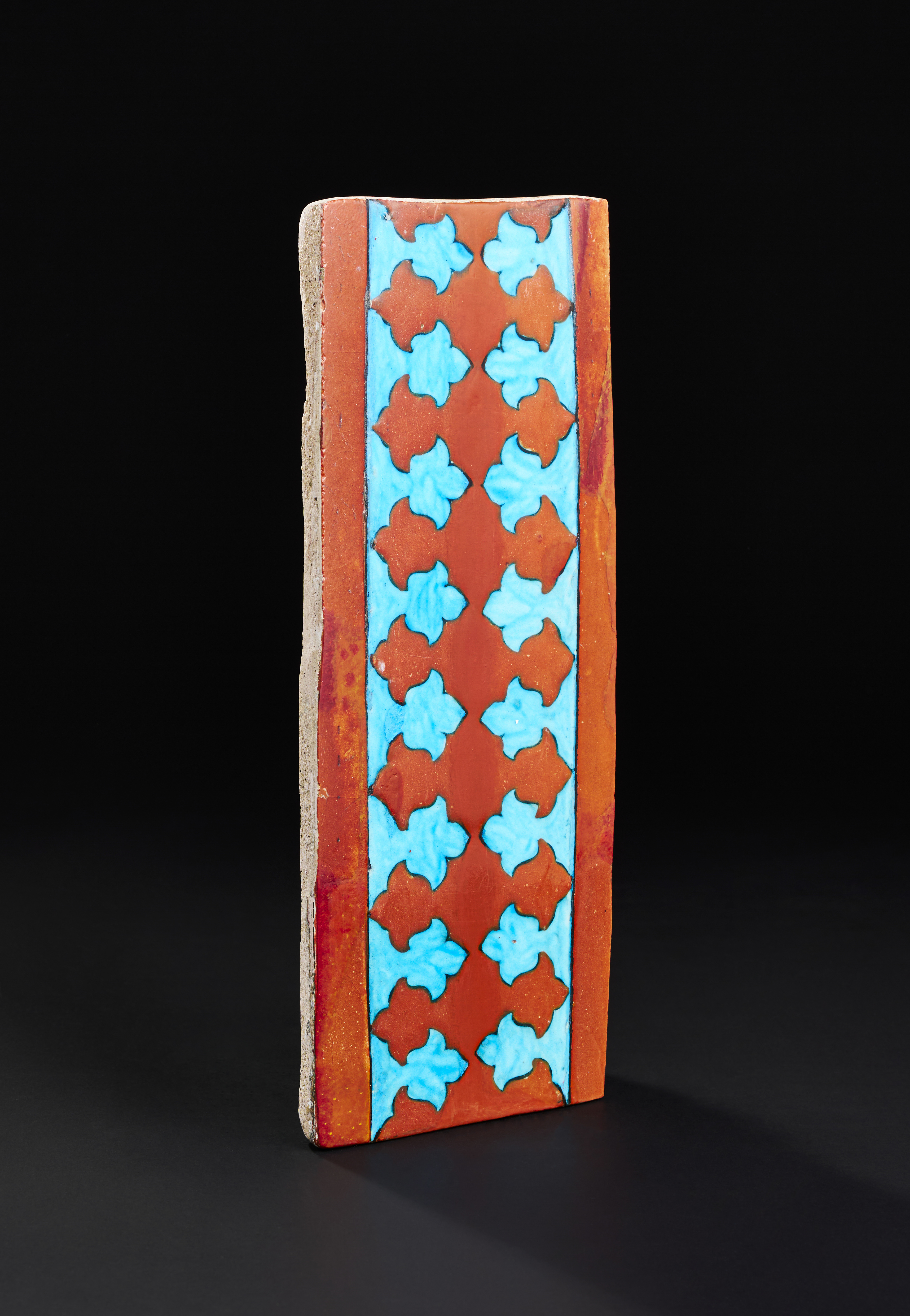A vibrant Iznik pottery tile from 16th-century Ottoman Turkey. This rectangular tile showcases a repeating geometric pattern of clover-shaped motifs in bright turquoise, set against a rich terracotta-red background.