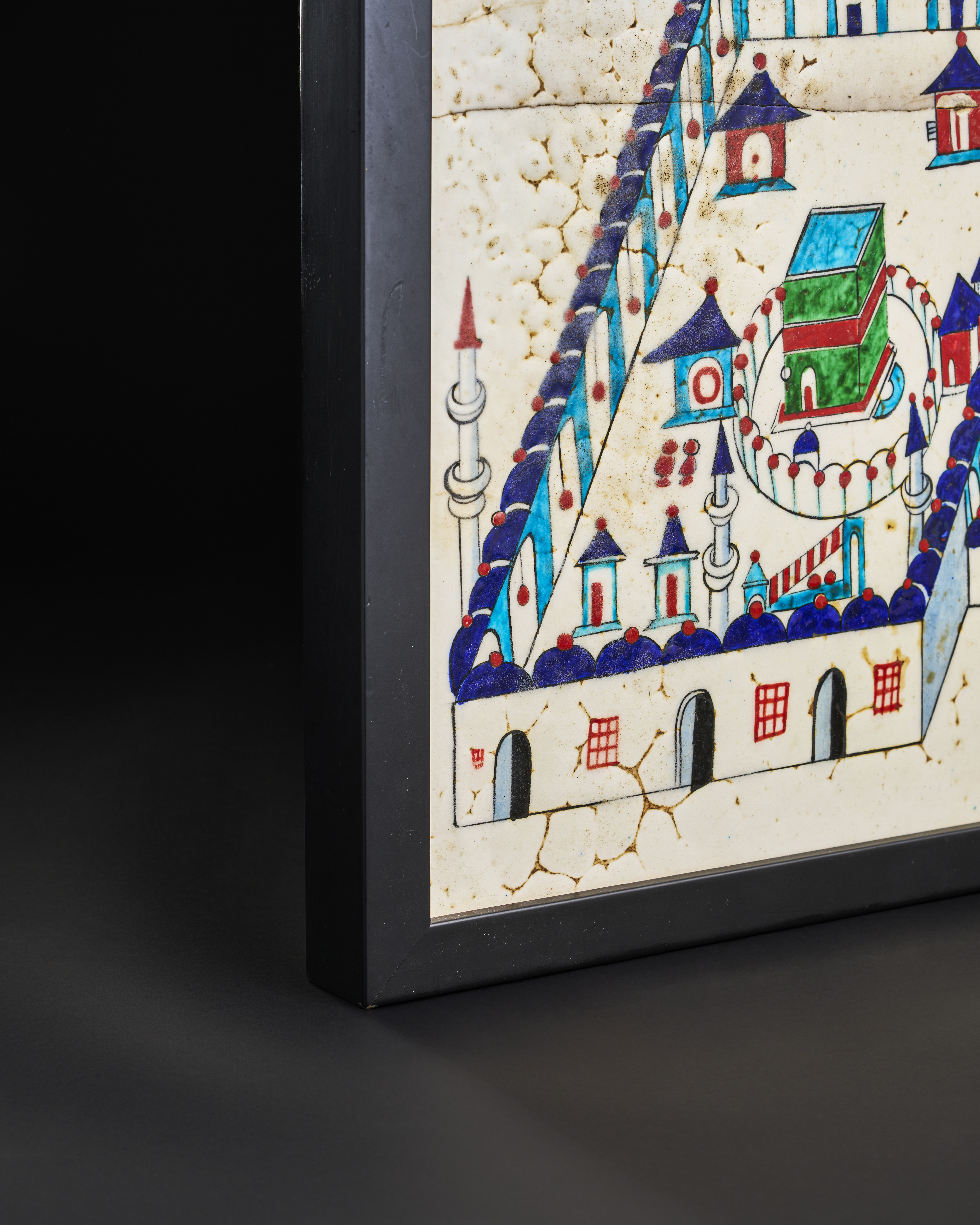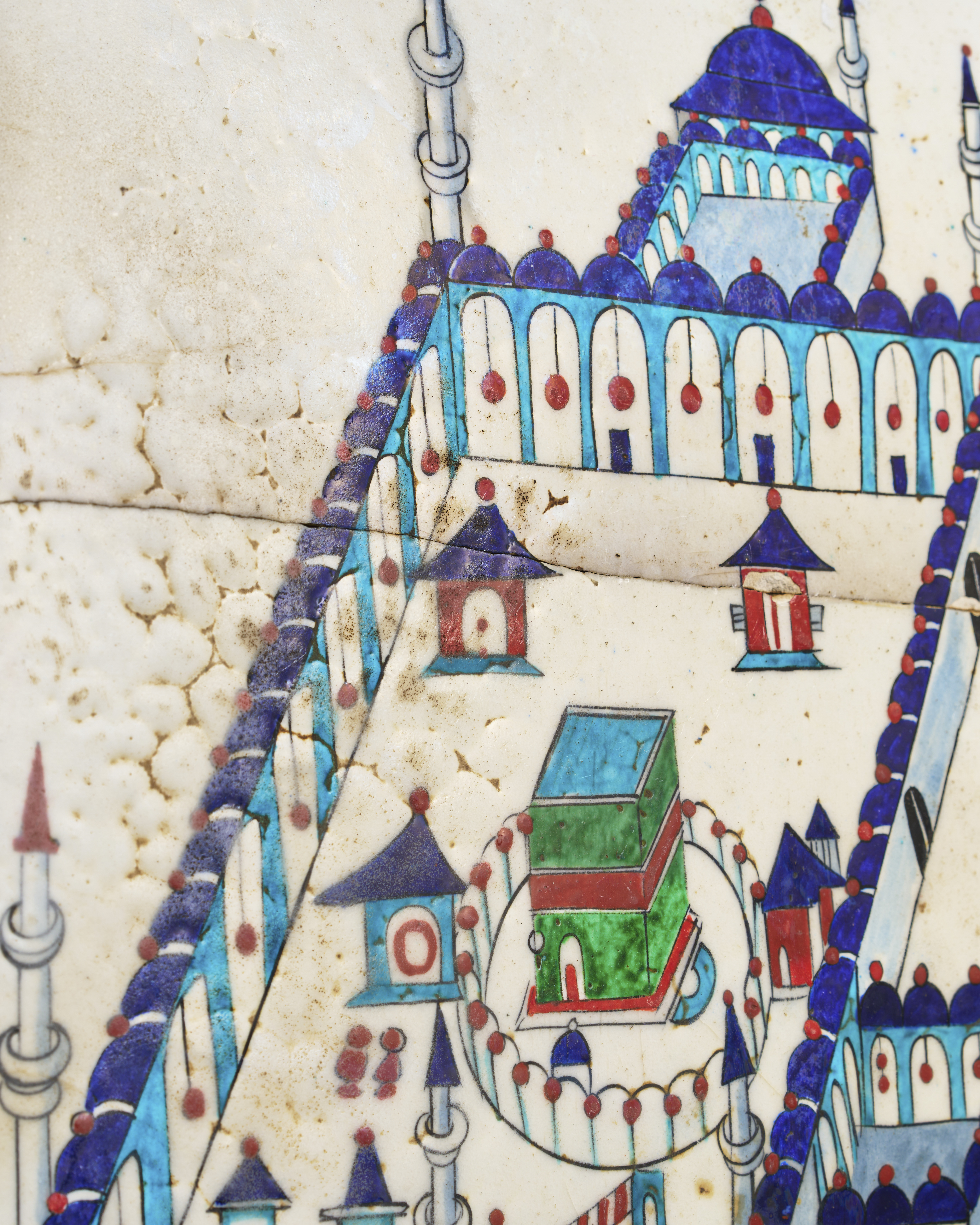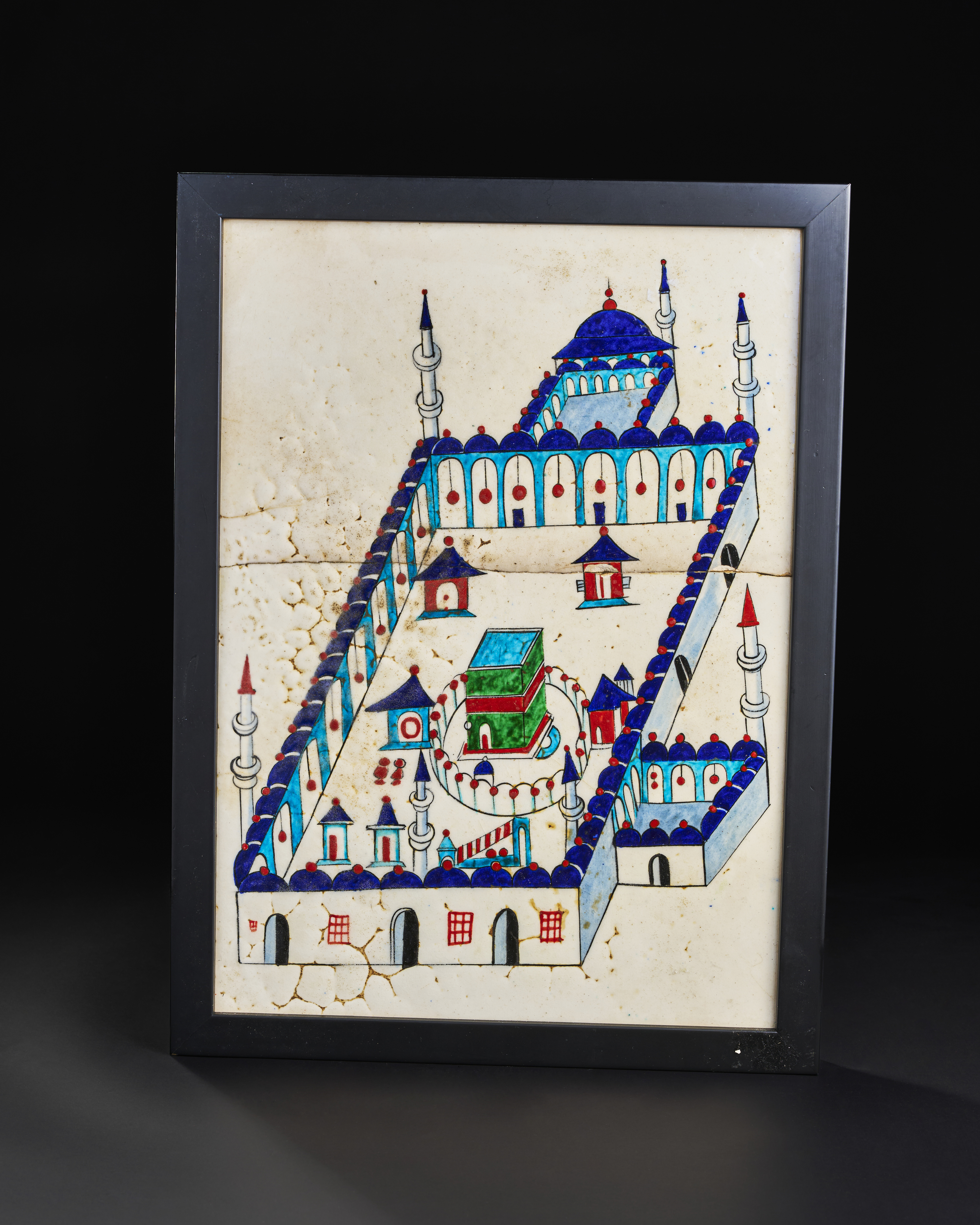 A 19th-century Ottoman Kutahya glazed pottery tile depicting the Kaaba within the Grand Mosque of Mecca. This intricately hand-painted tile captures the architectural and spiritual essence of Islam’s holiest site, framed by vivid blue, green, and red glazes. The central image features the Kaaba surrounded by colonnades, minarets, and domed structures, all meticulously rendered in a stylised, geometric style.