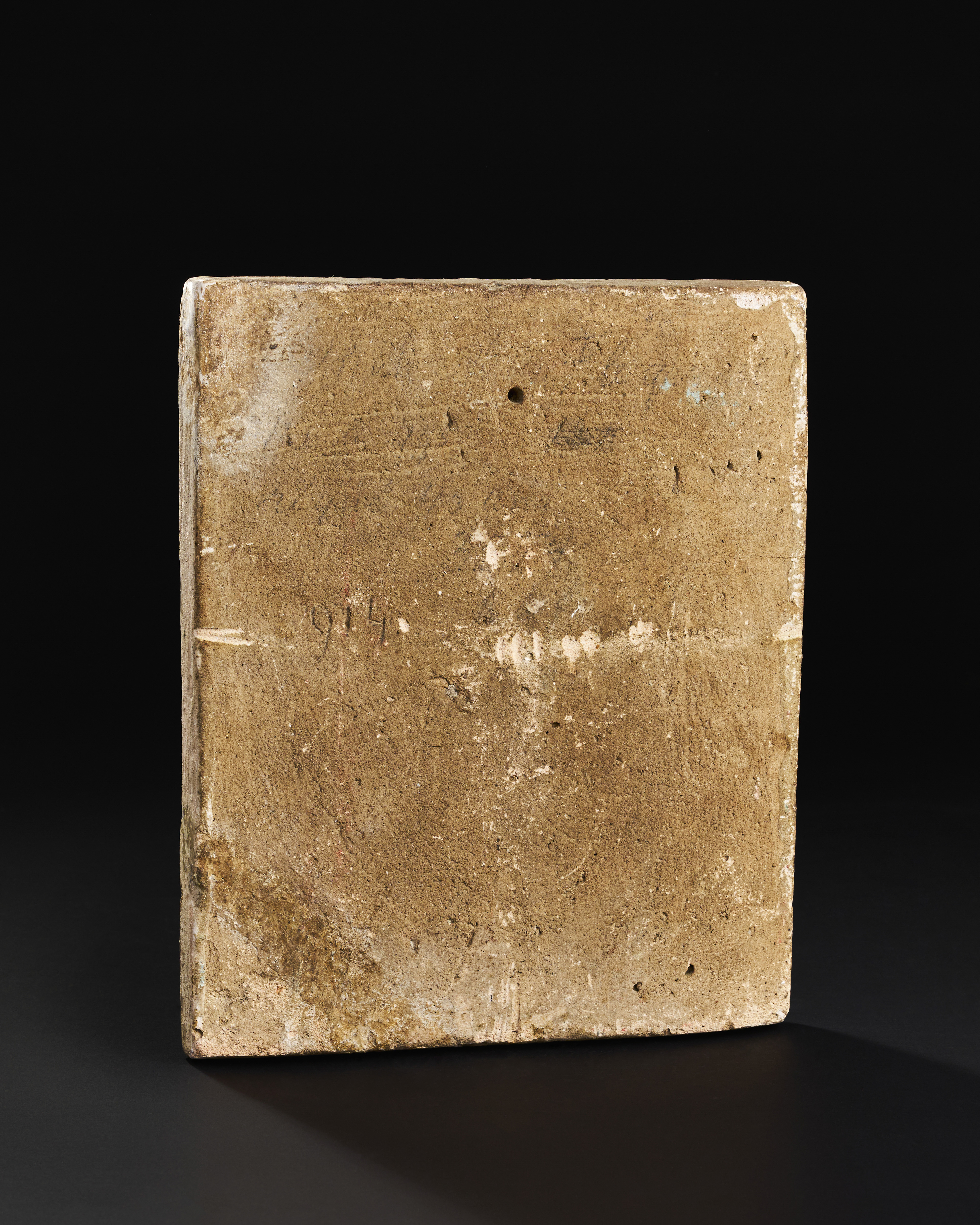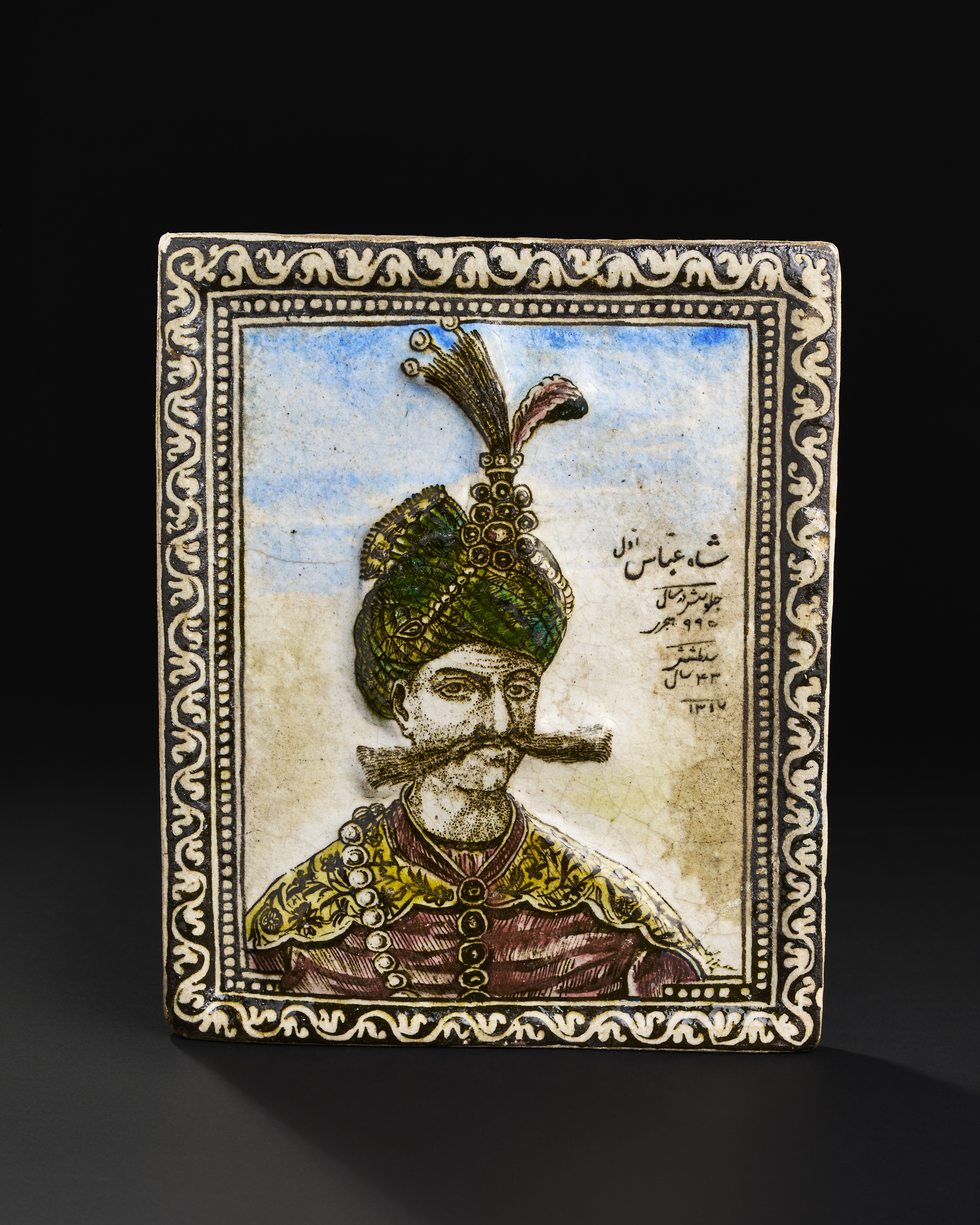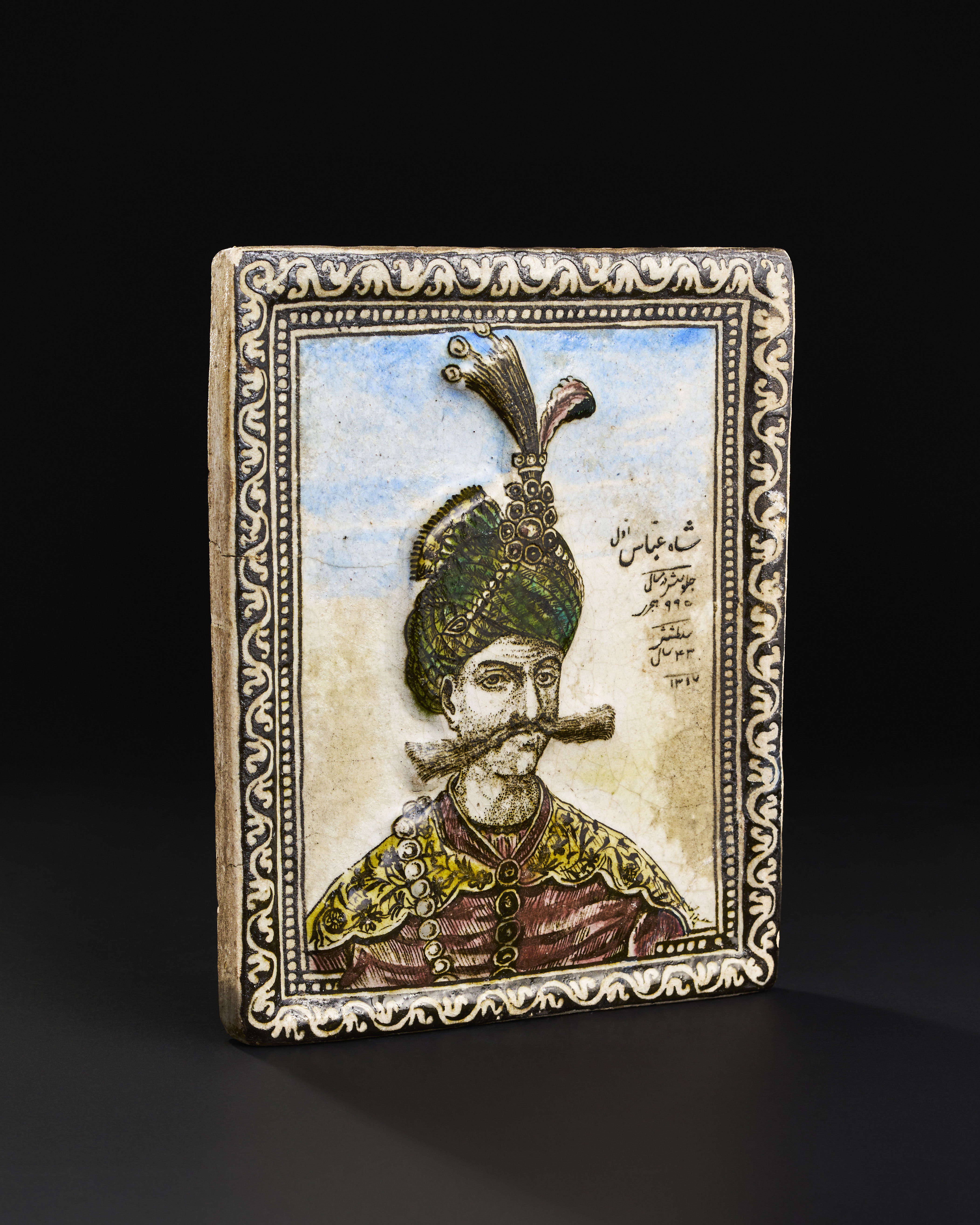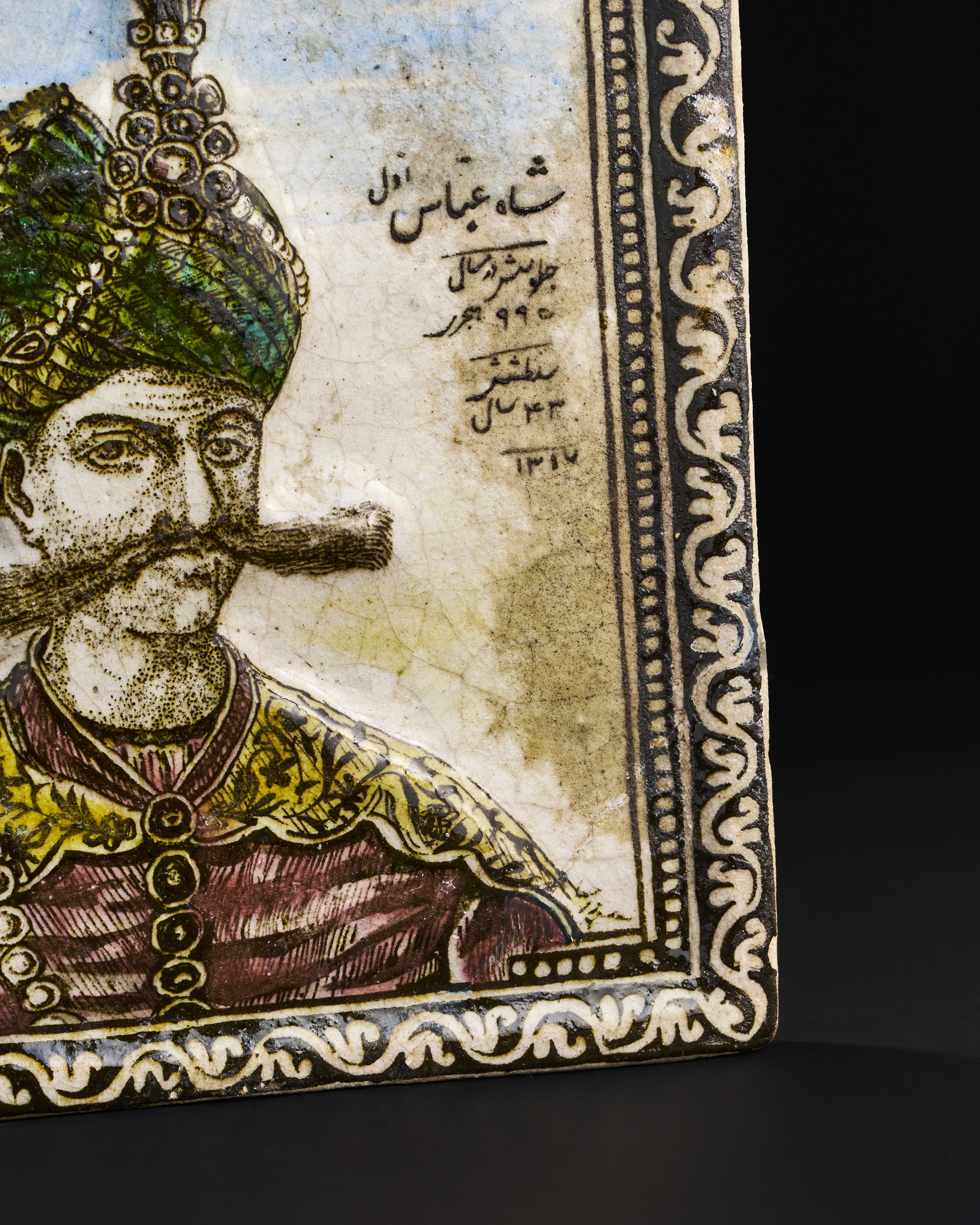 of rectangular form, moulded and decorated underglaze in polychrome with the Shah wearing a turban with ornate sarpech, inscriptions and date to his right, the border with undulating vines