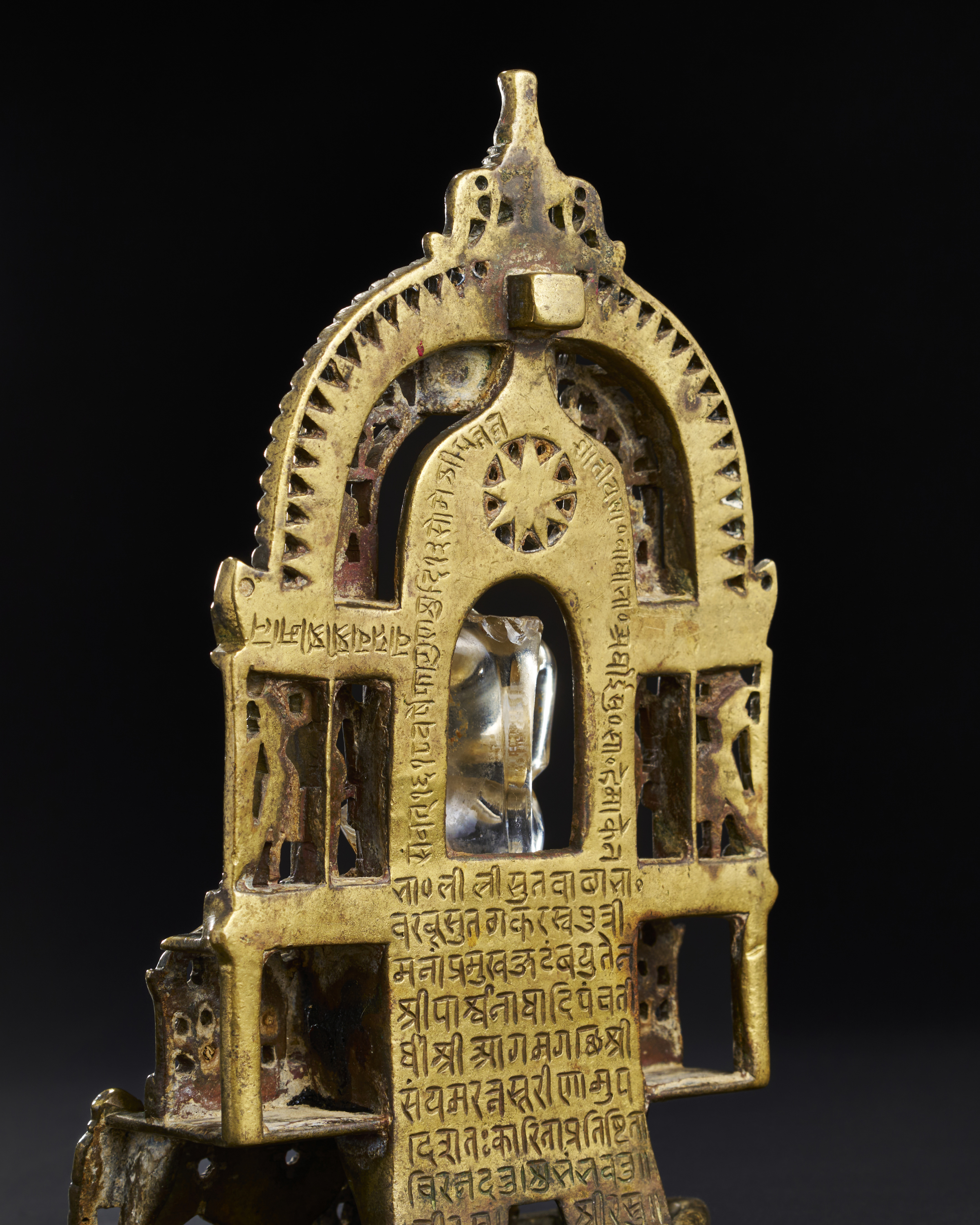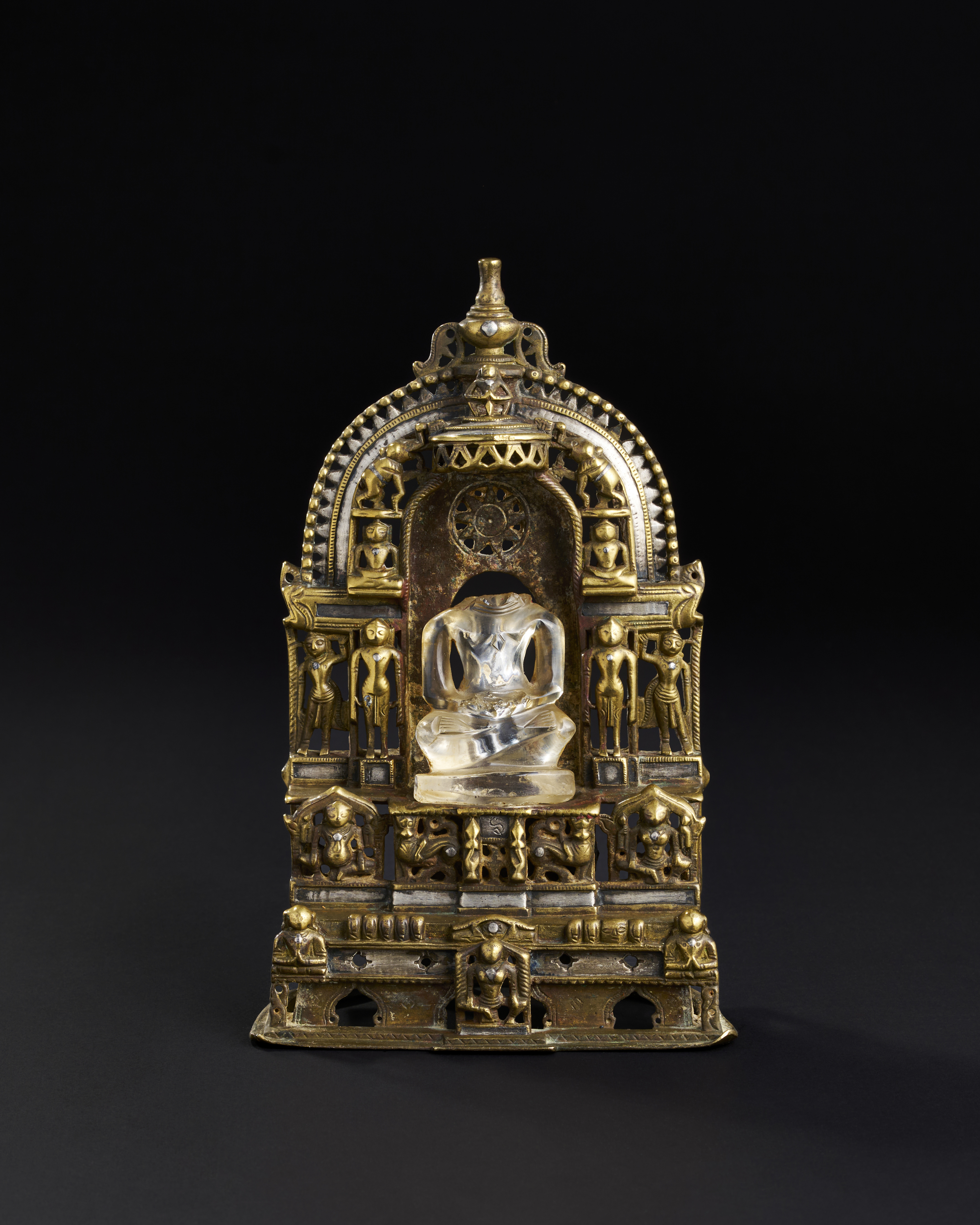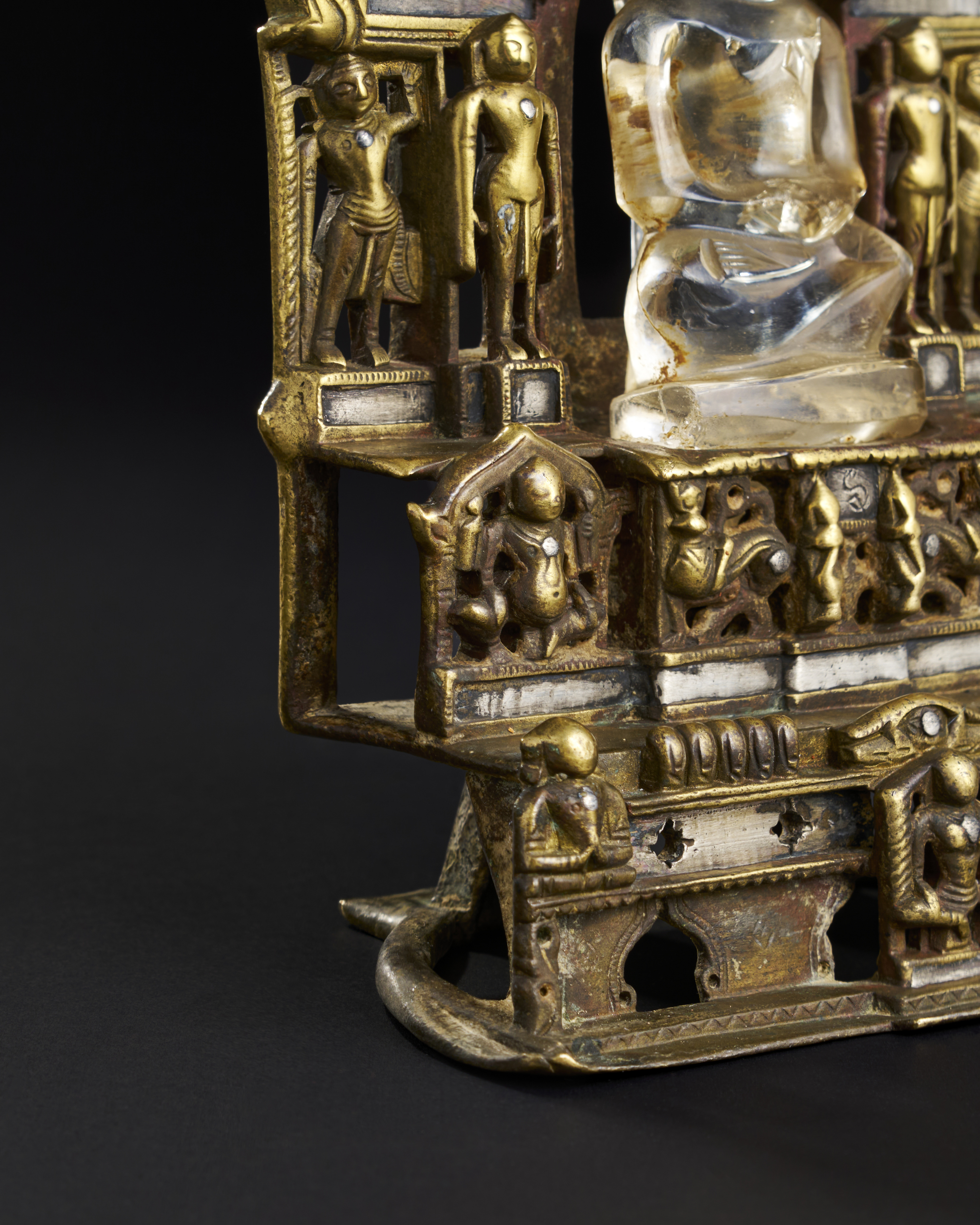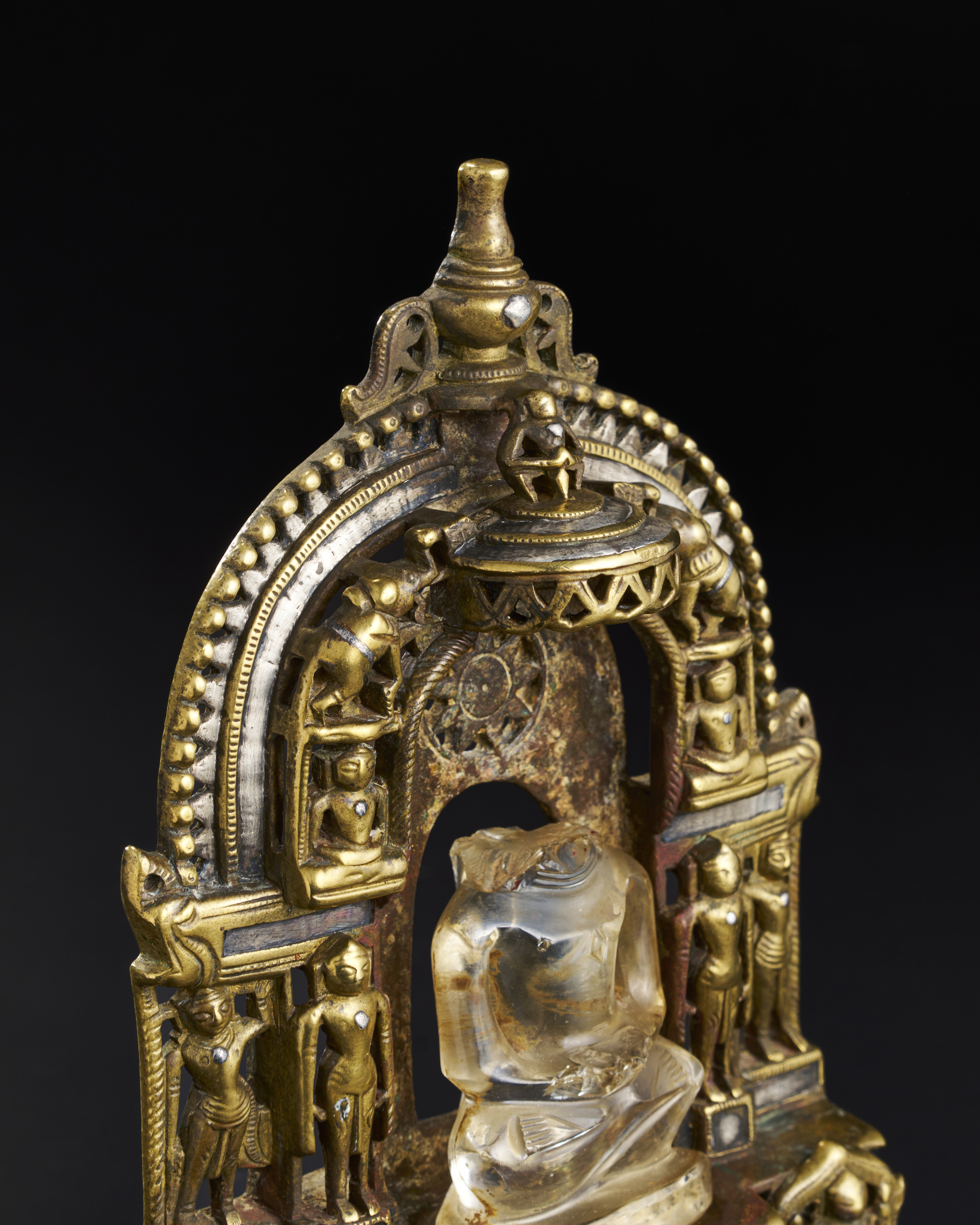 A South Indian Jain shrine, crafted from brass or bronze with intricate silver inlay, dating to the 15th-16th century. This exquisite shrine features a rock crystal deity seated in the padmasana (lotus posture) within a highly ornate architectural framework. The deity is flanked by finely detailed attendants, celestial beings, and auspicious Jain motifs, including a dharmachakra (wheel of dharma) above the figure.