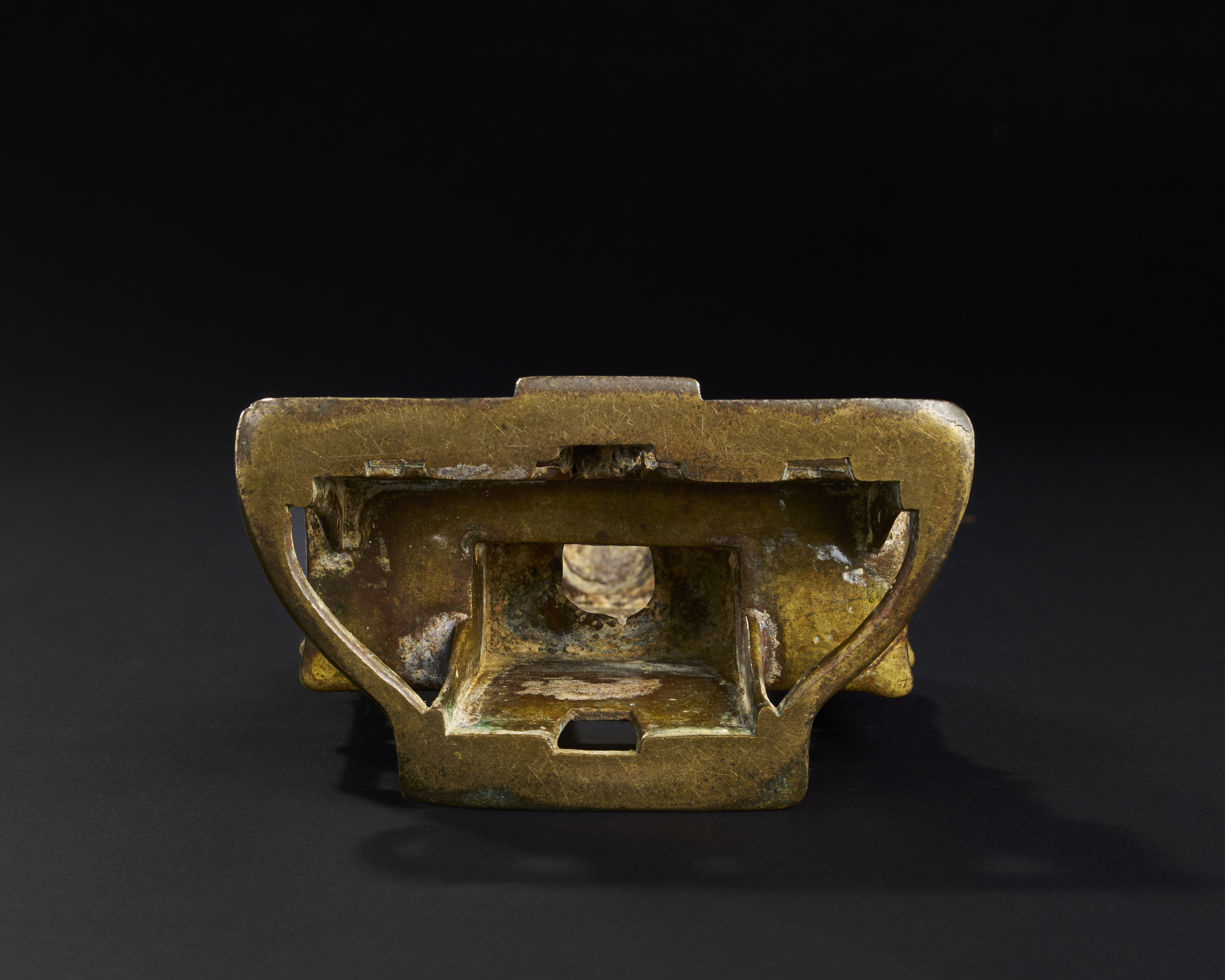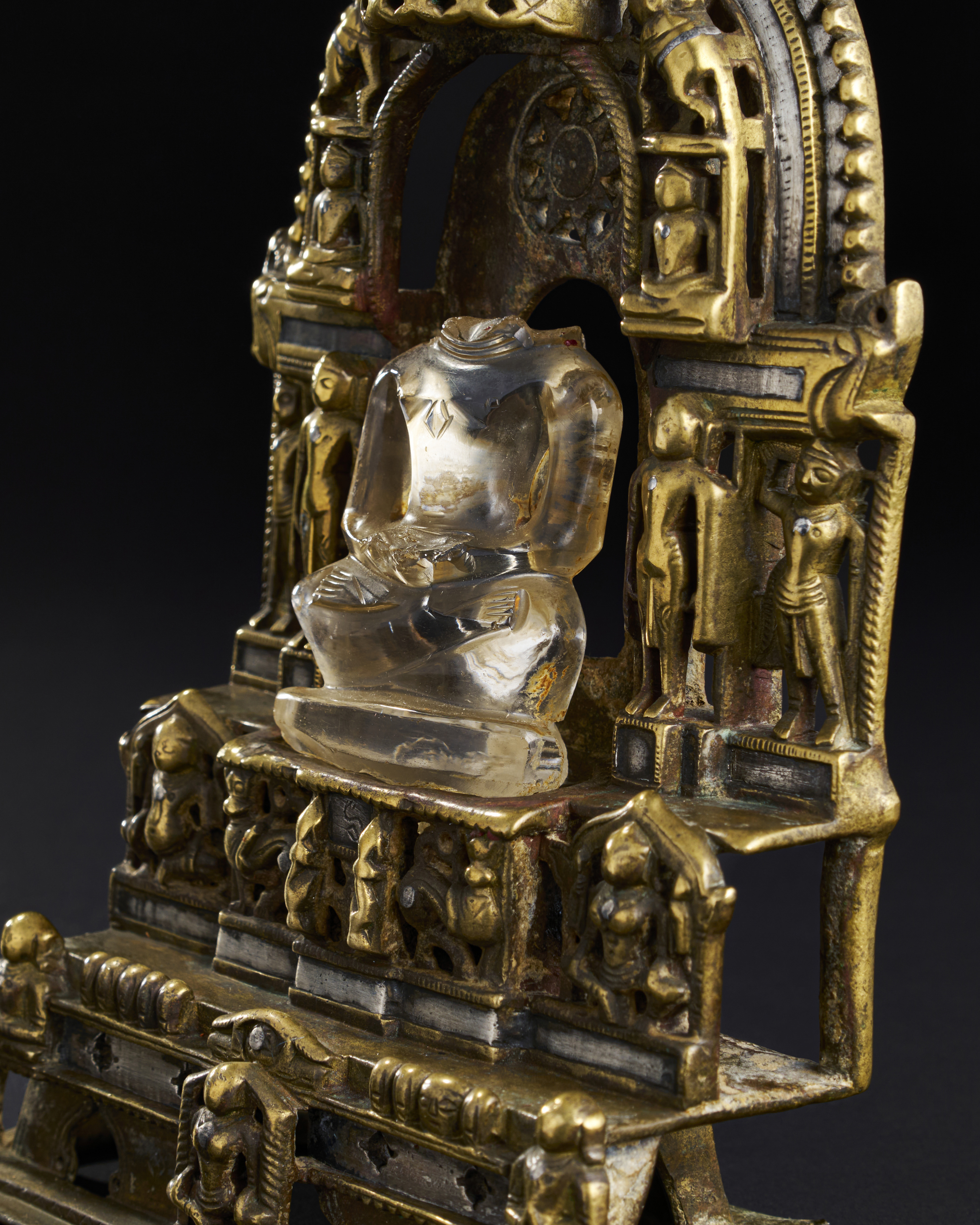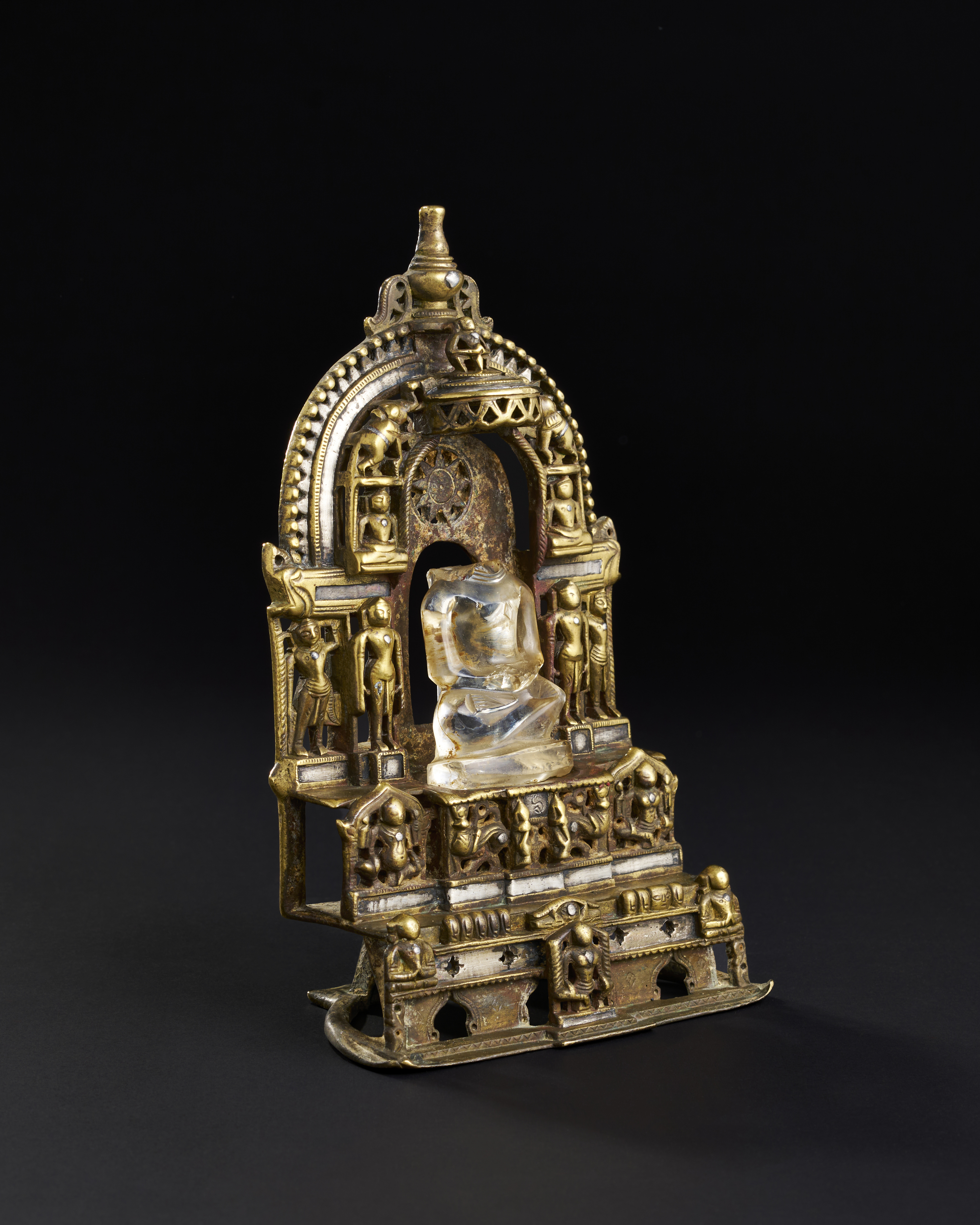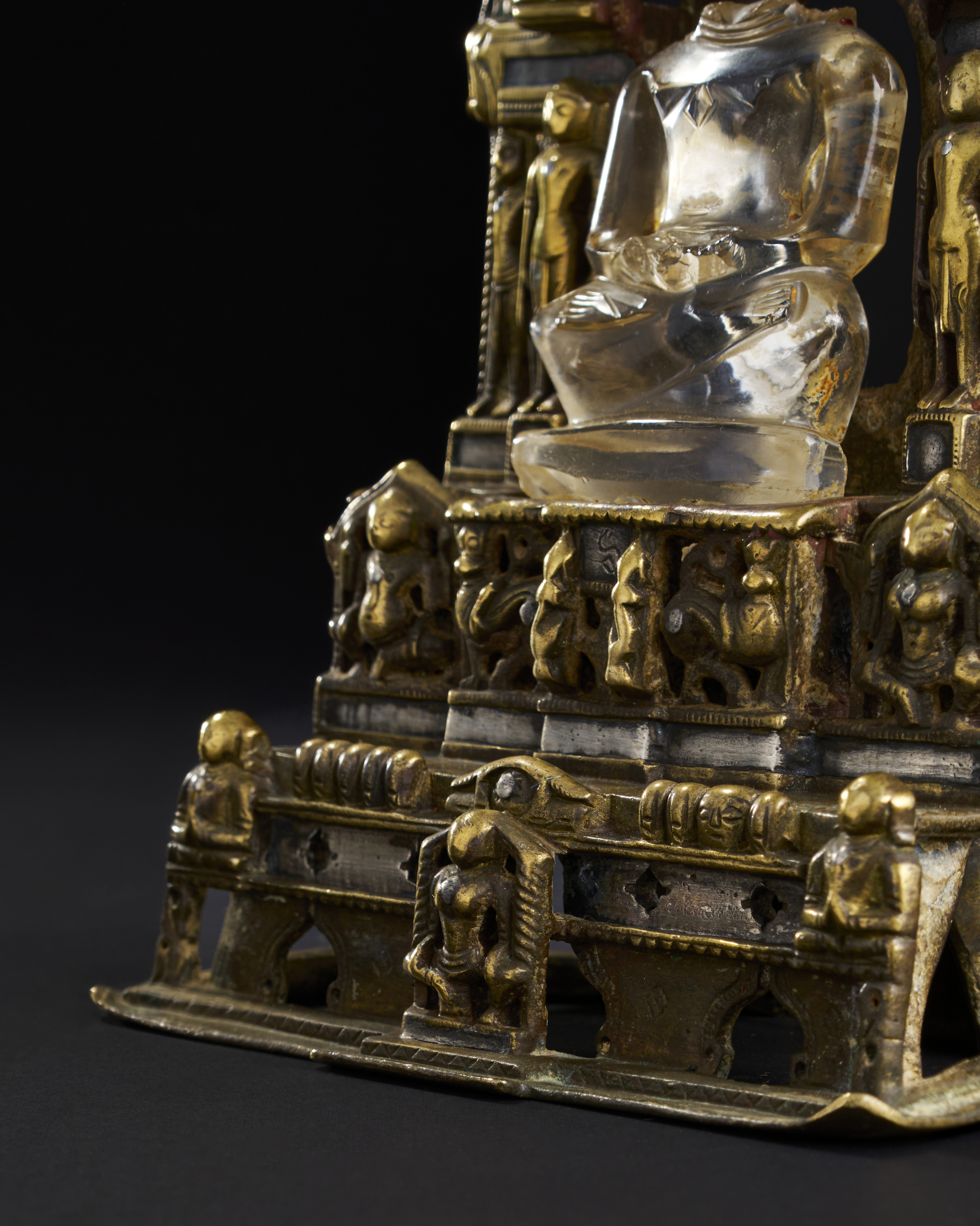 A South Indian Jain shrine, crafted from brass or bronze with intricate silver inlay, dating to the 15th-16th century. This exquisite shrine features a rock crystal deity seated in the padmasana (lotus posture) within a highly ornate architectural framework. The deity is flanked by finely detailed attendants, celestial beings, and auspicious Jain motifs, including a dharmachakra (wheel of dharma) above the figure.