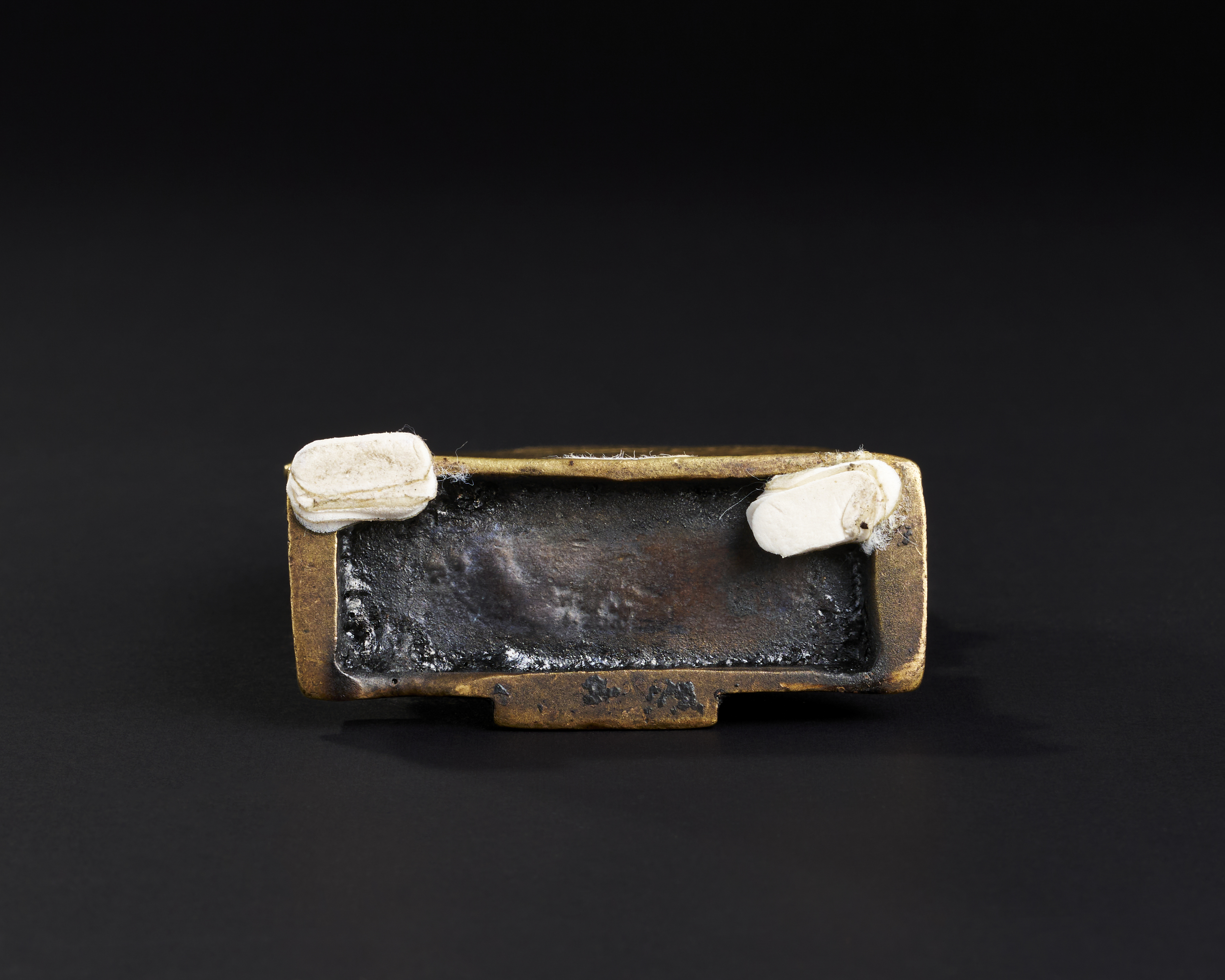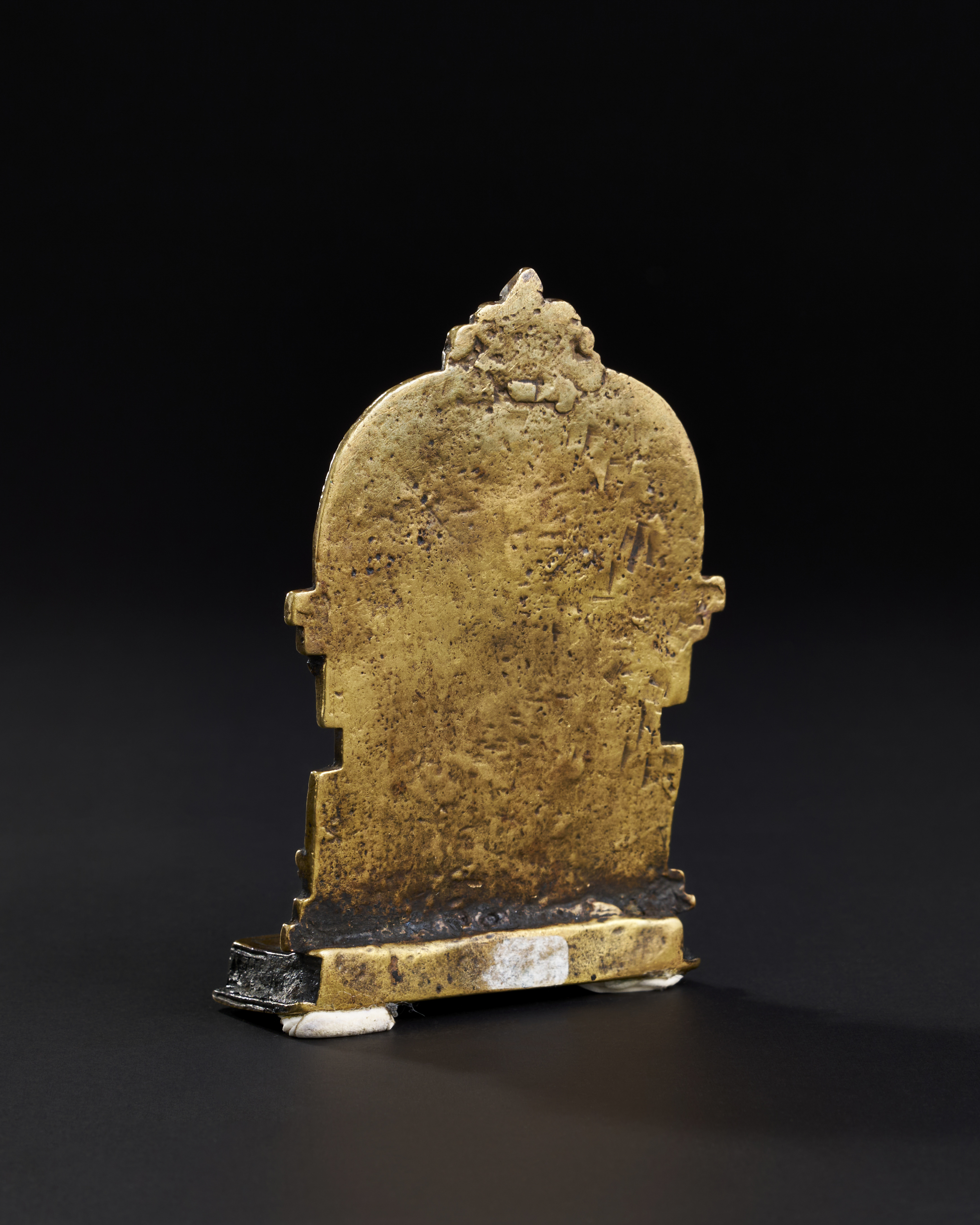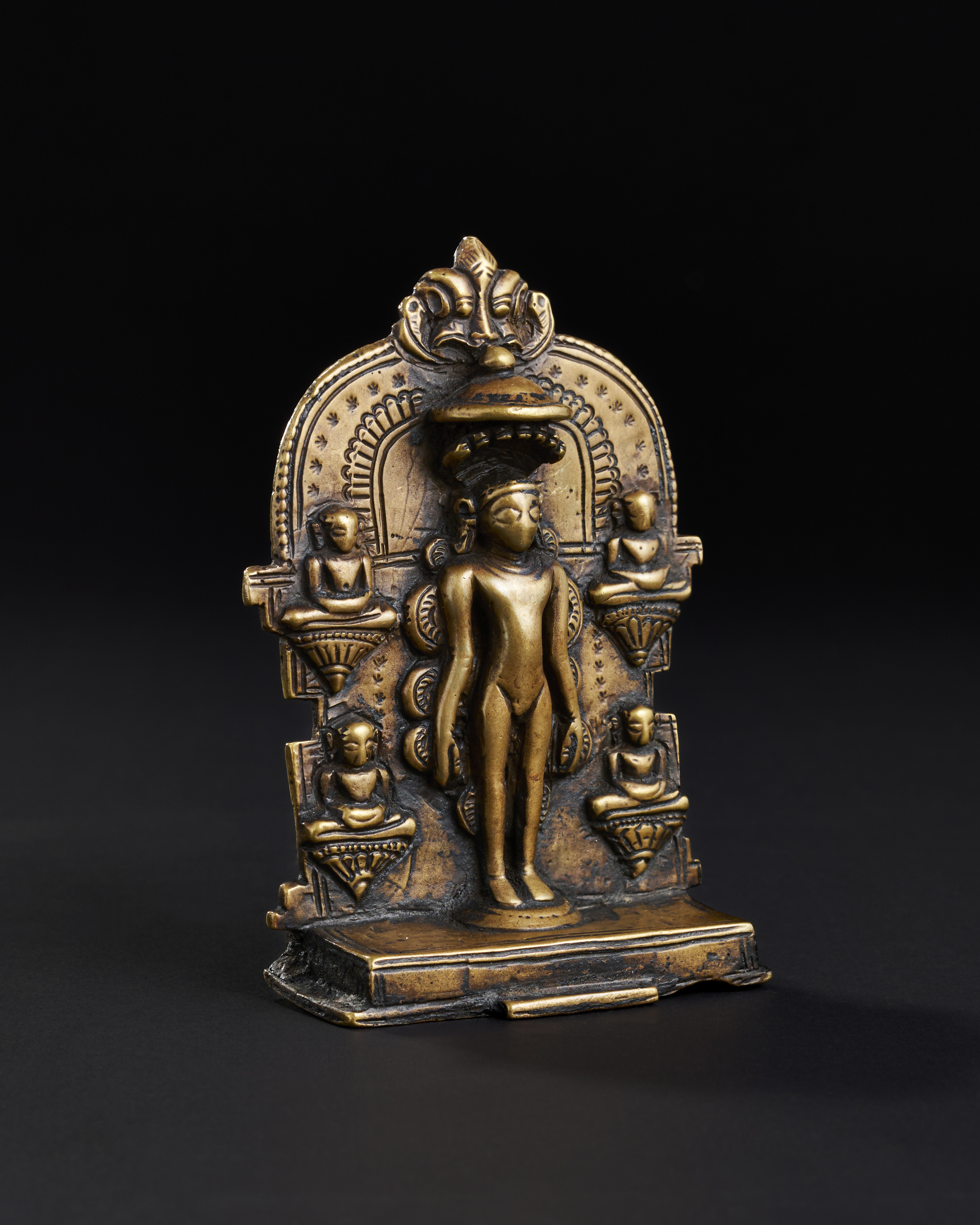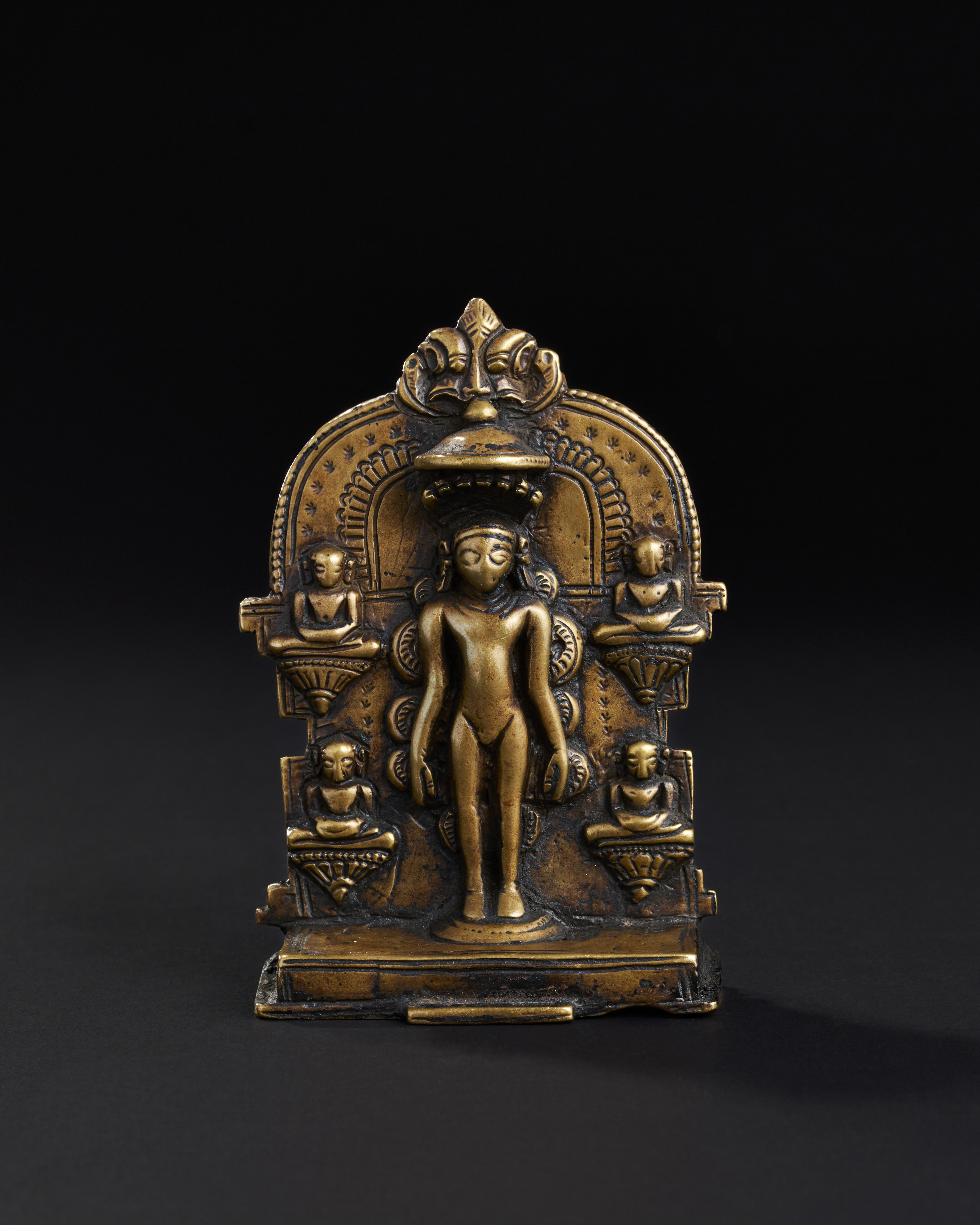 A finely crafted South Indian bronze Jain shrine dating to the 17th-18th century. The central figure depicts a standing Tirthankara in kayotsarga (meditative posture), surrounded by attendants seated on lotus thrones. The shrine is framed by an ornate arch with intricate floral and geometric motifs, typical of South Indian craftsmanship.