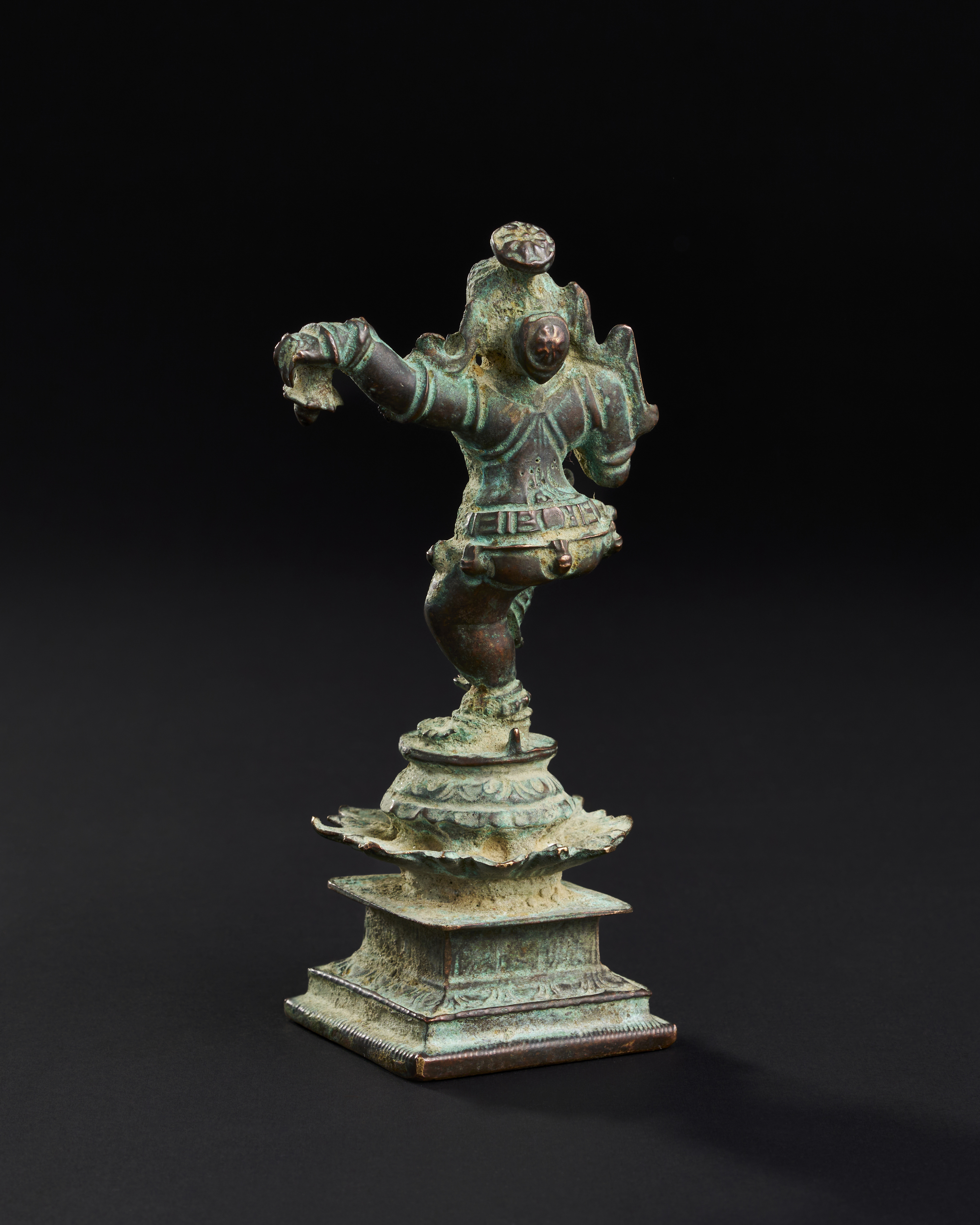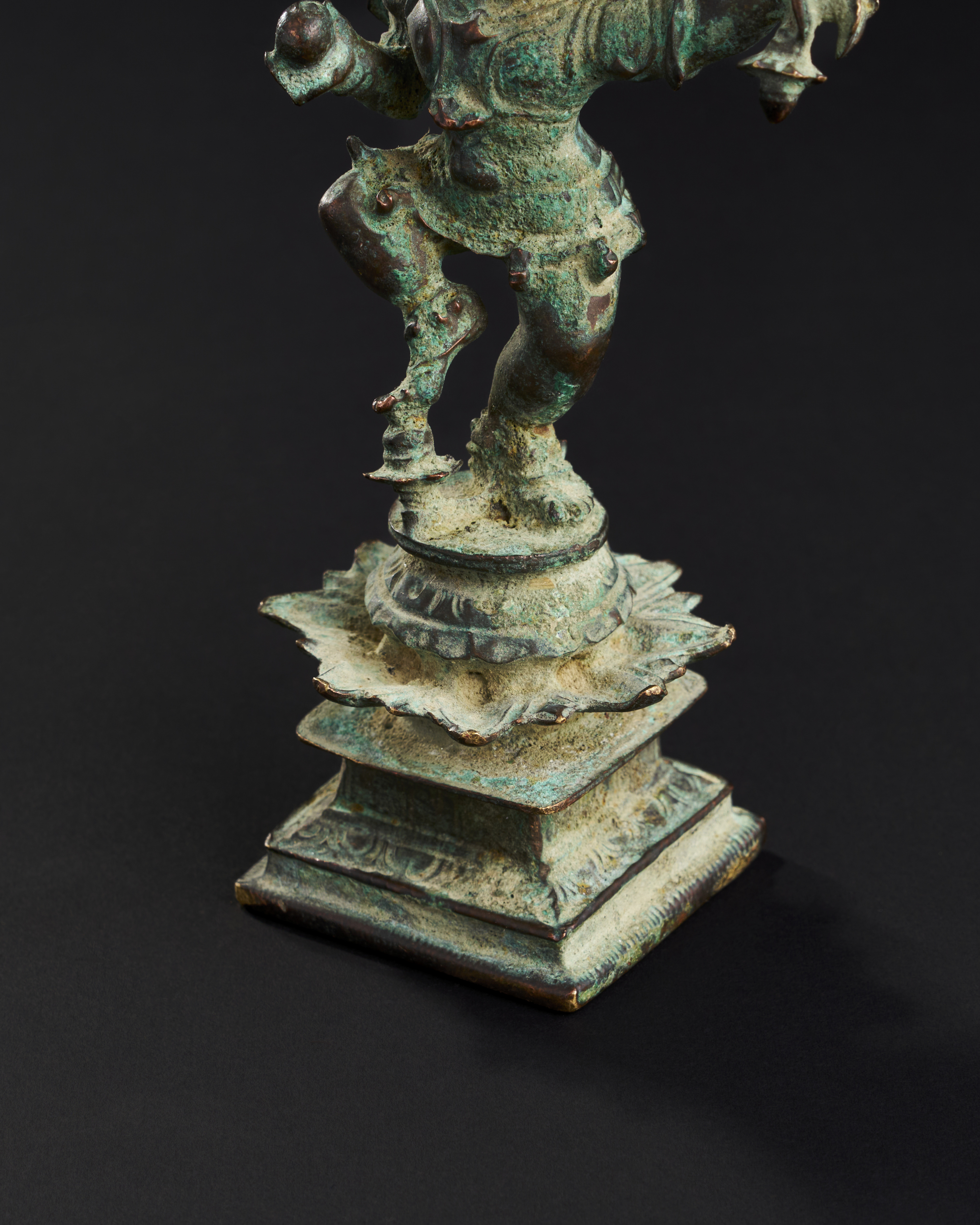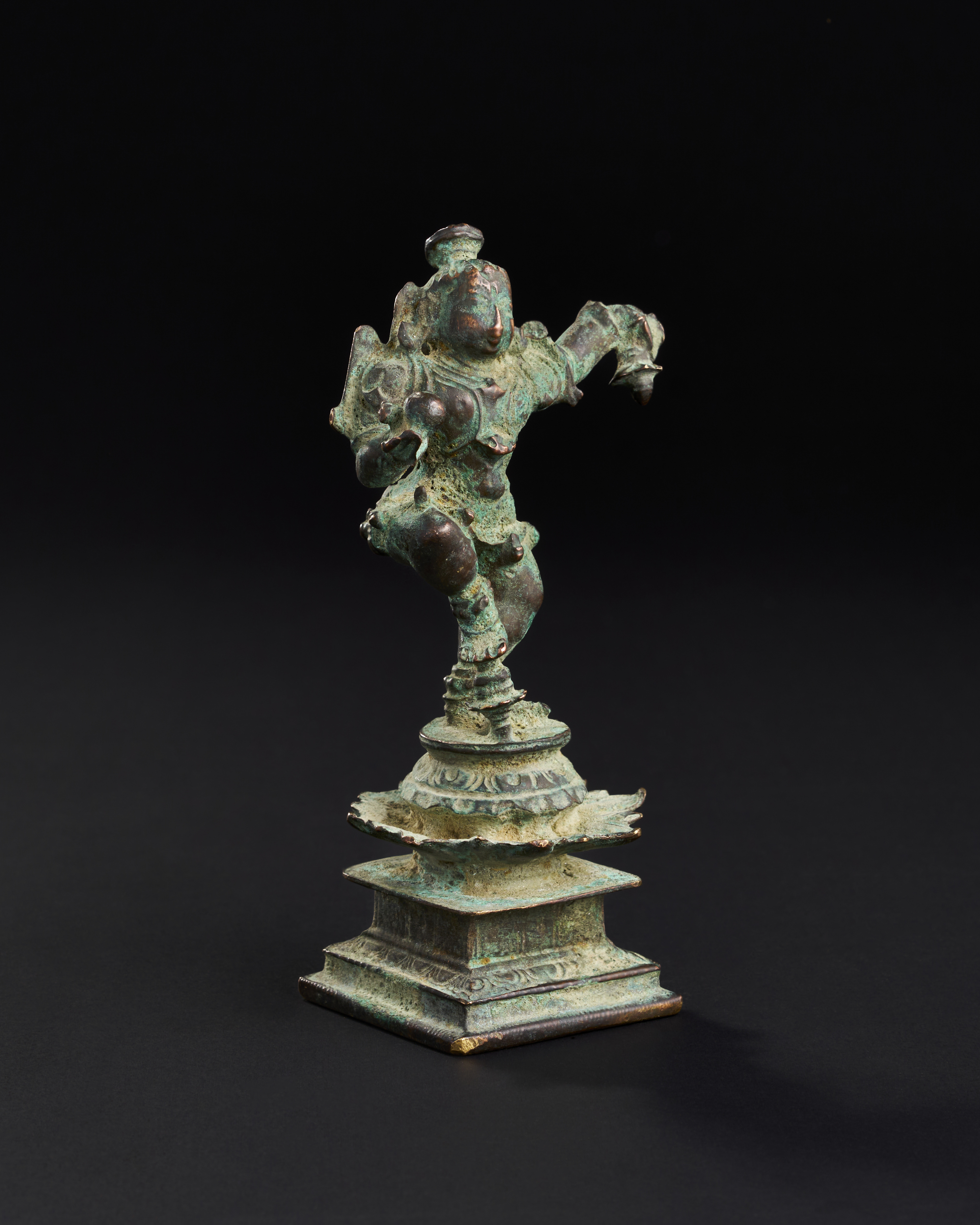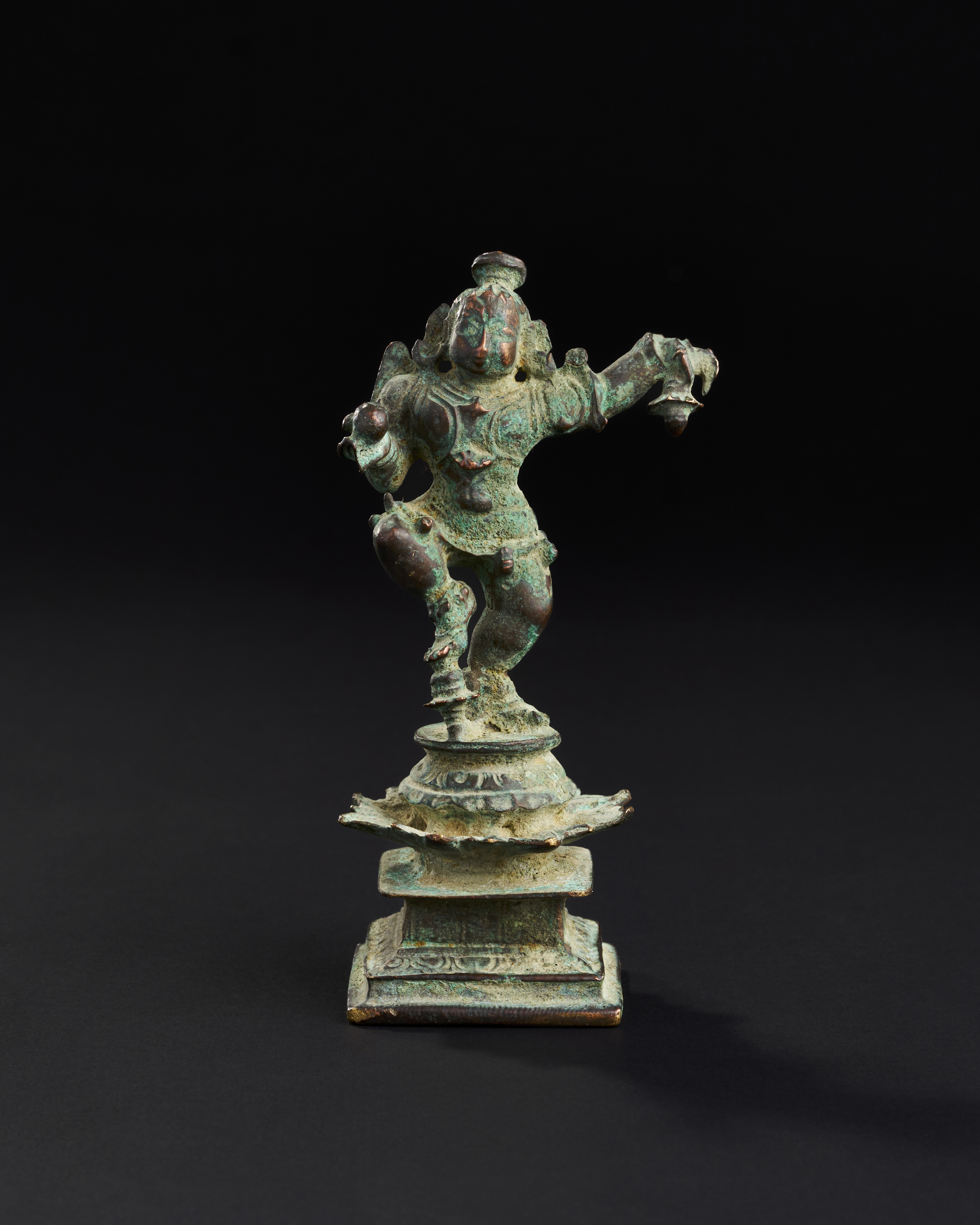 A 17TH CENTURY OR EARLIER SOUTH INDIAN BRONZE FIGURE OF DANCING KRISHNA IN A LOTUS SHAPED BASED.