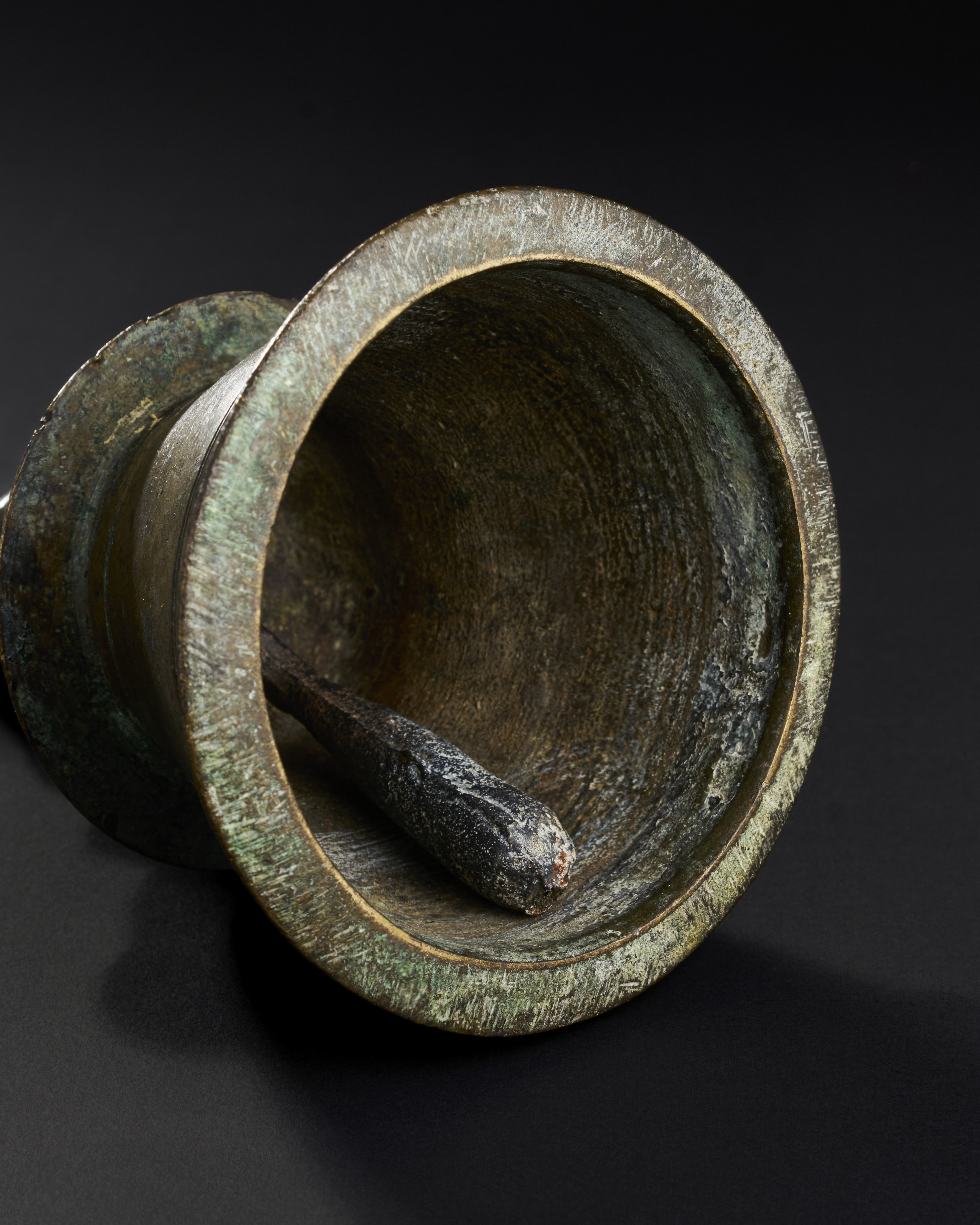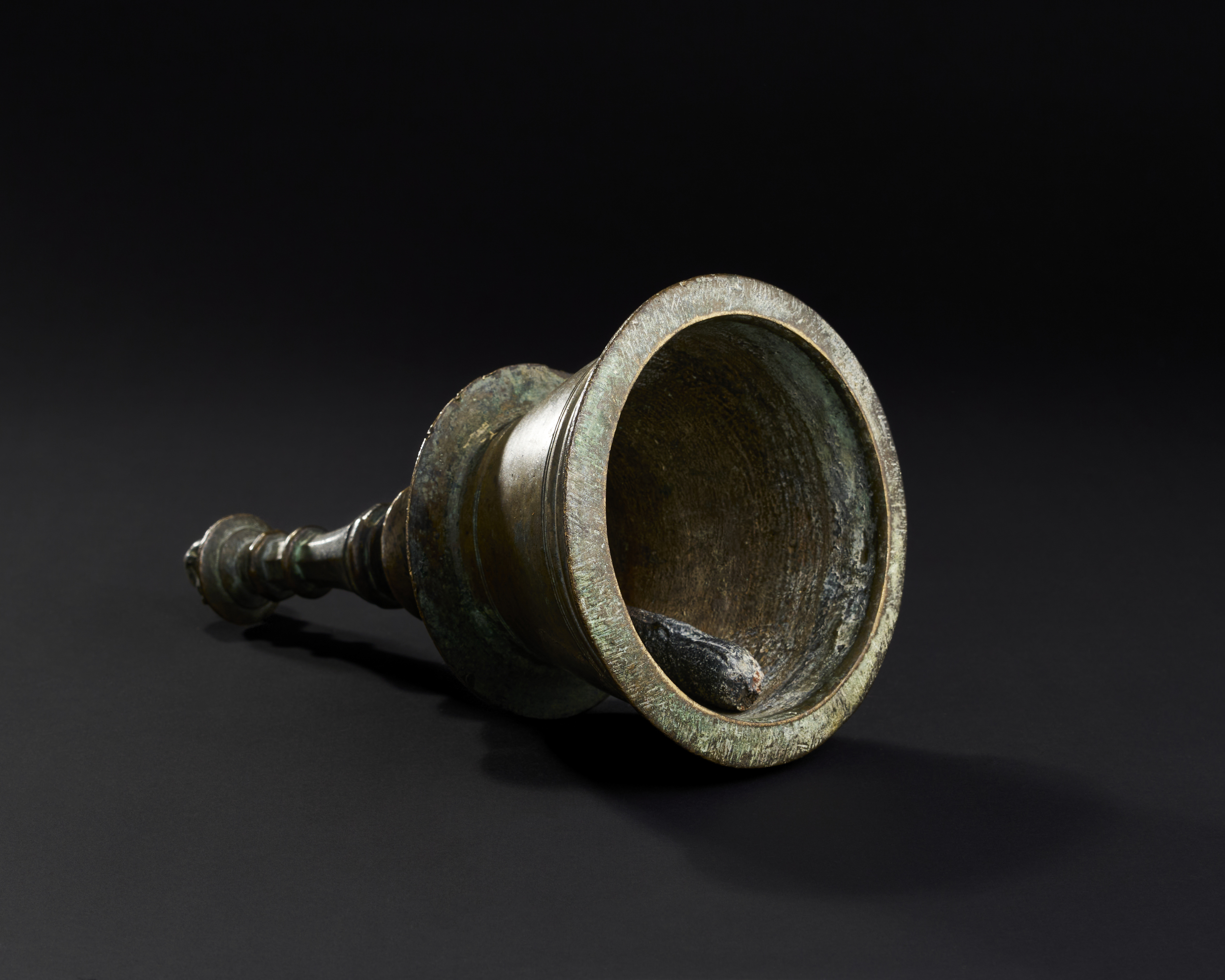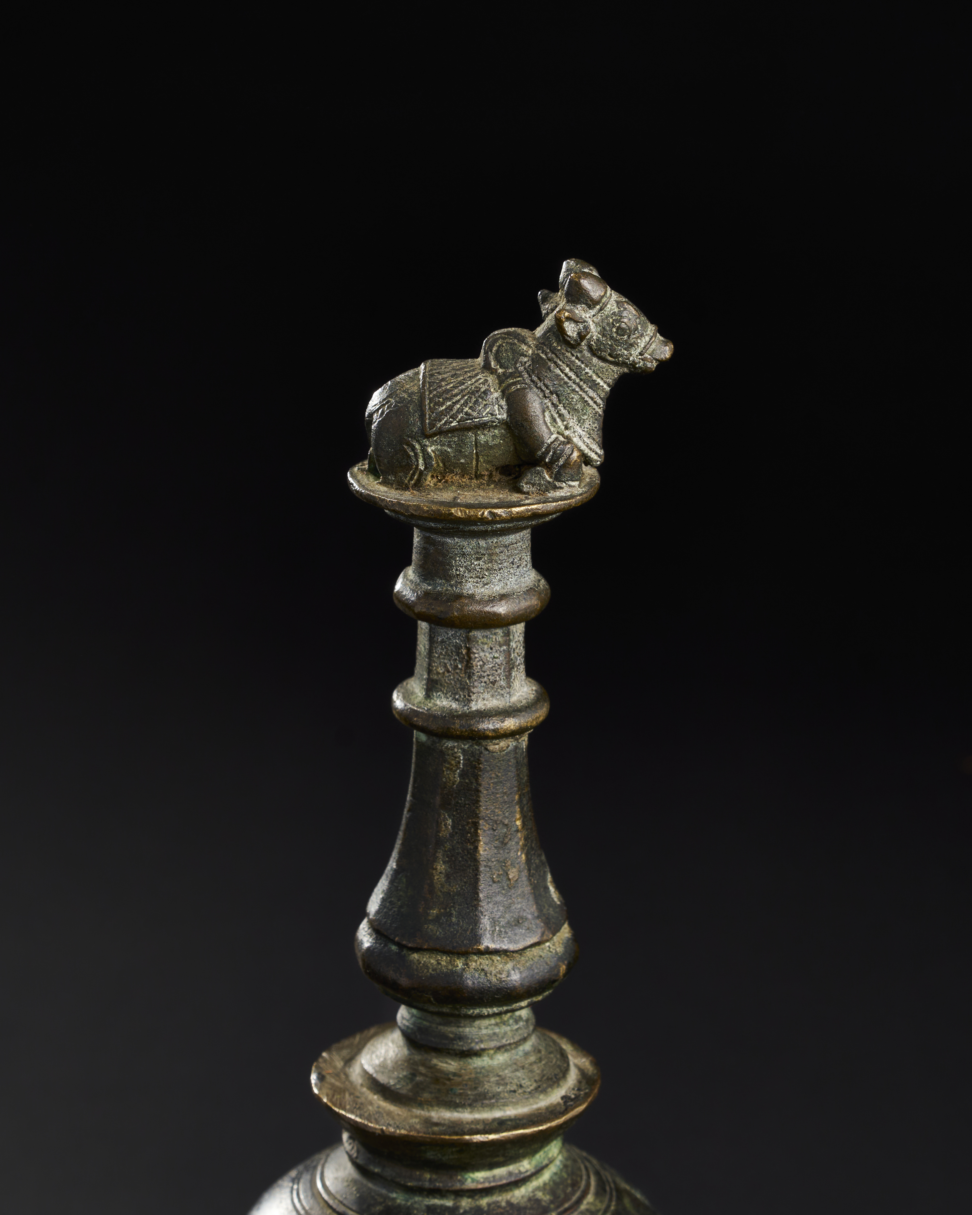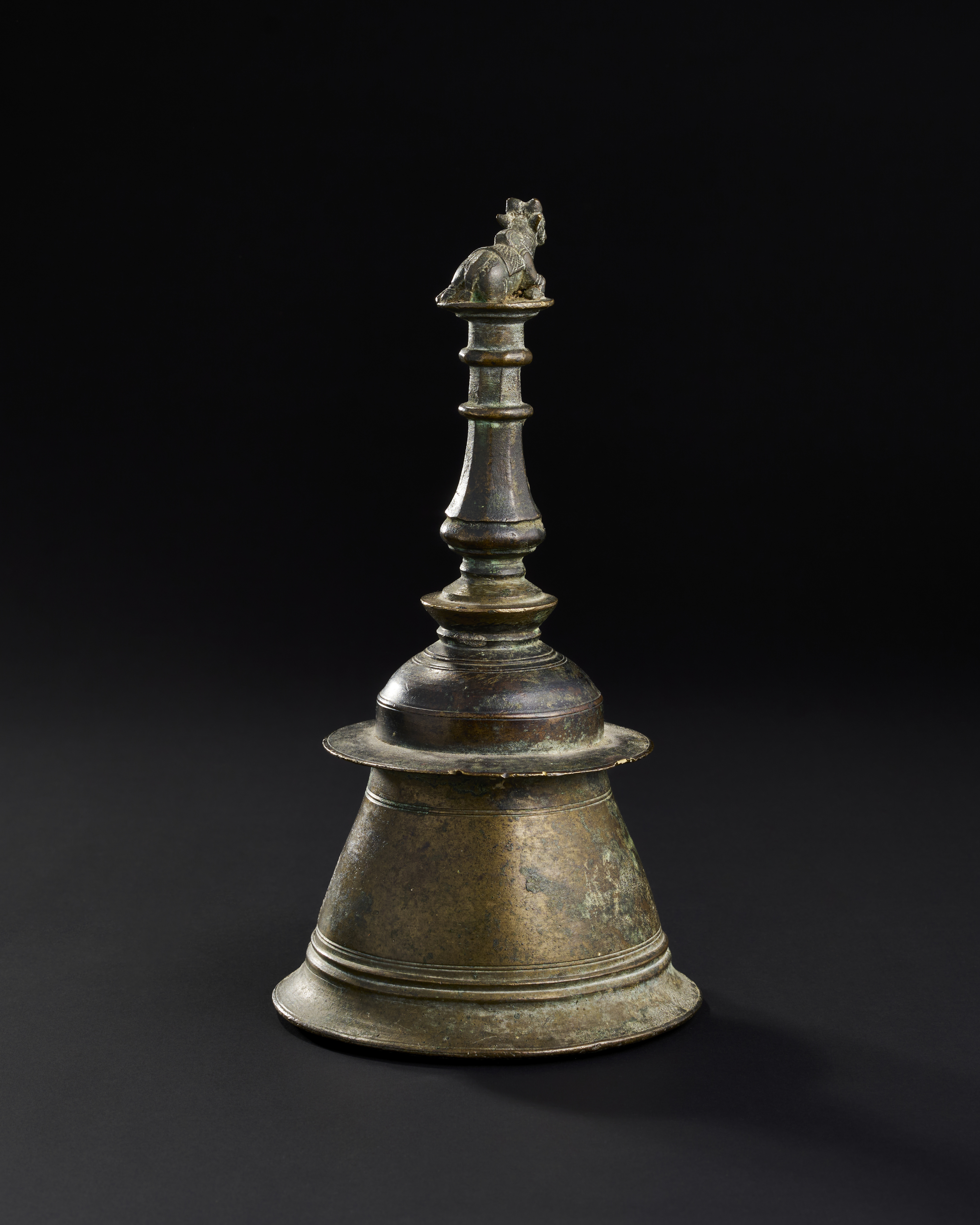 AN 18TH CENTURY SOUTH INDIAN BRONZE BELL WITH A NANDI BULL FINIAL