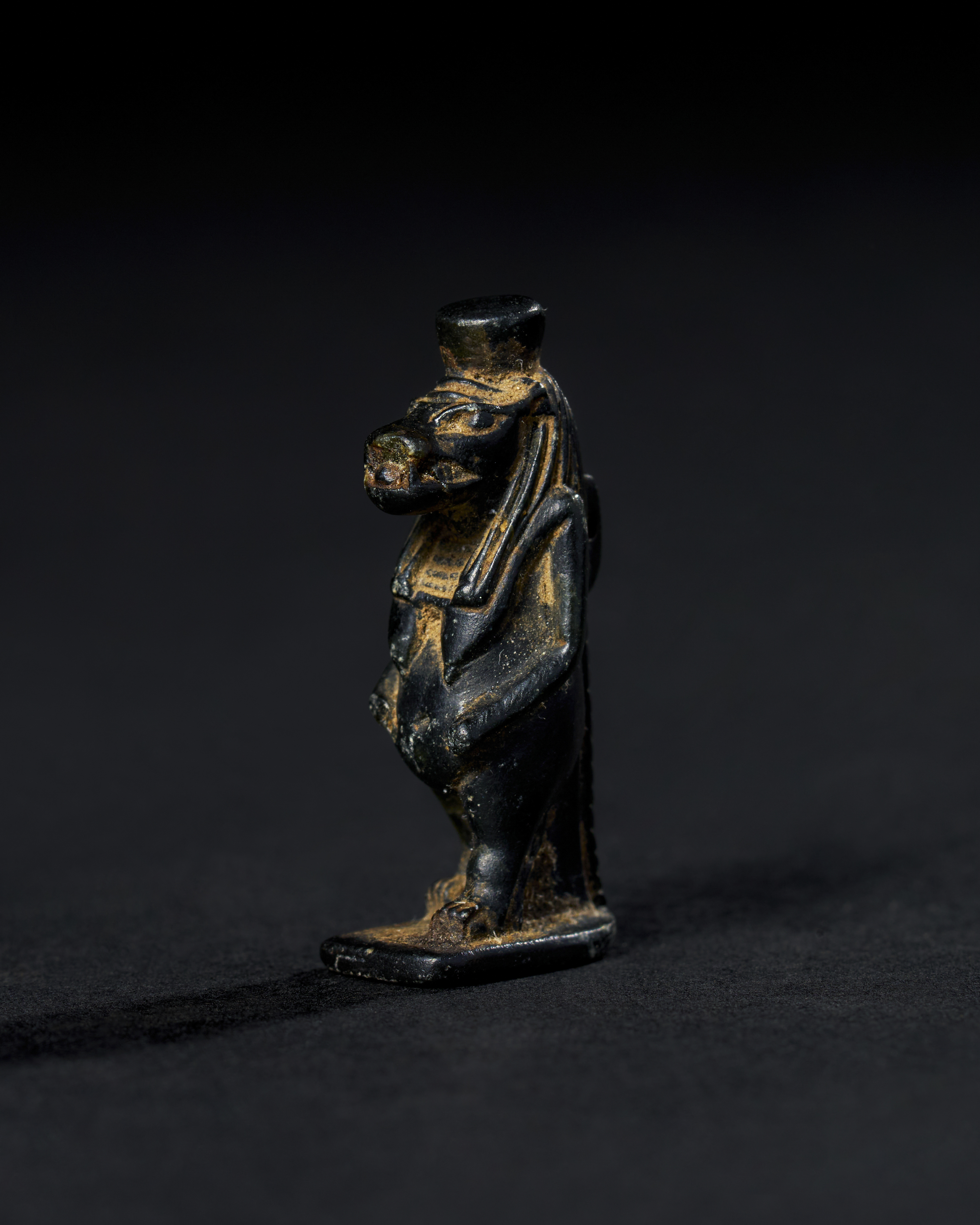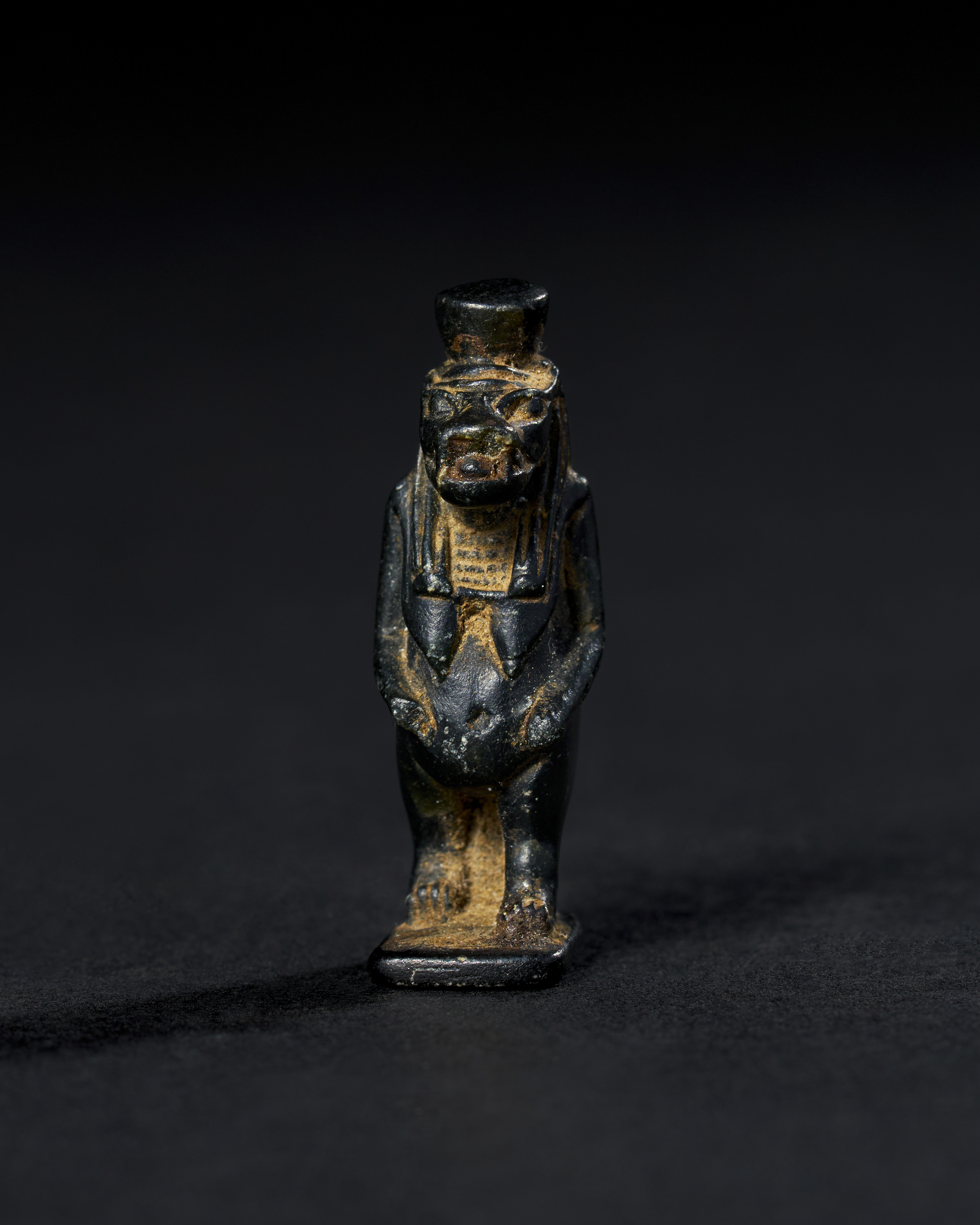 This finely detailed steatite amulet represents the goddess Taweret, revered in ancient Egyptian culture as a protector of women and childbirth. Dating back to the 26th Dynasty, circa 595-589 B.C. Taweret is depicted in her traditional form, with the body of a hippopotamus, lion limbs, and a crocodile tail, symbolising her fierce guardianship. This amulet would have been worn for protection and blessings.