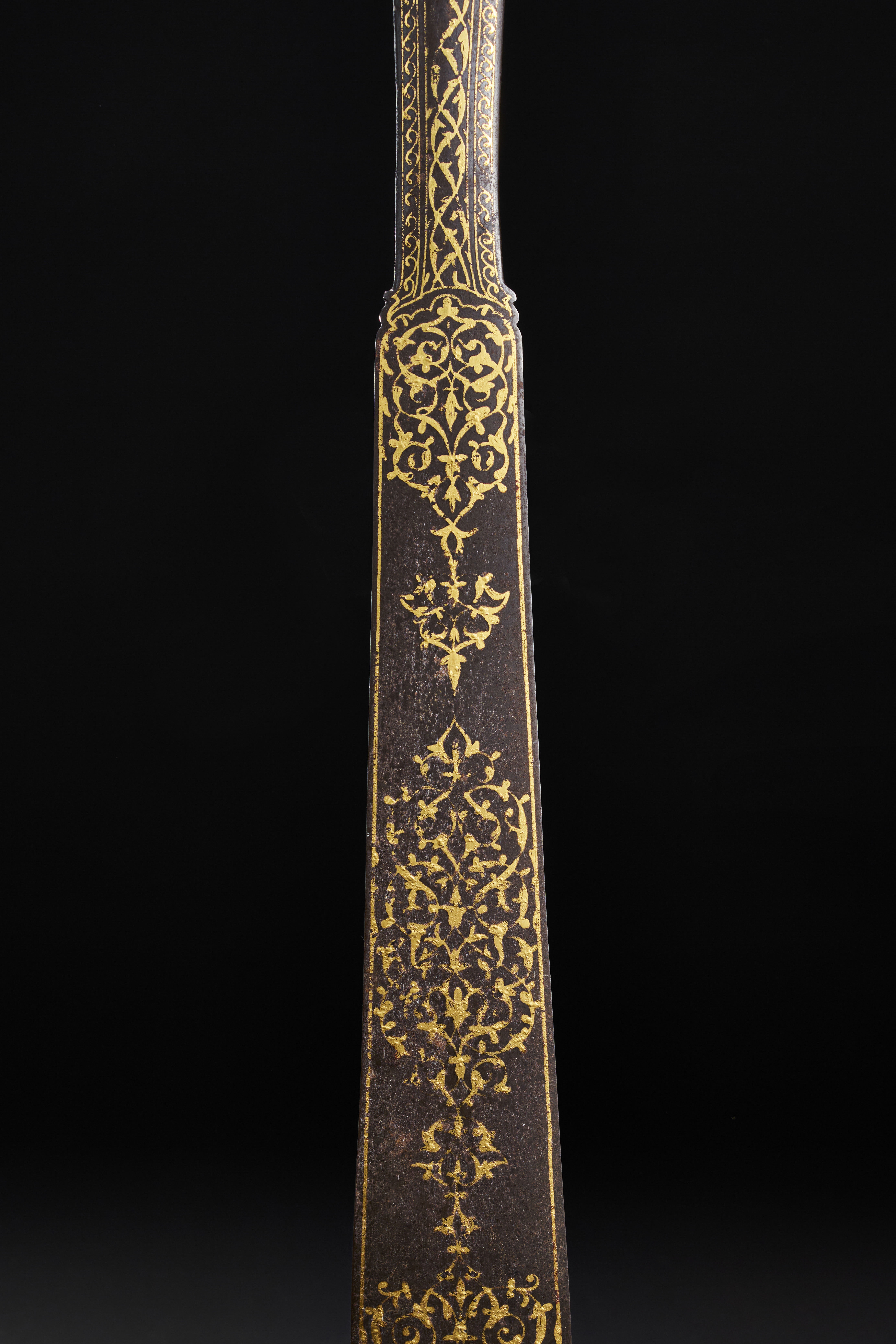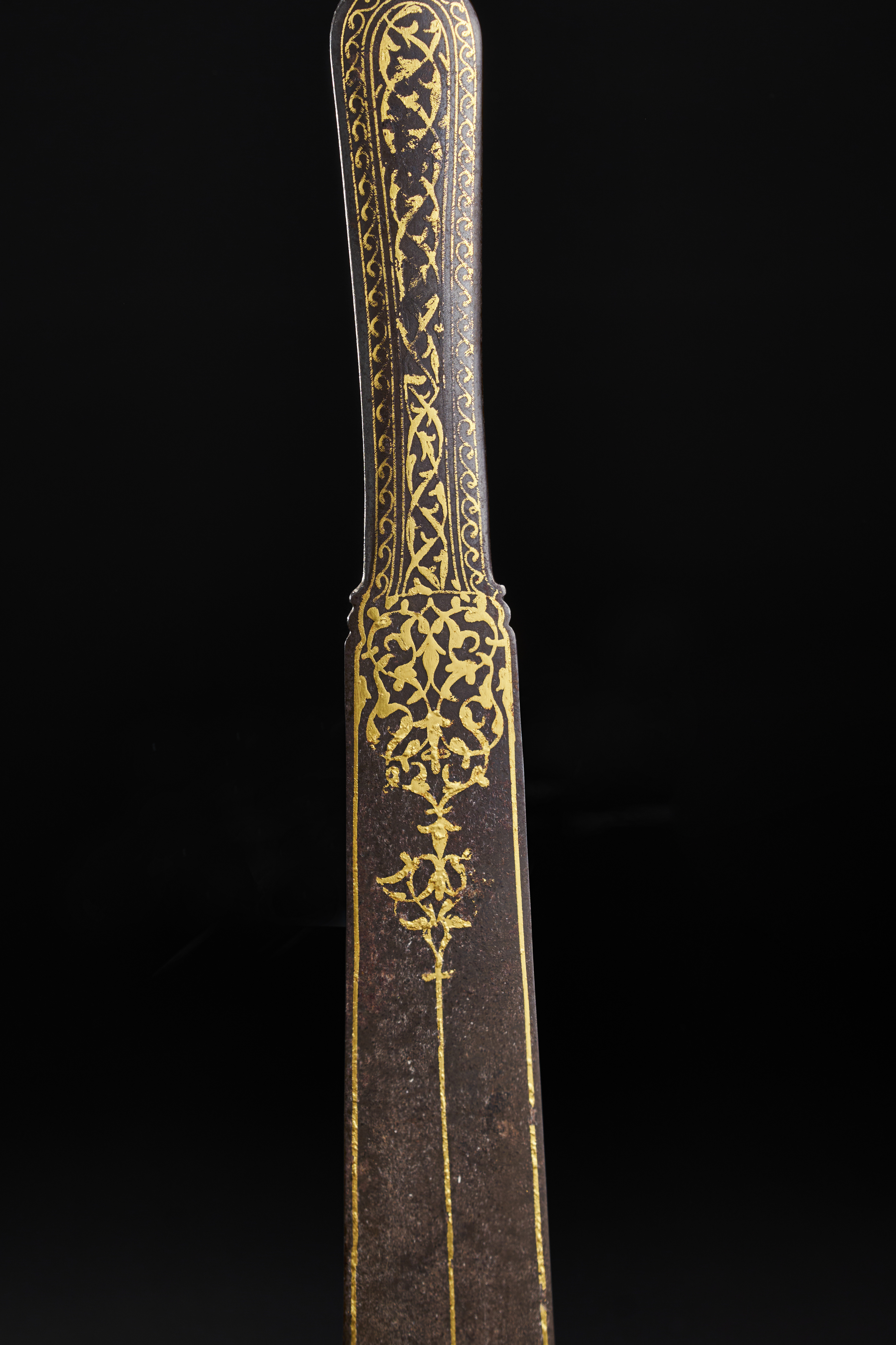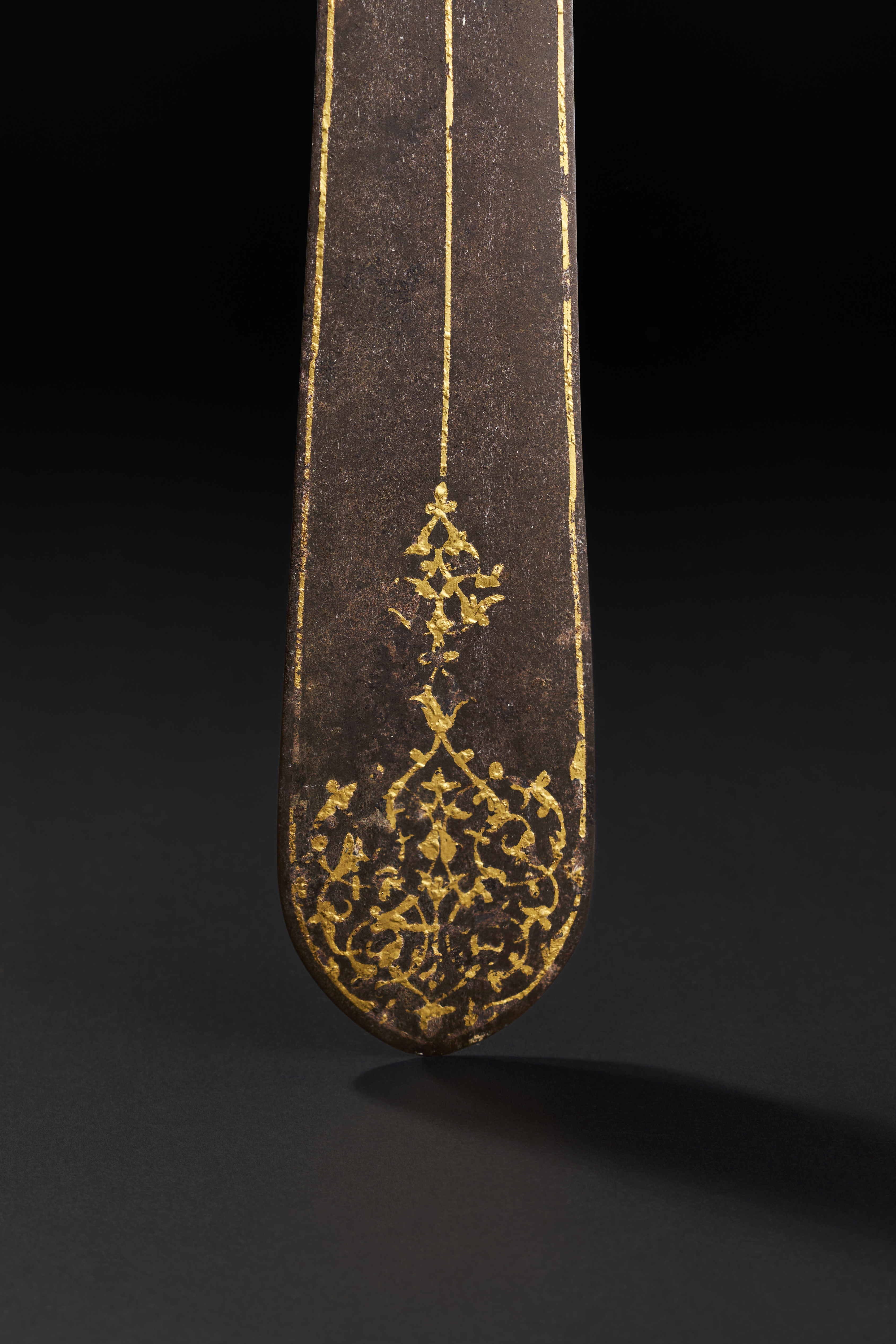 An elegant Ottoman Turkish bookbinding tool, crafted from steel and adorned with intricate gold inlay, dating to the 18th century. The tool features a flat, elongated blade tapering into a rounded end, with the handle seamlessly integrated. Delicate floral and arabesque motifs are rendered in gold.
