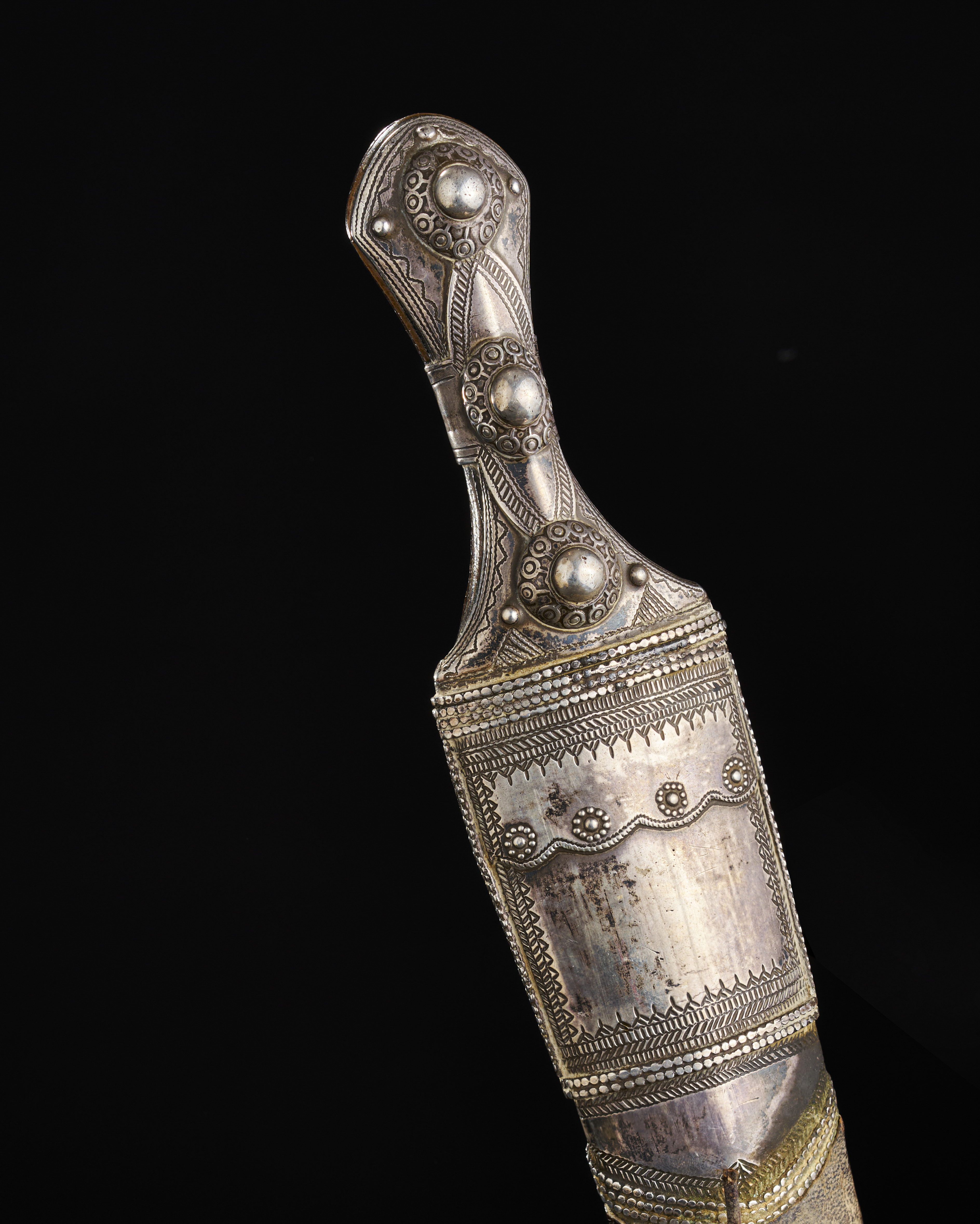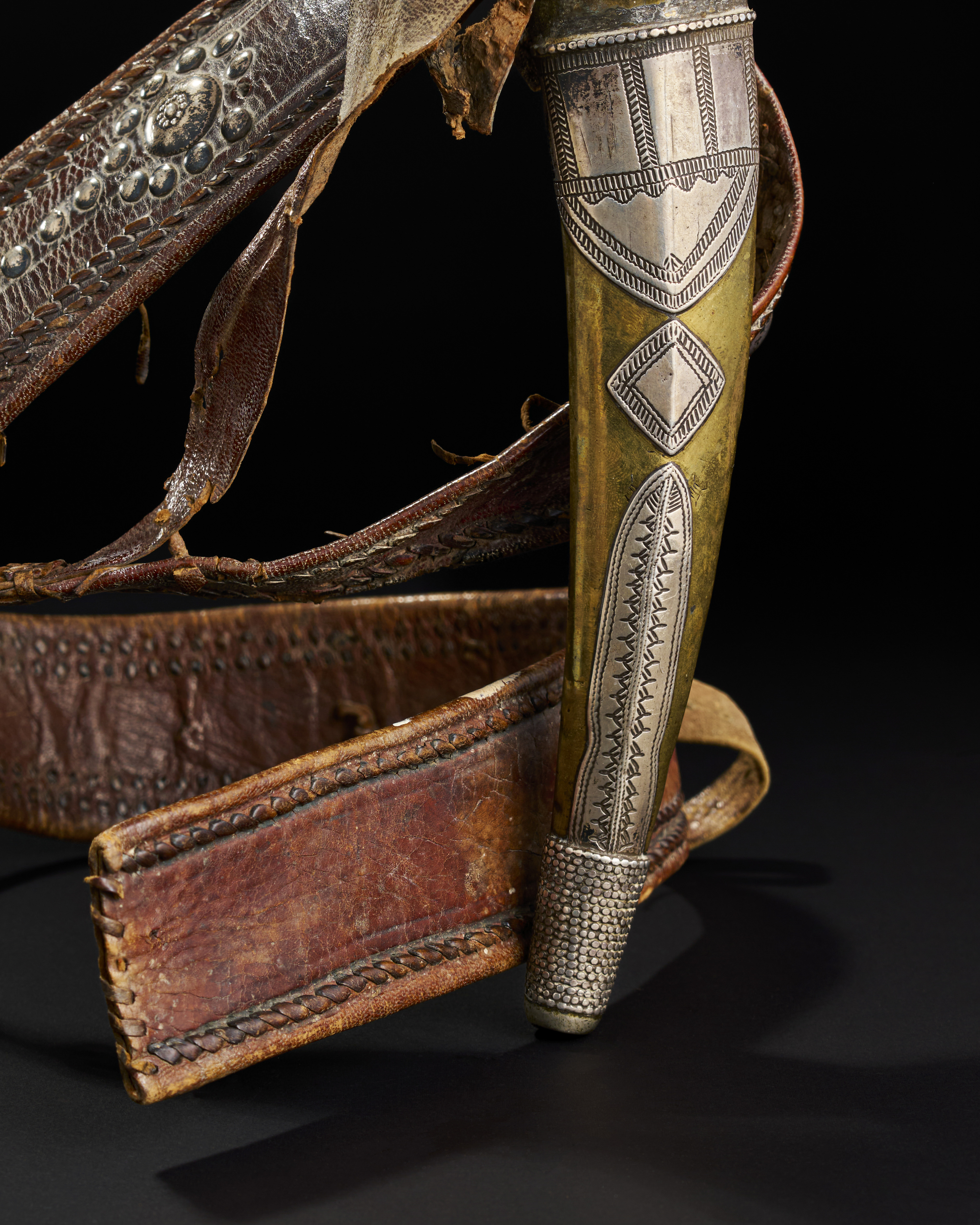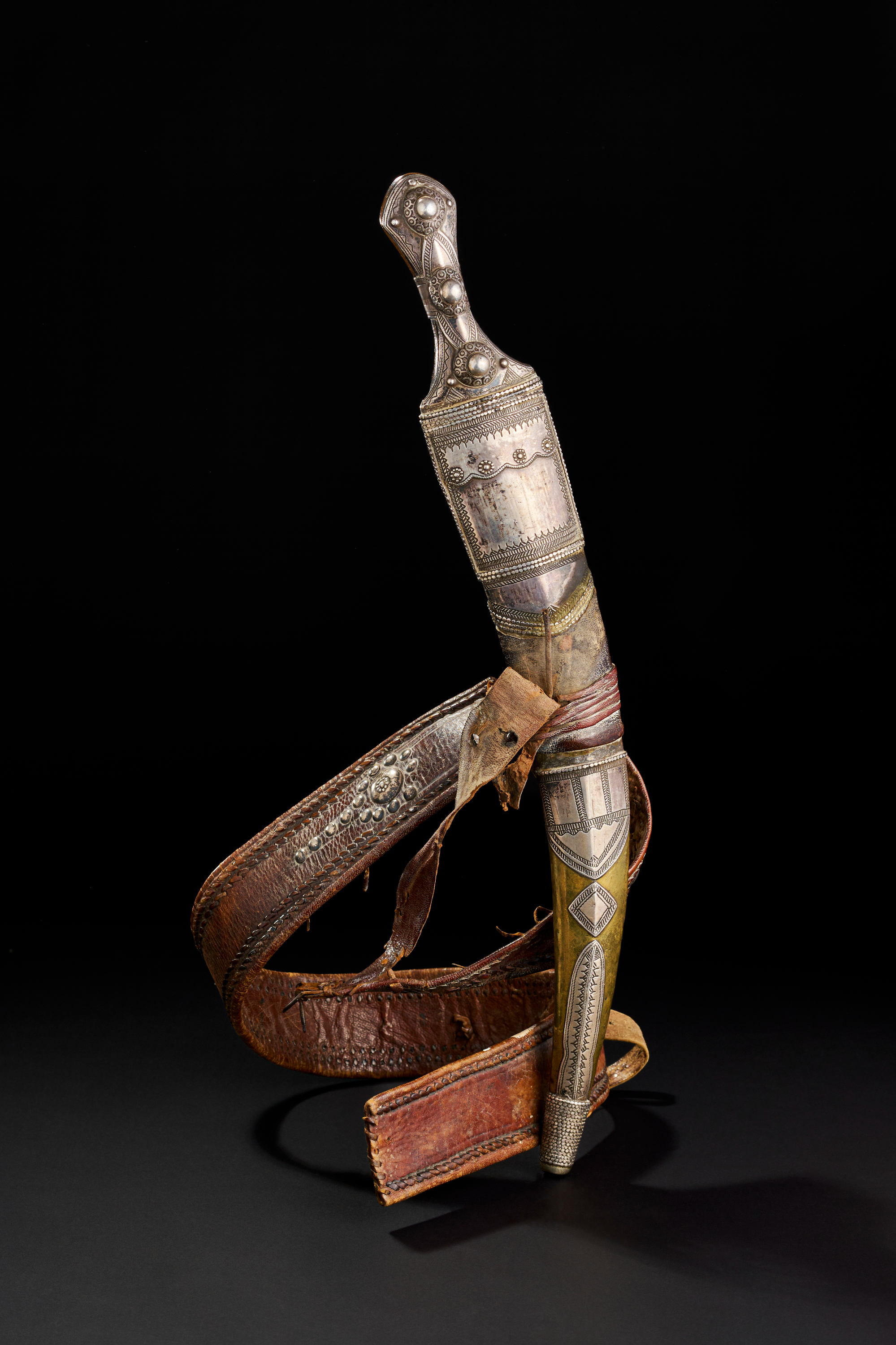 A LARGE SAUDI (WAHABI) HORN HILTED SILVER OVERLAID DAGGER WITH LEATHER BELT, 19TH CENTURY