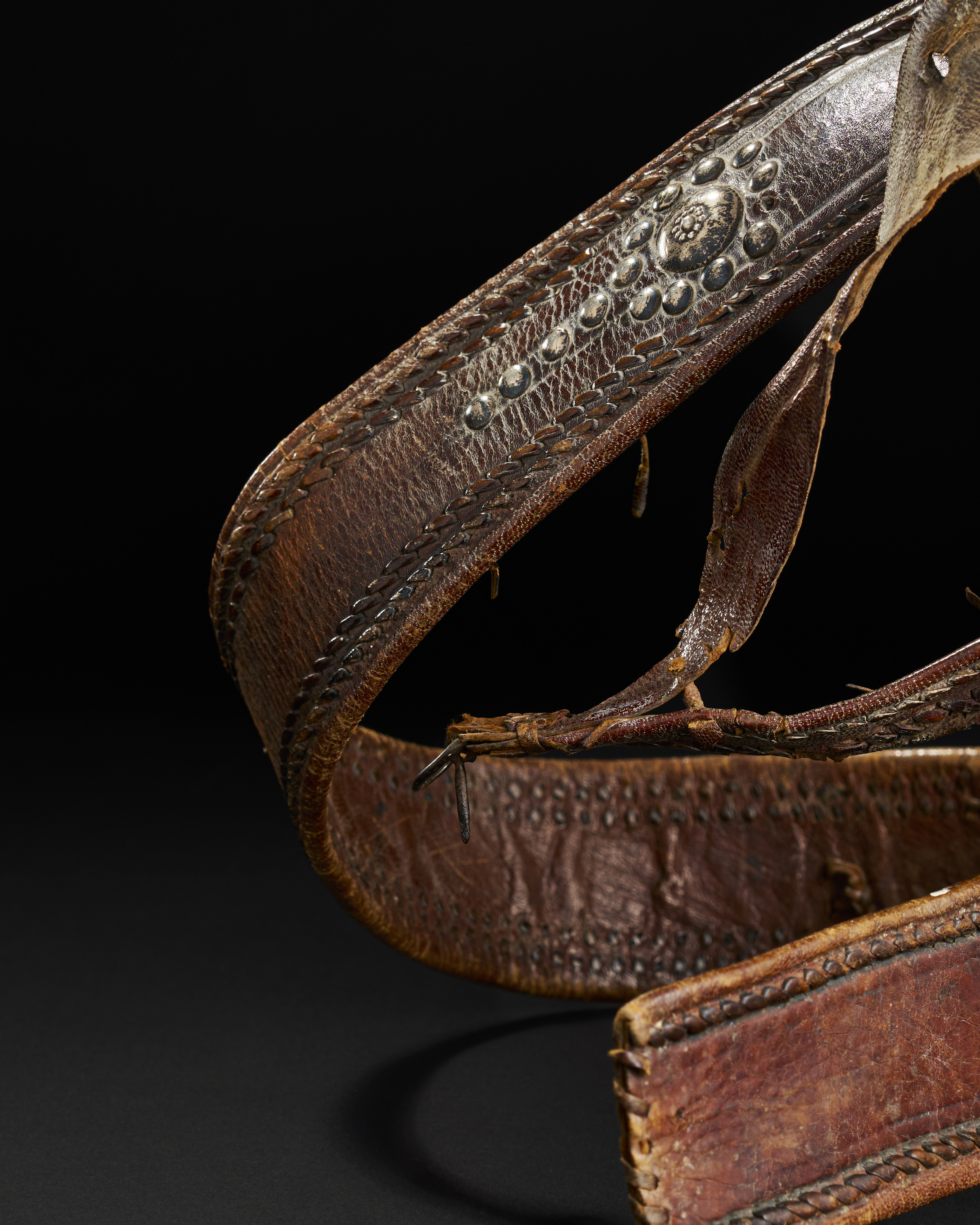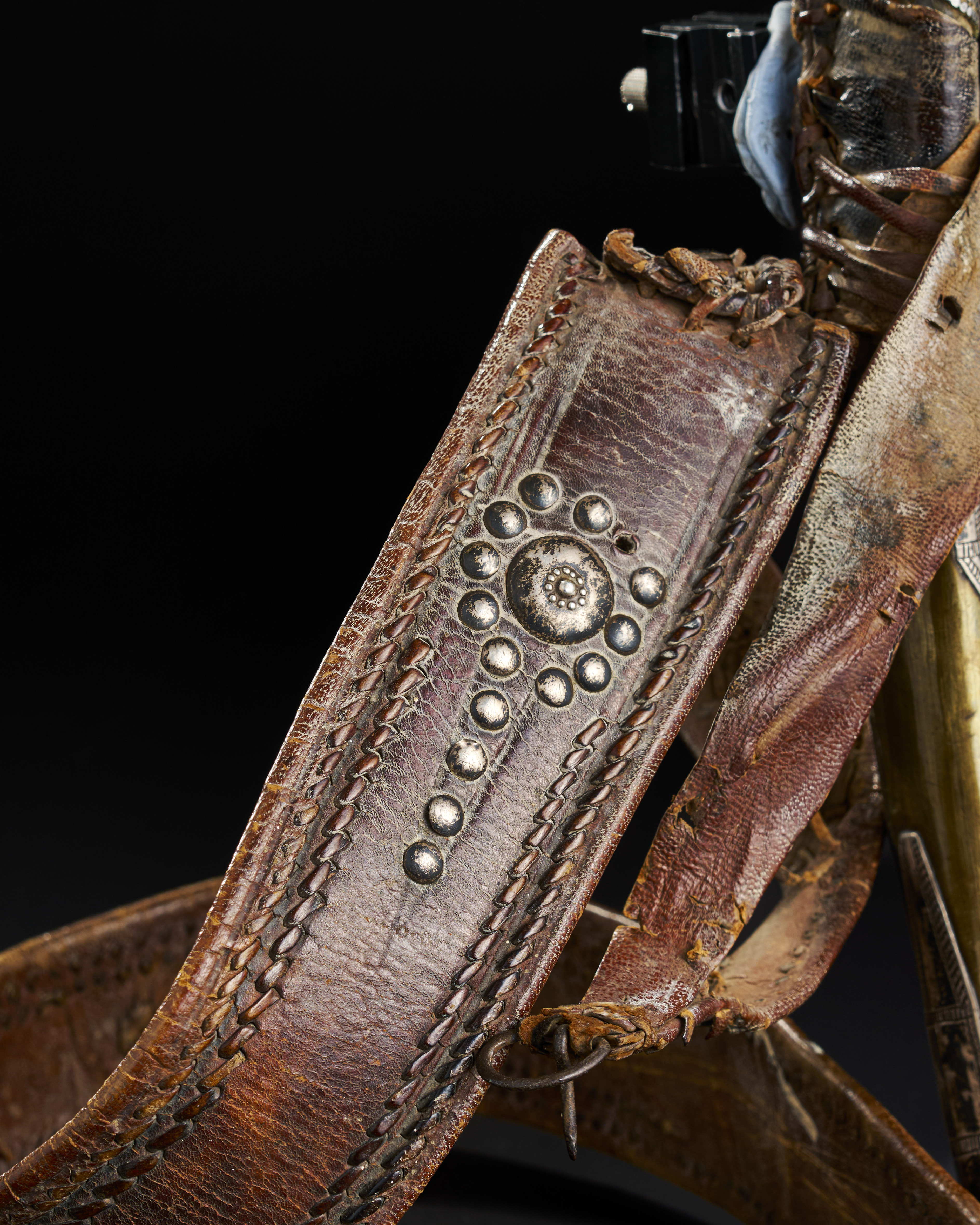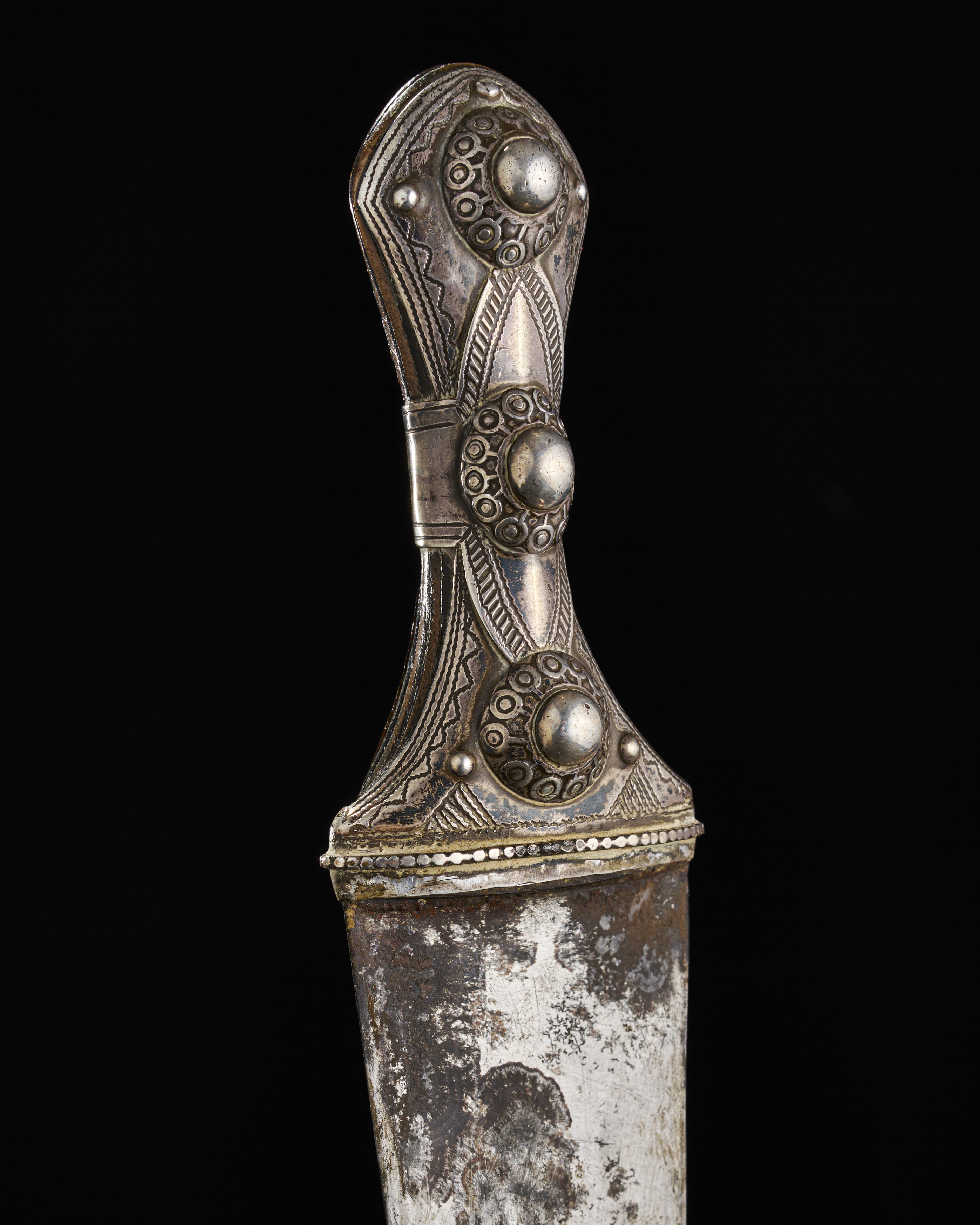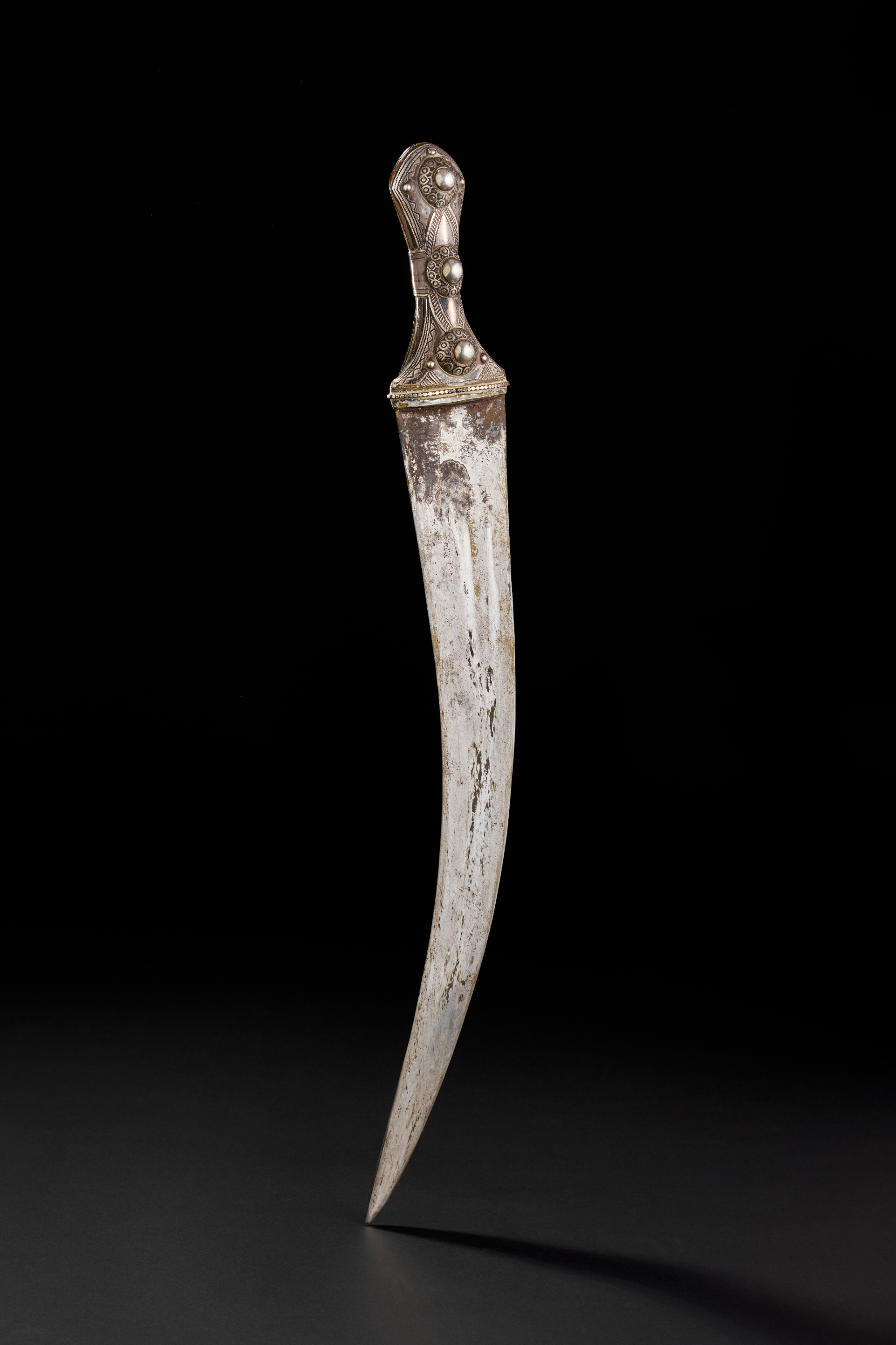 A LARGE SAUDI (WAHABI) HORN HILTED SILVER OVERLAID DAGGER WITH LEATHER BELT, 19TH CENTURY