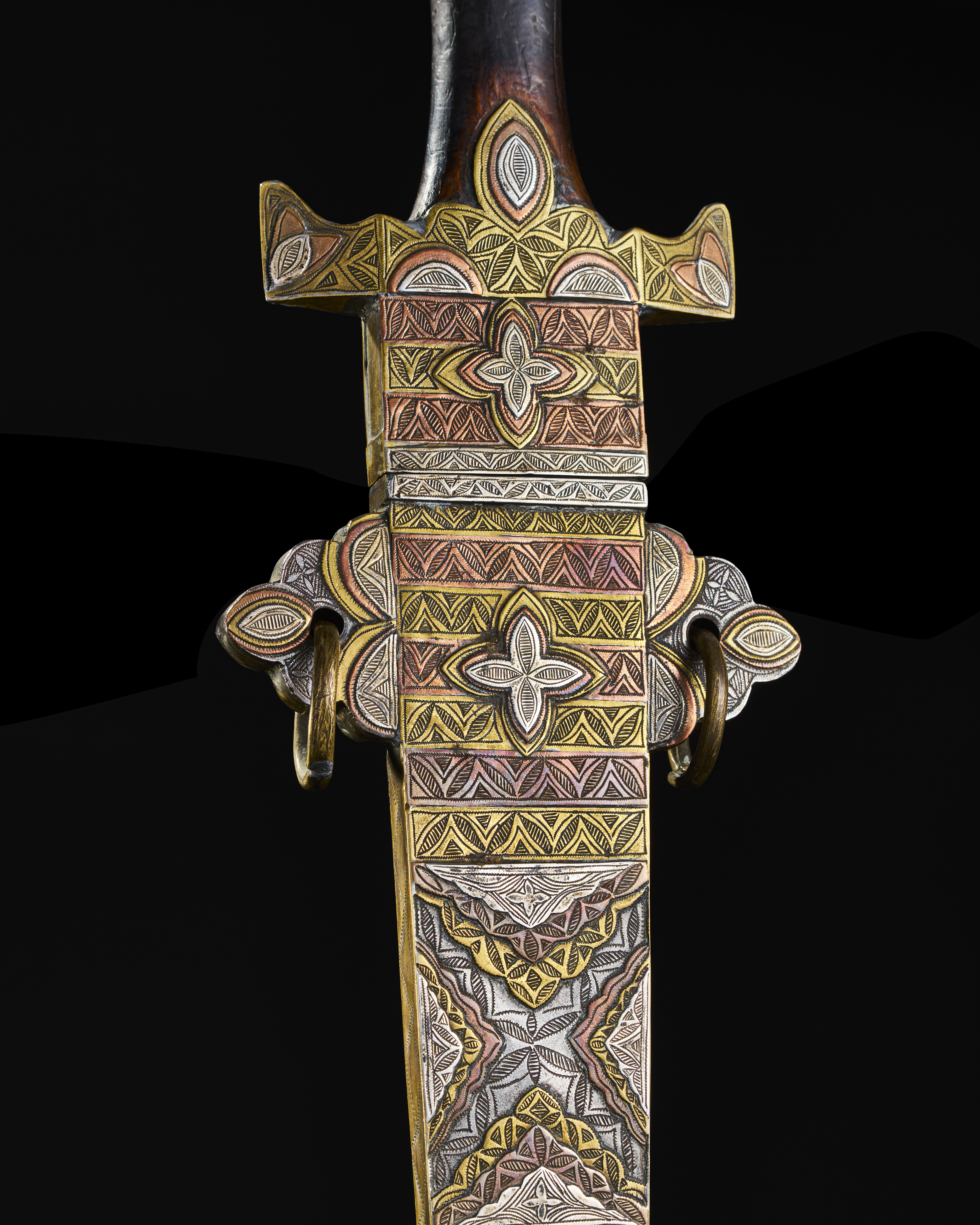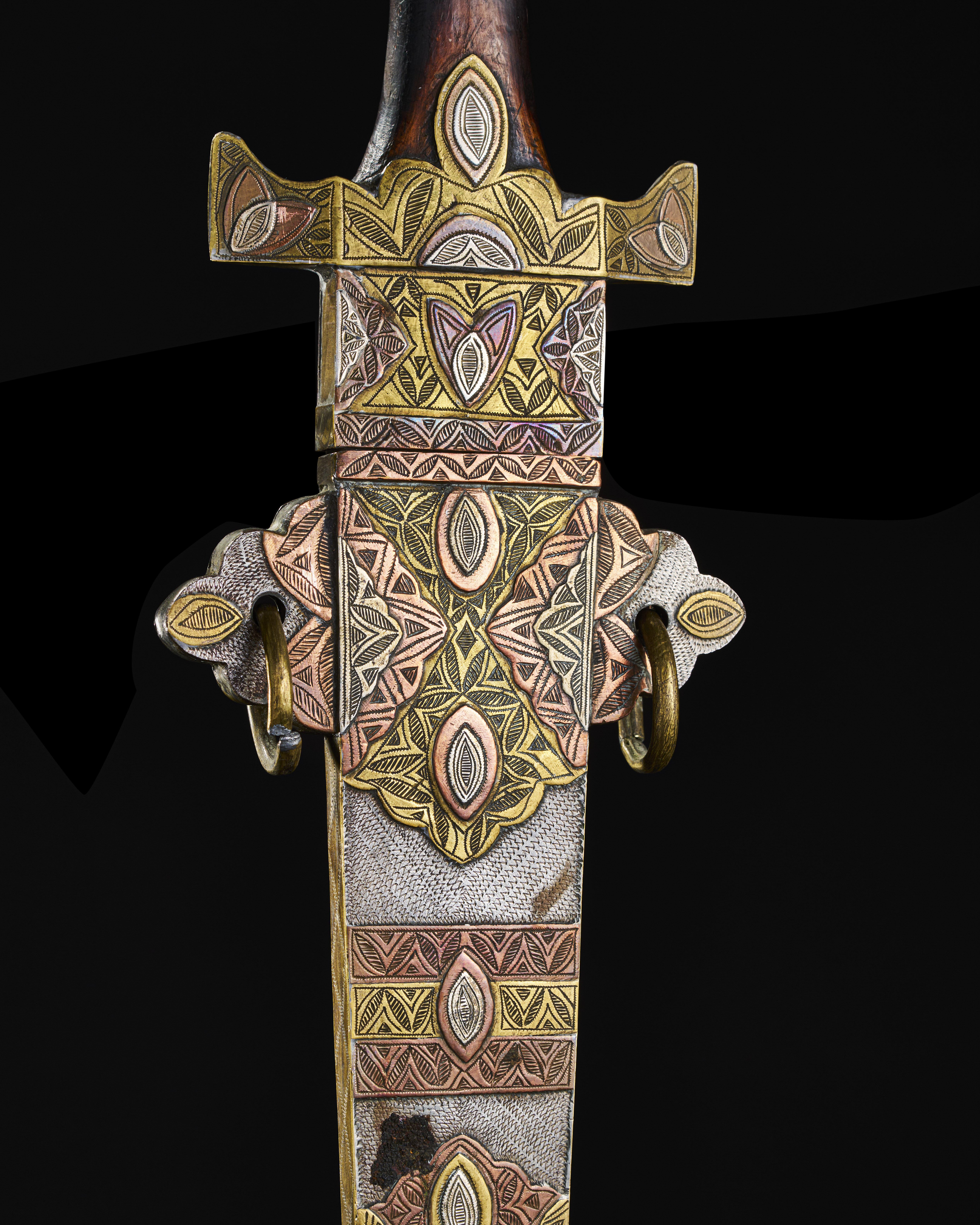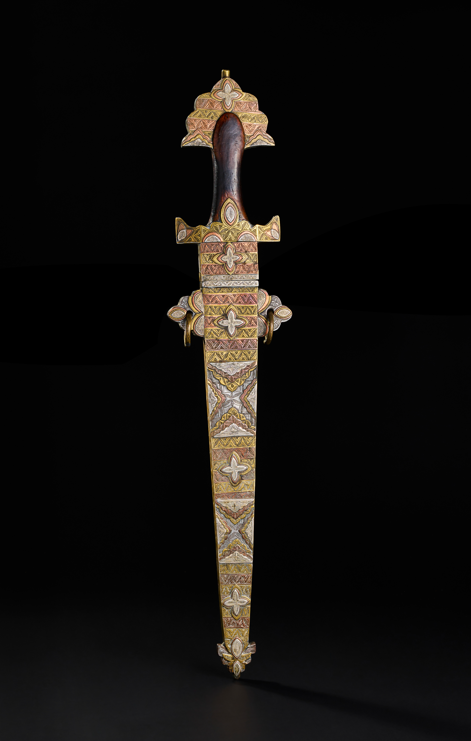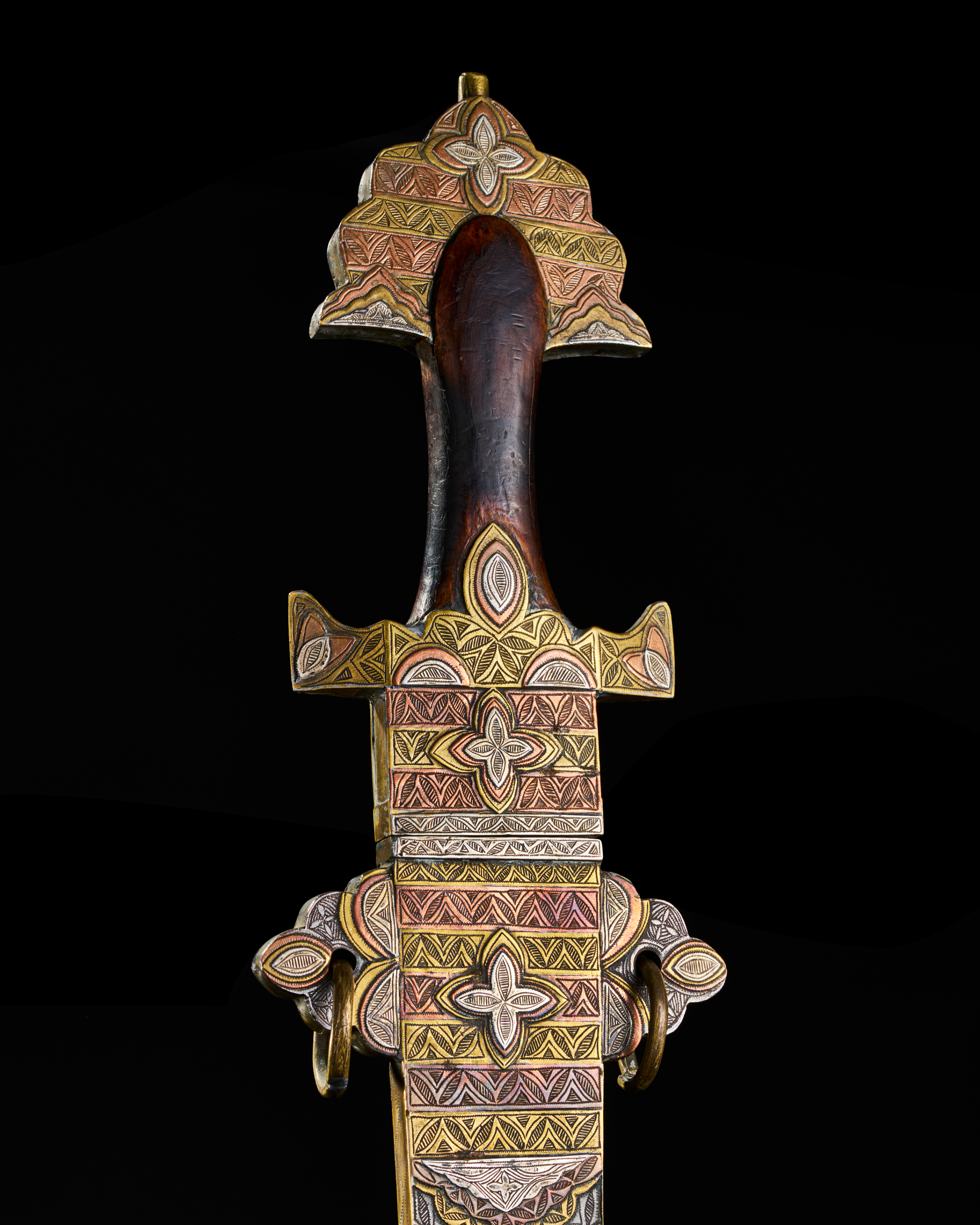 A19th-century North African Tuareg sword. The scabbard and hilt are richly adorned with intricate inlays of silver, copper, and brass, creating a stunning geometric and floral pattern typical of Tuareg artistry. The wooden hilt is elegantly carved, complementing the richly decorated fittings.