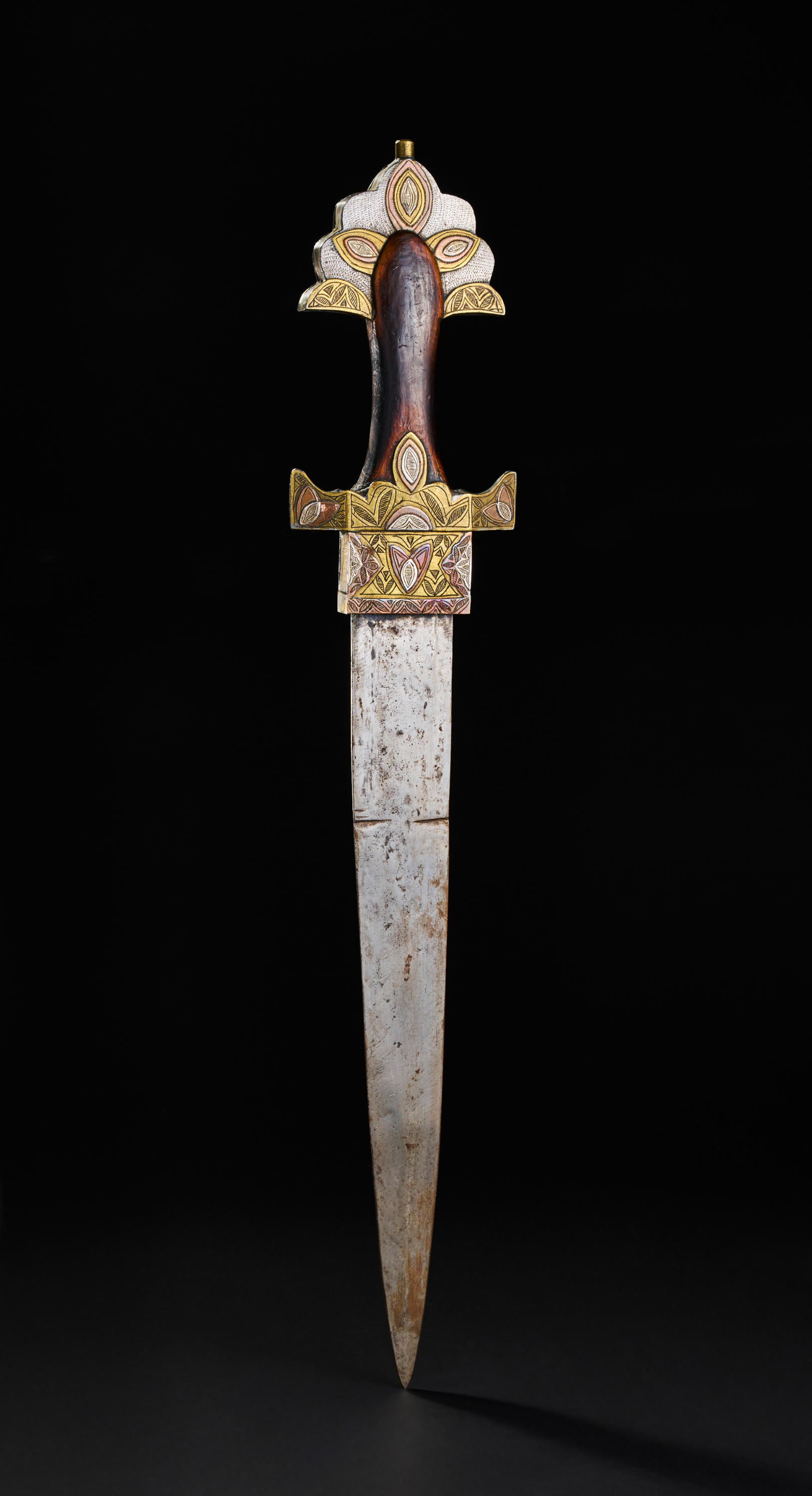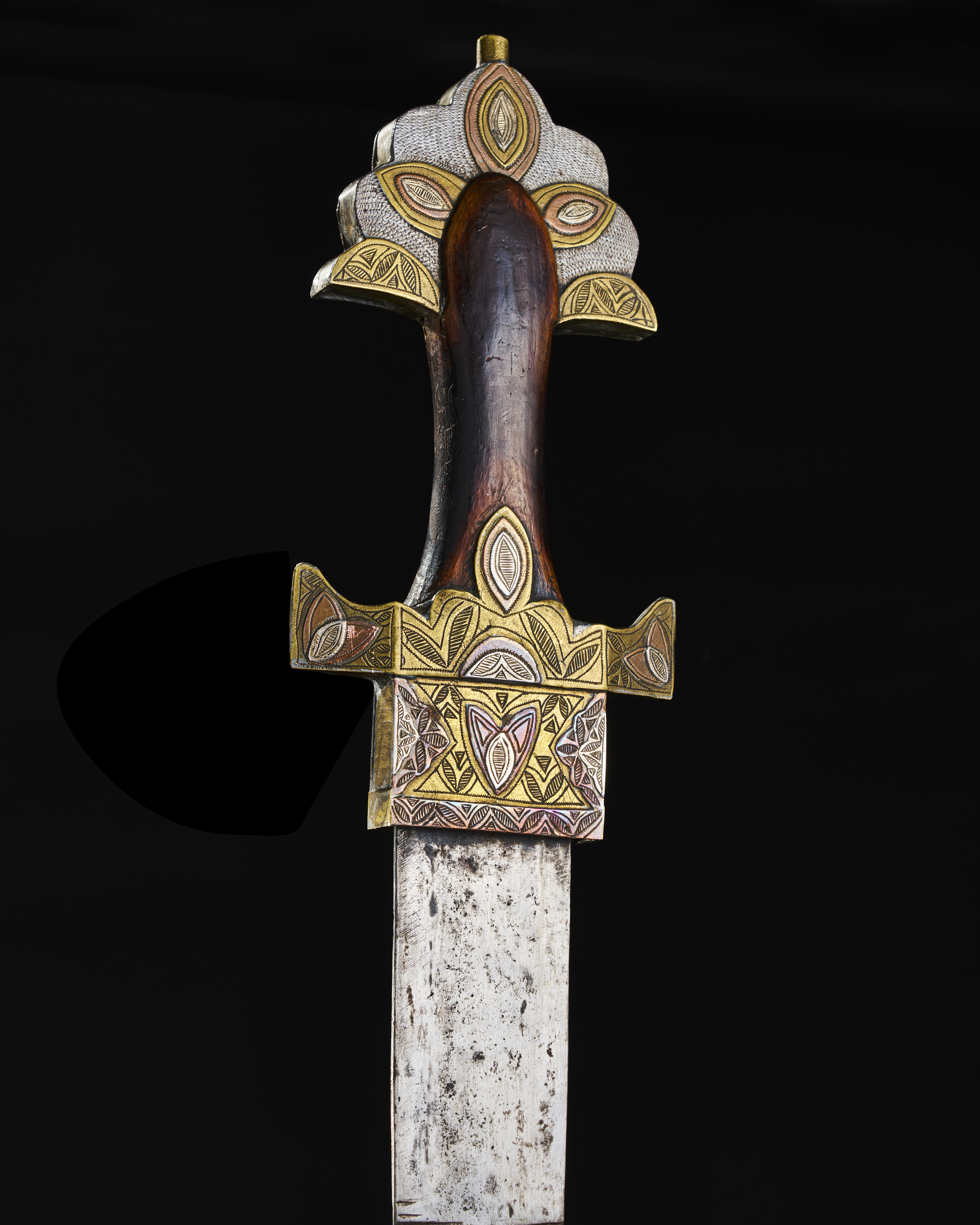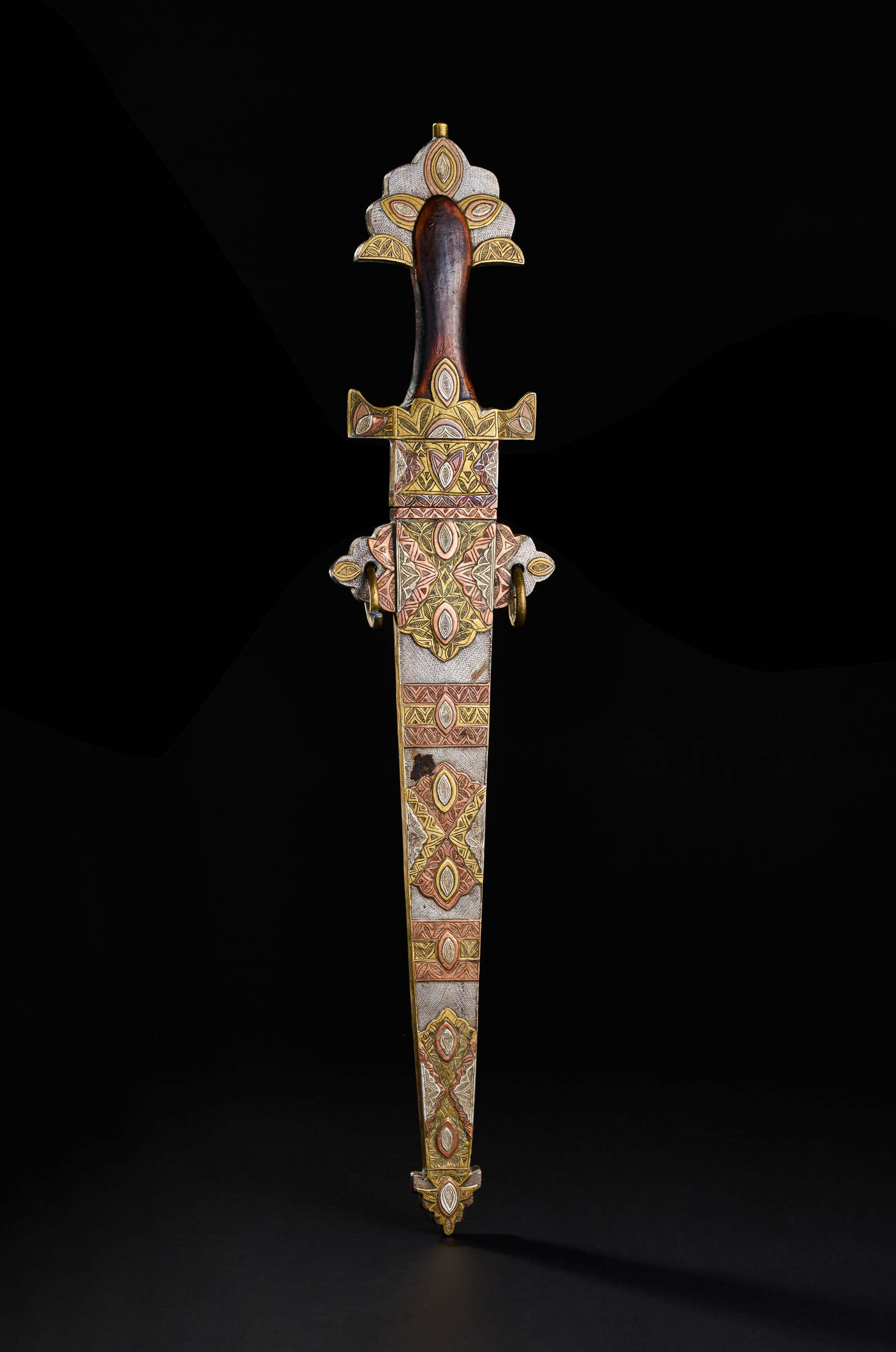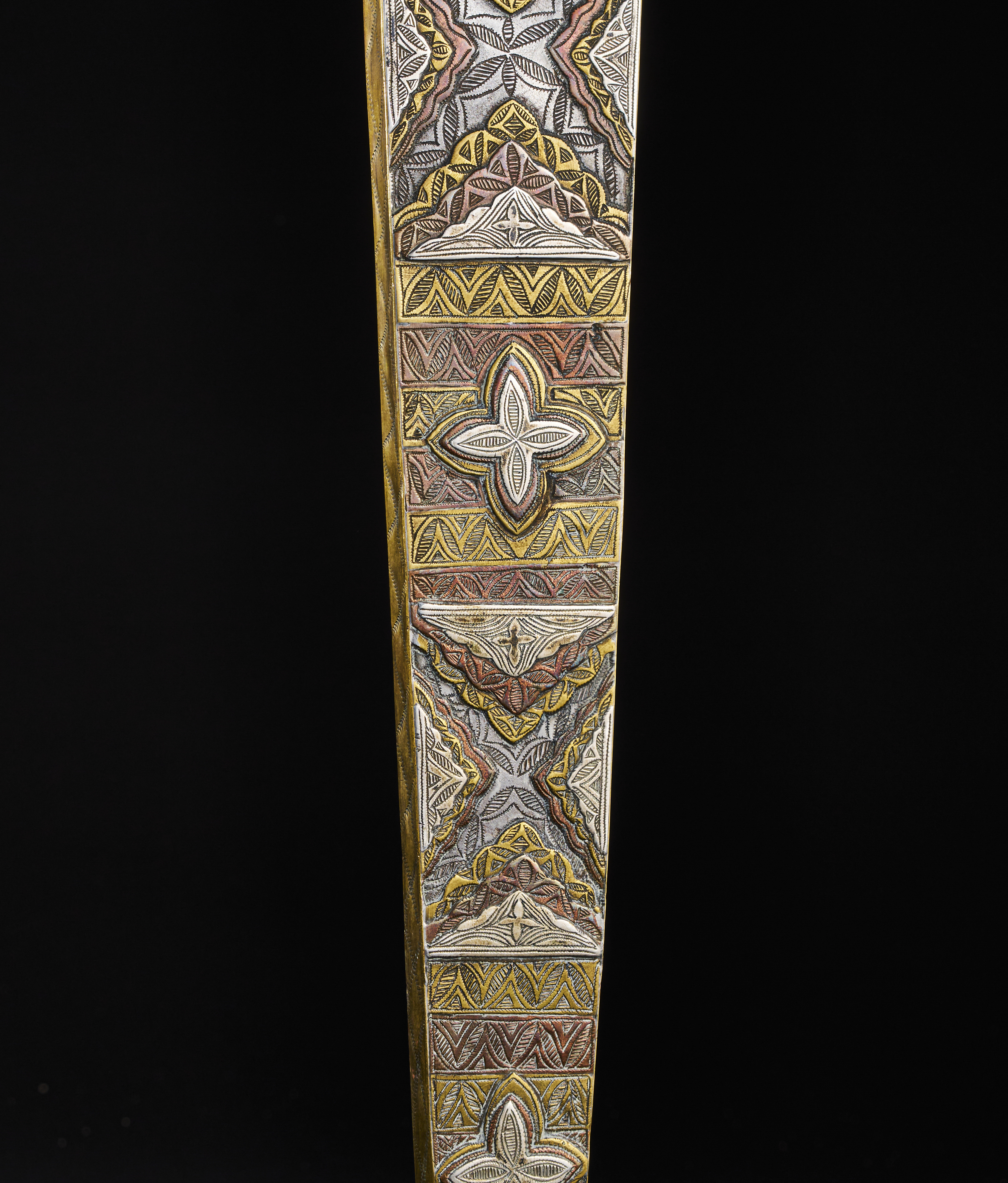 A19th-century North African Tuareg sword. The scabbard and hilt are richly adorned with intricate inlays of silver, copper, and brass, creating a stunning geometric and floral pattern typical of Tuareg artistry. The wooden hilt is elegantly carved, complementing the richly decorated fittings.